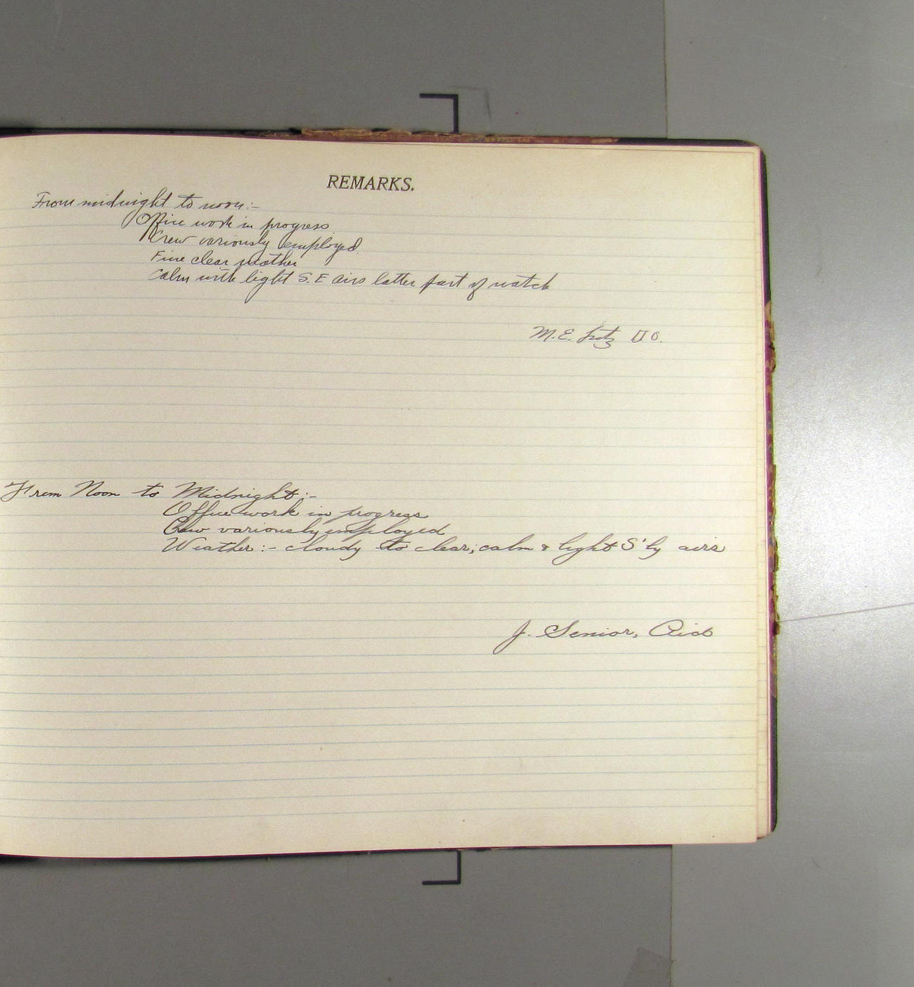 From Midnight to Noon. Office work in progress. Crew variously emloyed. Weather: fine & clear; light N'ly airs