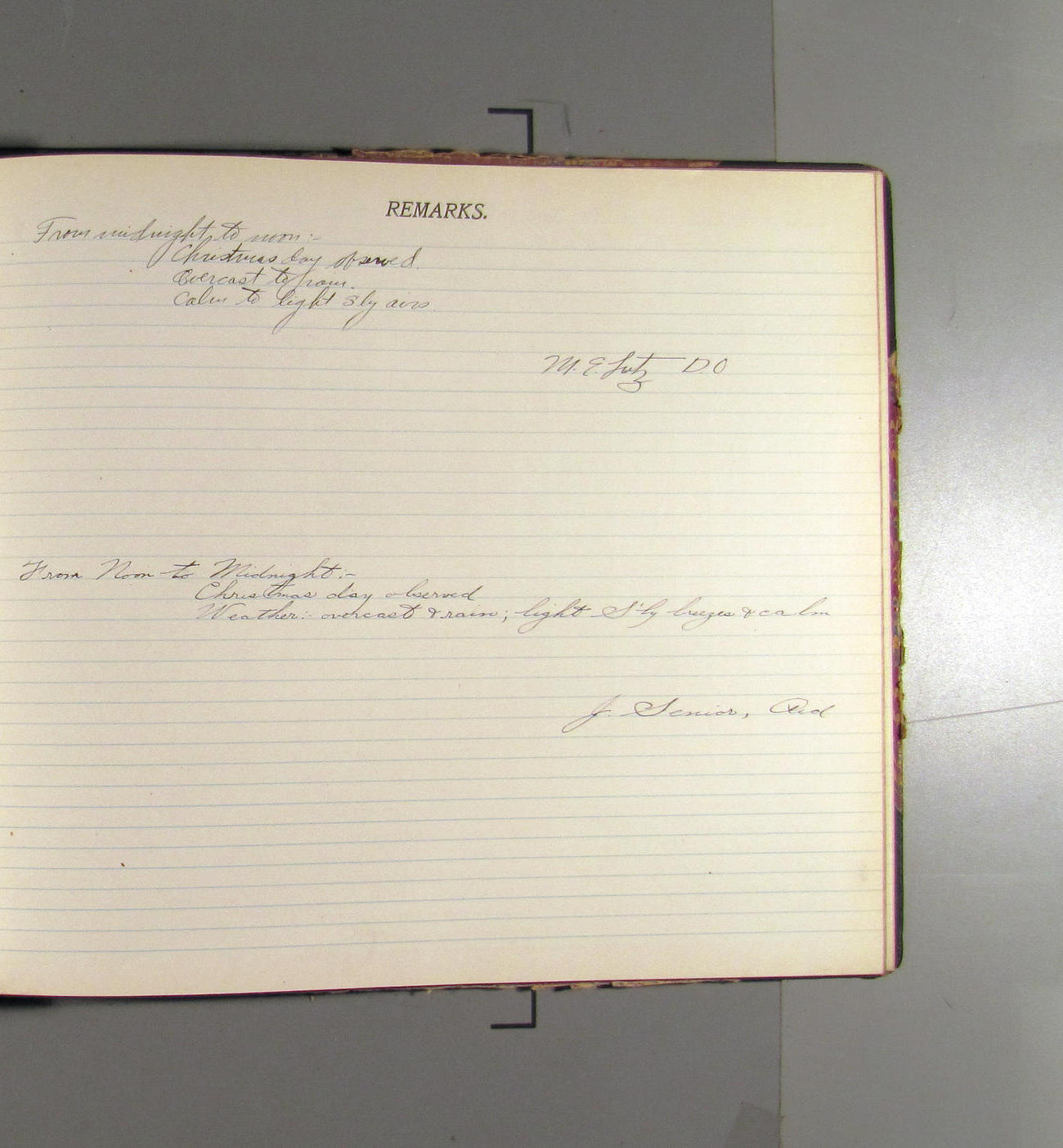 From noon to midnight. Christmas day observed. Weather: overcast & rain; light S'ly breezes & calm