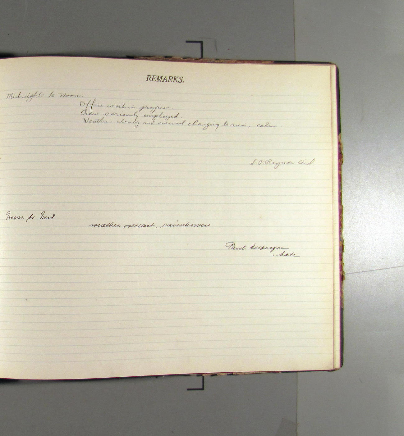 Mid to Noon. Weather overcast, rain. Crew variously employed. officers office work.