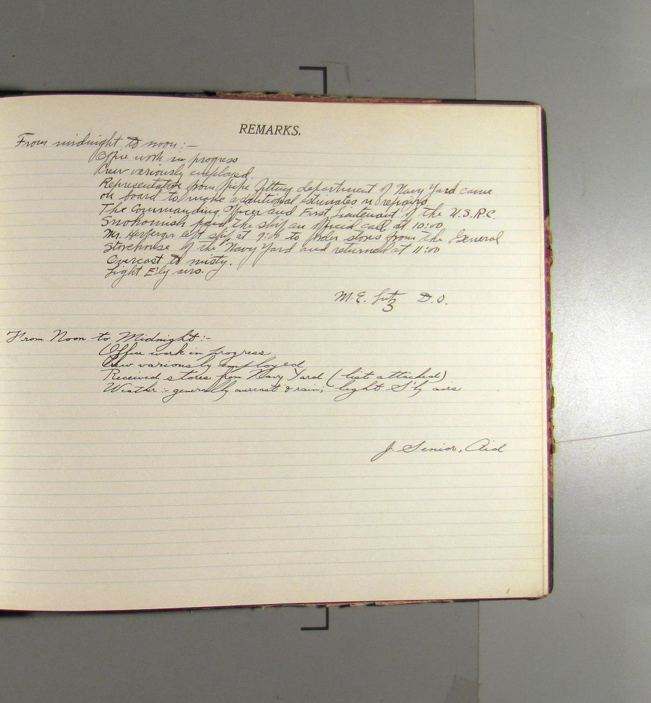 From midnight to noon: - Office work in progress. Crew variously employed. Representative from pipe fitting department of Navy Yard came on board to make additional estimates on repairs. The Commanding Officer and First Liutenant of the USRC Snohomish paid the ship an official call at 10:00. Mr. Herberger left ship at 9:00 to order stores from the General Storehouse of the Navy Yard and returned at 11:00. Overcast to misty. Light E'ly airs