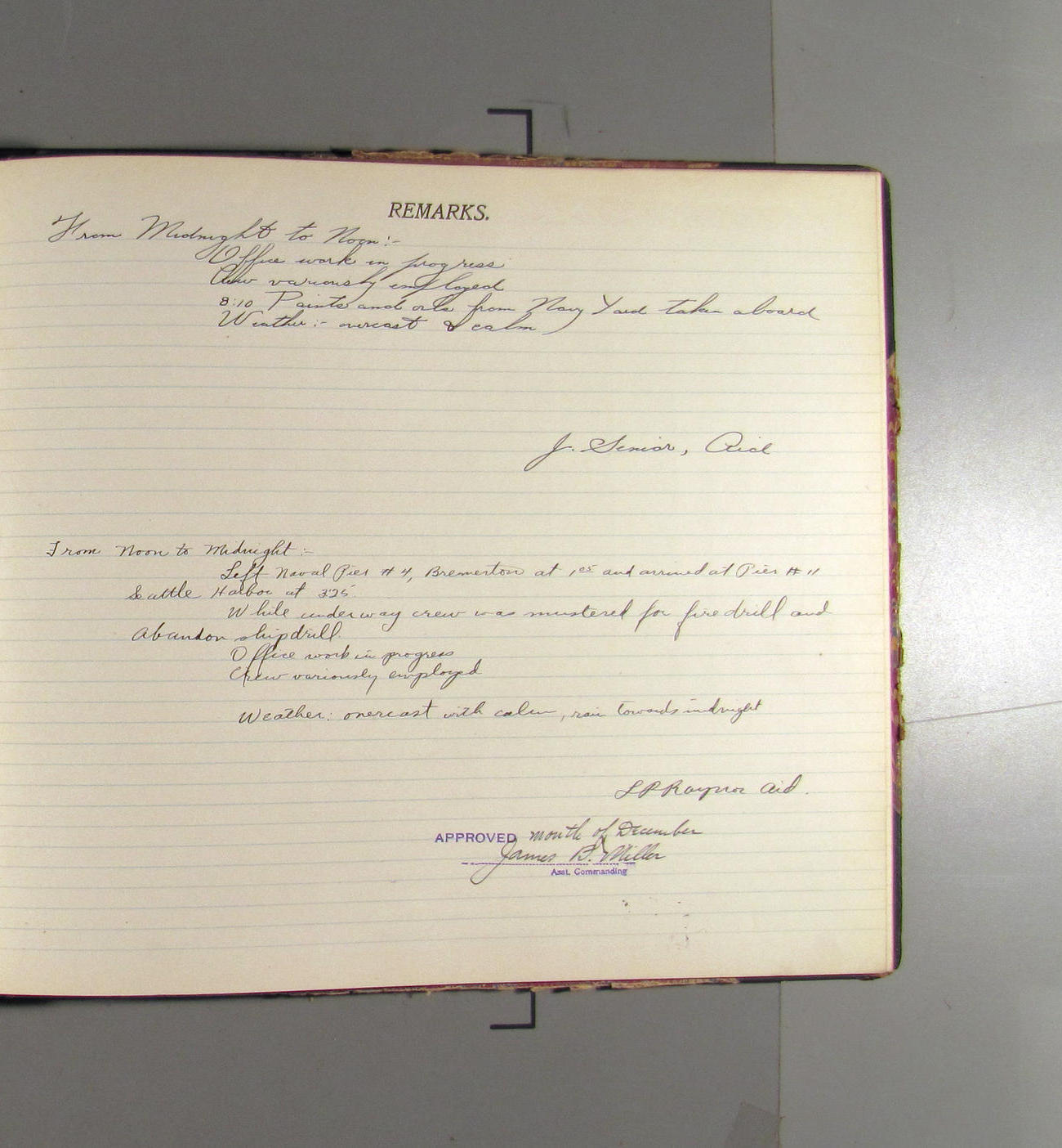 From noon to midnight. Left Naval Pier #4 Bremerton at 1:05 and arrived at Pier #11 Seattle harbor at 3:25. While underway crew was mustered for fire drill an abandon ship drill. Office work in progress. Crew variously employed. Weather: overcast with calm, light rain towards midnight