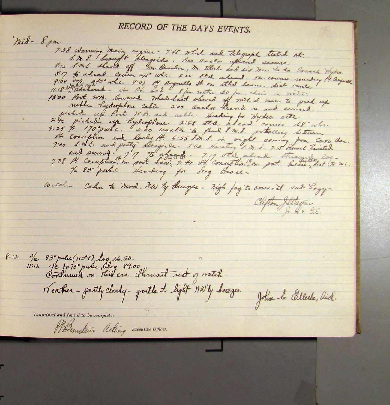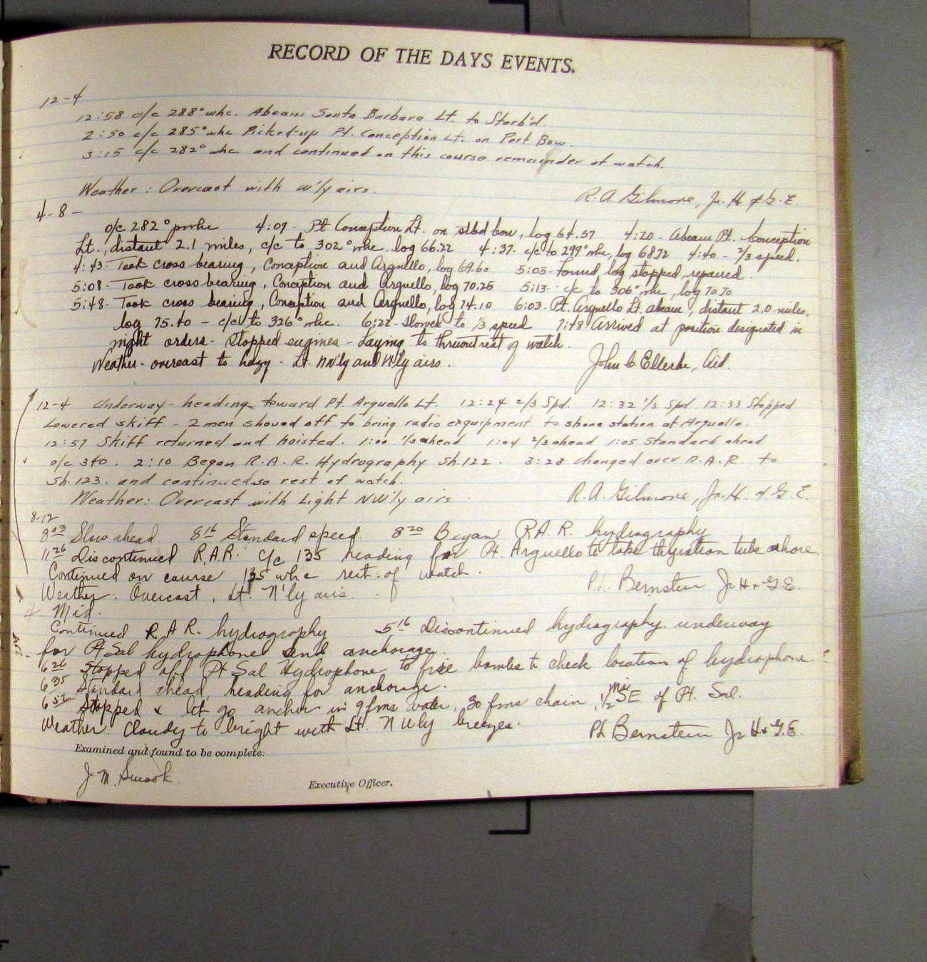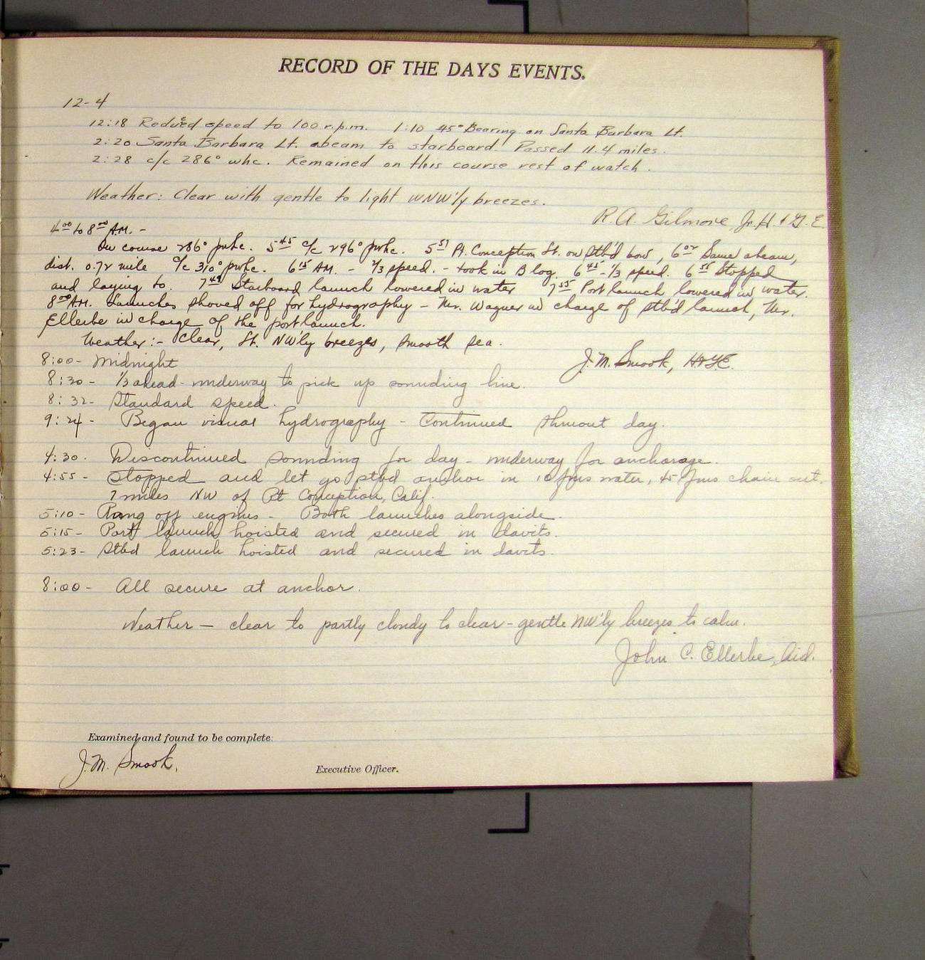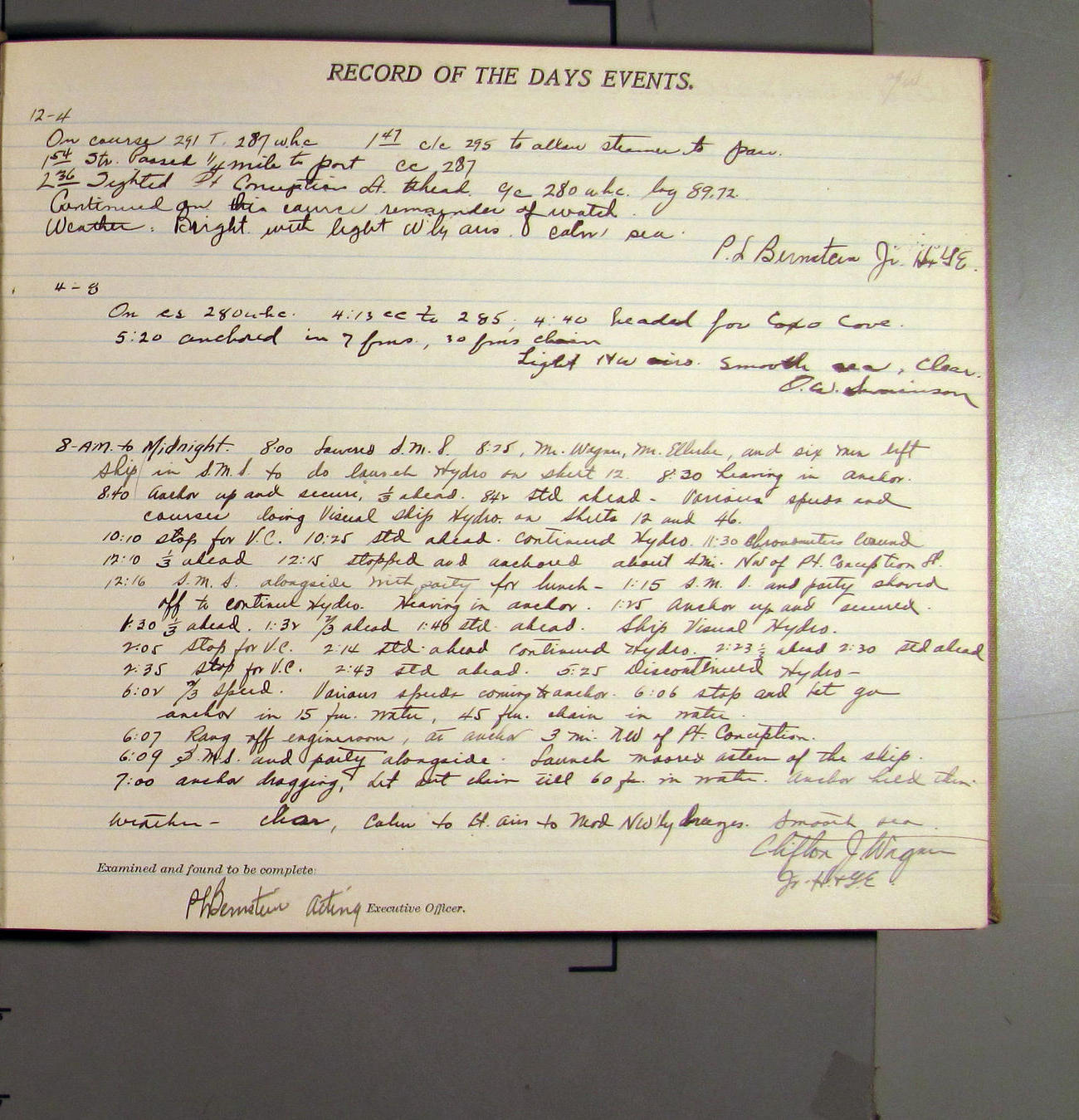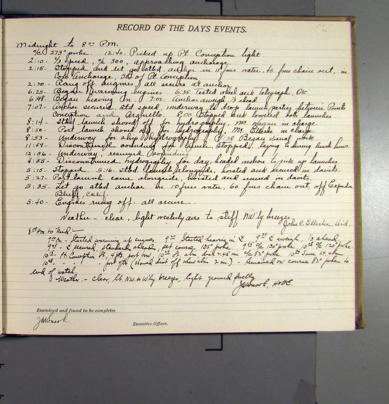 4:55 [PM] Stopped and let go stbd anchor in 10 fms water, 45 fms chain 7 miles NW of Pt Conception, Calif.
