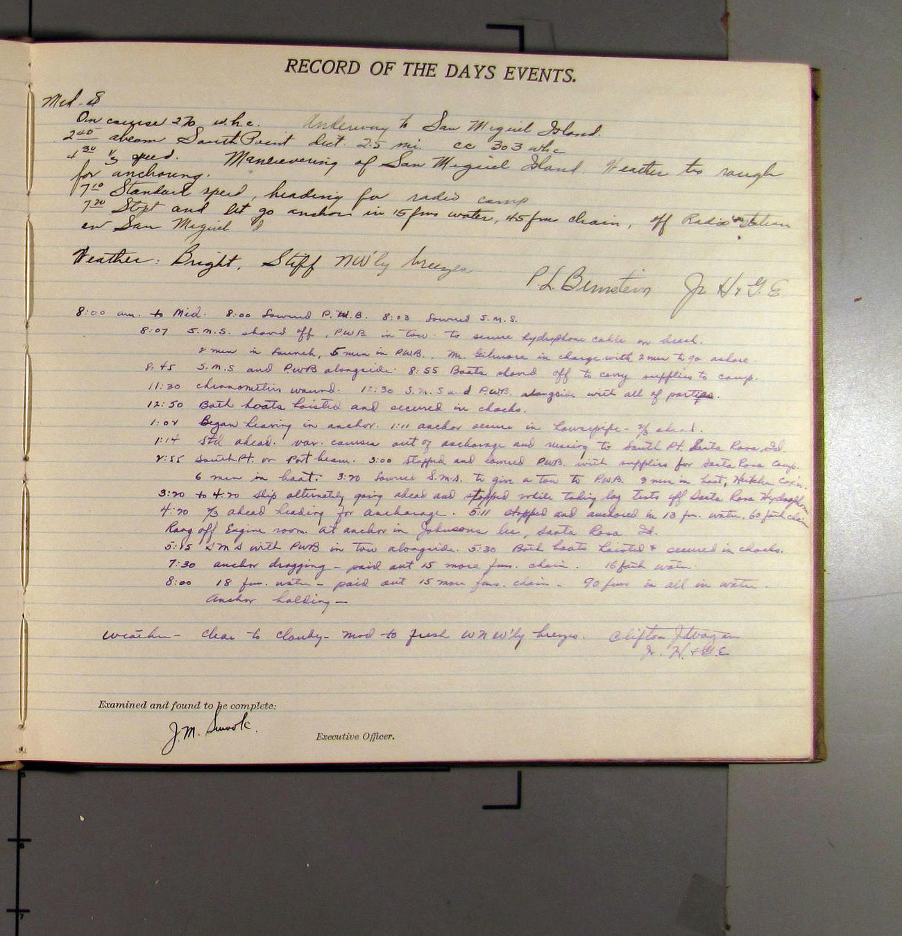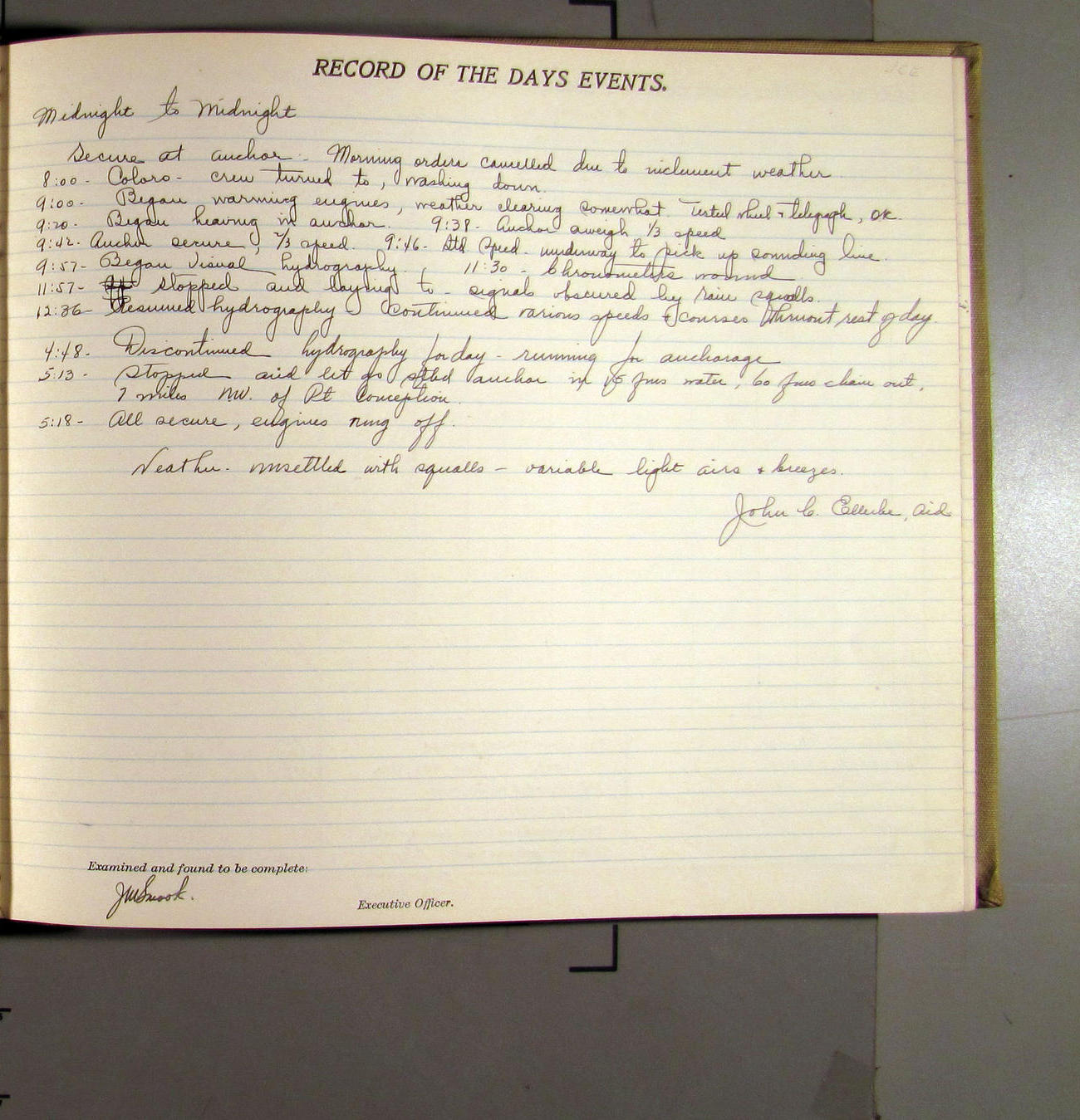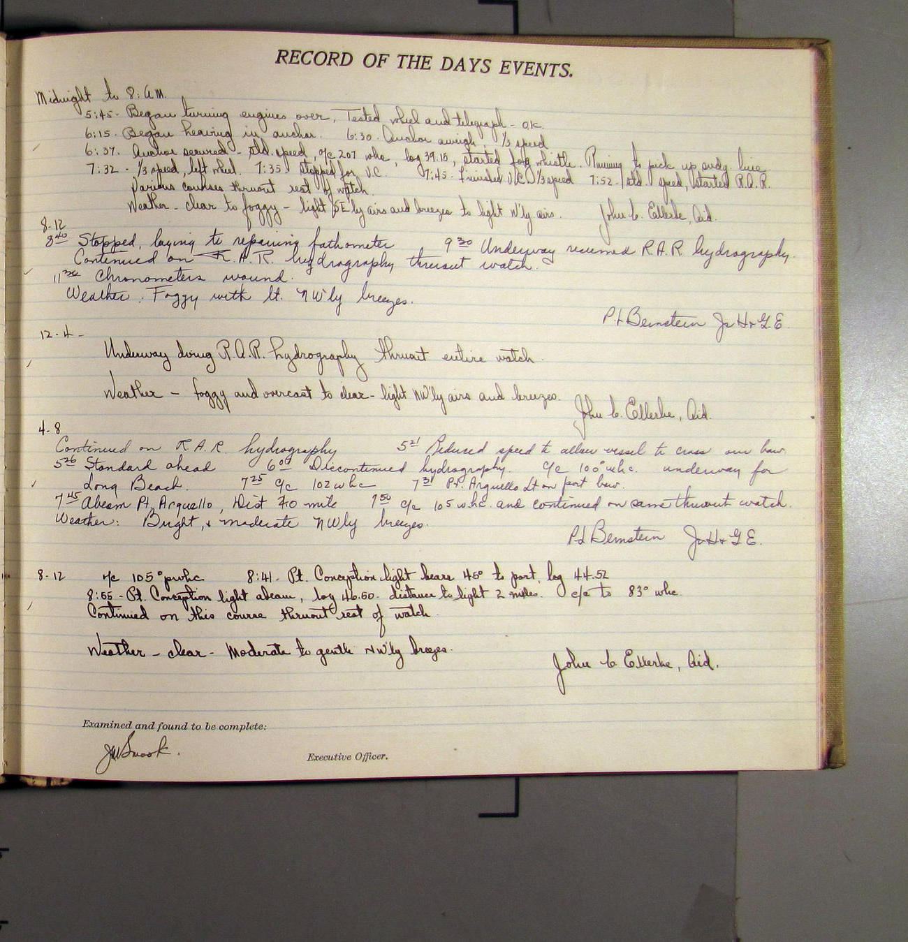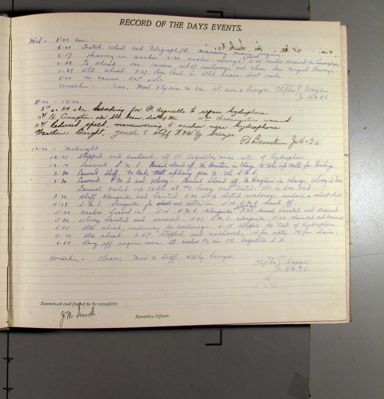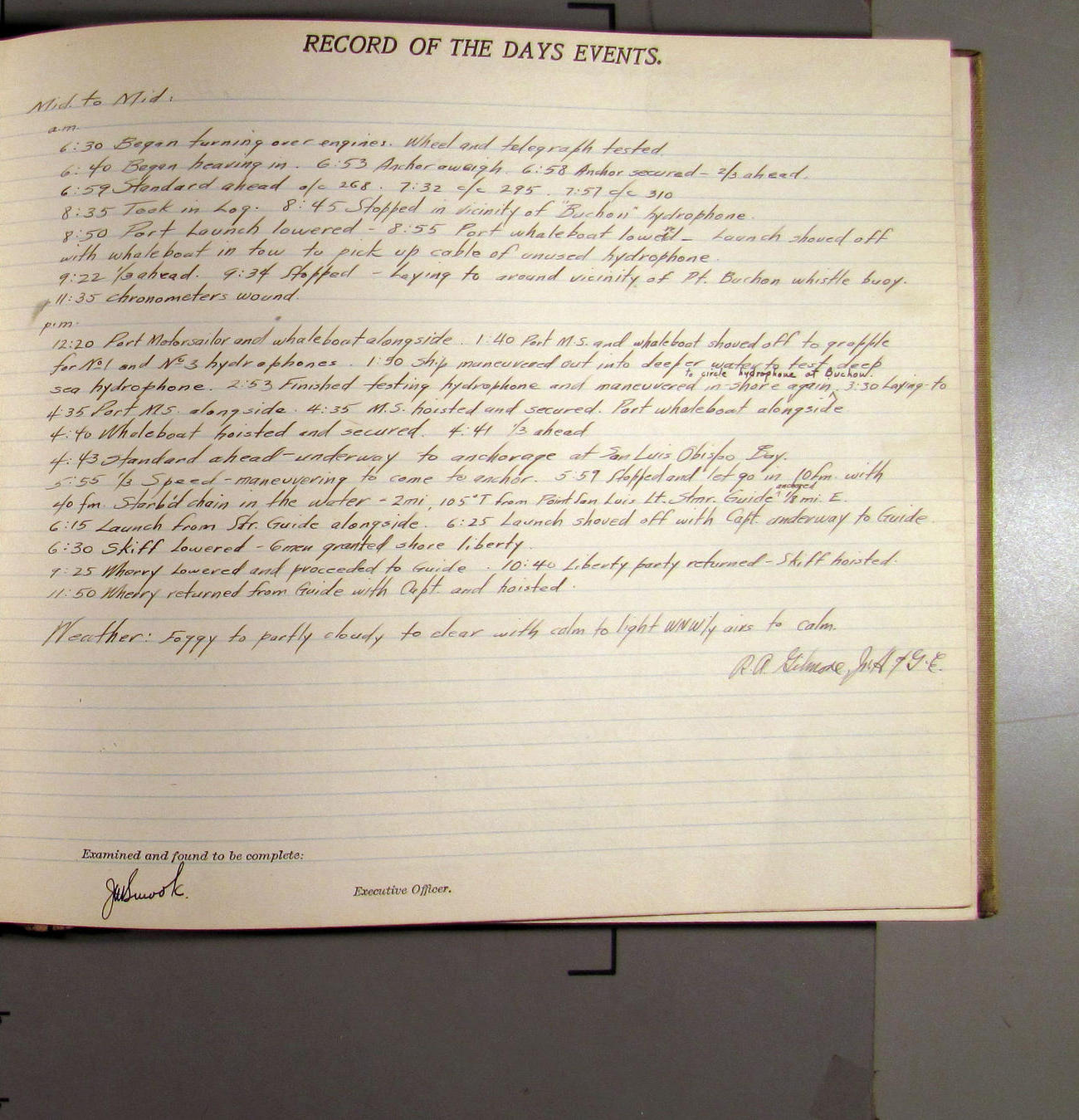 4:55 [PM] Stopped and let go stbd anchor in 10 fms water, 45 fms chain 7 miles NW of Pt Conception, Calif.