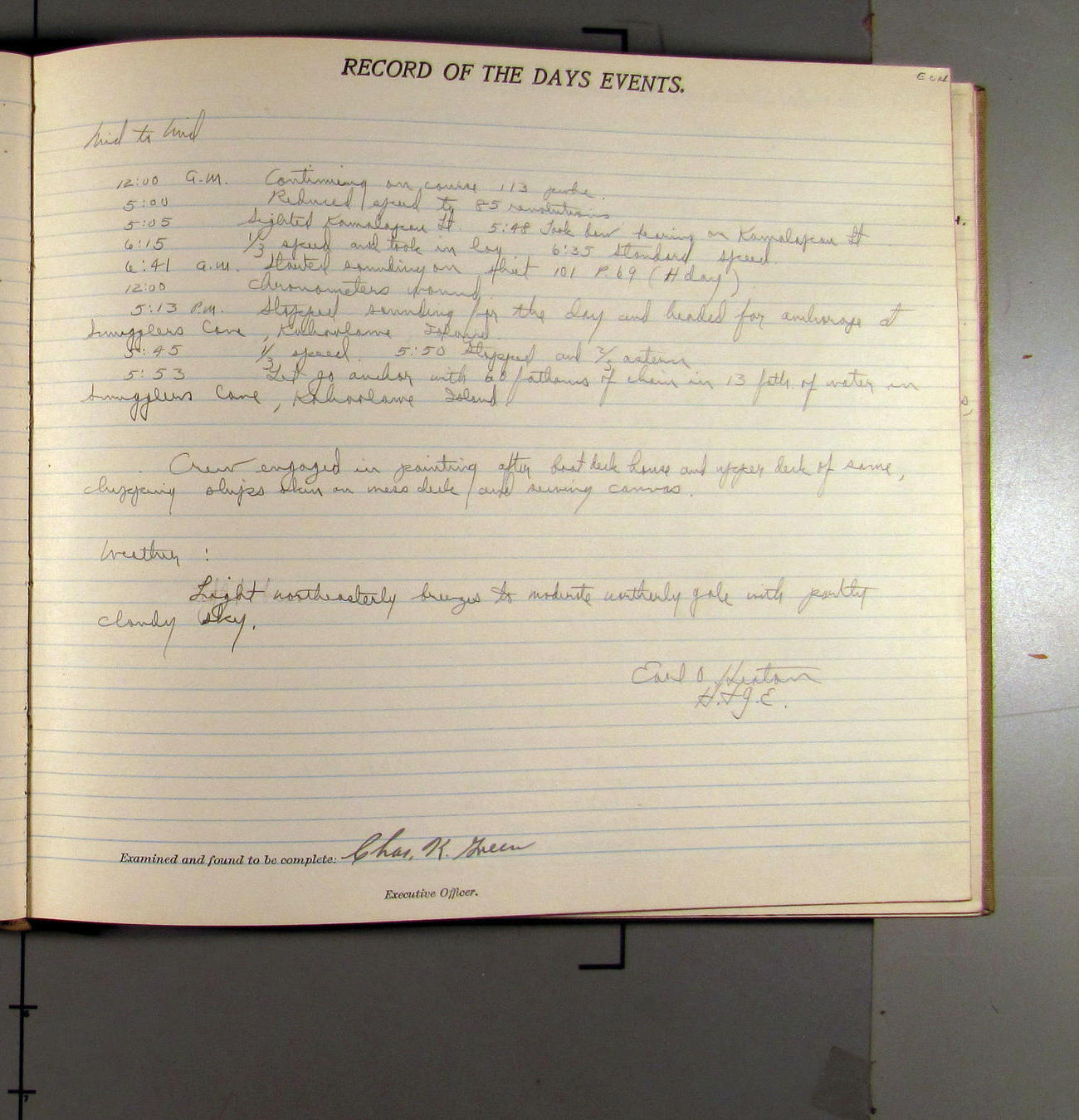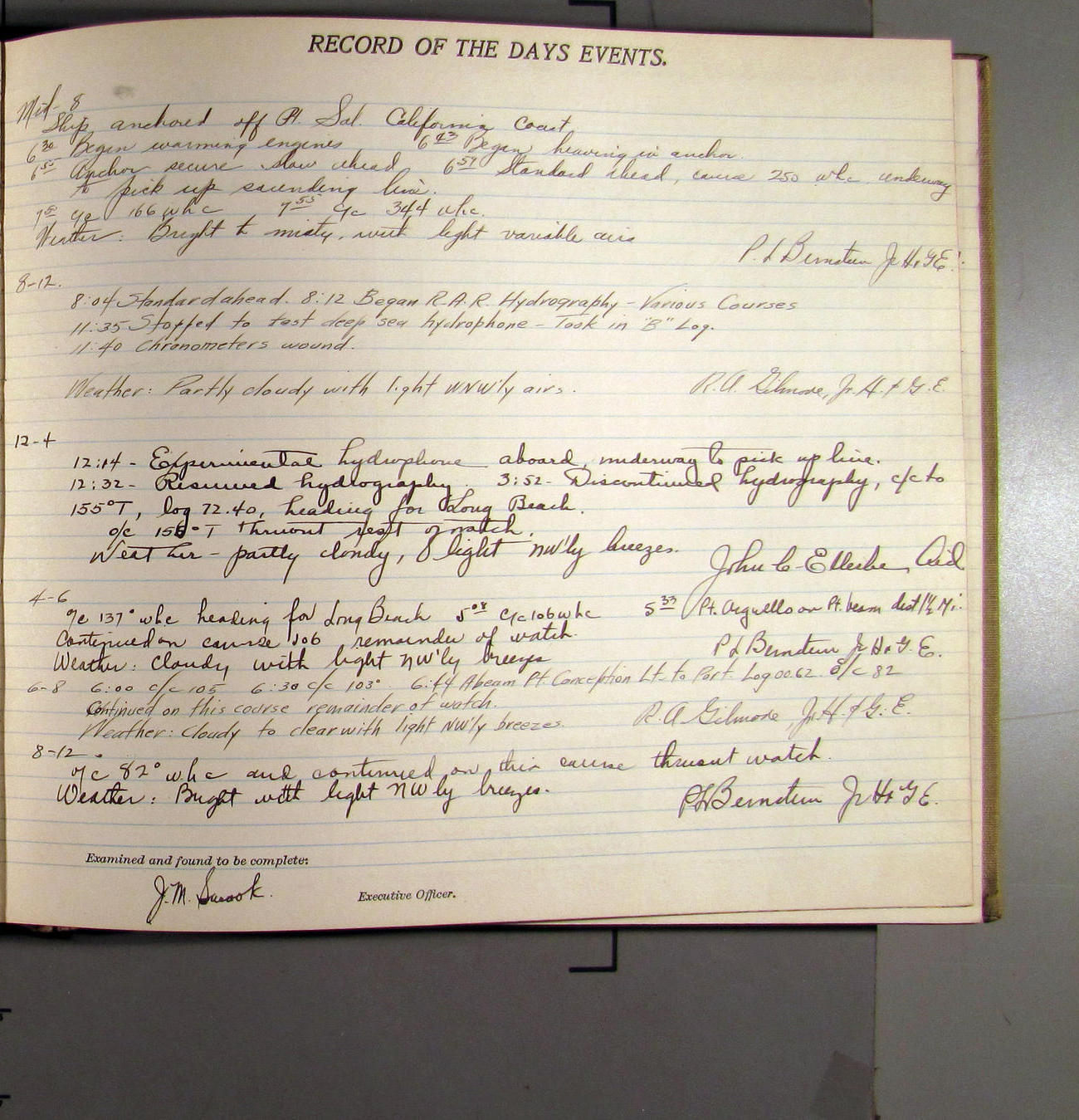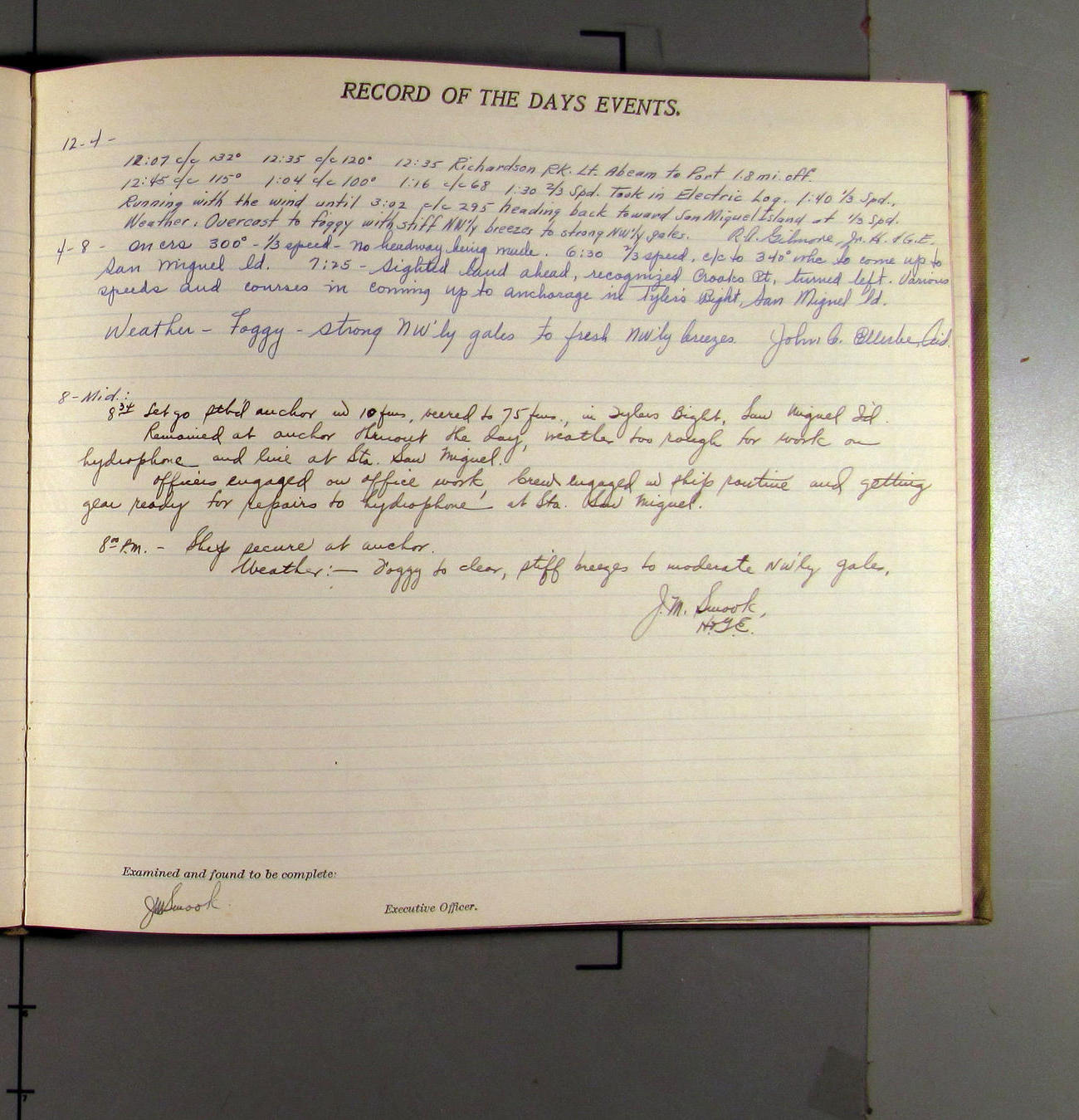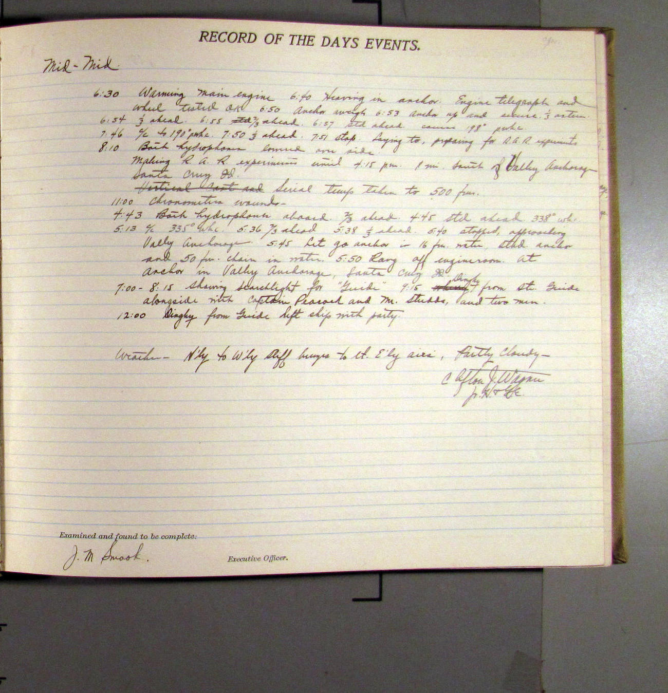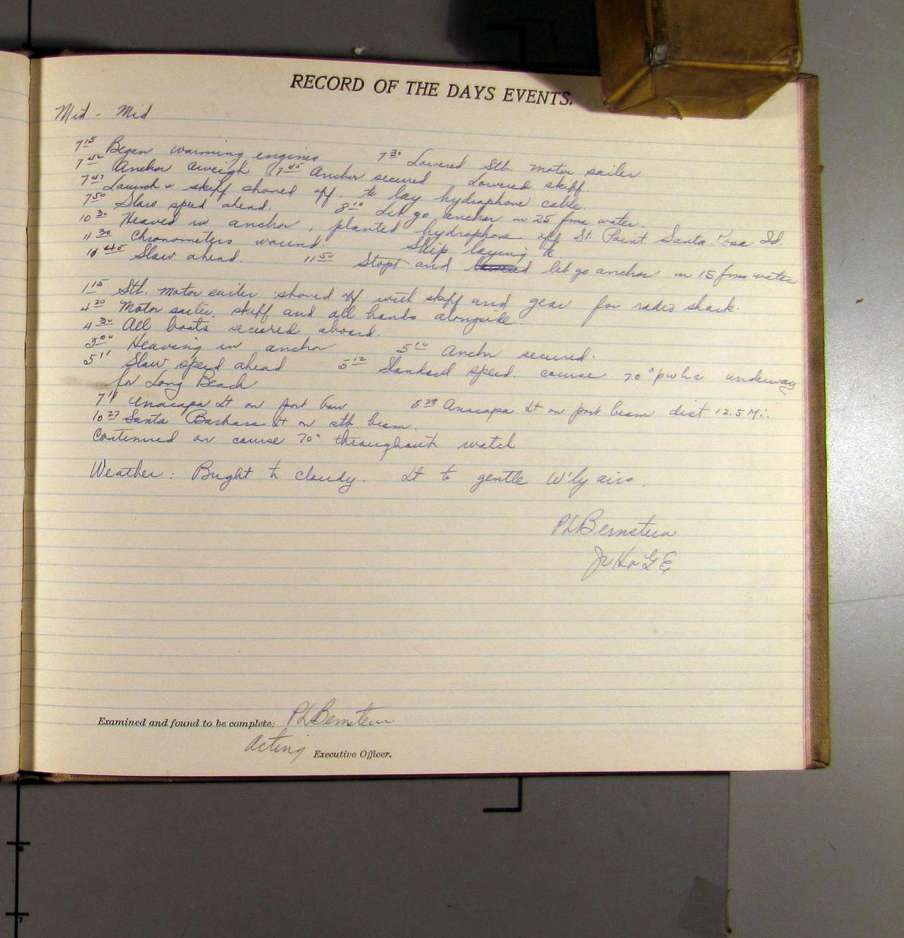 4:55 [PM] Stopped and let go stbd anchor in 10 fms water, 45 fms chain 7 miles NW of Pt Conception, Calif.