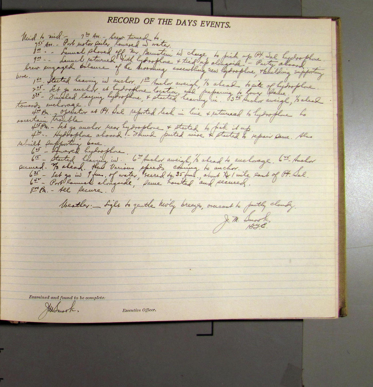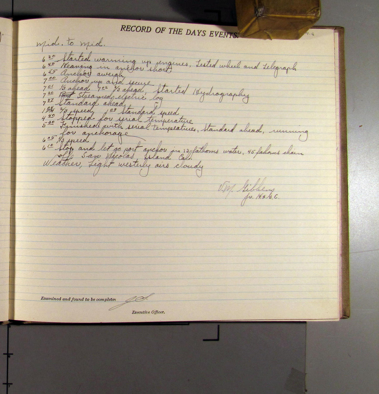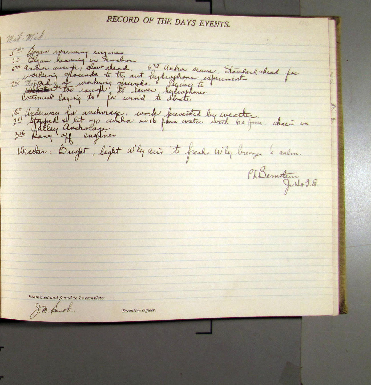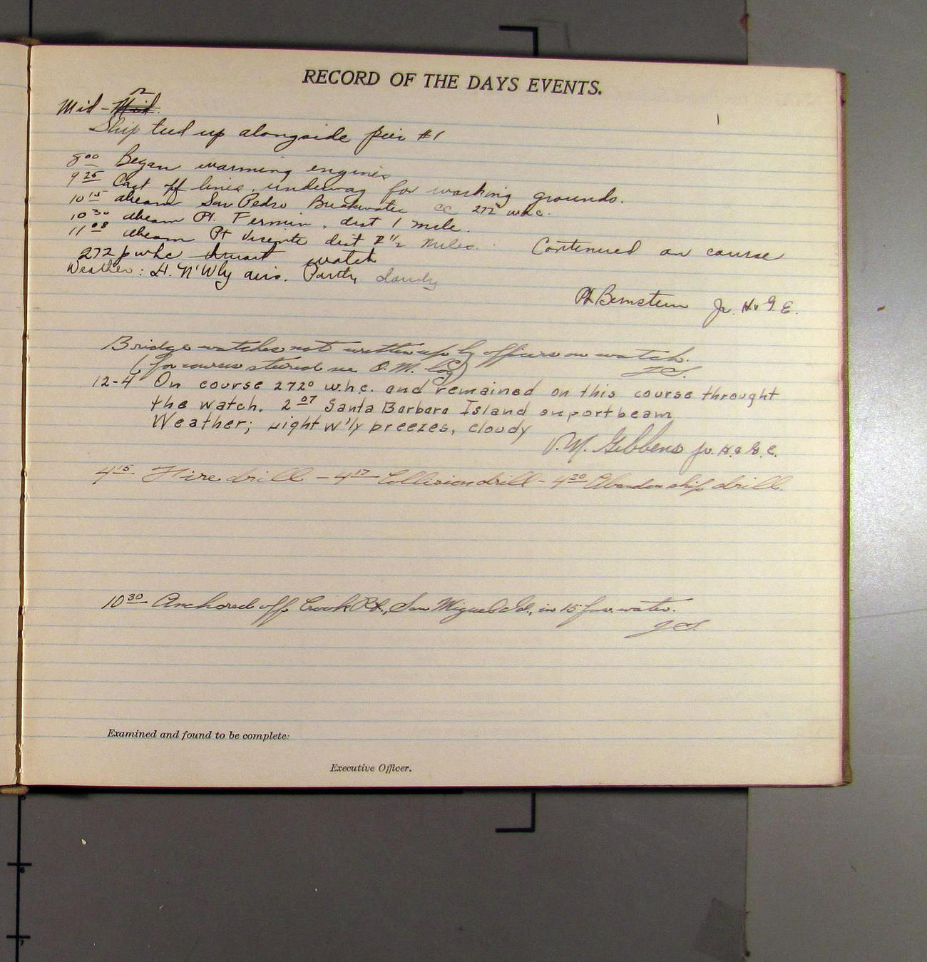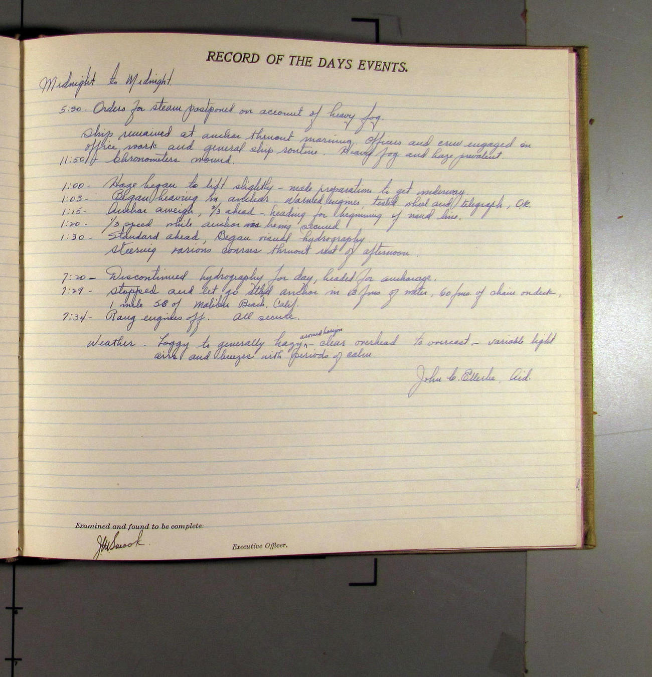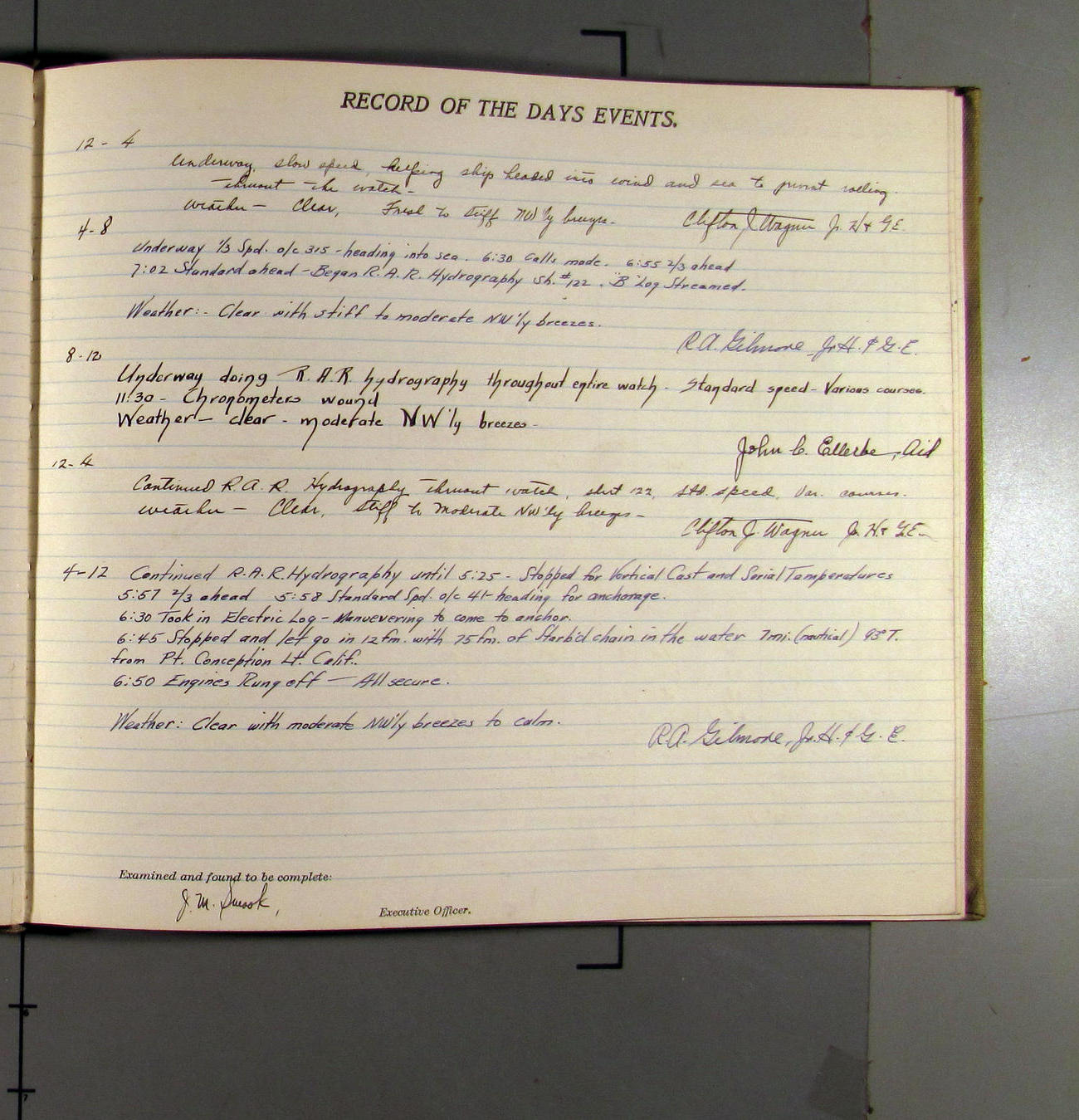 4:55 [PM] Stopped and let go stbd anchor in 10 fms water, 45 fms chain 7 miles NW of Pt Conception, Calif.