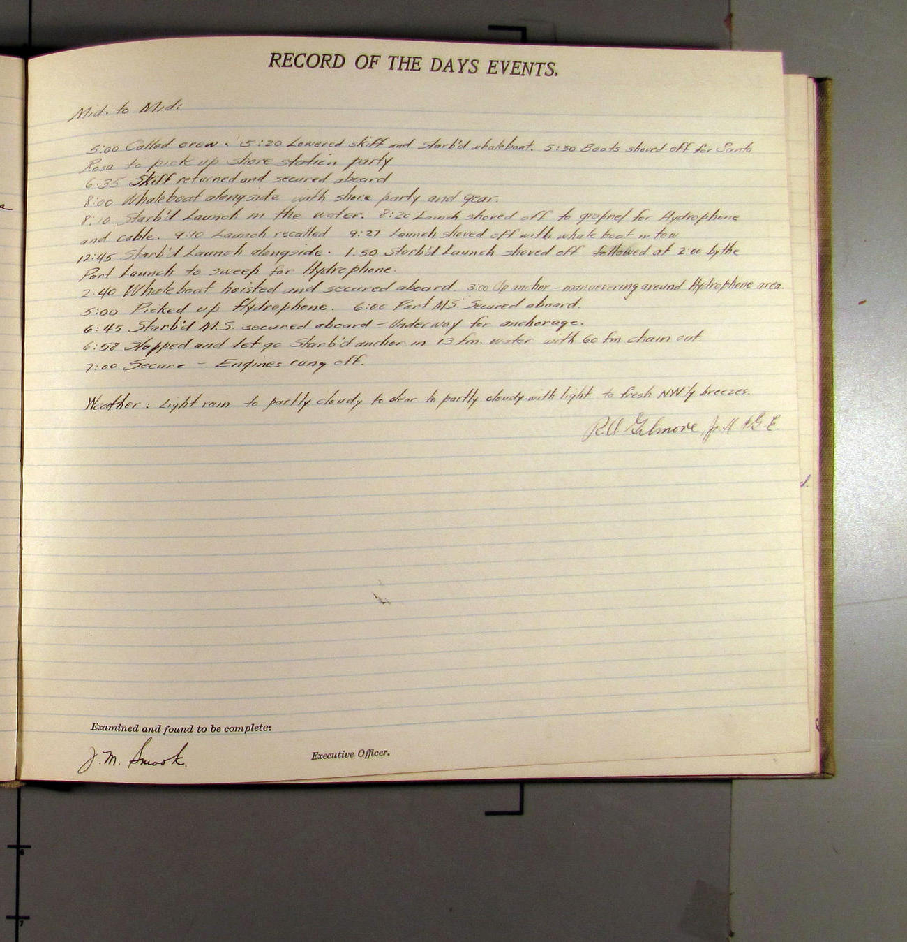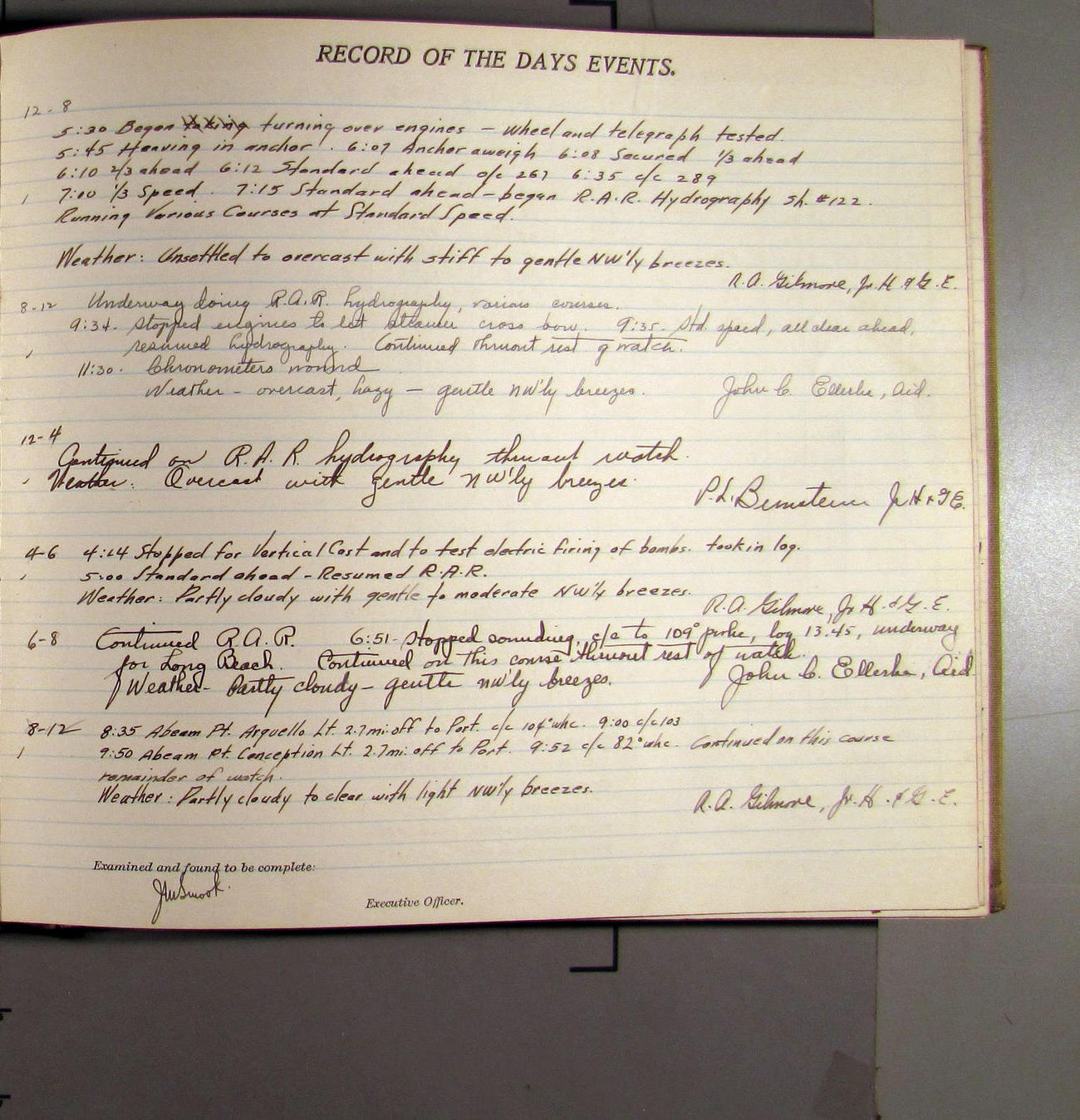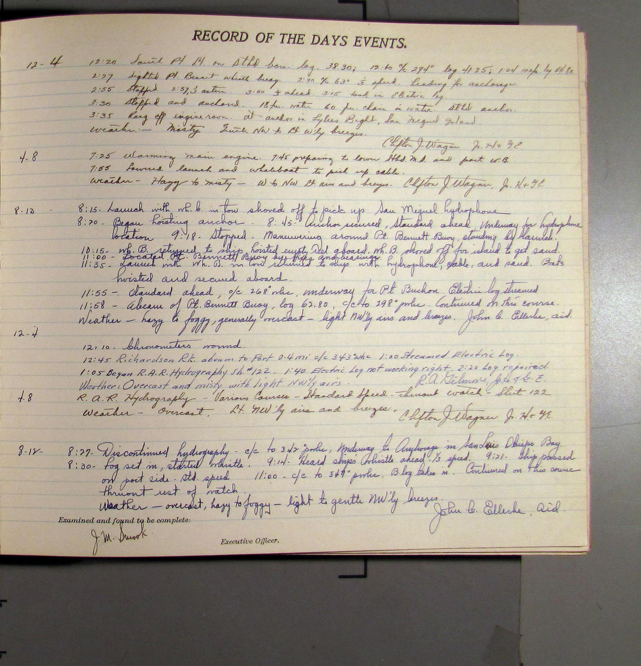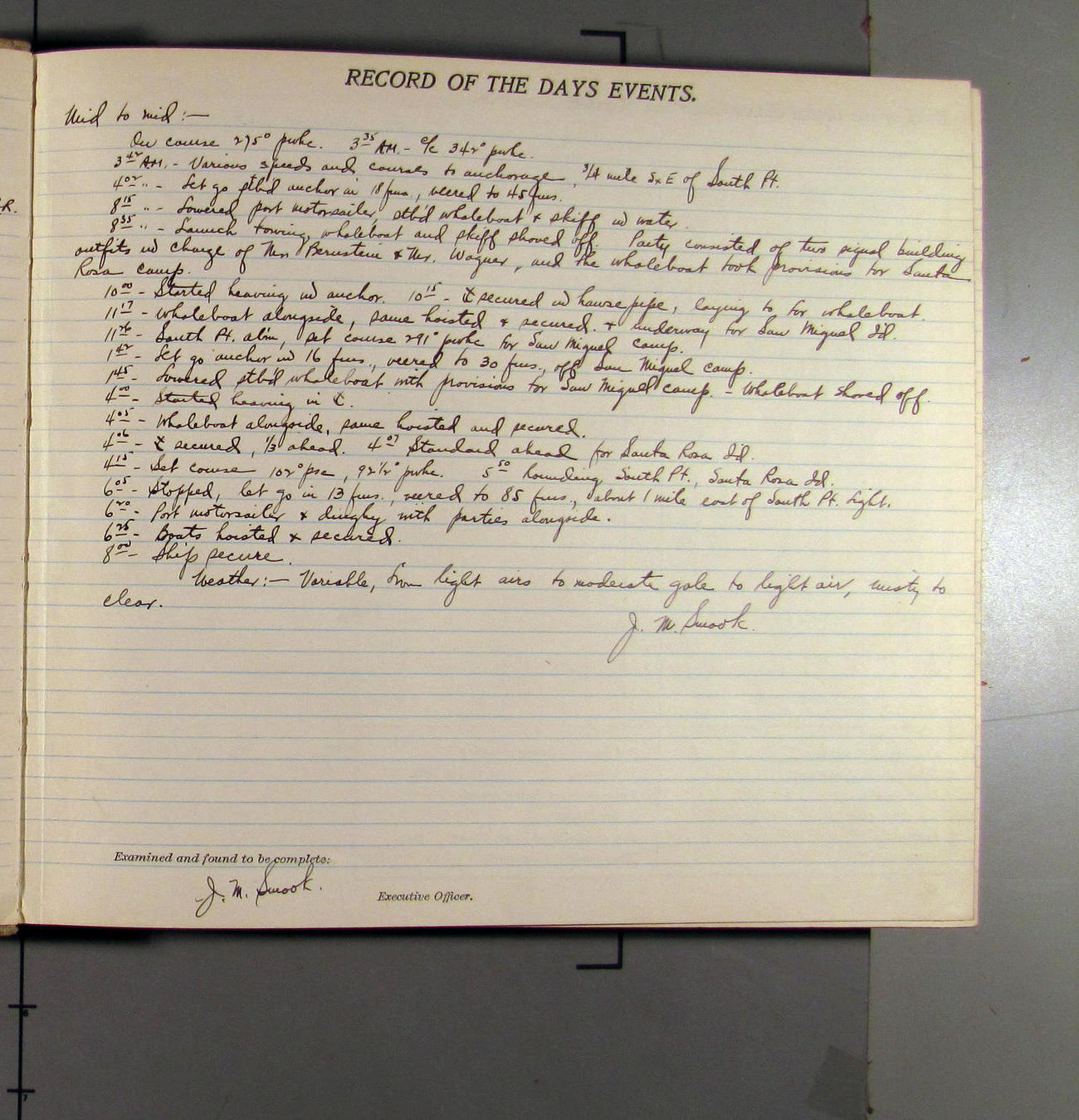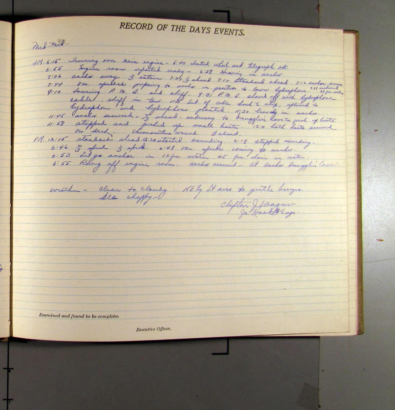 4:55 [PM] Stopped and let go stbd anchor in 10 fms water, 45 fms chain 7 miles NW of Pt Conception, Calif.