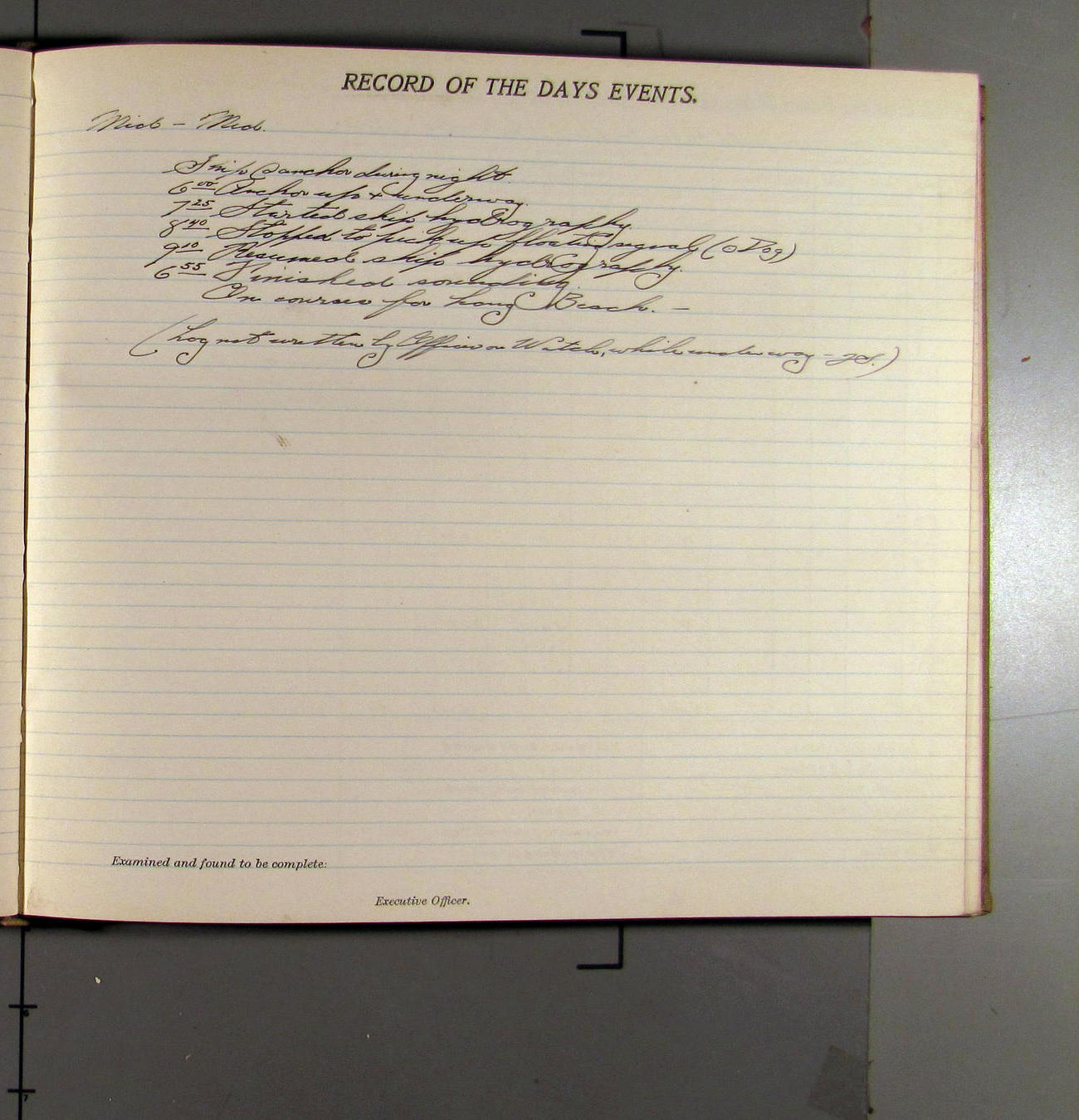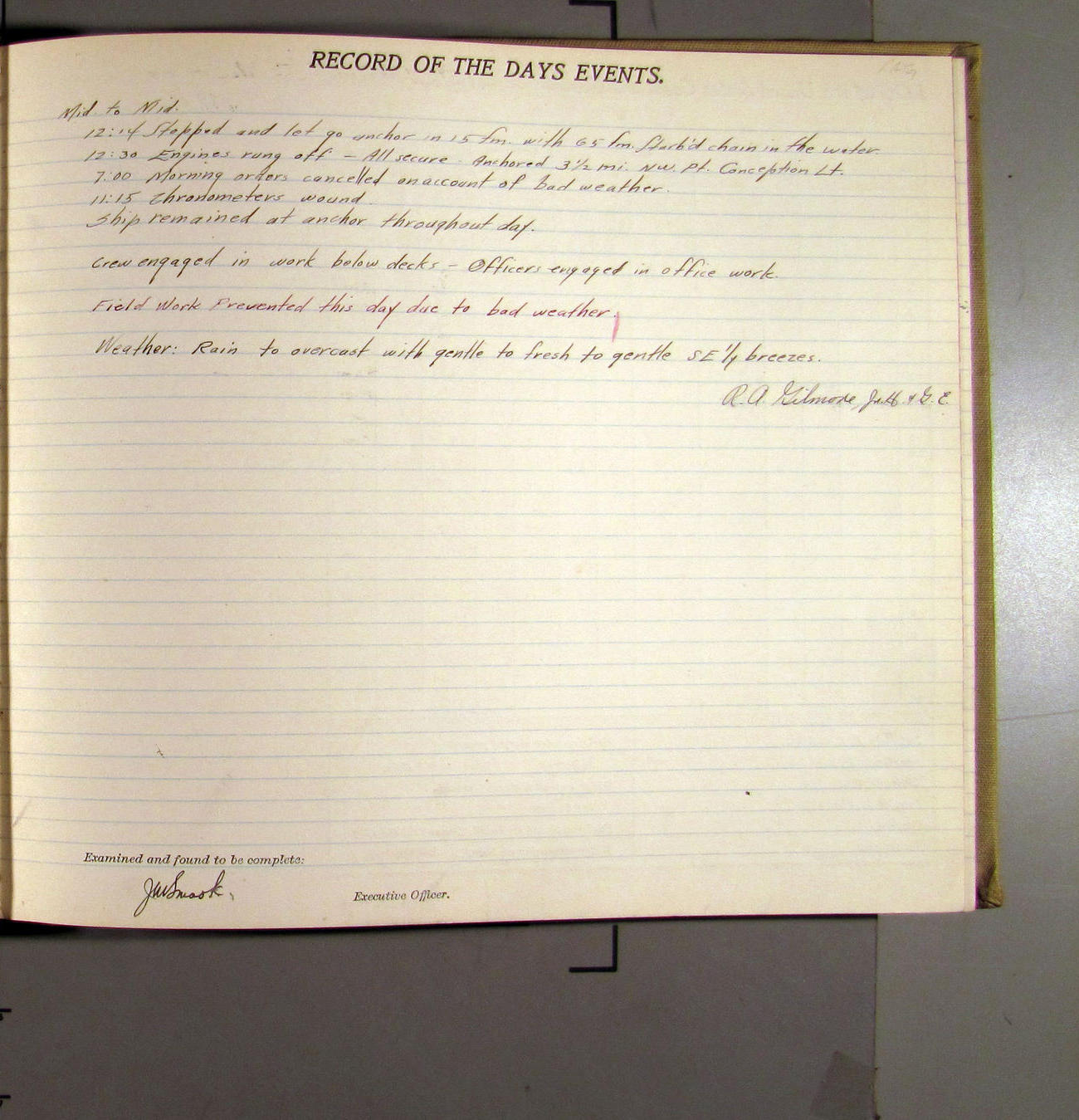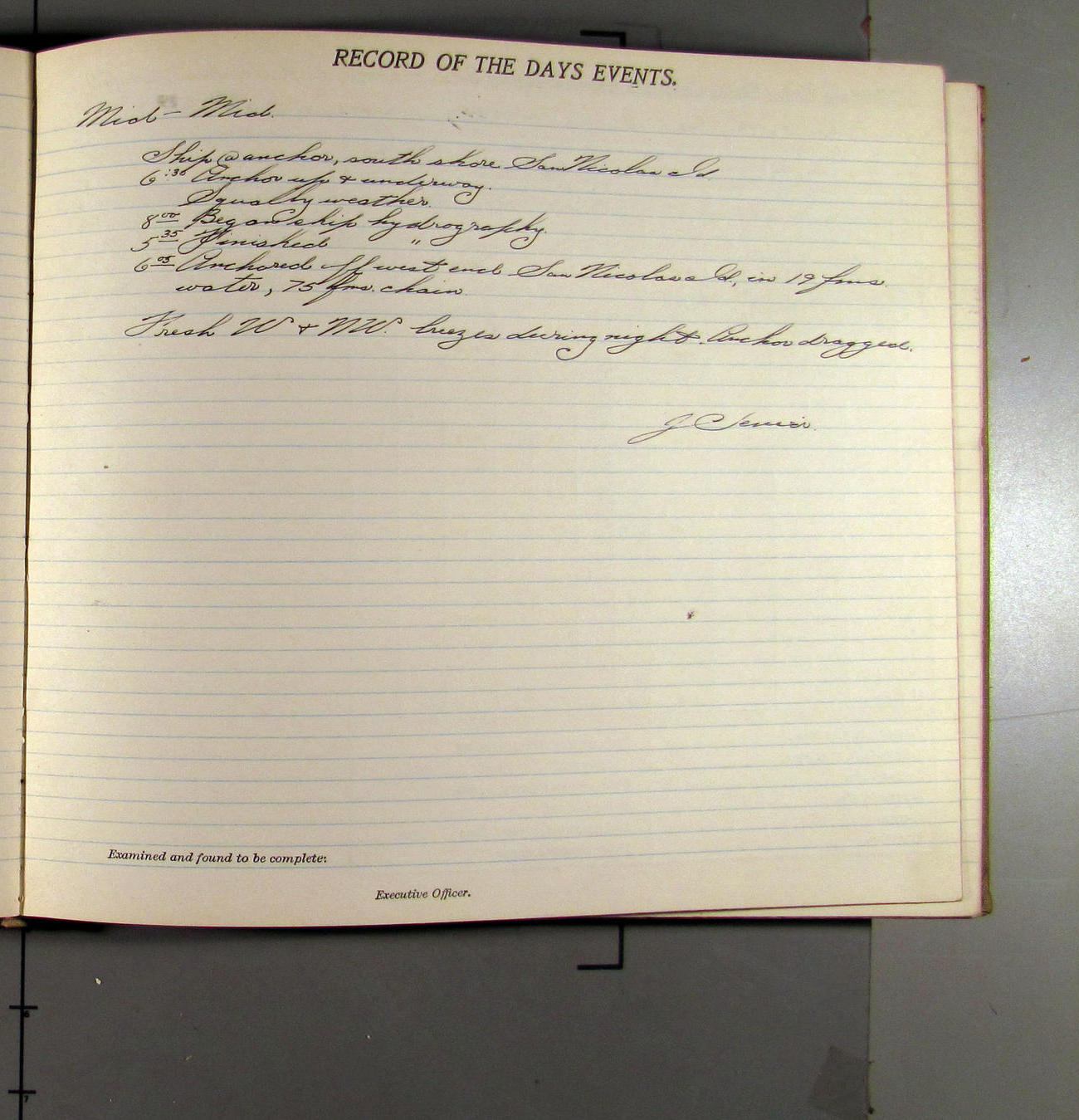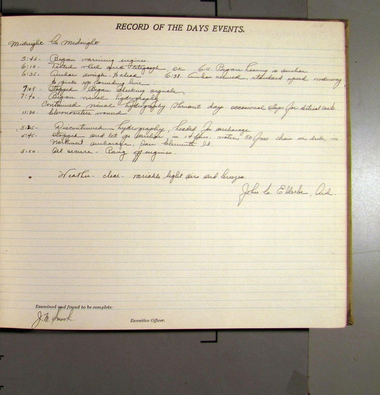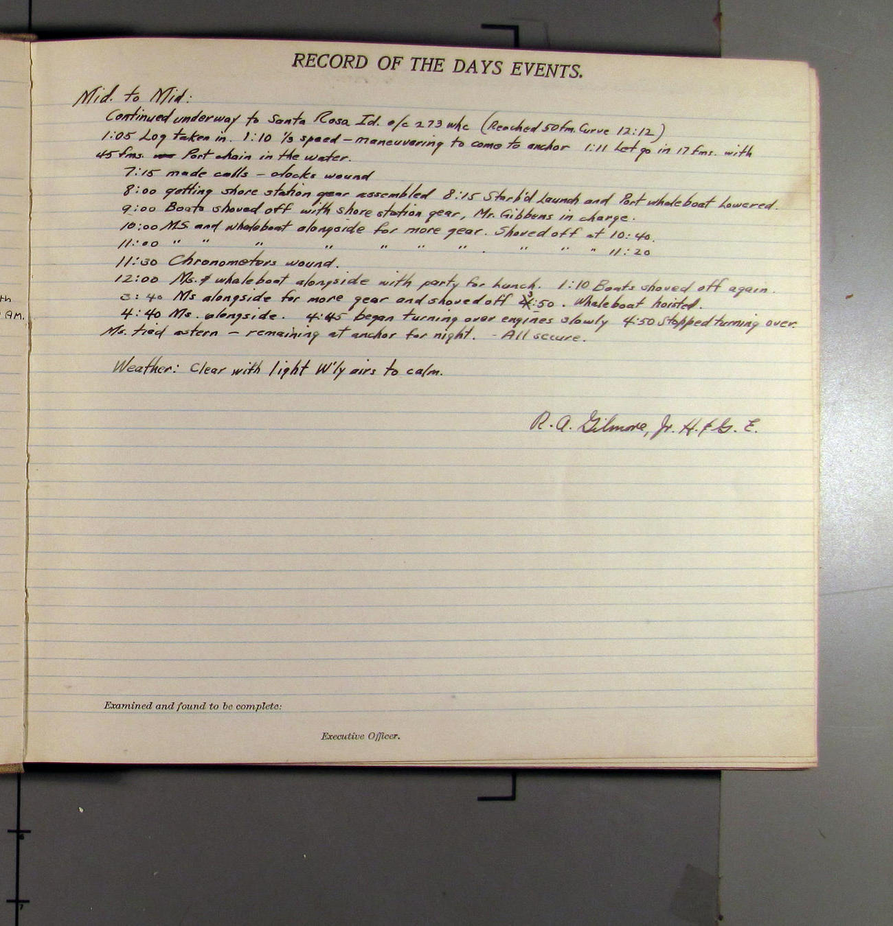 4:55 [PM] Stopped and let go stbd anchor in 10 fms water, 45 fms chain 7 miles NW of Pt Conception, Calif.