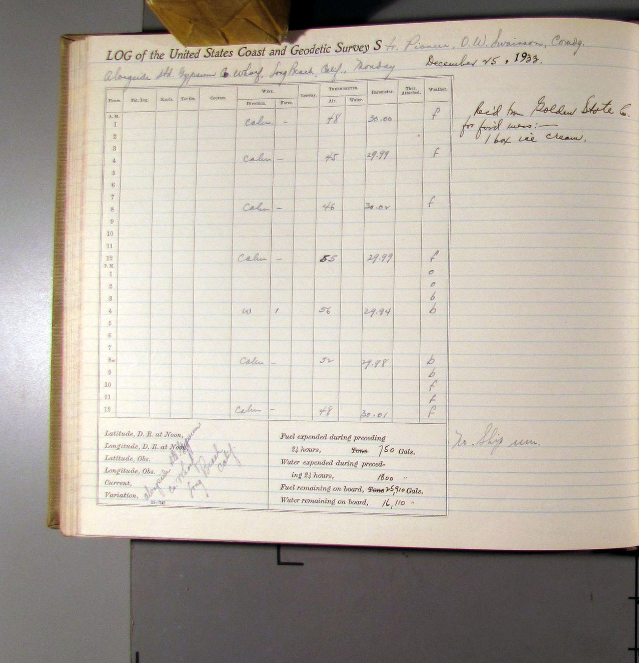 Rec'd from Golden State Co. for for'd mess: - 1 box ice cream.