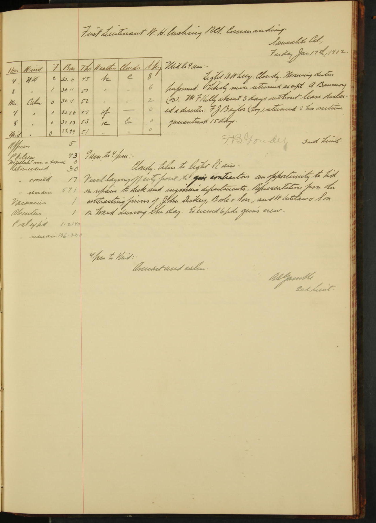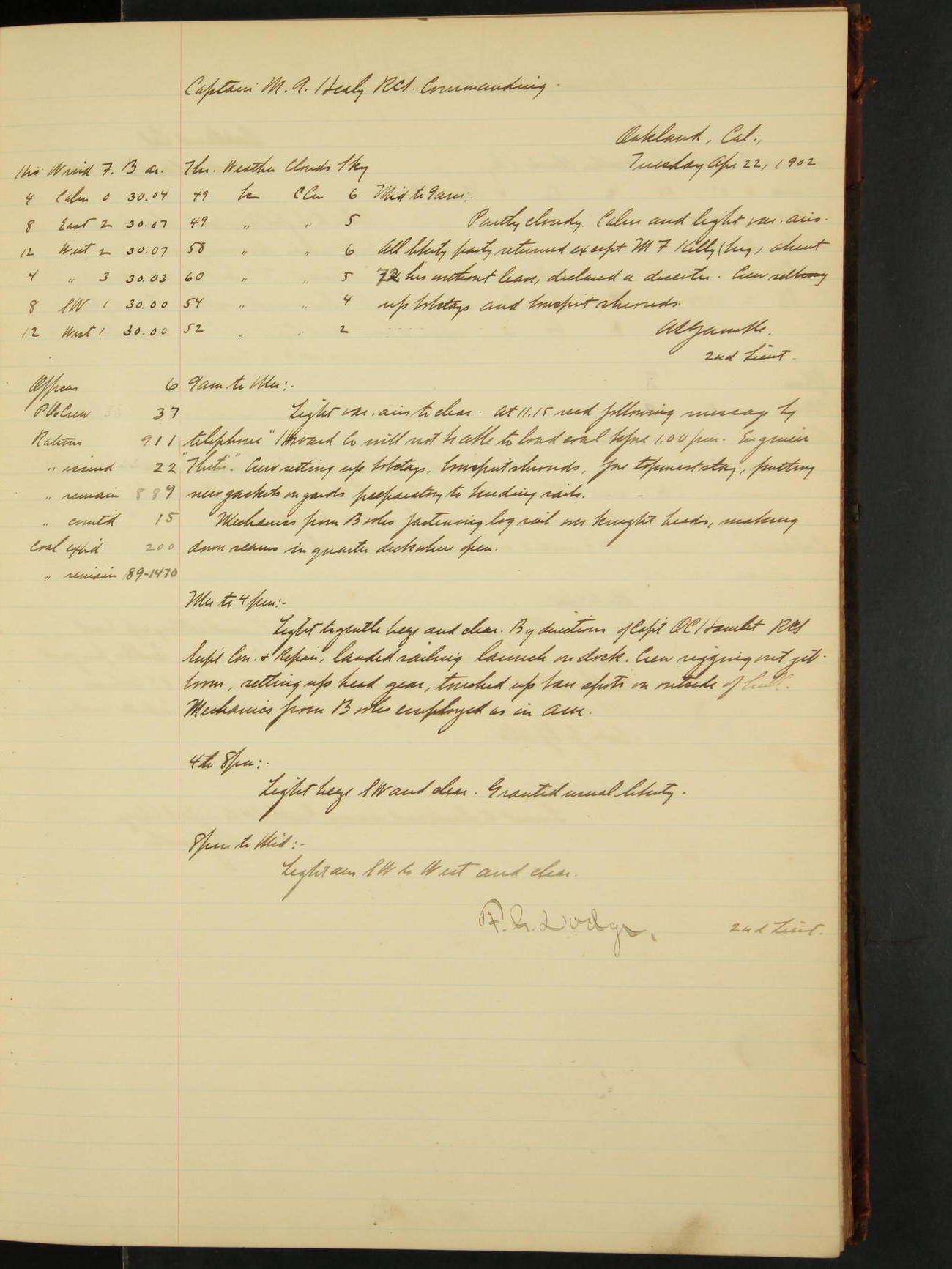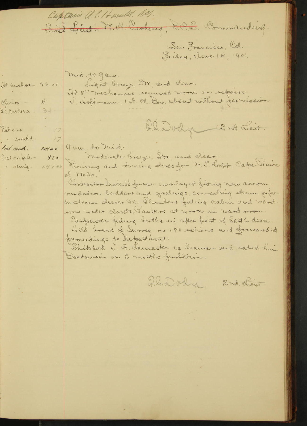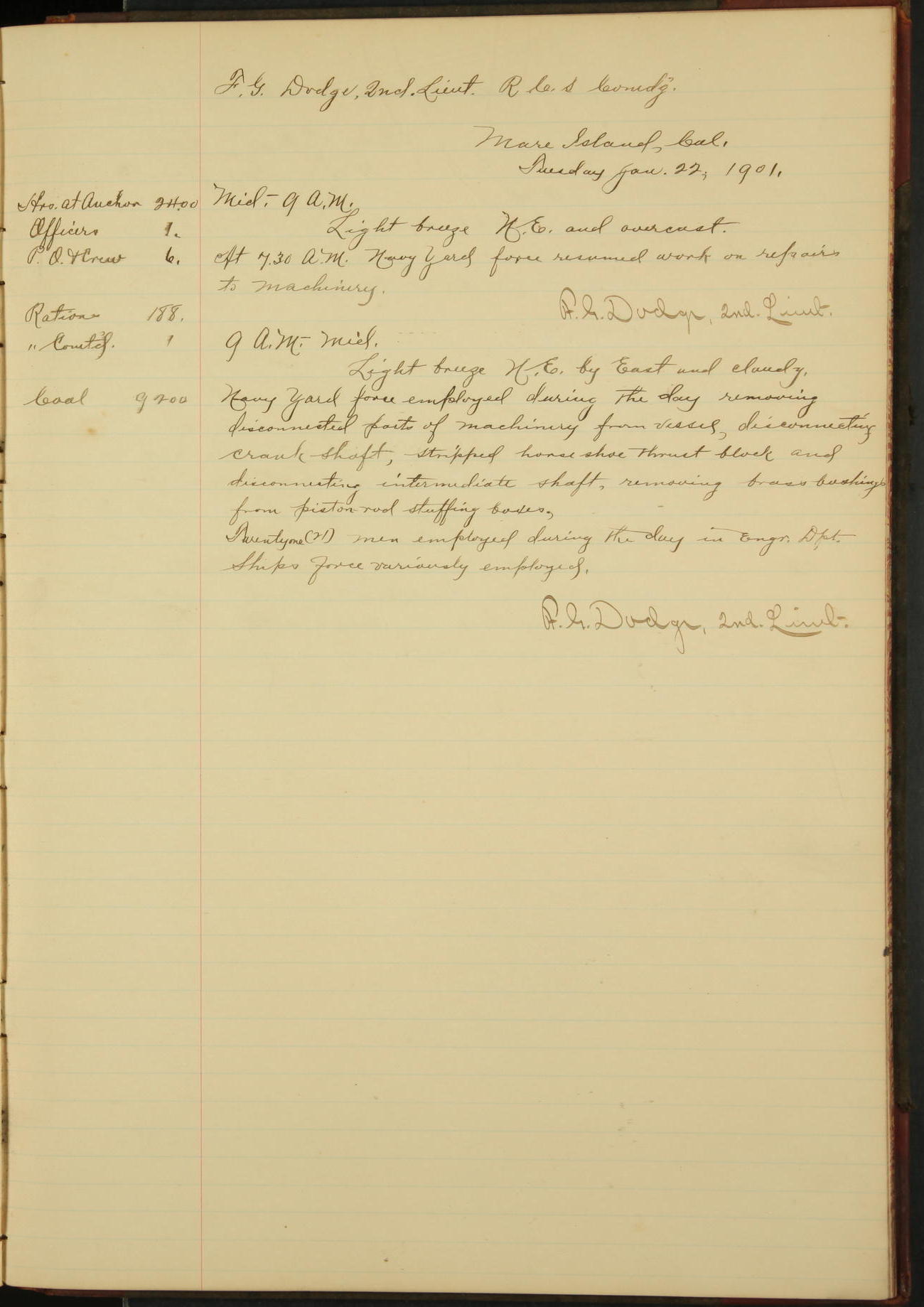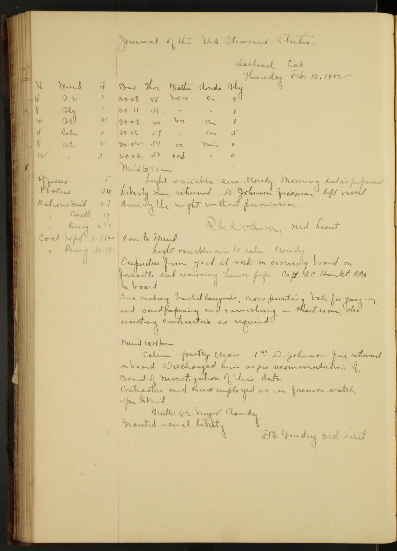 2nd Lieutenant C.E. Johnston left vessel for duty in accordance with Department order 19th instant in connection with Court Martial to be convened.