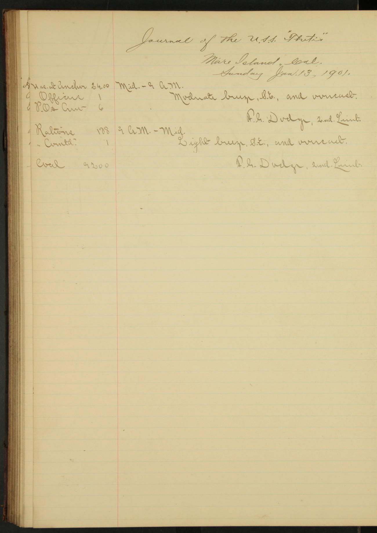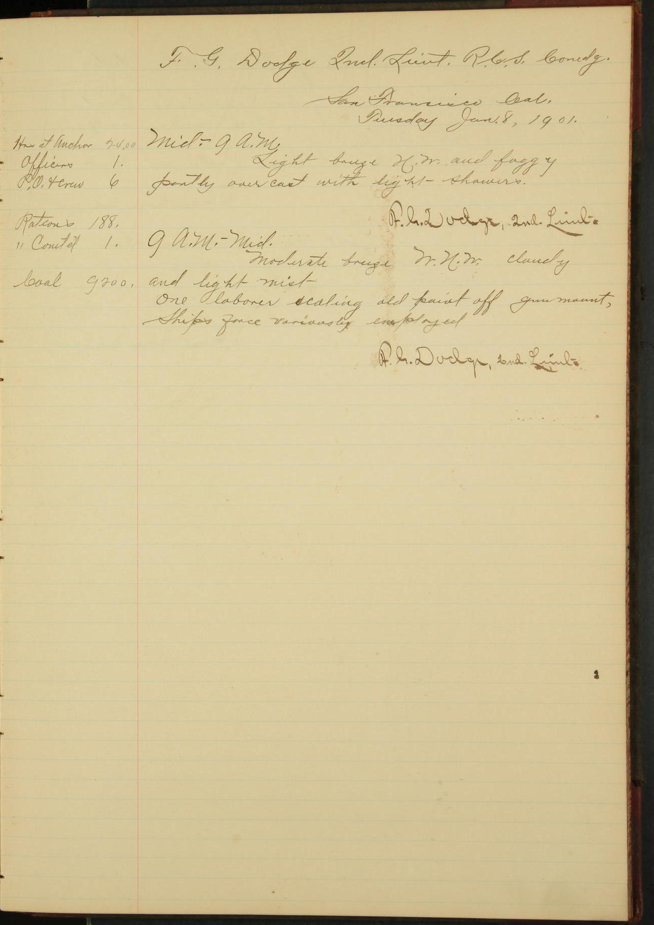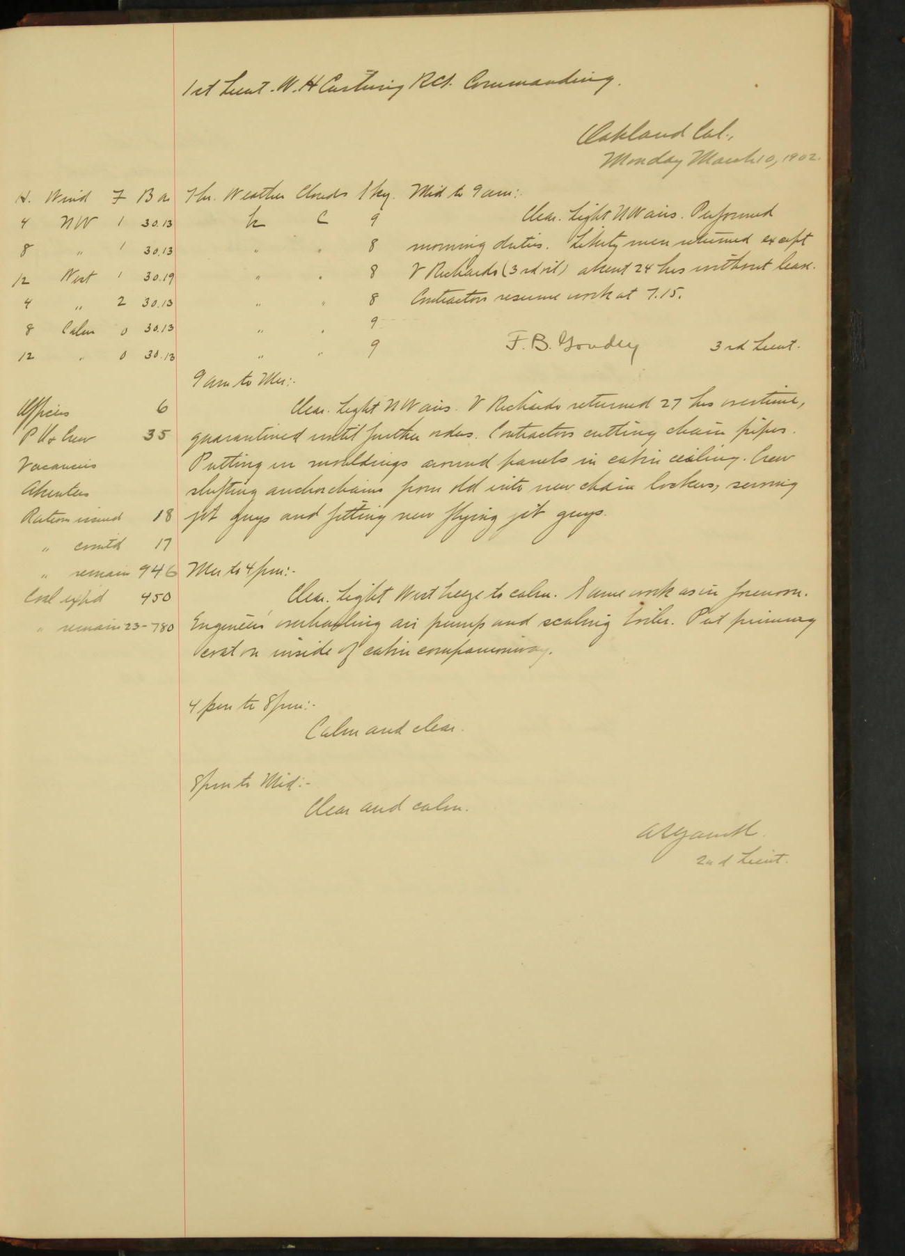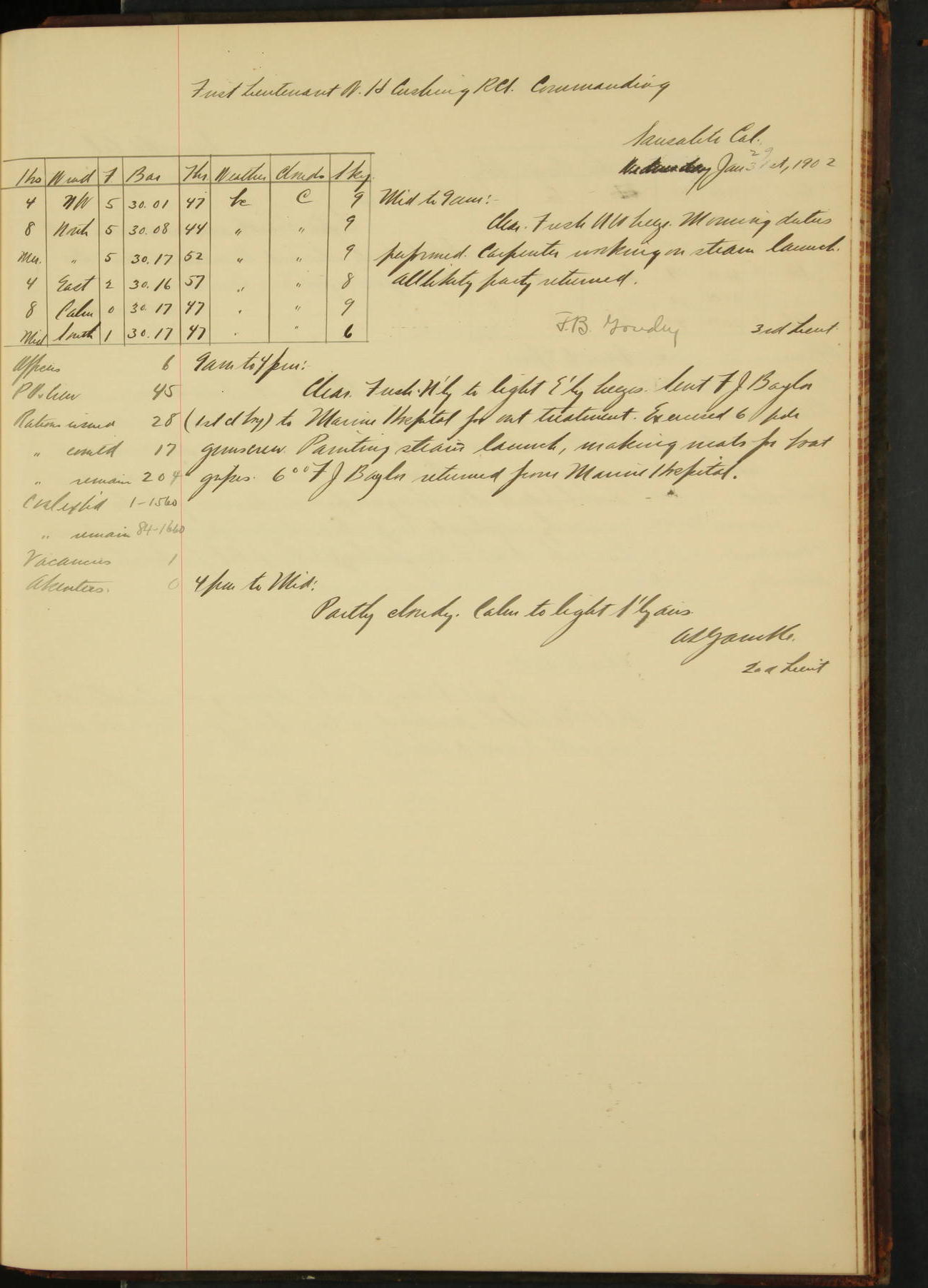 2nd Lieutenant C.E. Johnston left vessel for duty in accordance with Department order 19th instant in connection with Court Martial to be convened.
