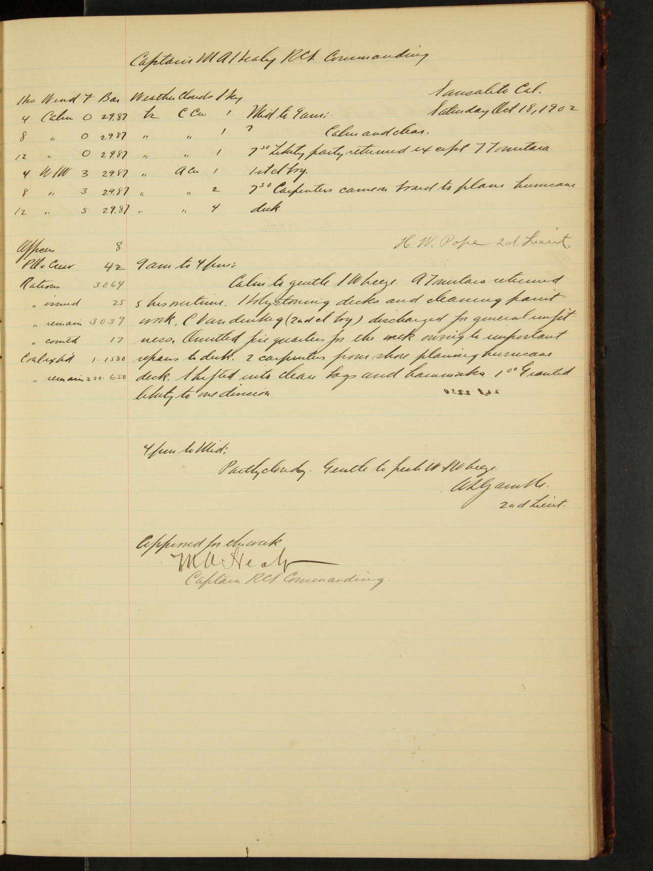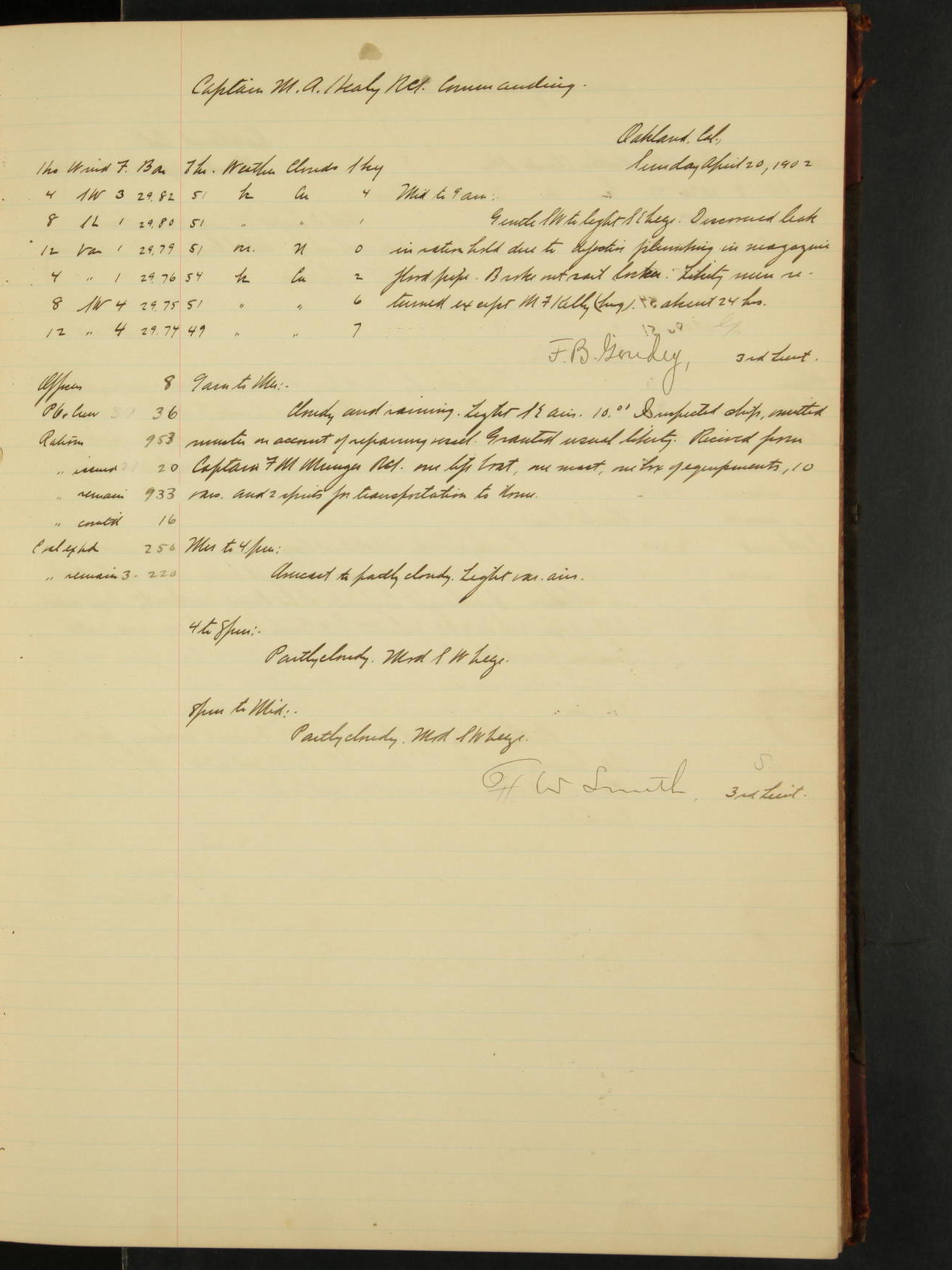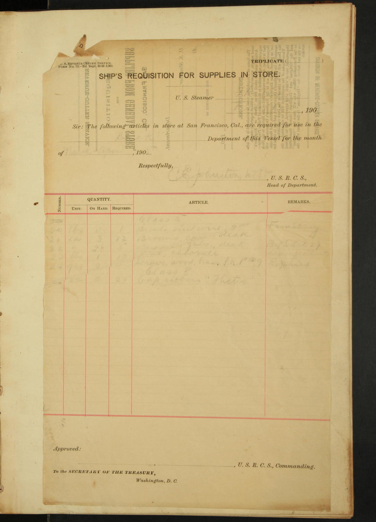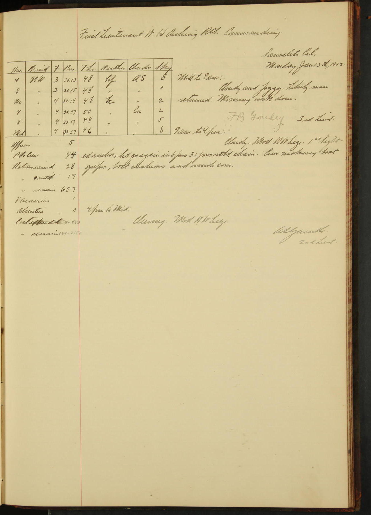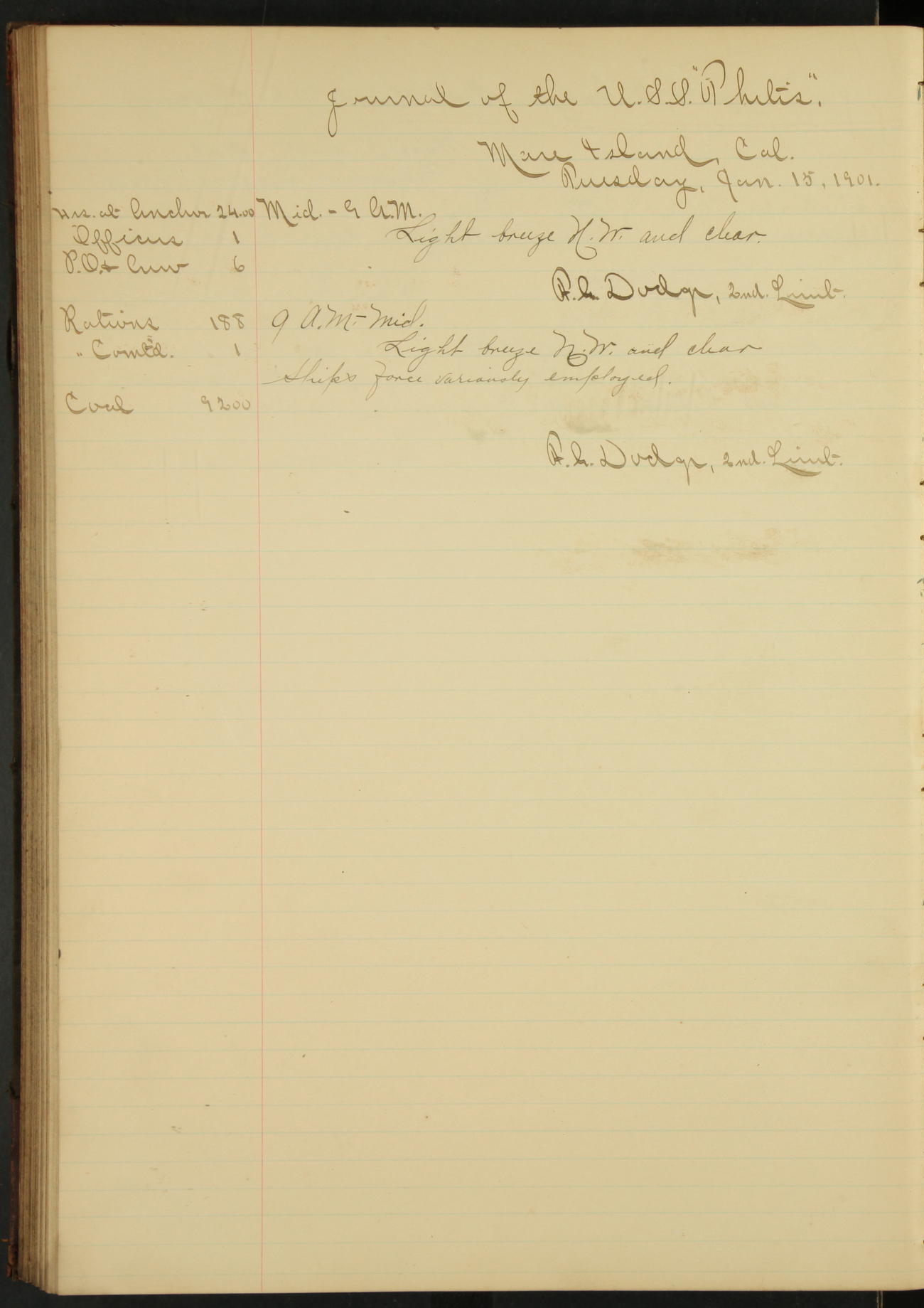 2nd Lieutenant C.E. Johnston left vessel for duty in accordance with Department order 19th instant in connection with Court Martial to be convened.