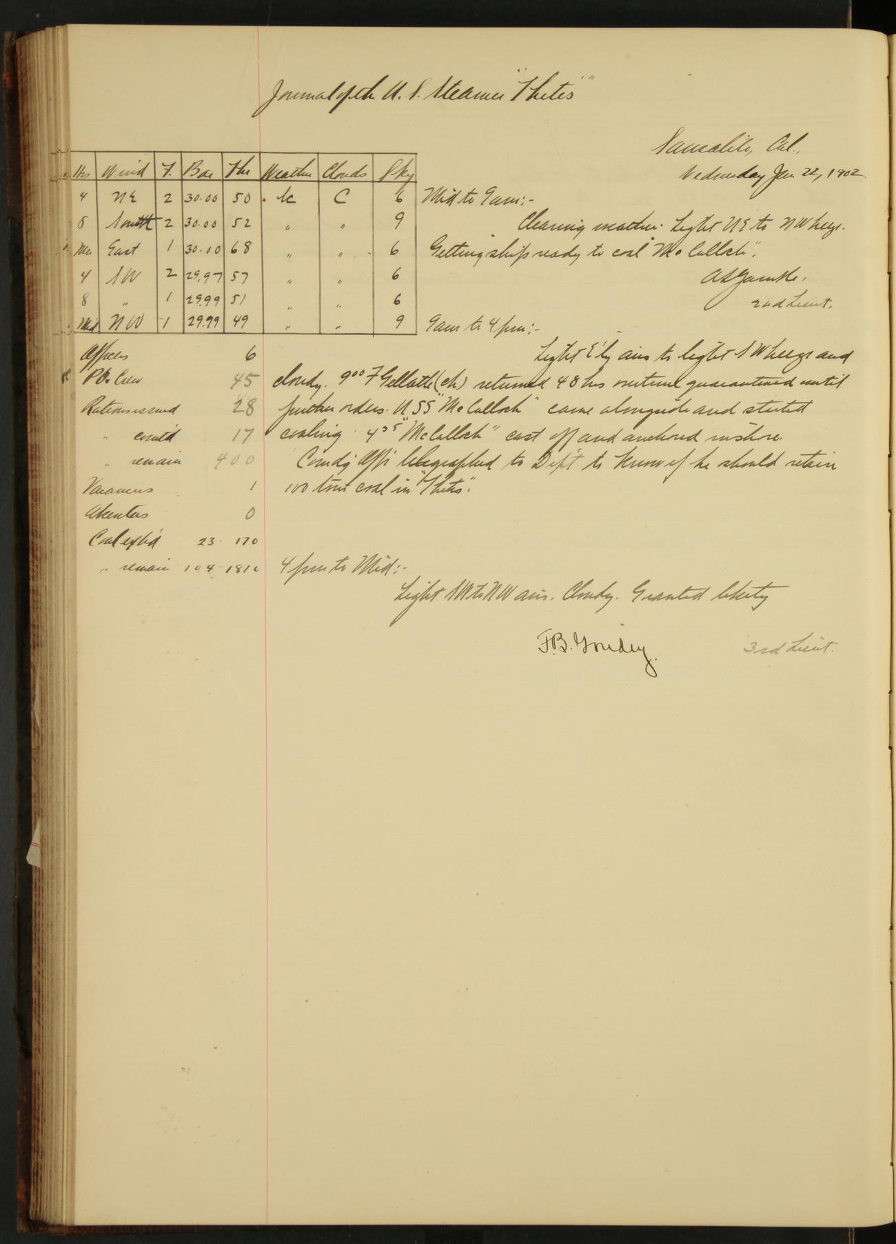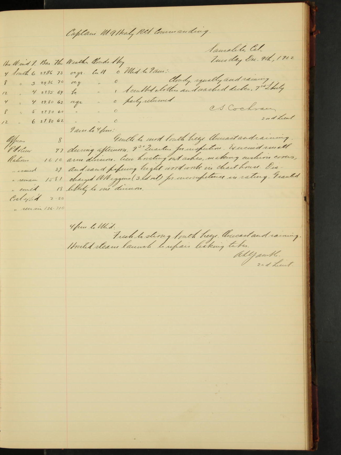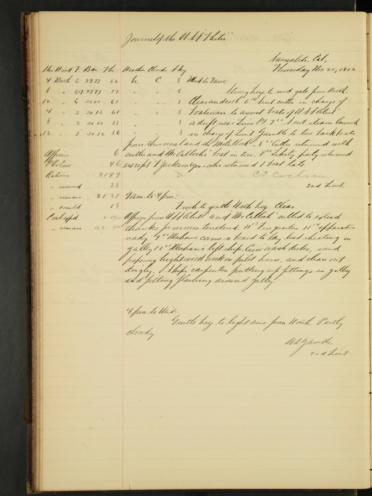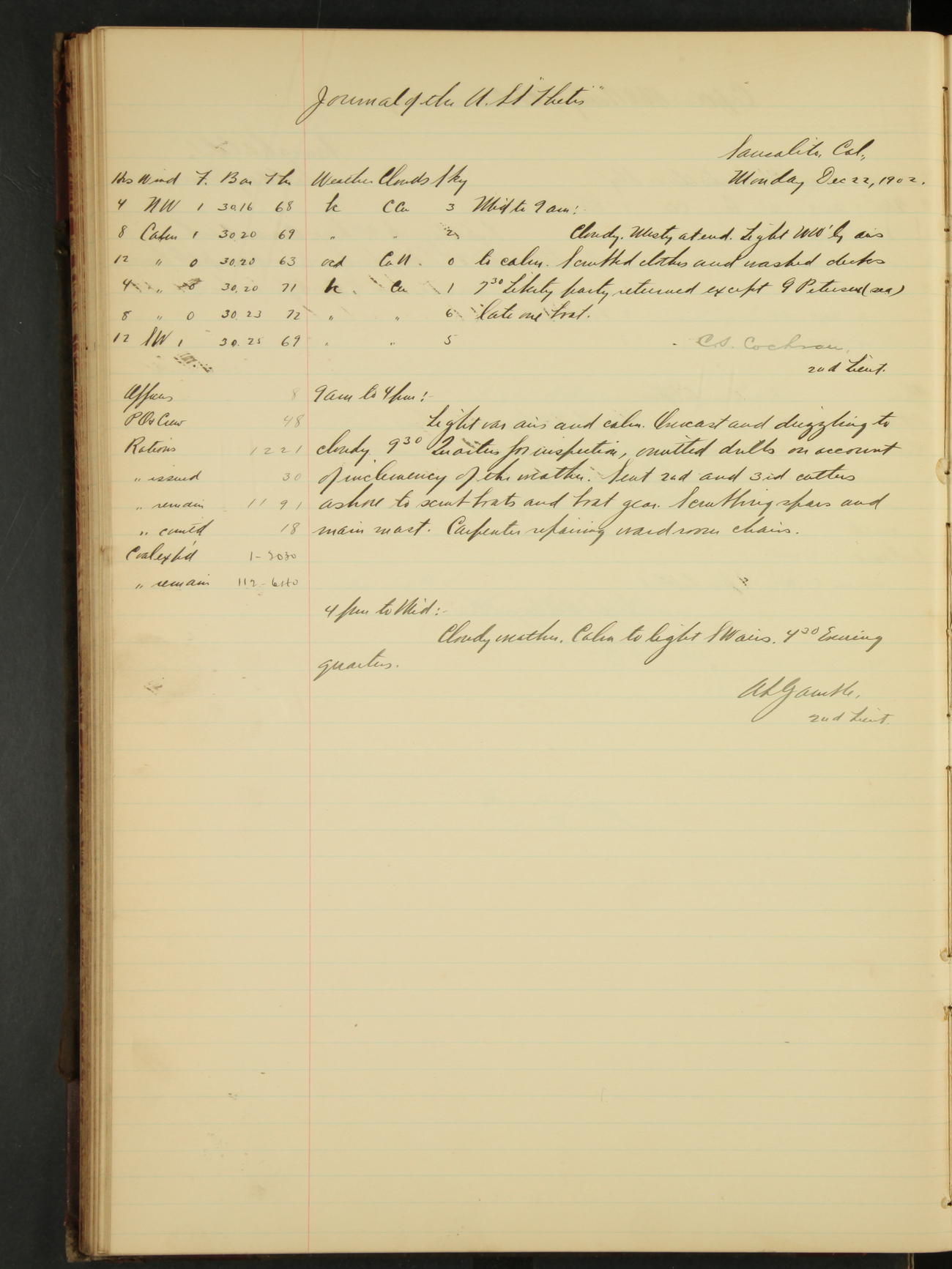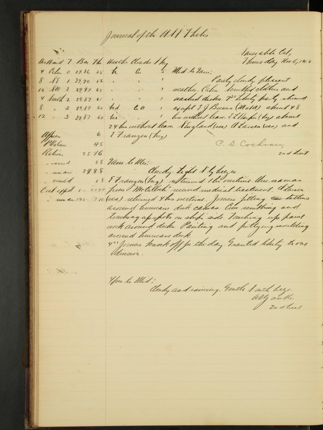 2nd Lieutenant C.S. Cochran, Revenue Cutter Service, left ship, ordered to USRC “McCulloch”, Department order of 18th instant.