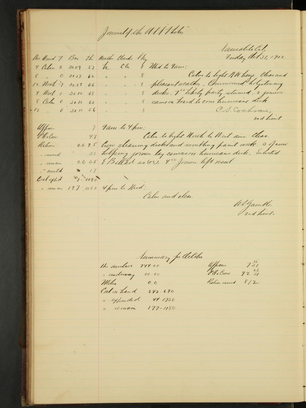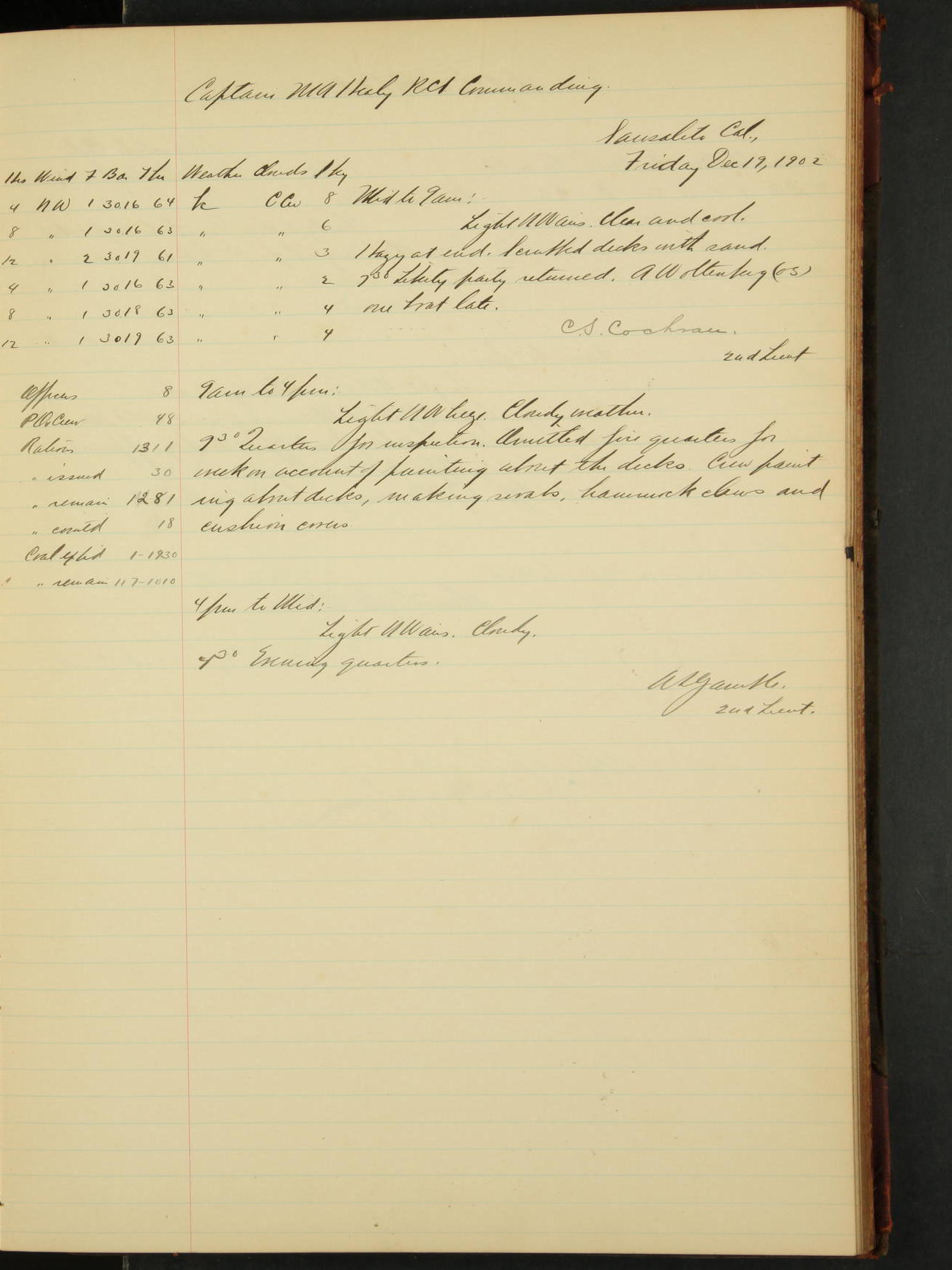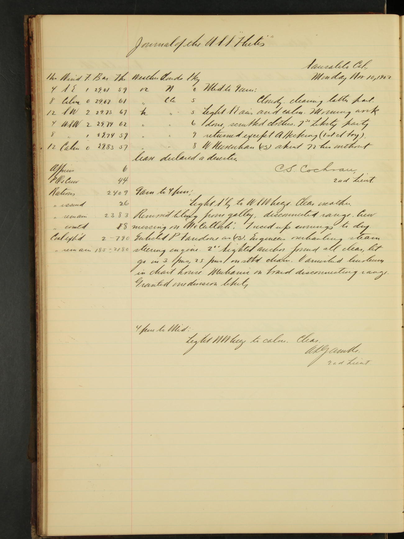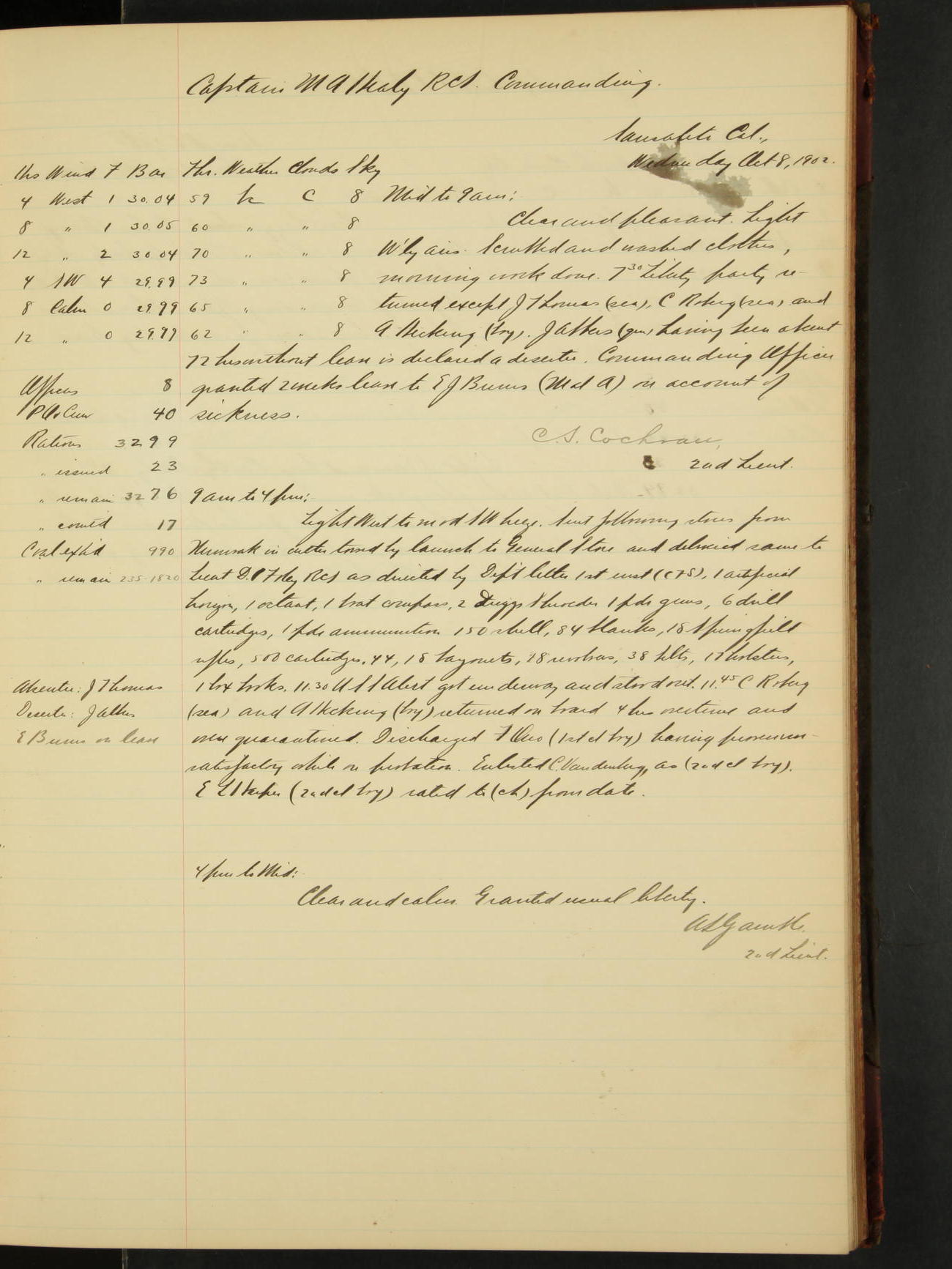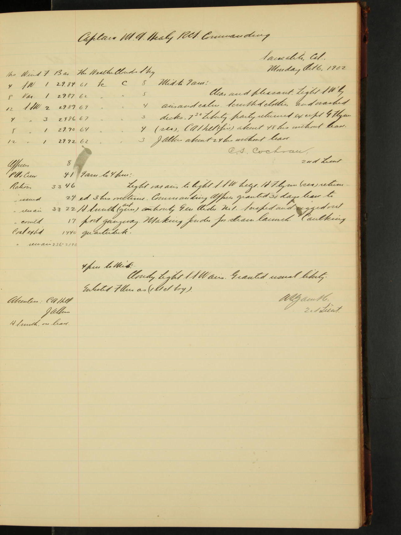 2nd Lieutenant C.S. Cochran, Revenue Cutter Service, left ship, ordered to USRC “McCulloch”, Department order of 18th instant.