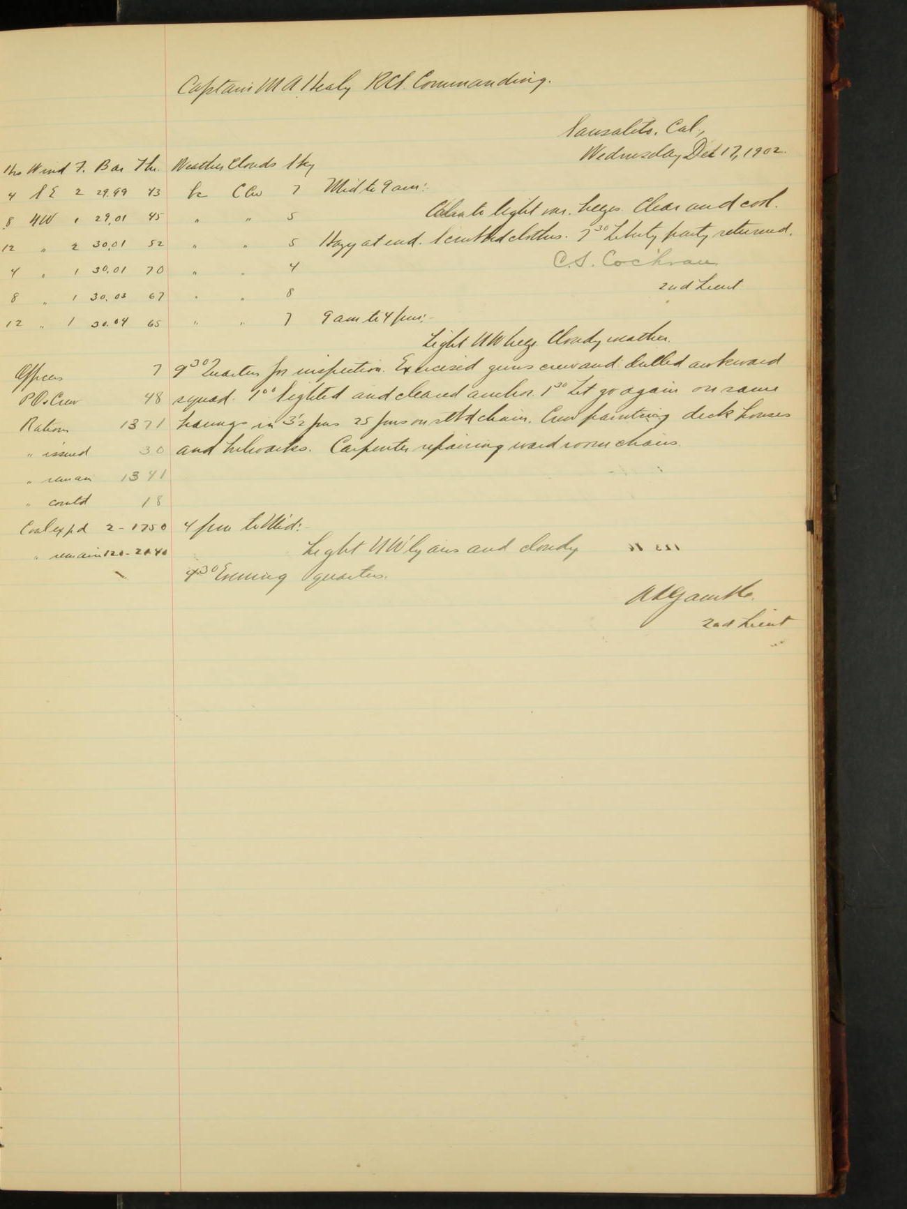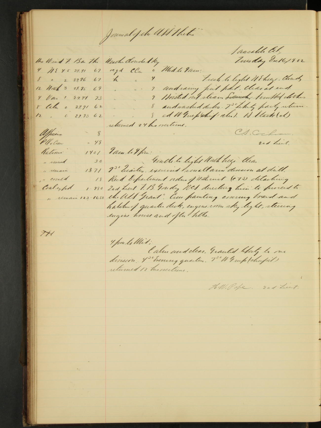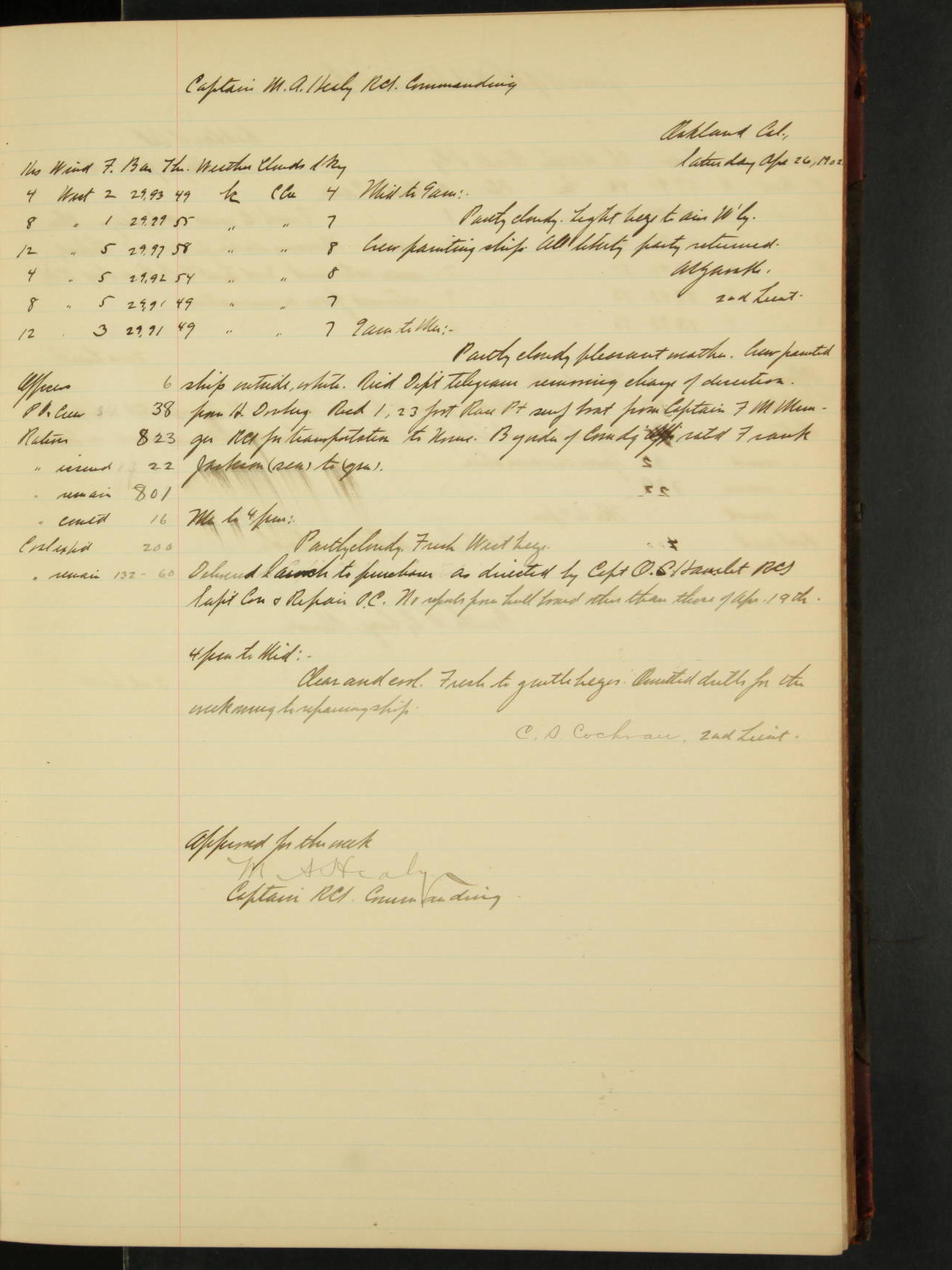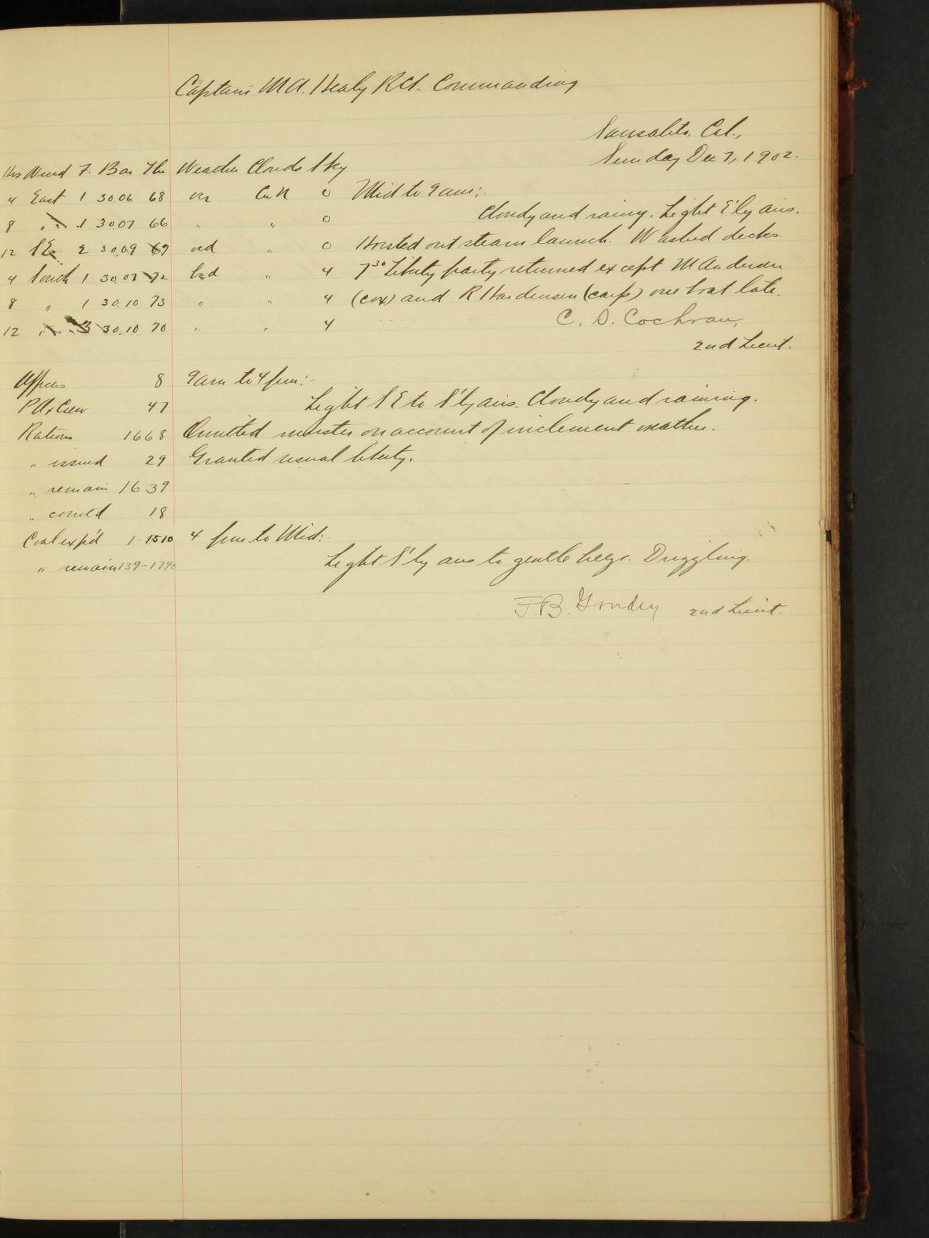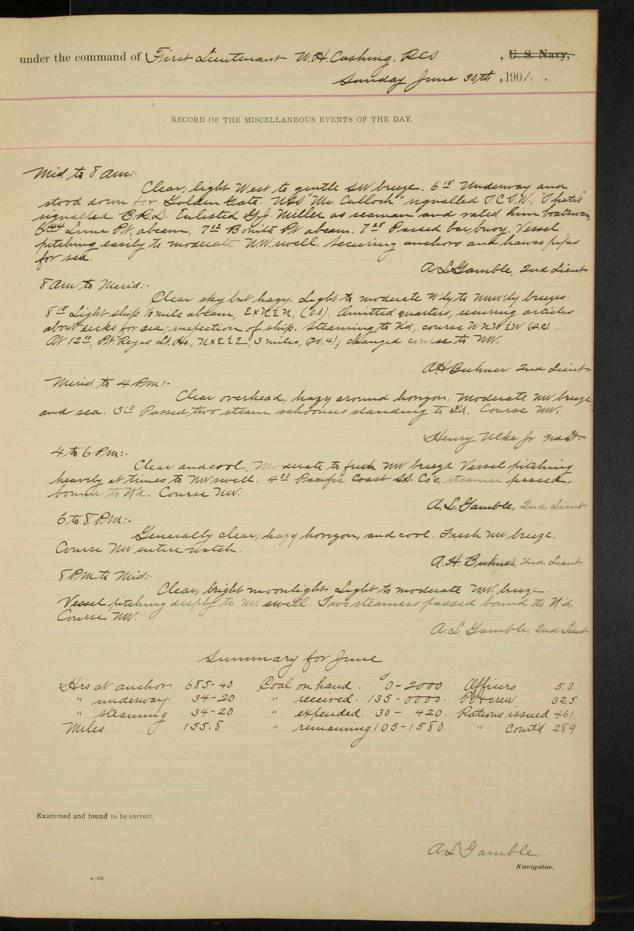 2nd Lieutenant C.S. Cochran, Revenue Cutter Service, left ship, ordered to USRC “McCulloch”, Department order of 18th instant.
