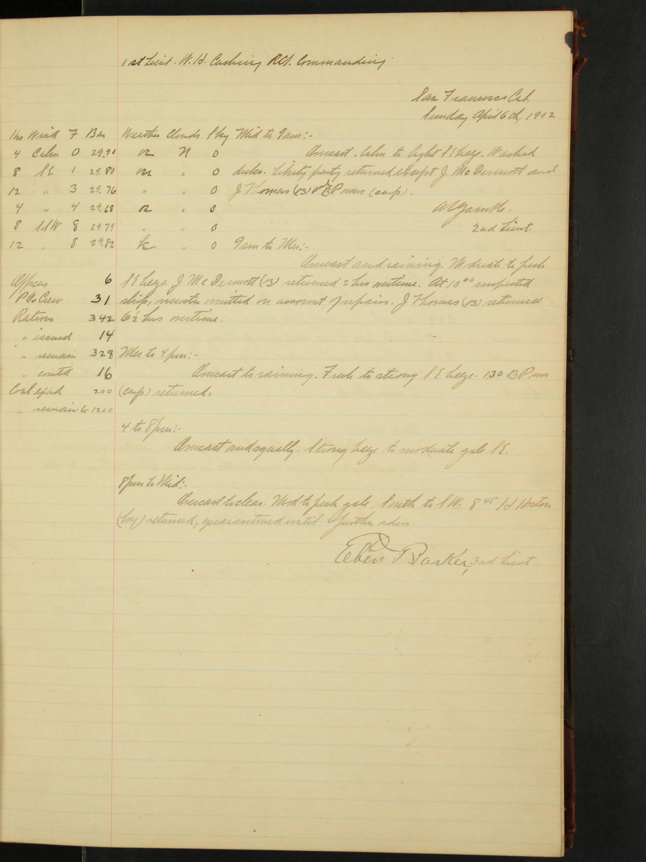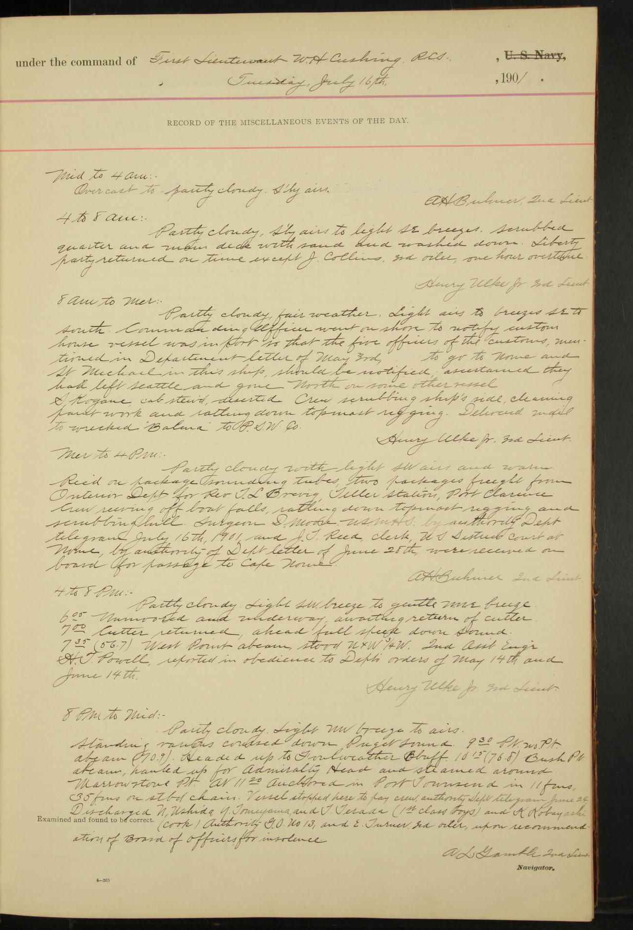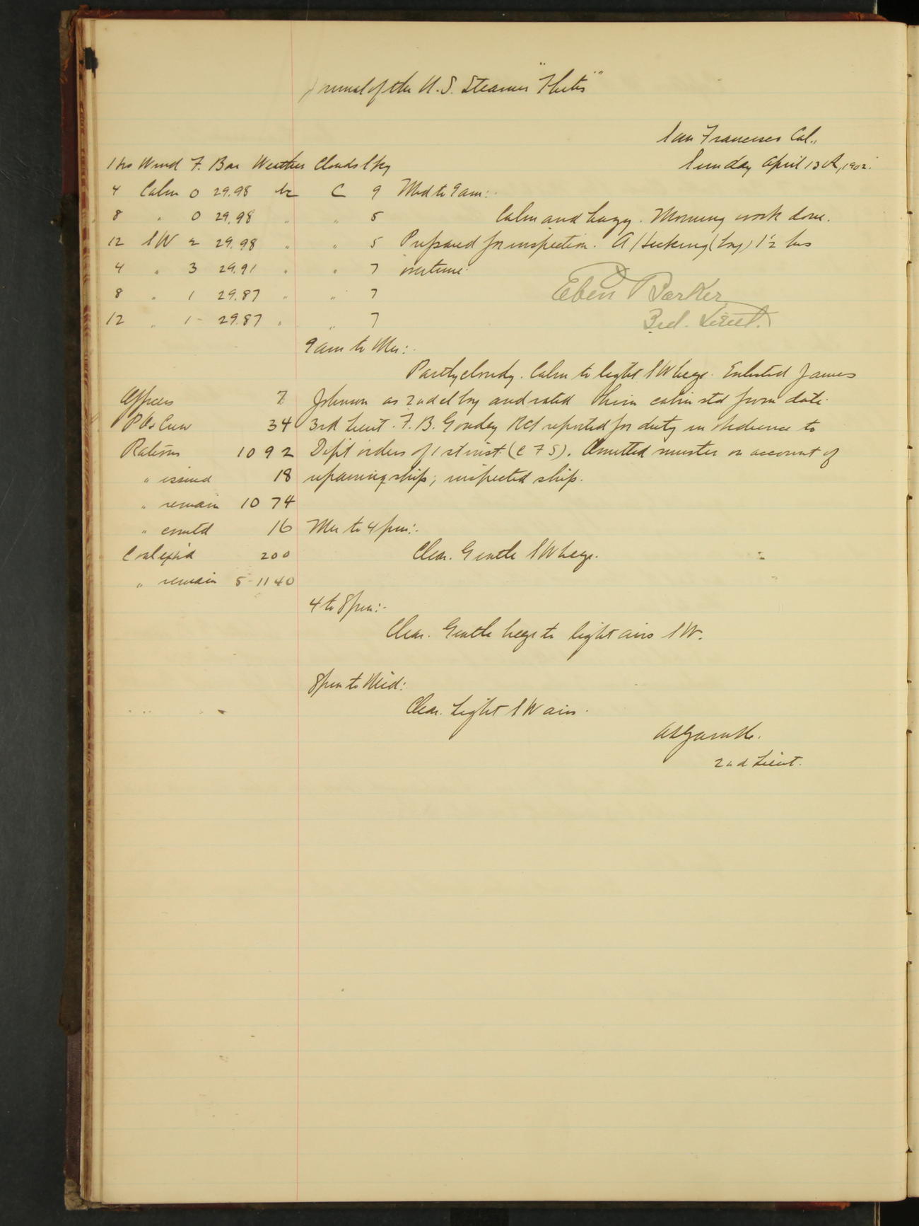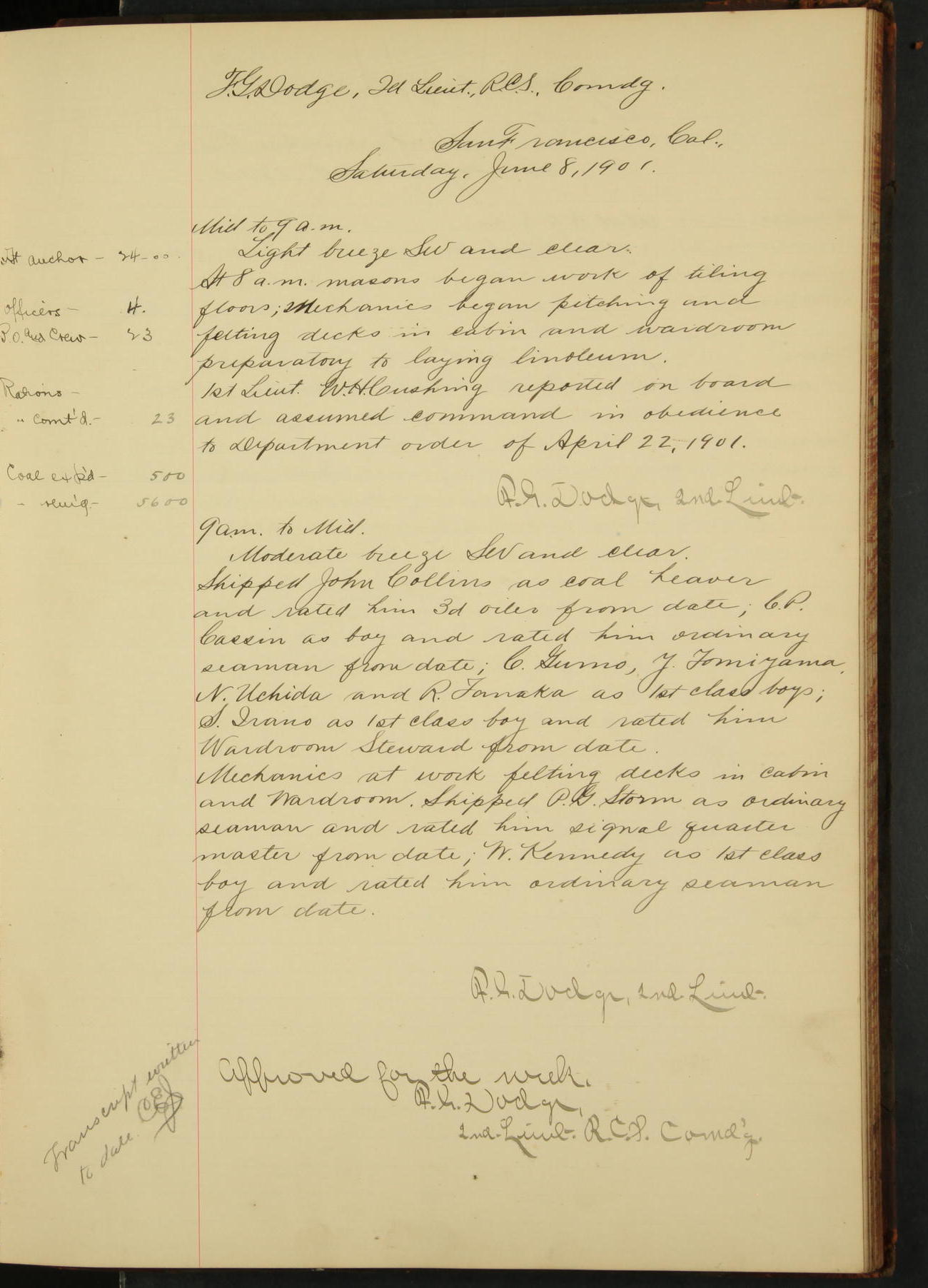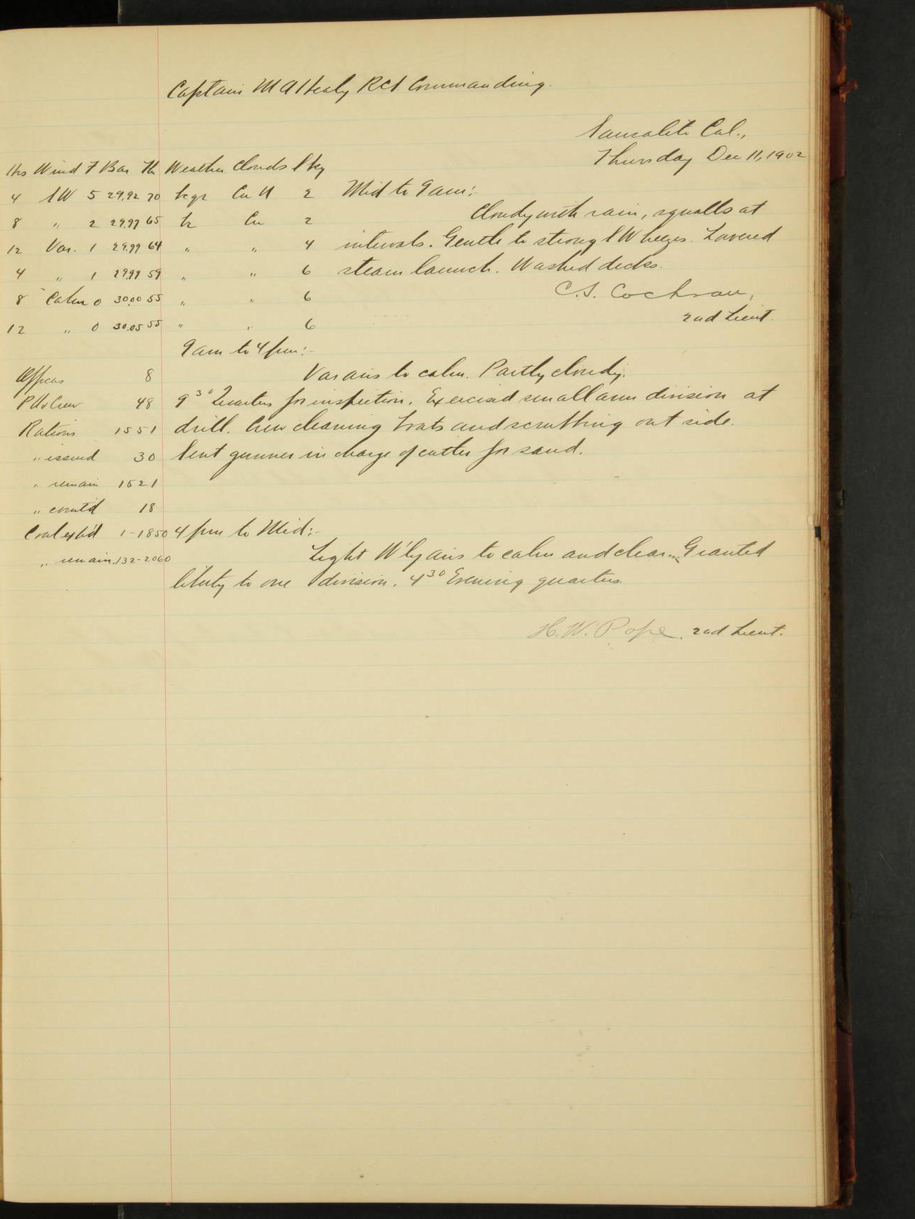 2nd Lieutenant C.S. Cochran, Revenue Cutter Service, left ship, ordered to USRC “McCulloch”, Department order of 18th instant.