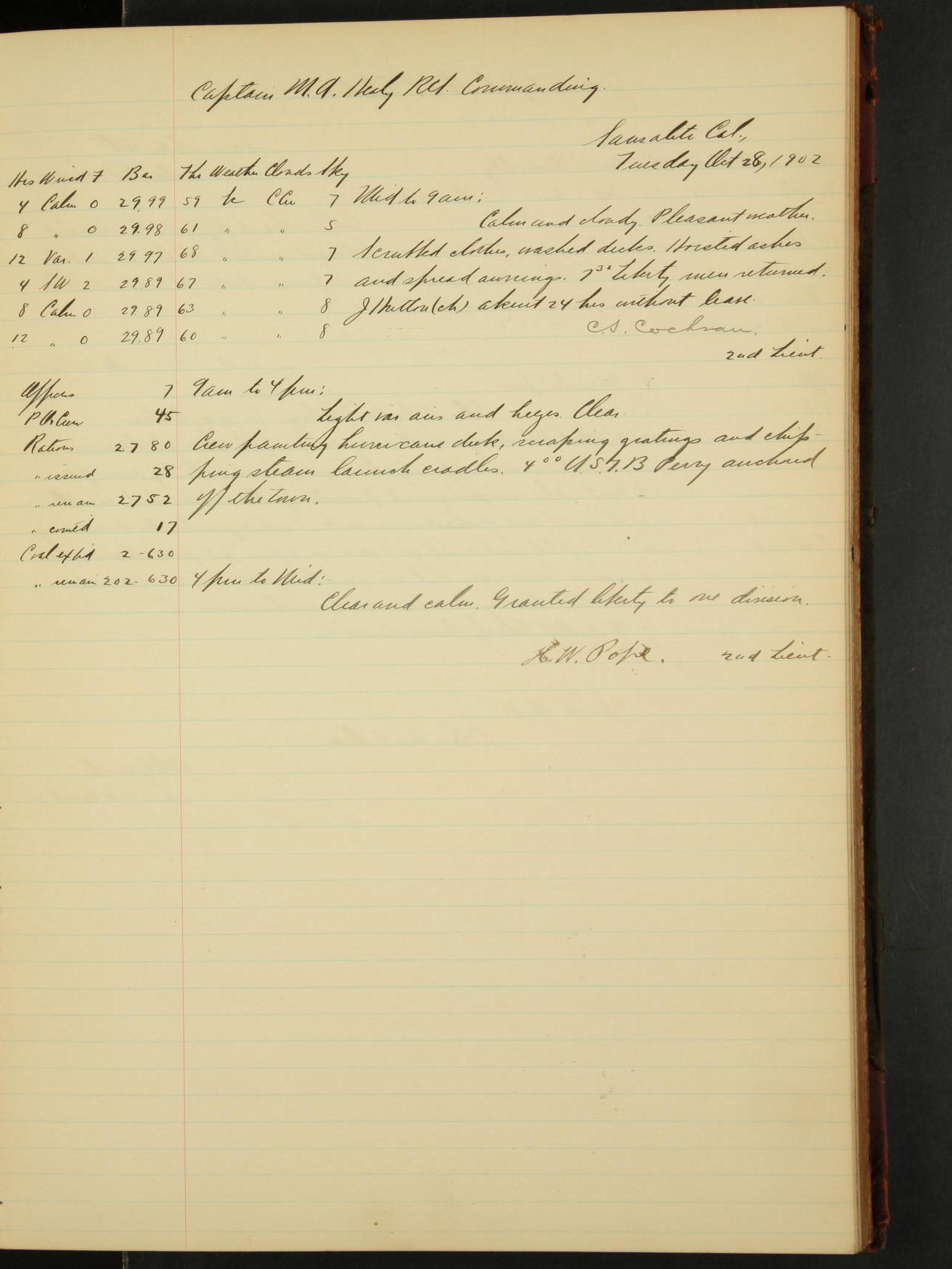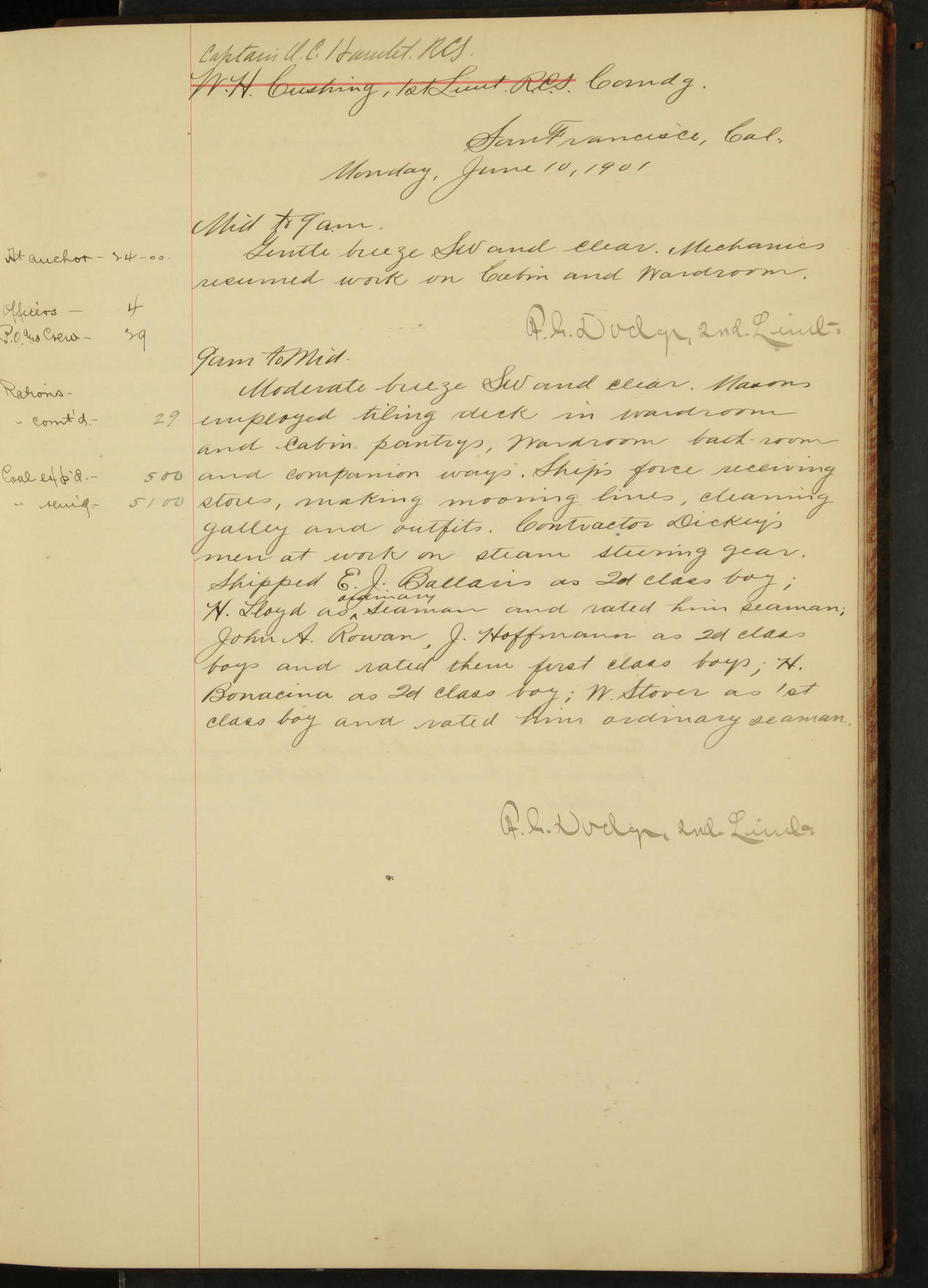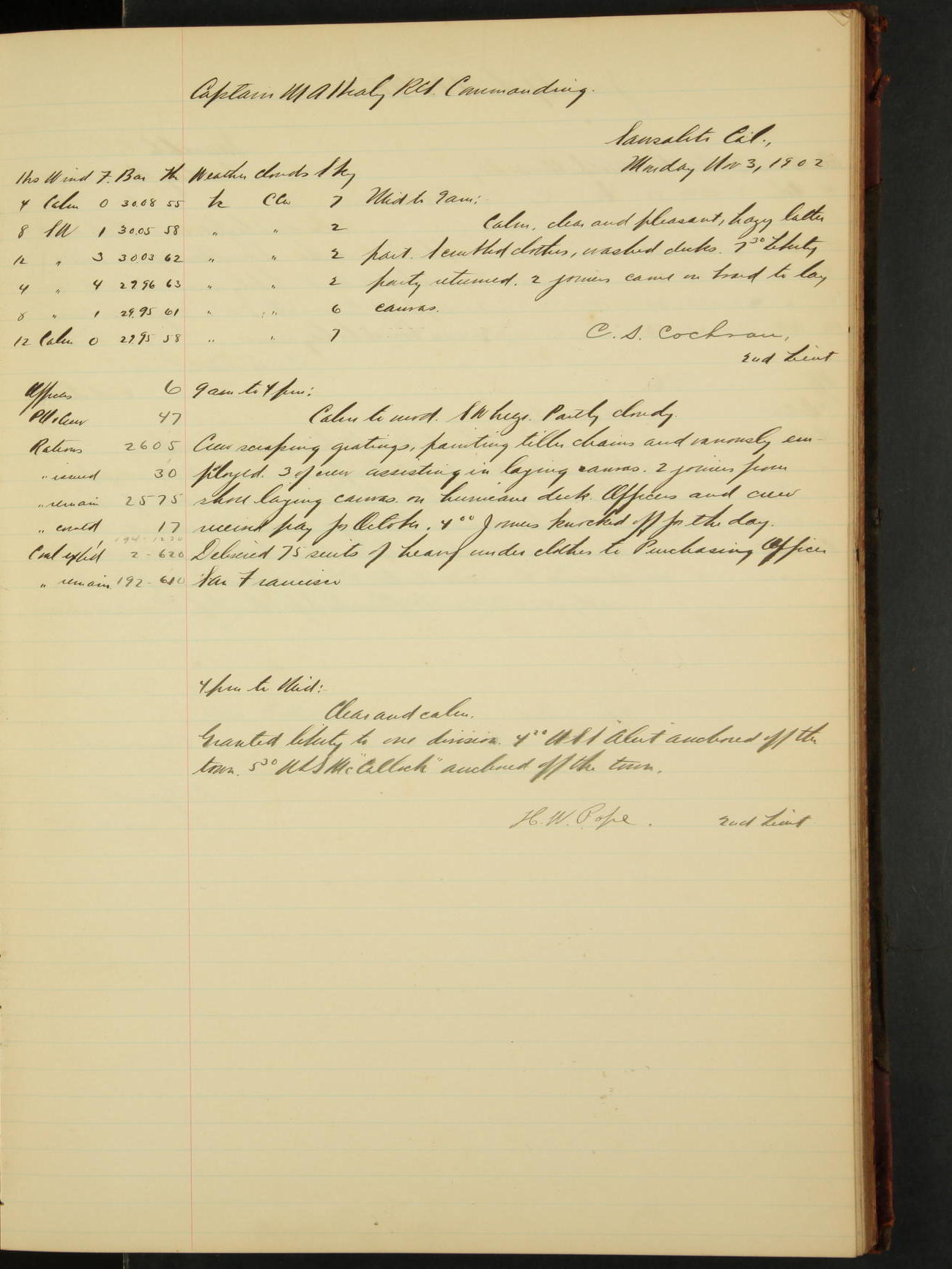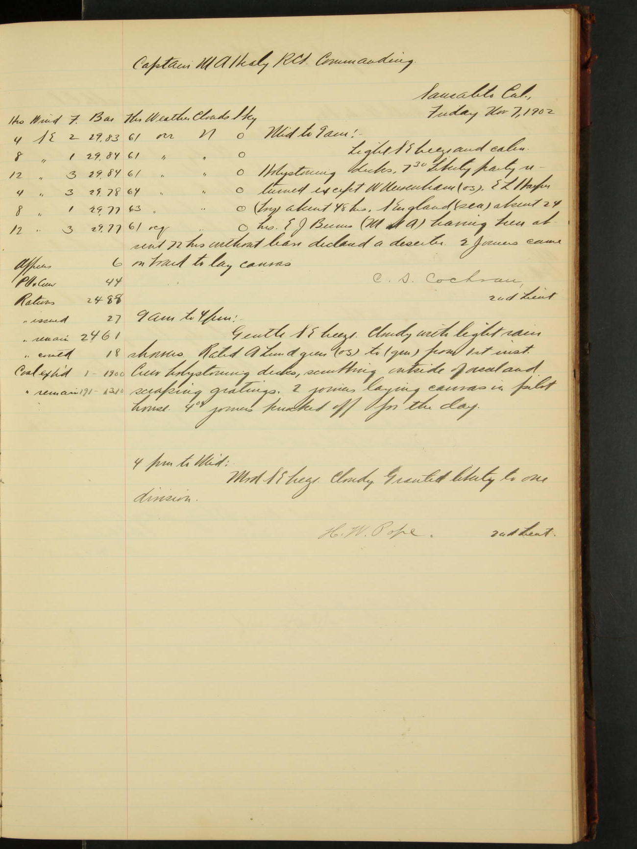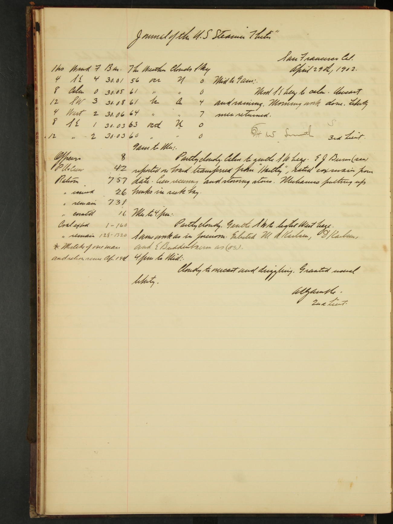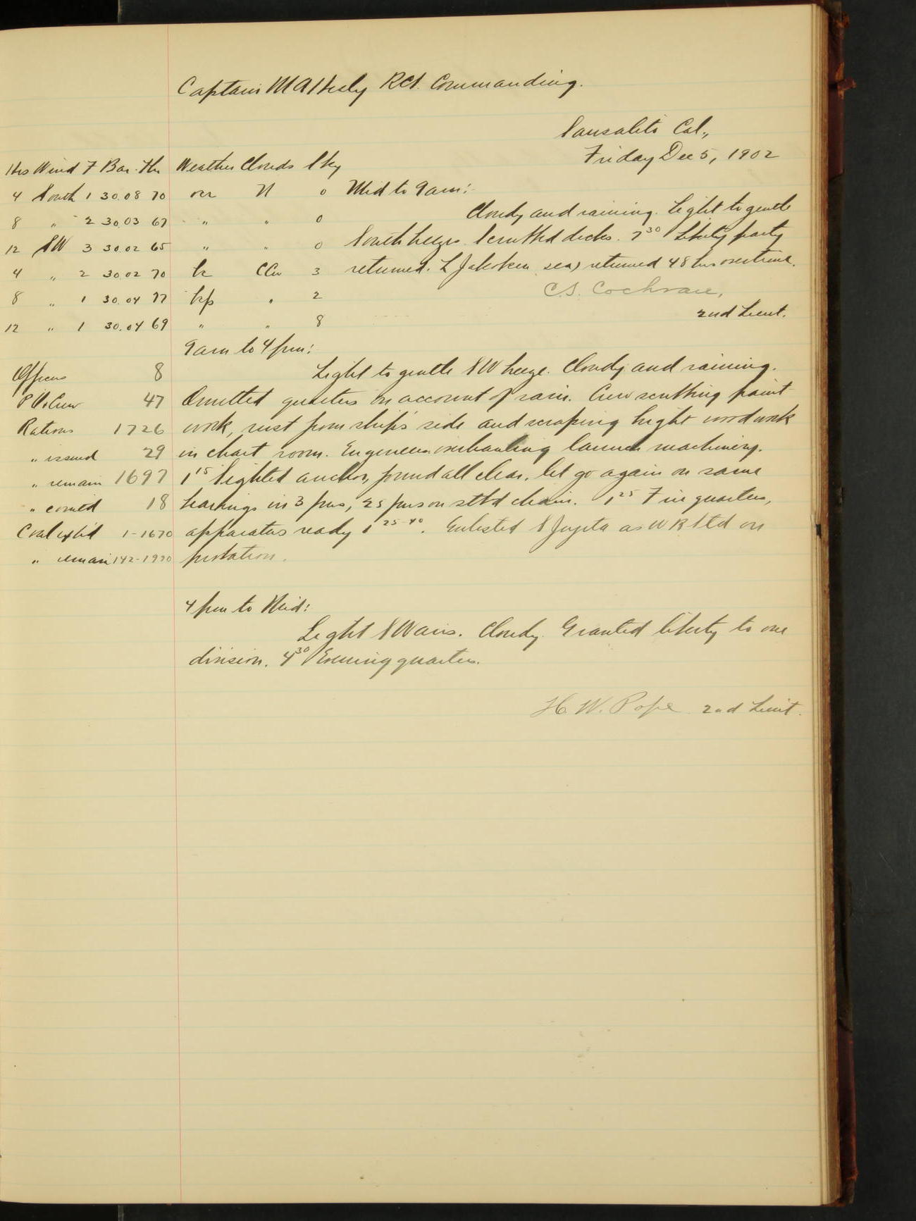 2nd Lieutenant C.S. Cochran, Revenue Cutter Service, left ship, ordered to USRC “McCulloch”, Department order of 18th instant.