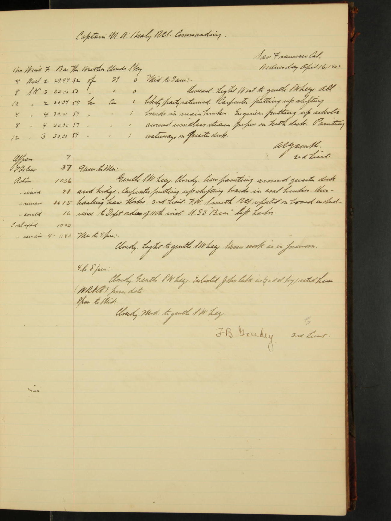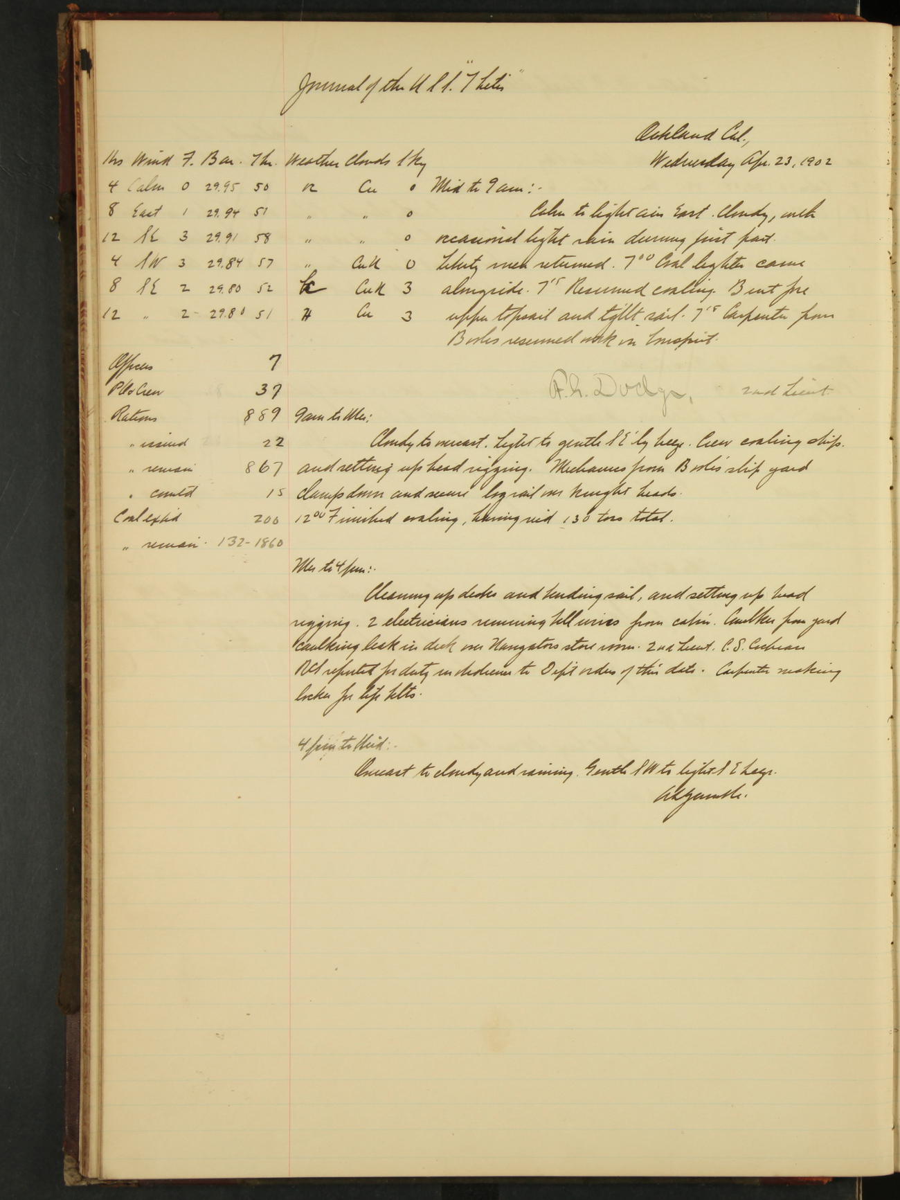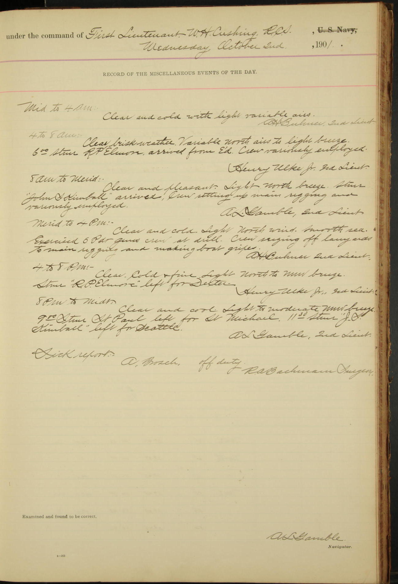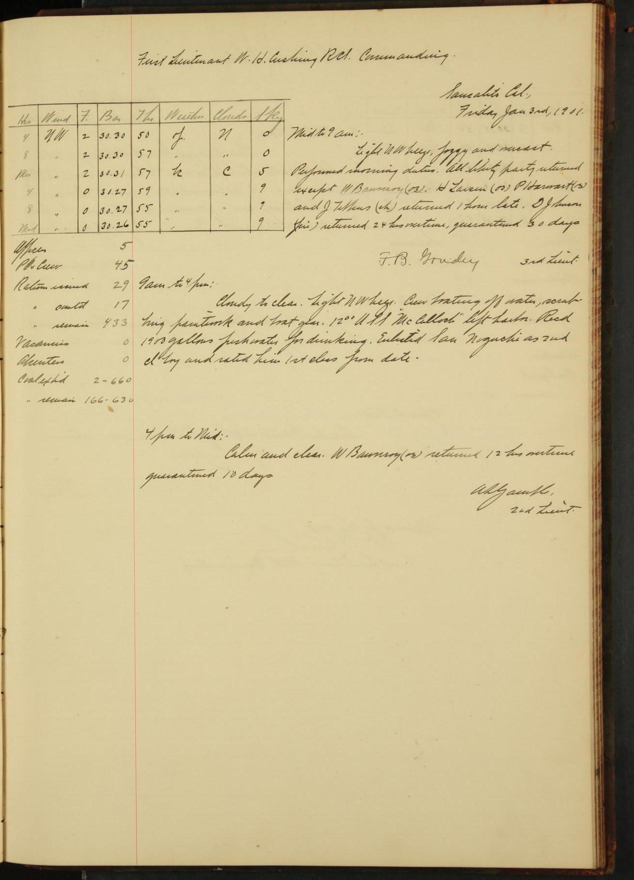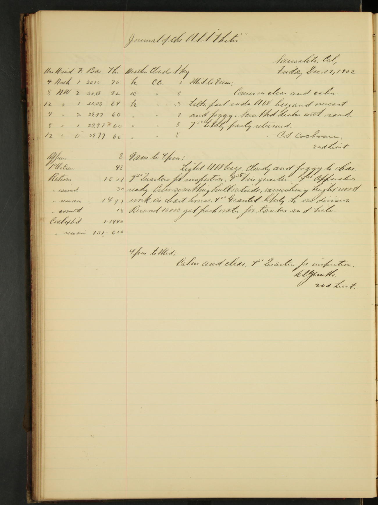 2nd Lieutenant C.S. Cochran, Revenue Cutter Service, left ship, ordered to USRC “McCulloch”, Department order of 18th instant.