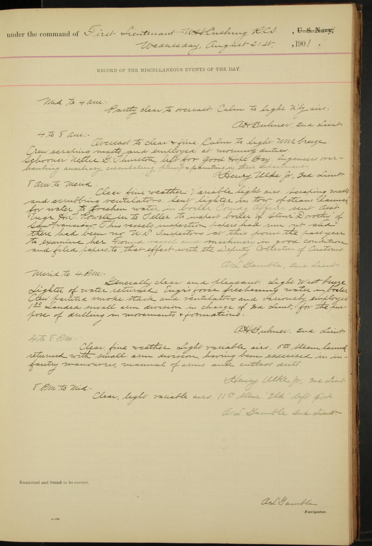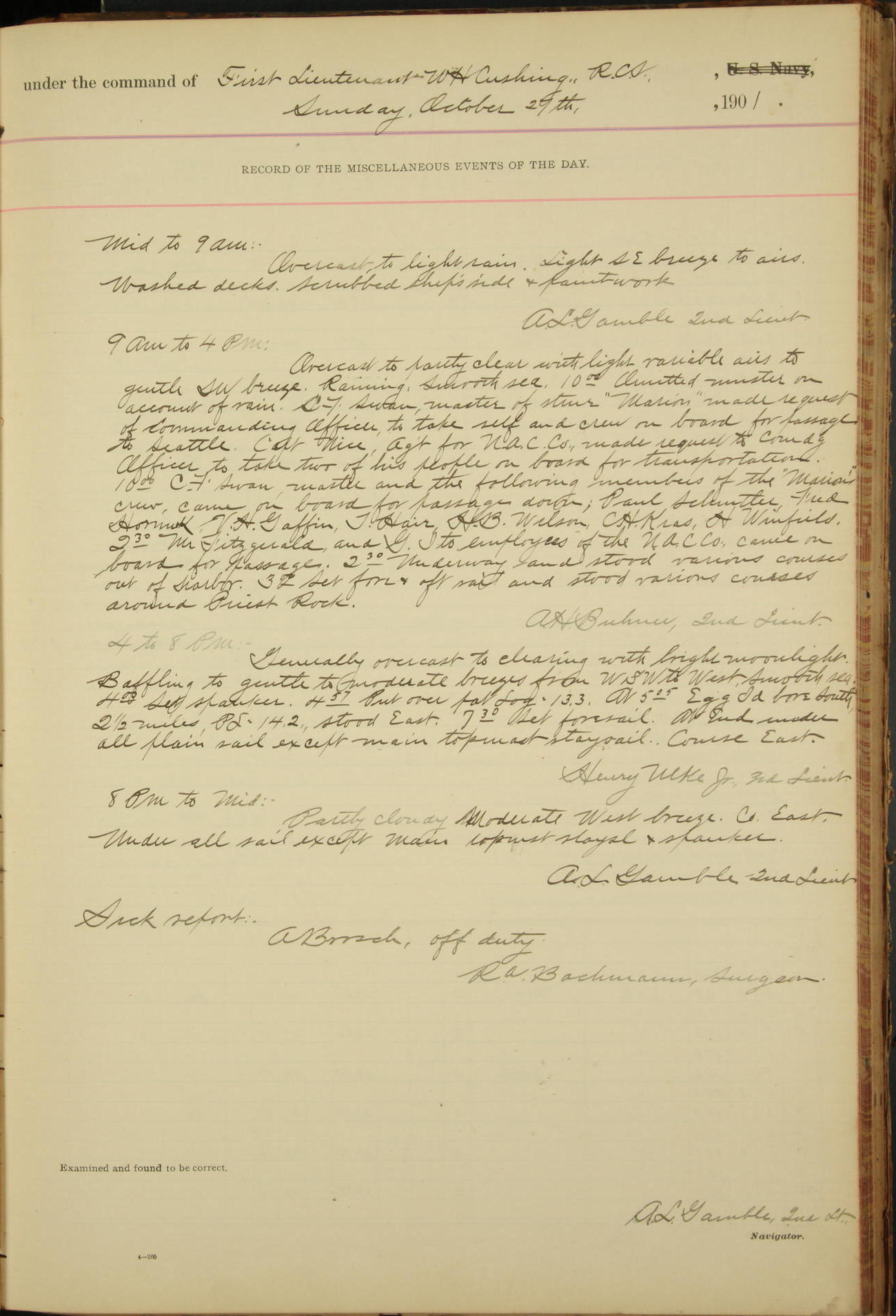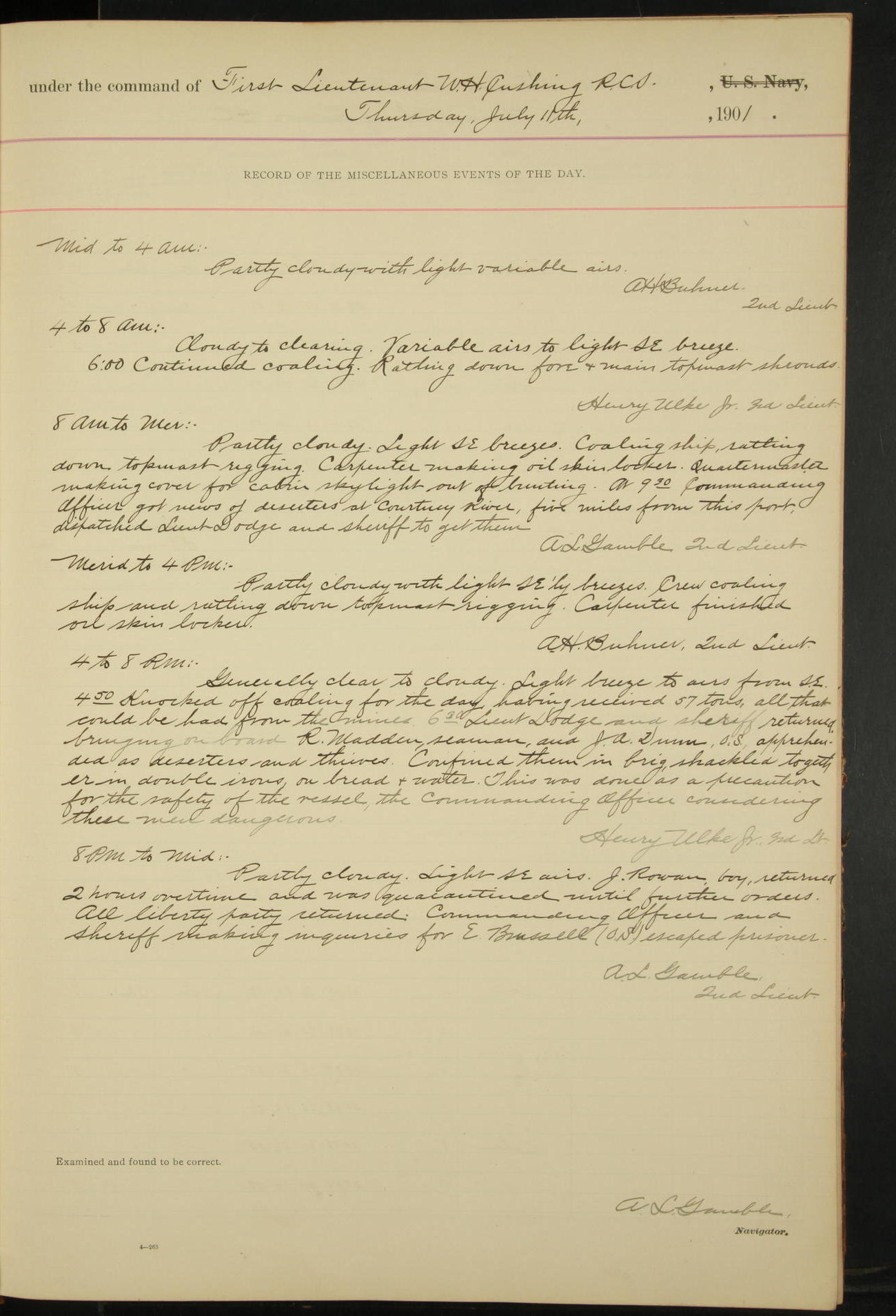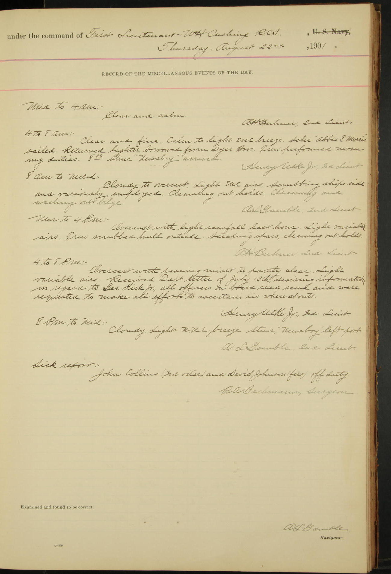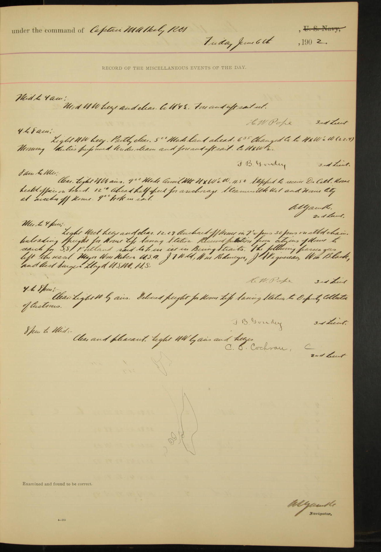 2nd Lieutenant C.S. Cochran, Revenue Cutter Service, left ship, ordered to USRC “McCulloch”, Department order of 18th instant.
