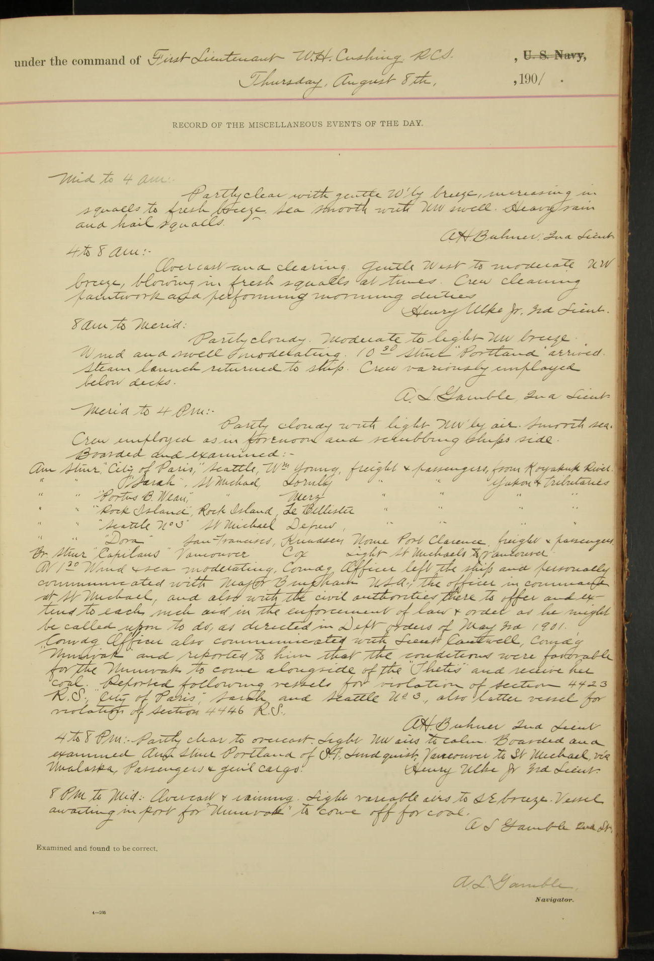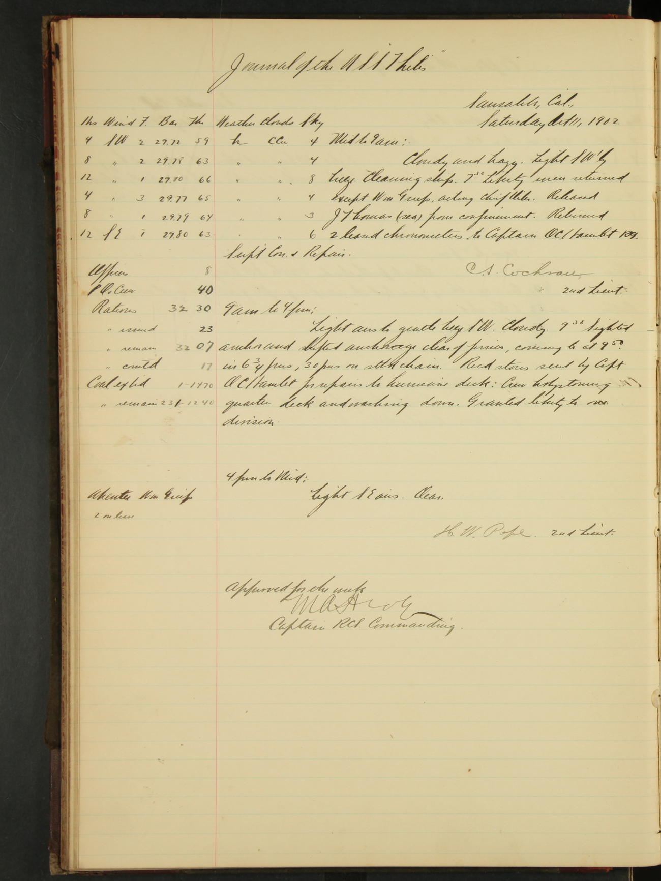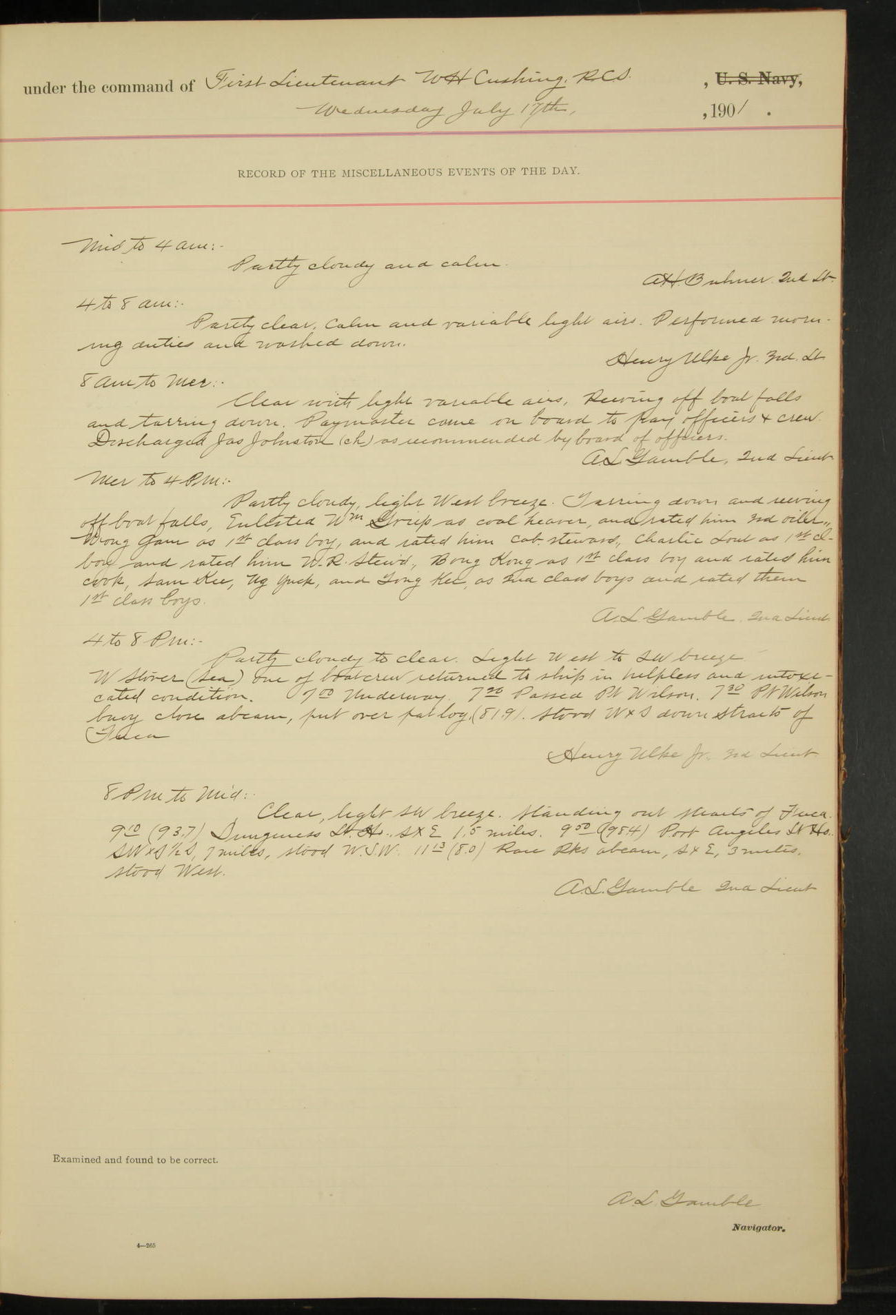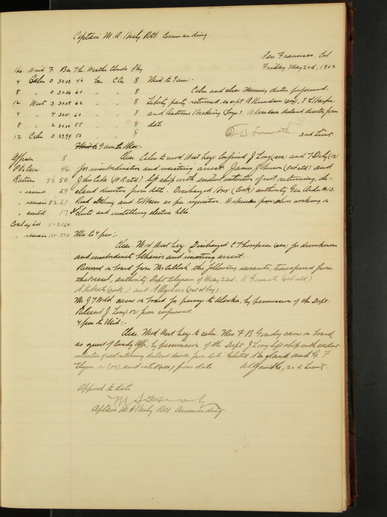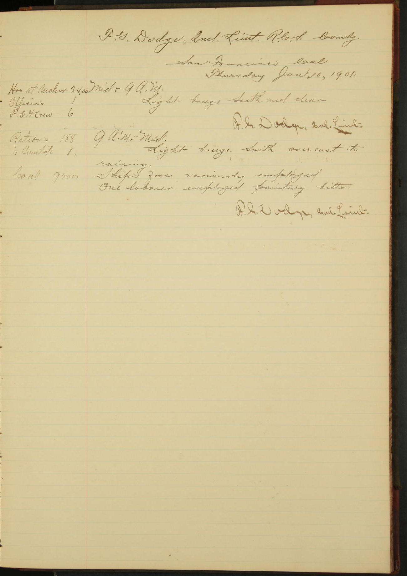 2nd Lieutenant C.S. Cochran, Revenue Cutter Service, left ship, ordered to USRC “McCulloch”, Department order of 18th instant.