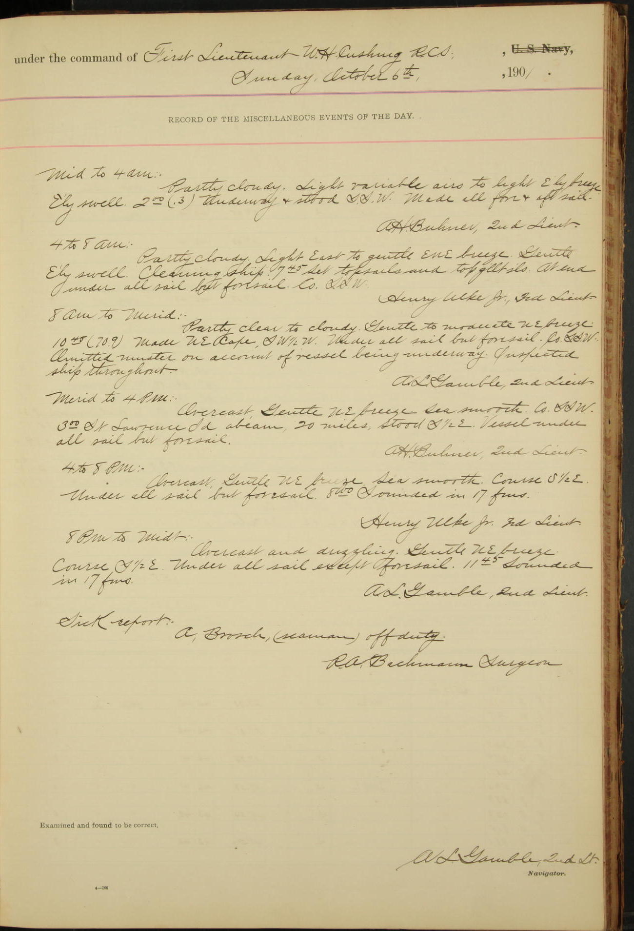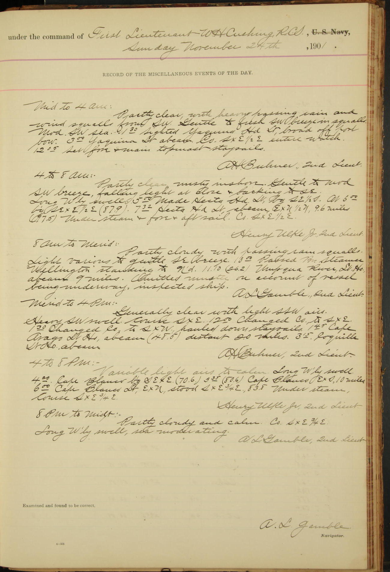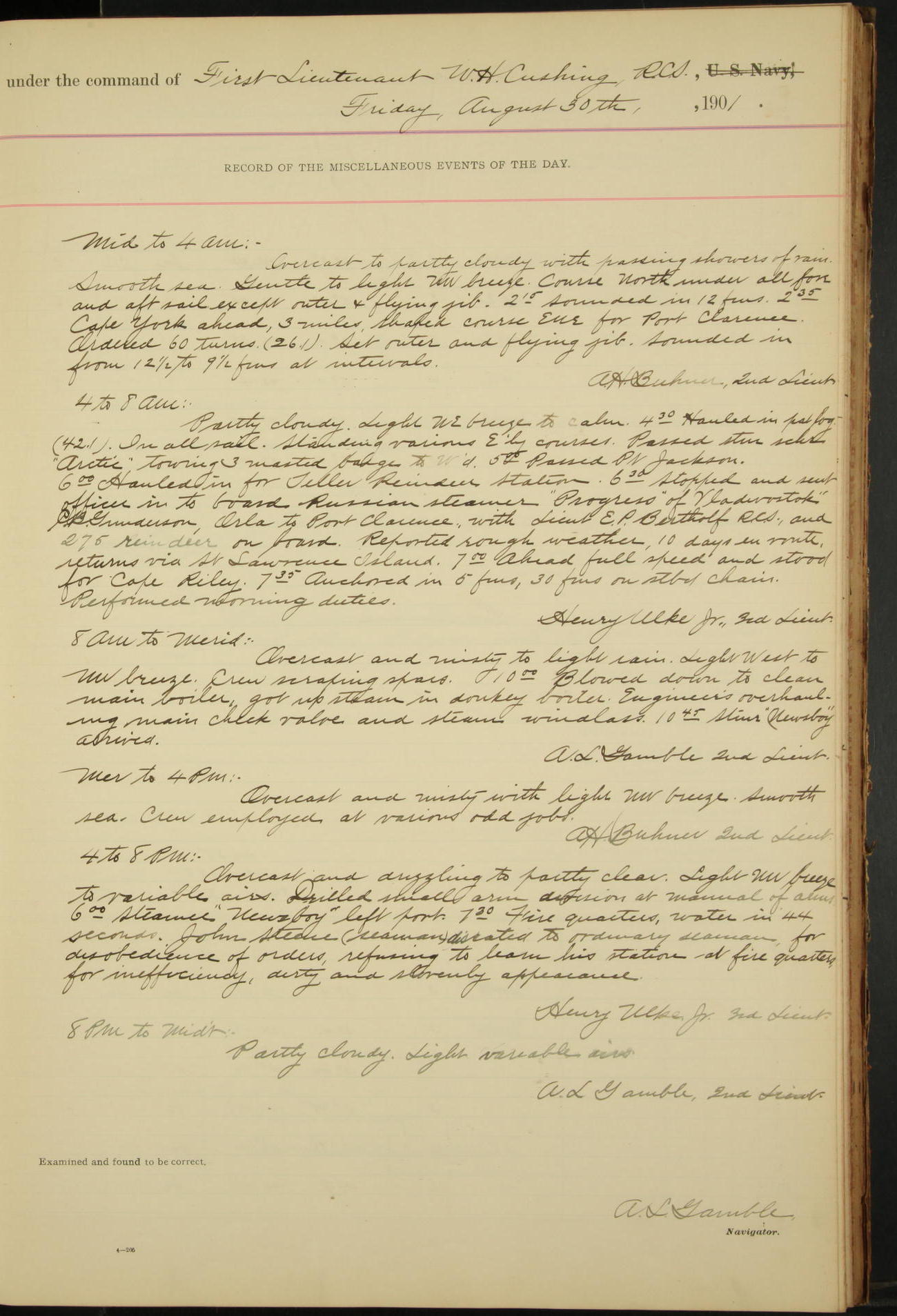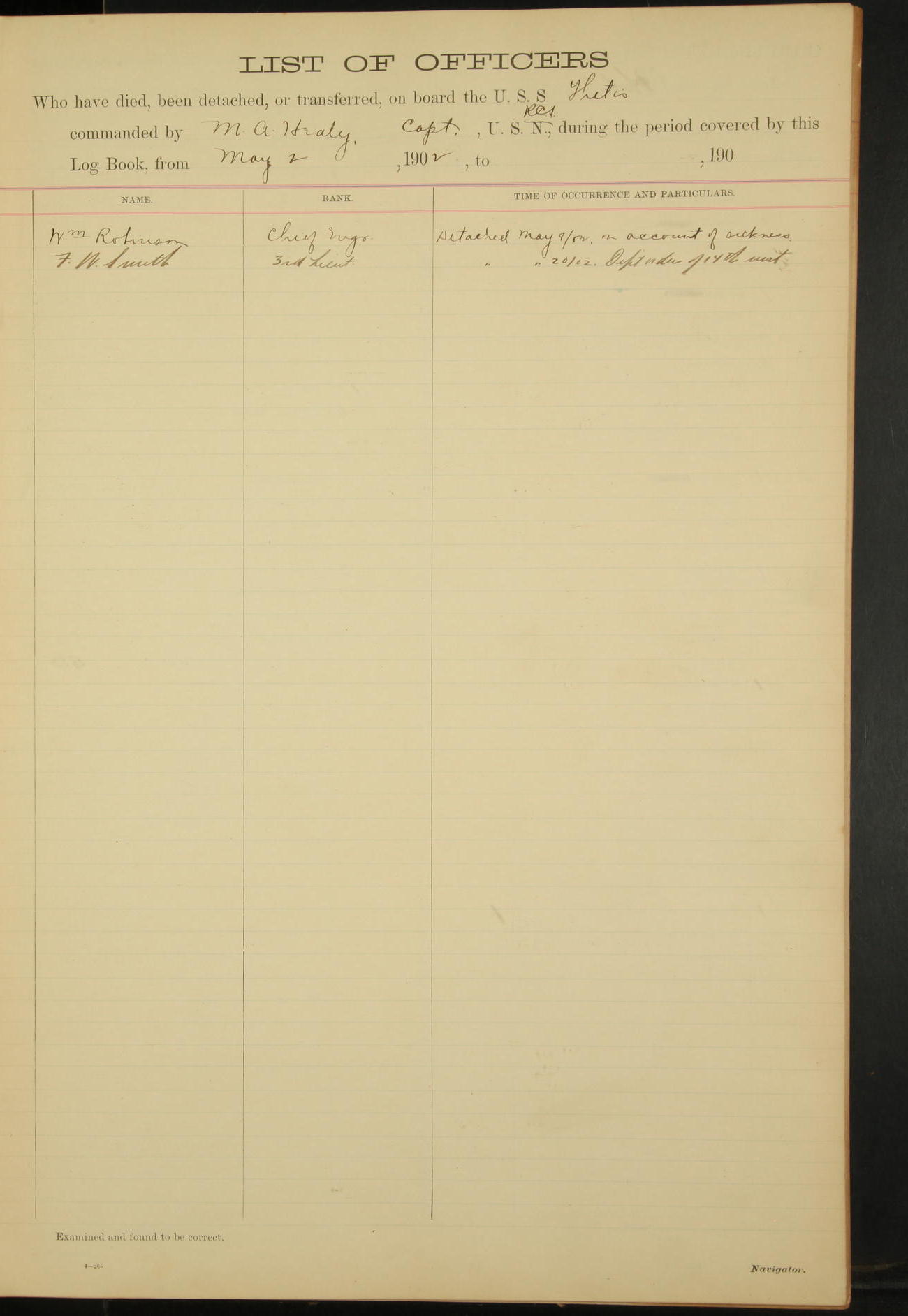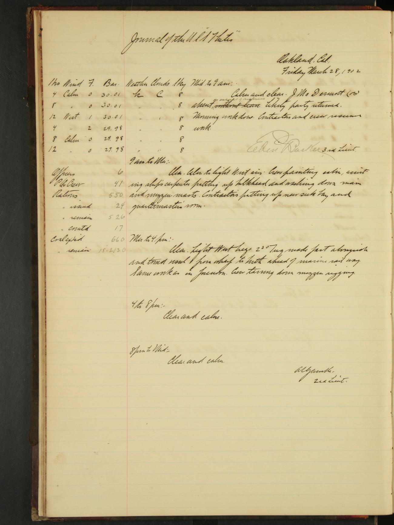 2nd Lieutenant C.S. Cochran, Revenue Cutter Service, left ship, ordered to USRC “McCulloch”, Department order of 18th instant.