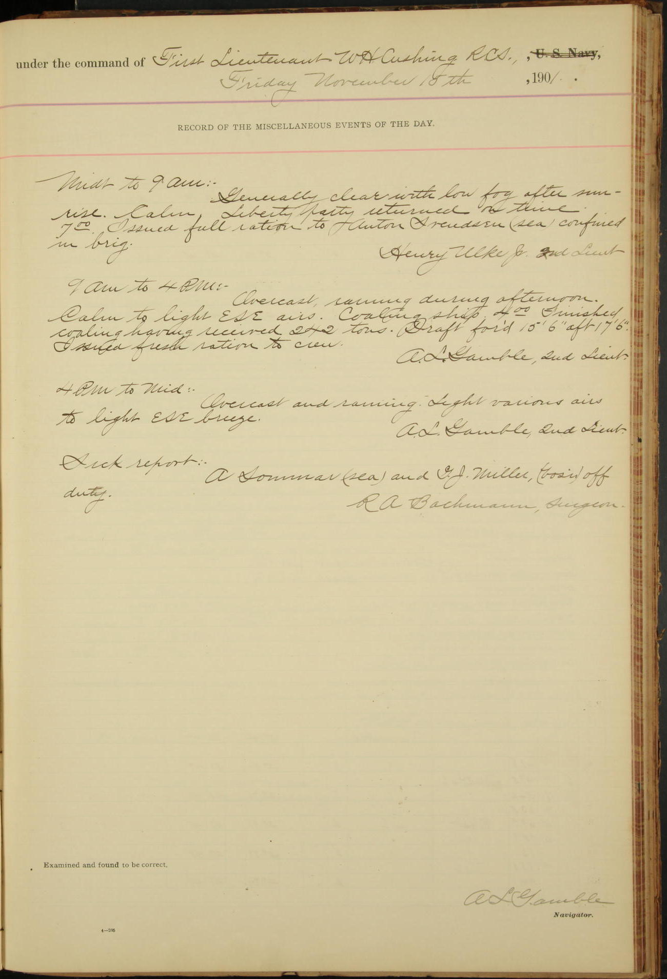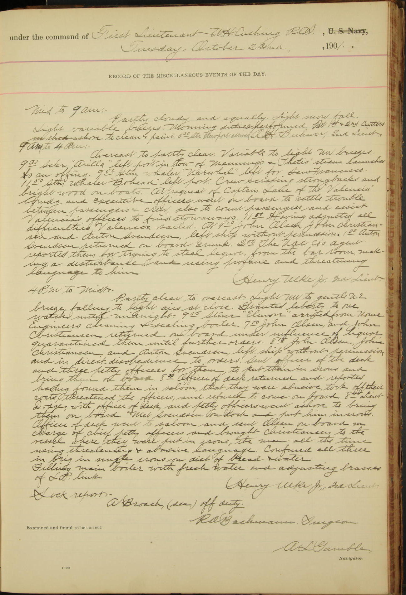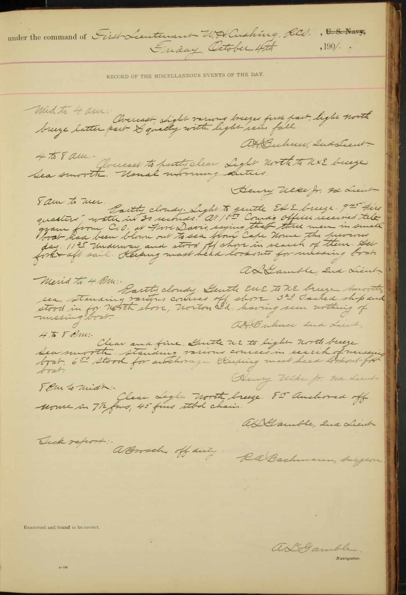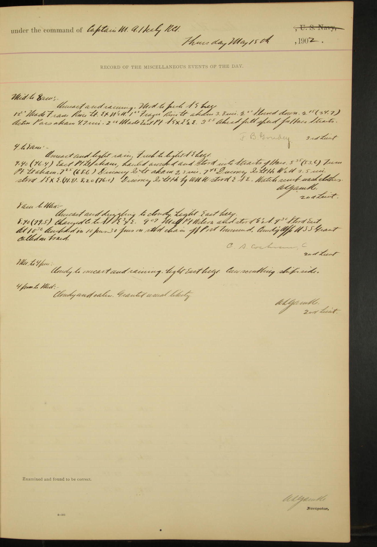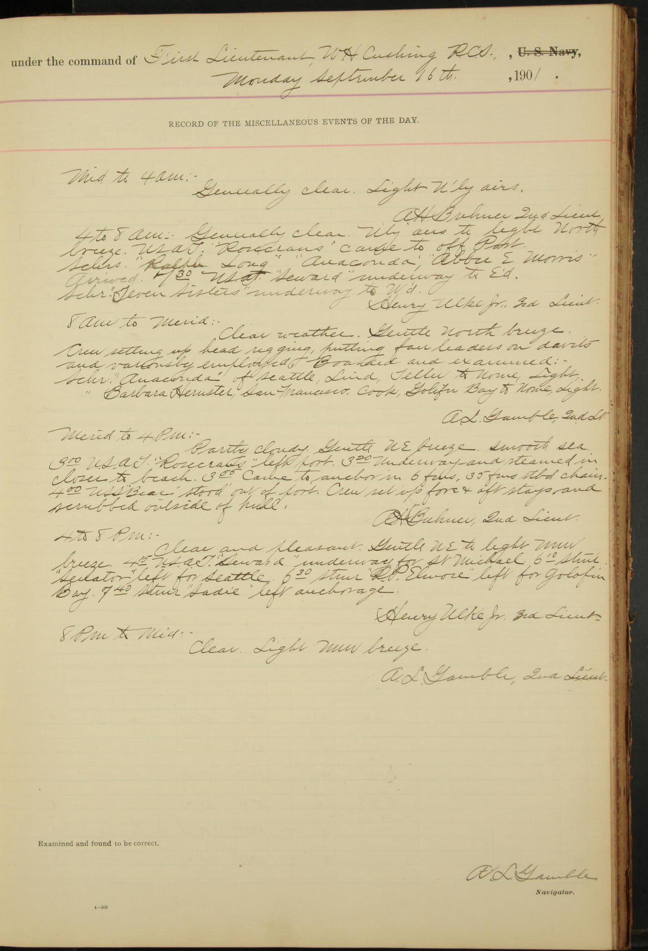 2nd Lieutenant C.S. Cochran, Revenue Cutter Service, left ship, ordered to USRC “McCulloch”, Department order of 18th instant.