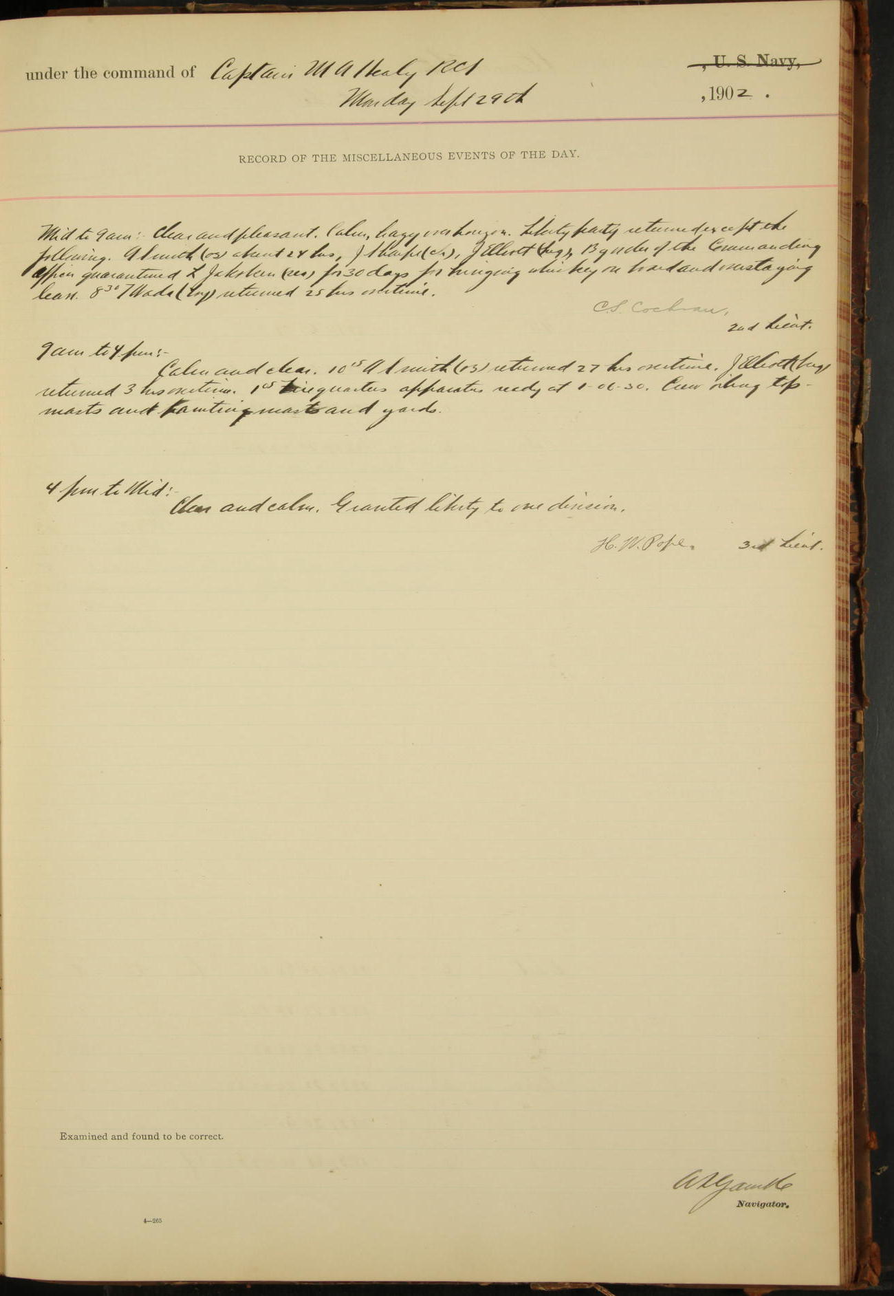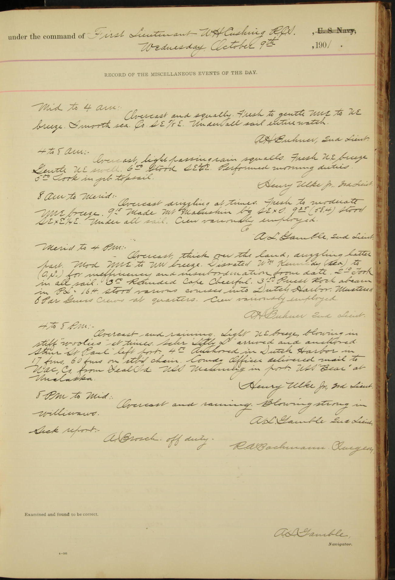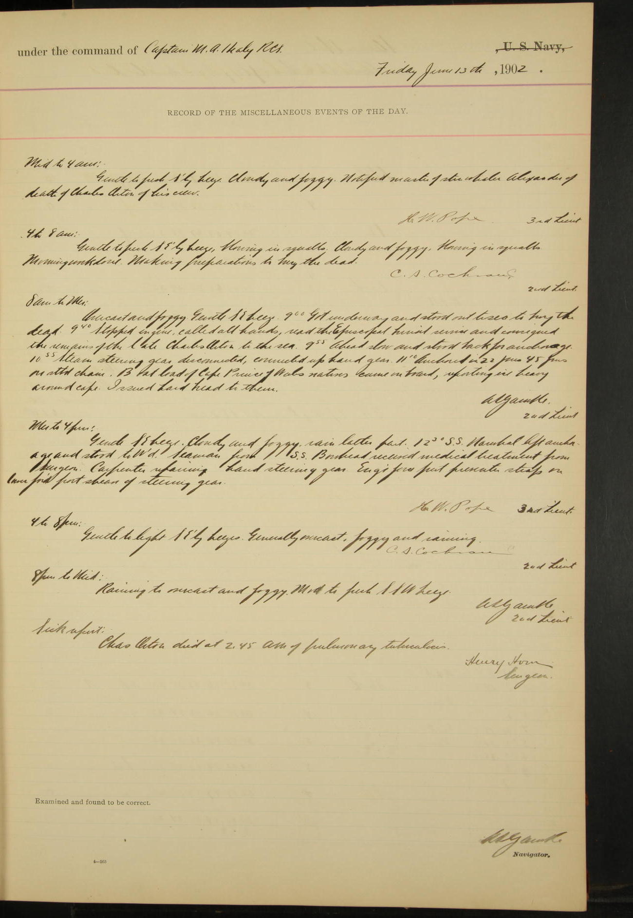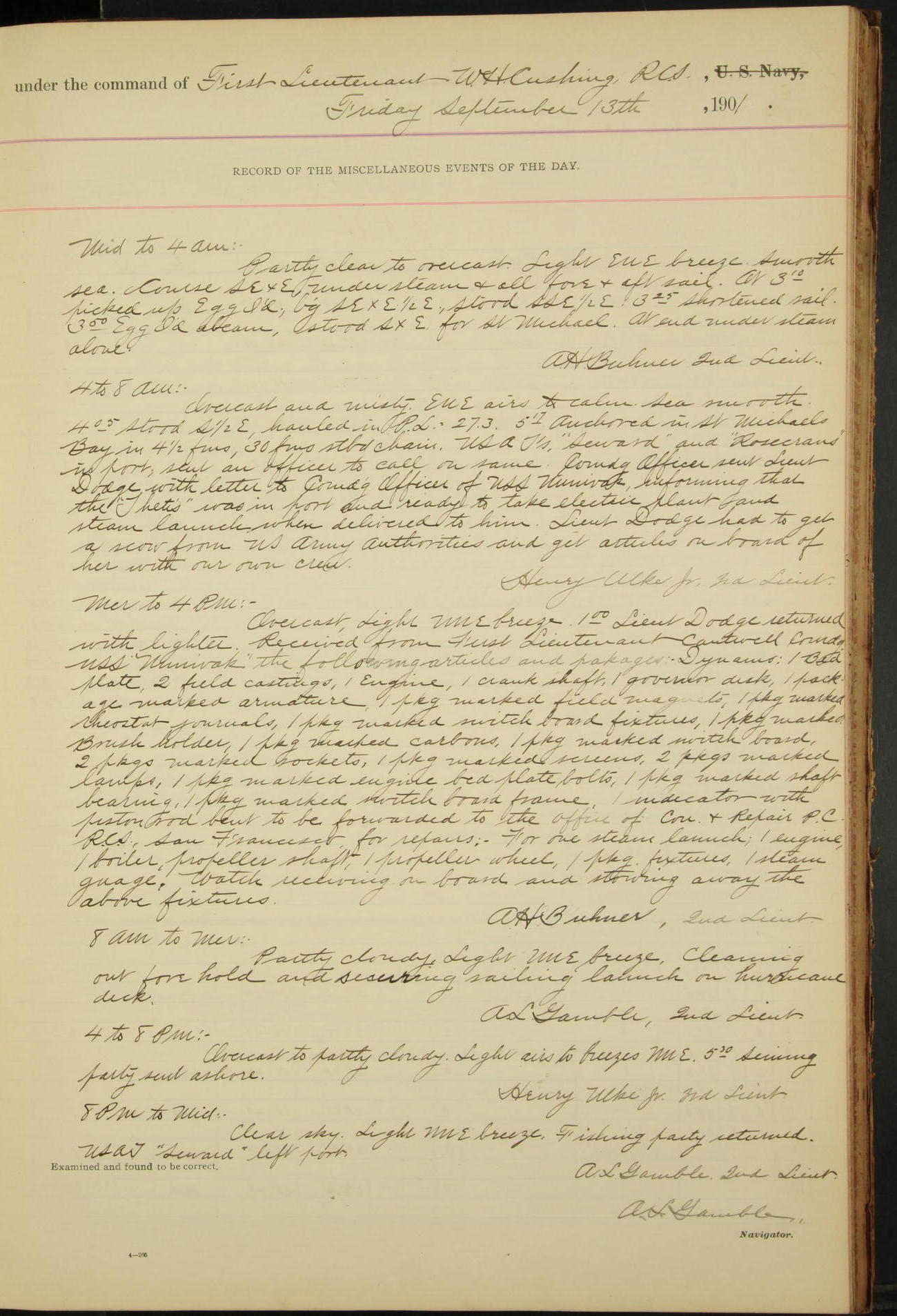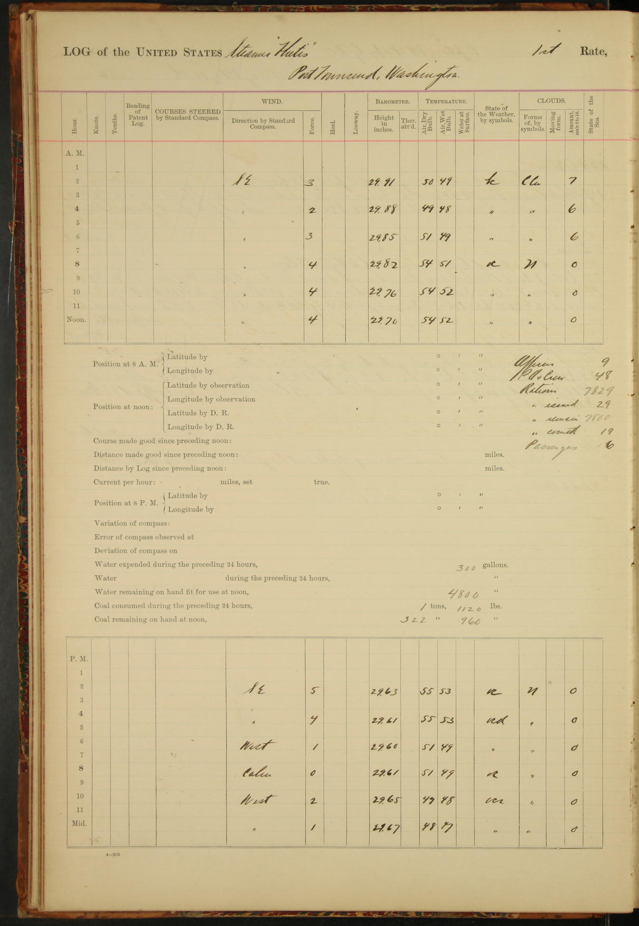 2nd Lieutenant C.S. Cochran, Revenue Cutter Service, left ship, ordered to USRC “McCulloch”, Department order of 18th instant.
