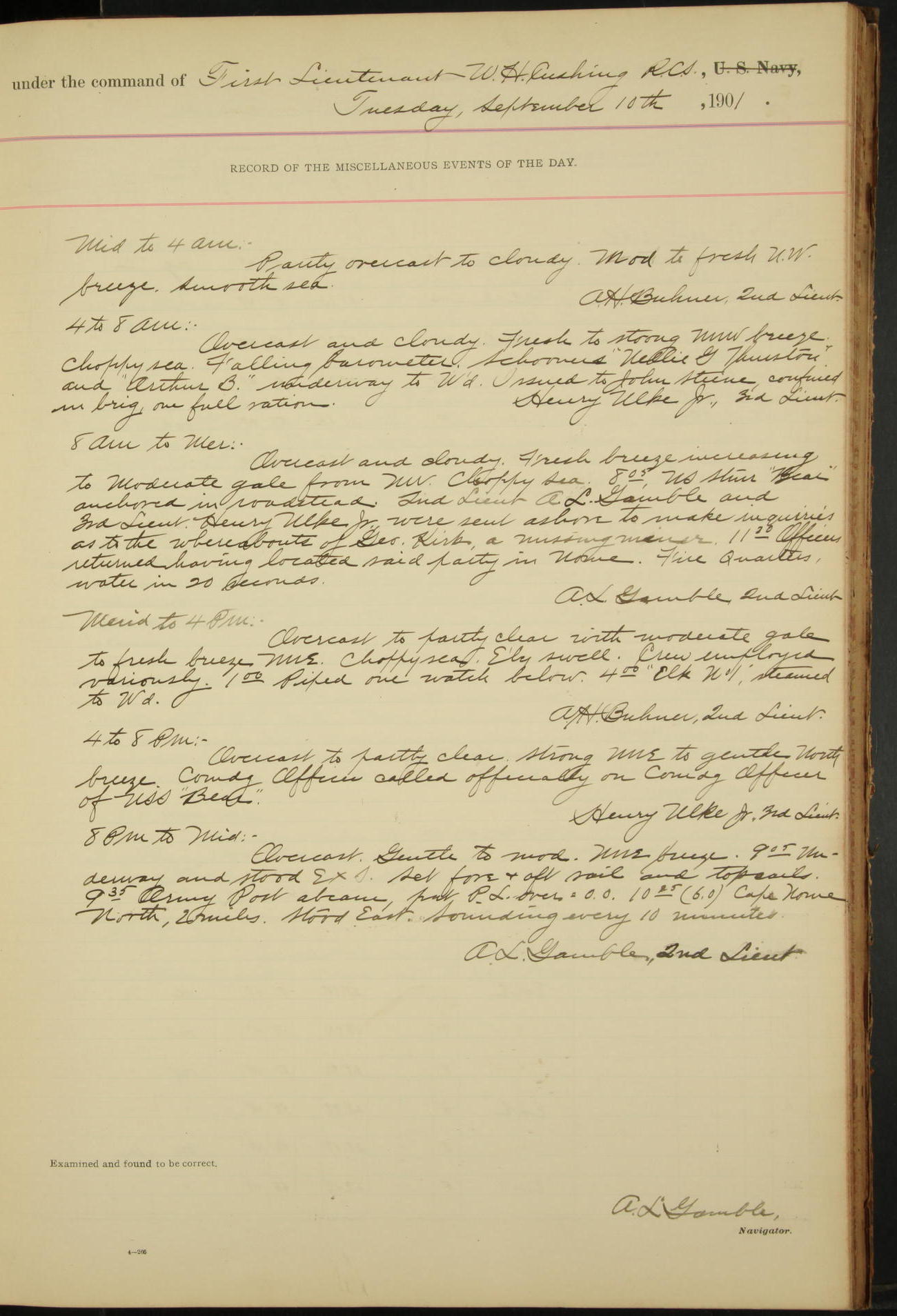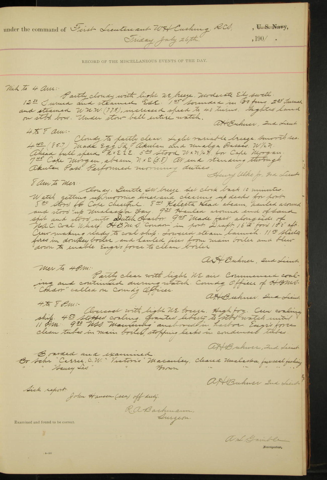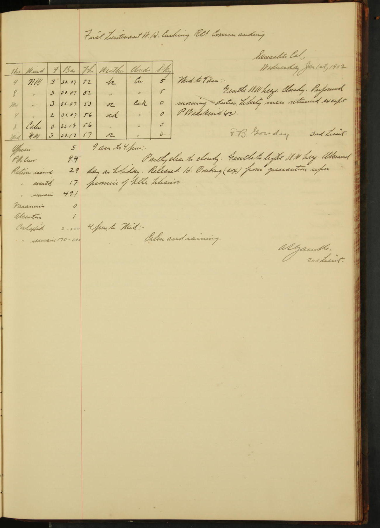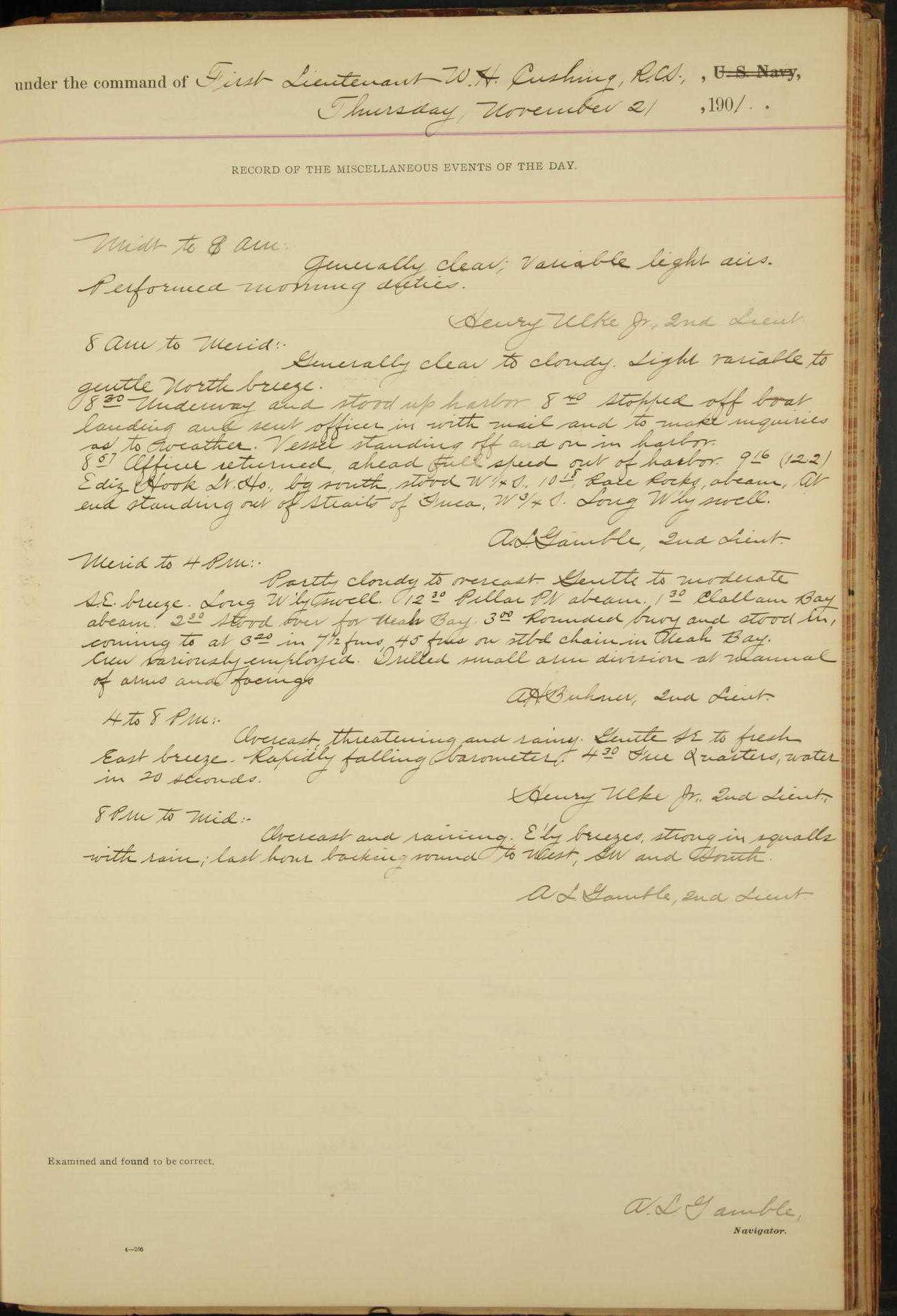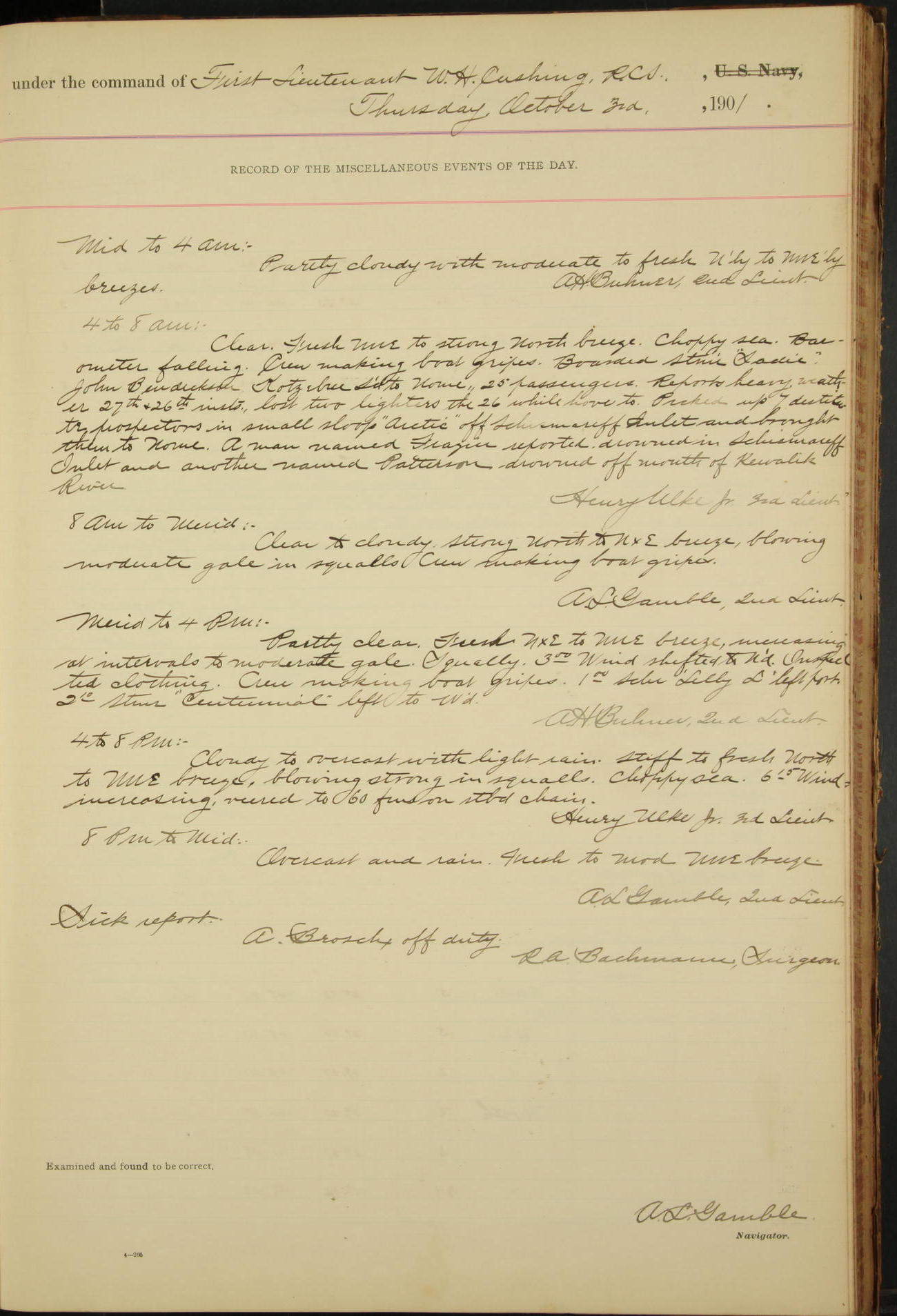 2nd Lieutenant C.S. Cochran, Revenue Cutter Service, left ship, ordered to USRC “McCulloch”, Department order of 18th instant.