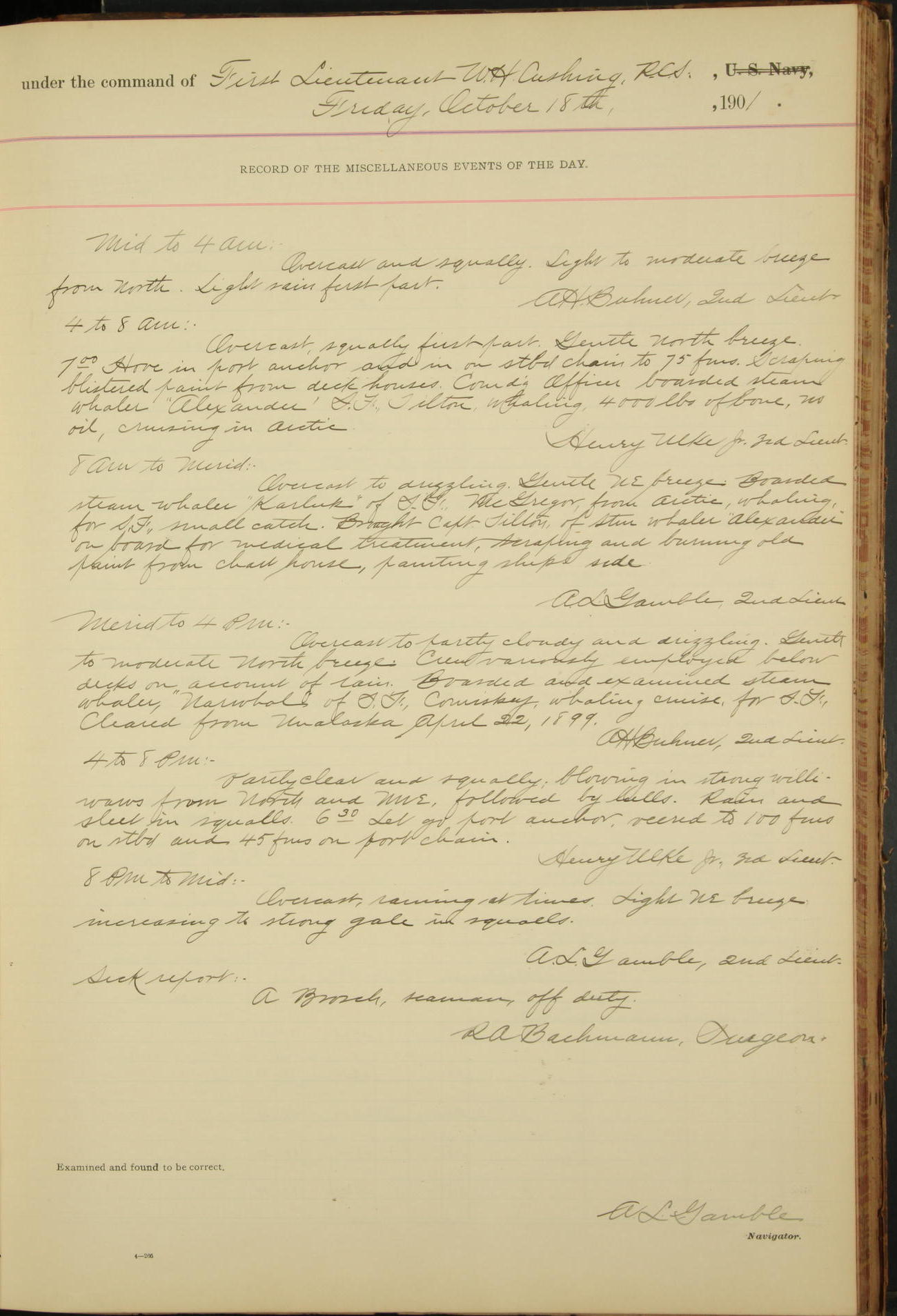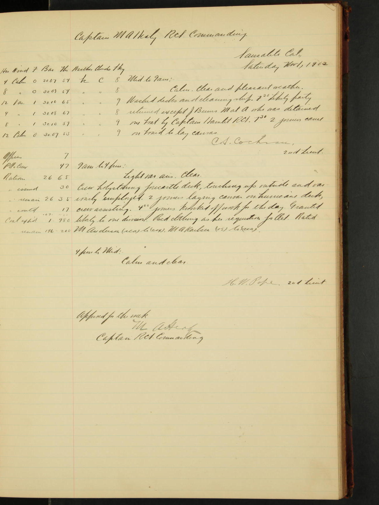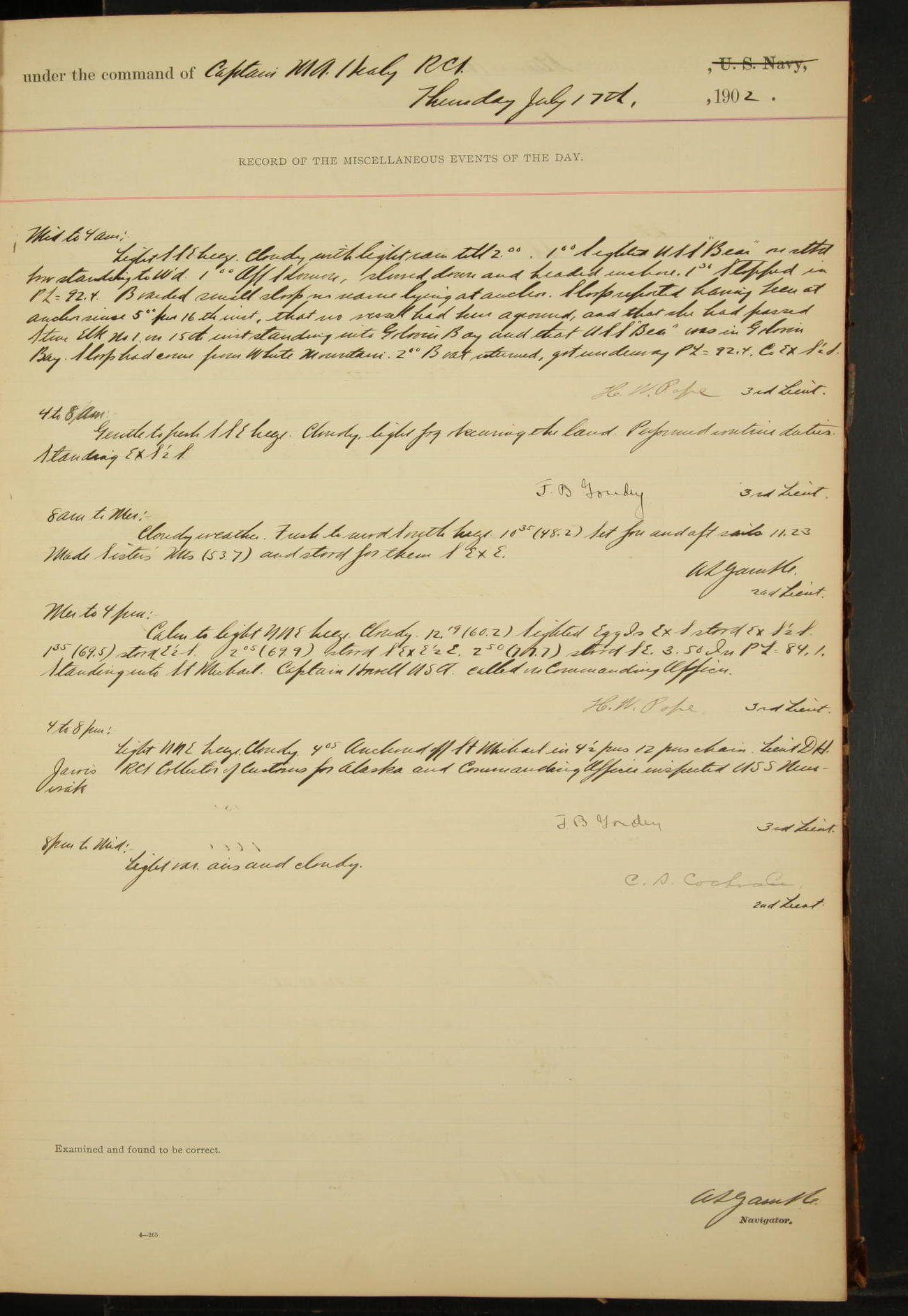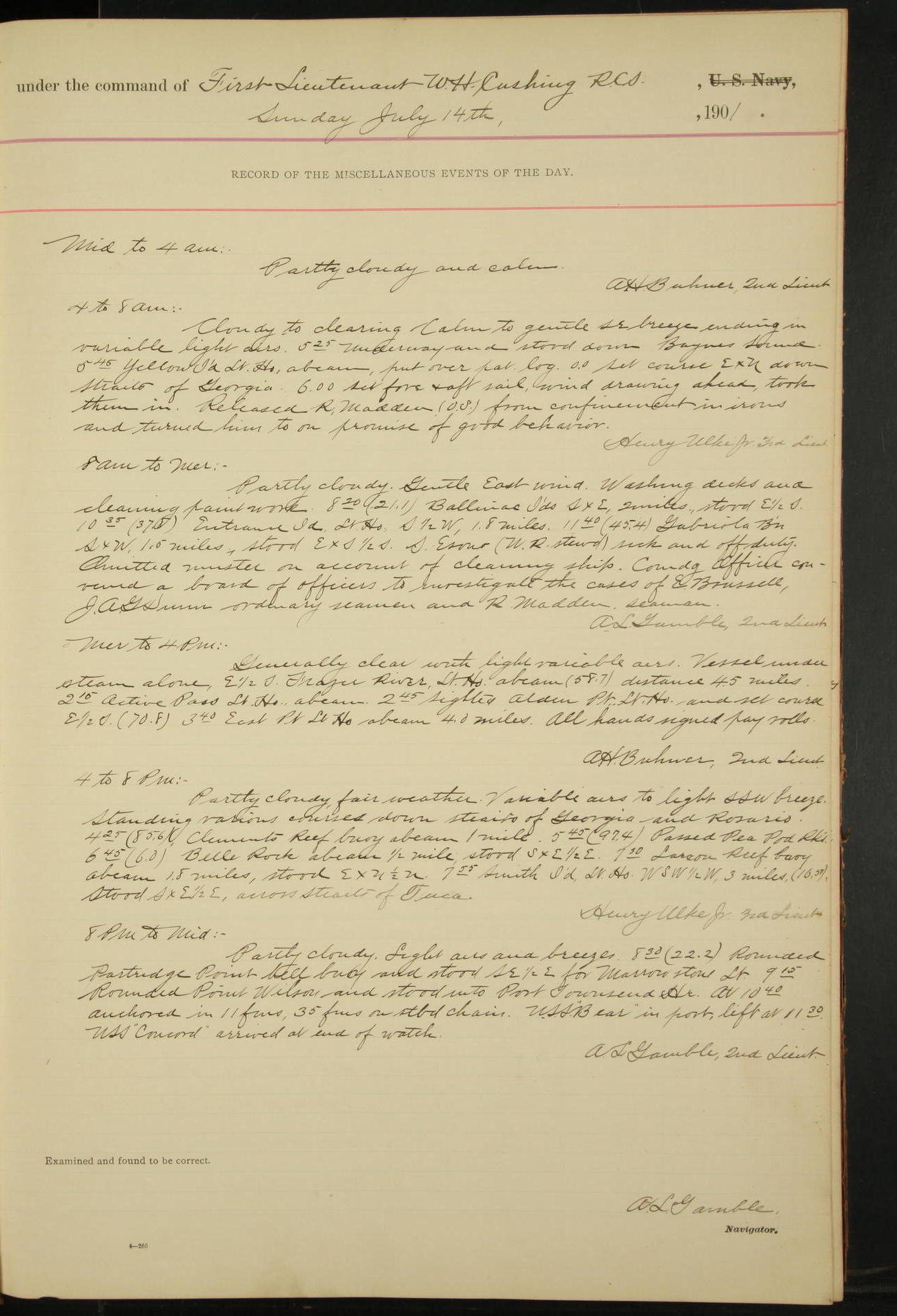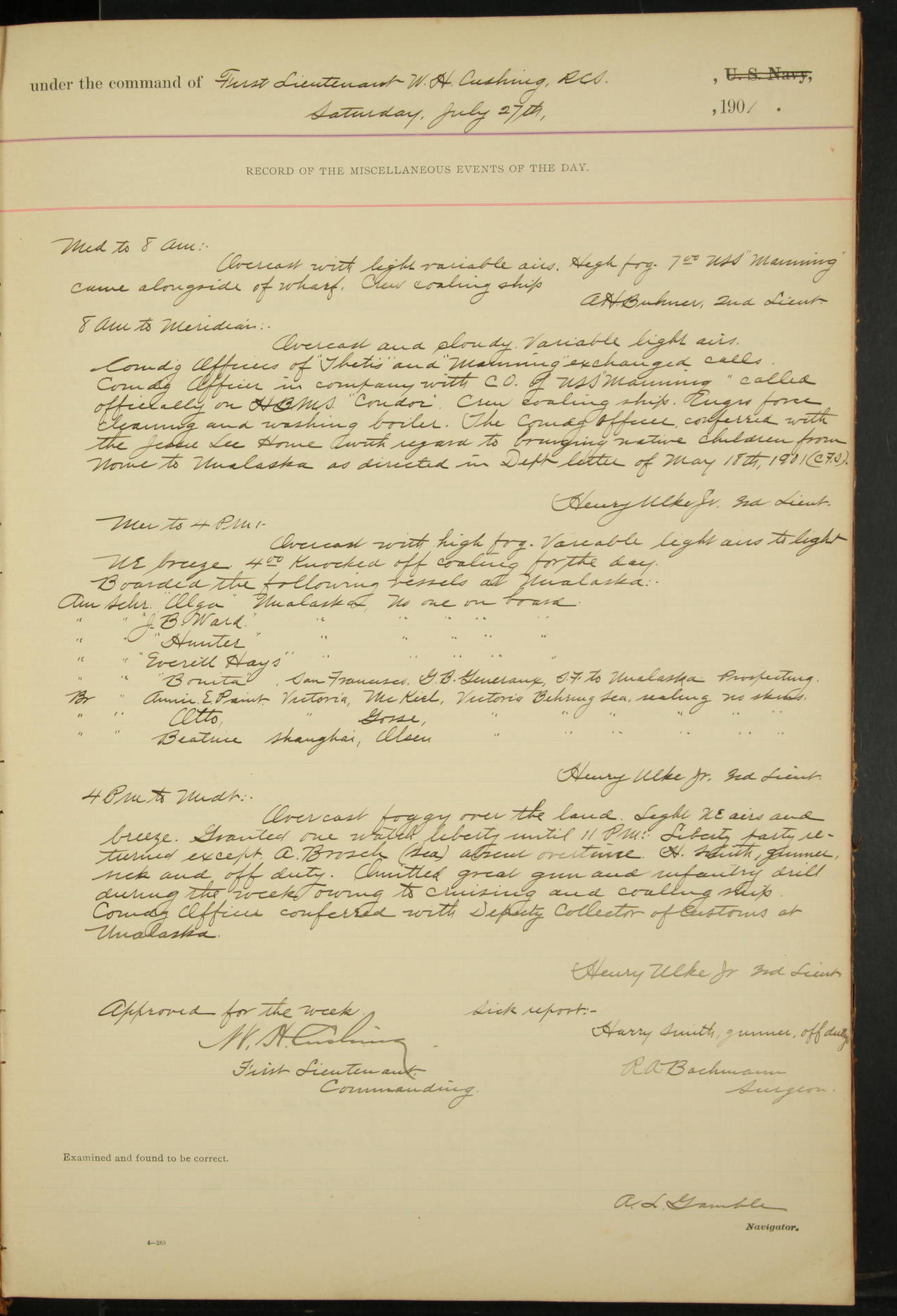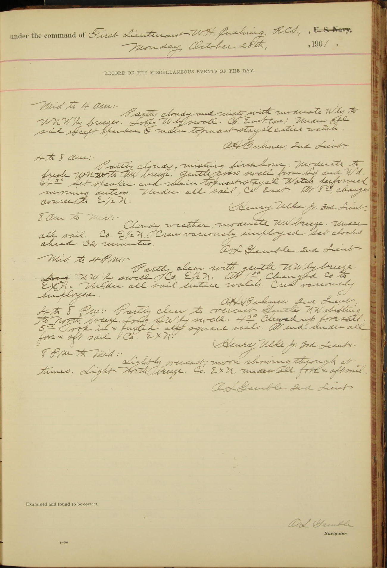 2nd Lieutenant C.S. Cochran, Revenue Cutter Service, left ship, ordered to USRC “McCulloch”, Department order of 18th instant.