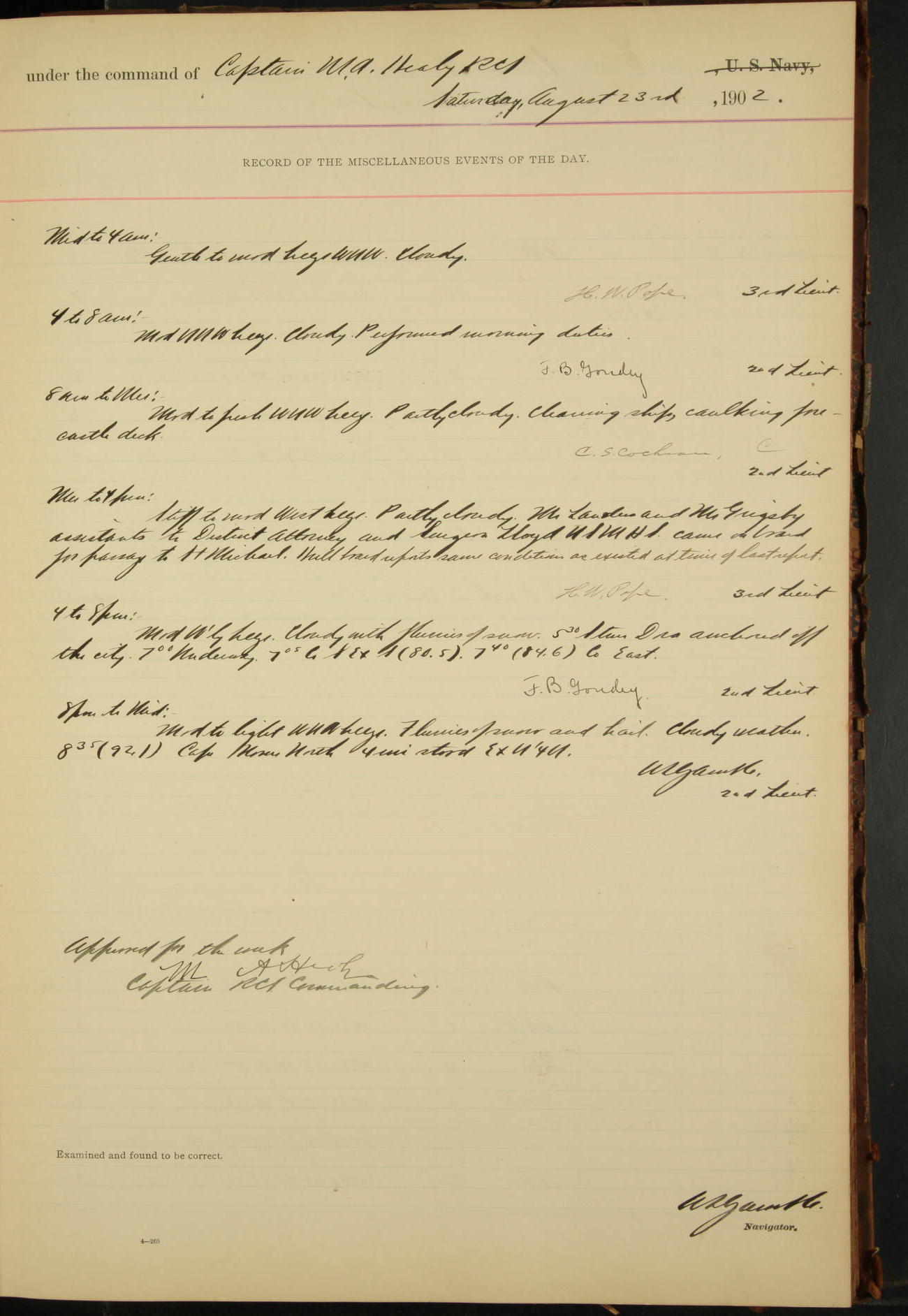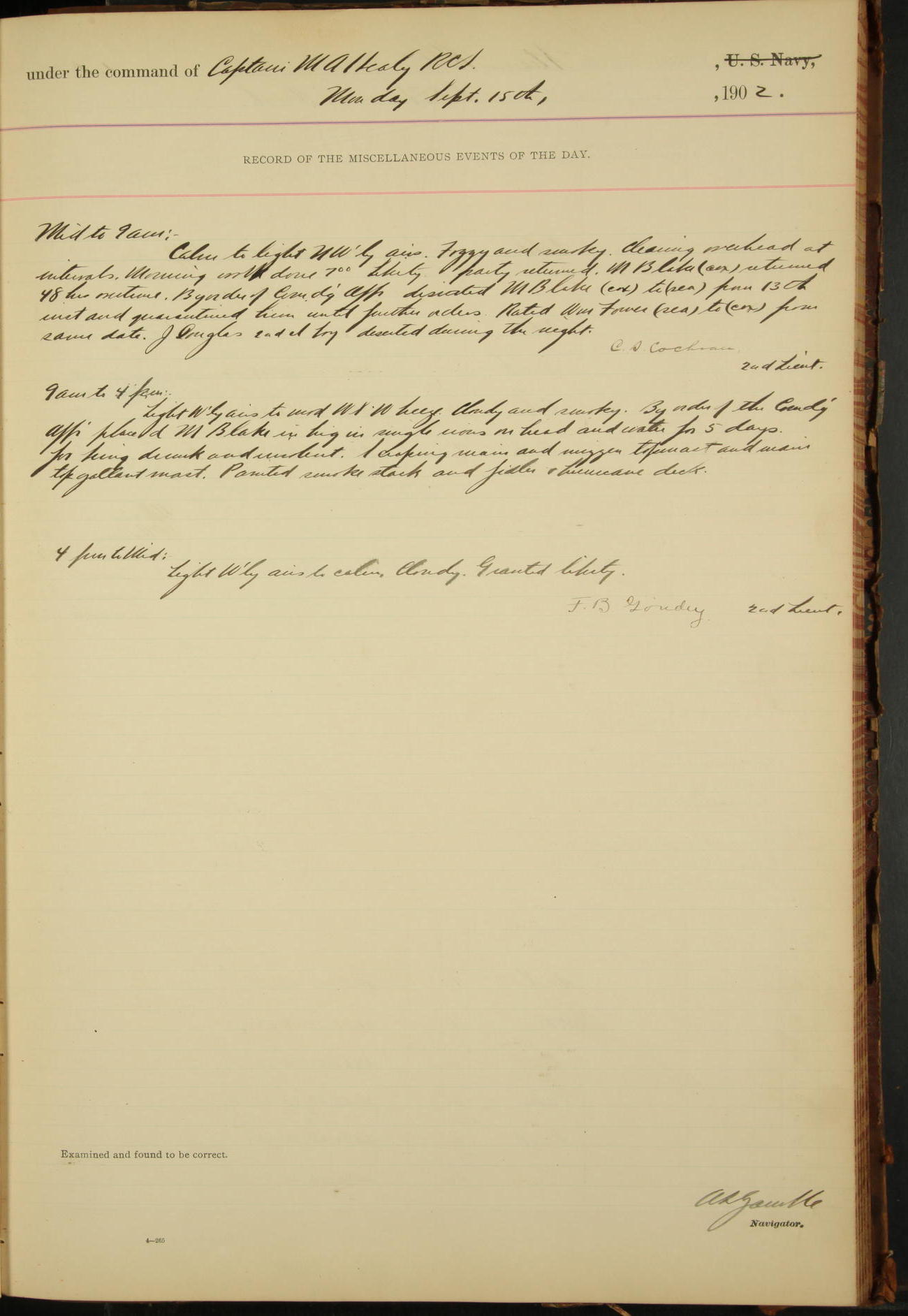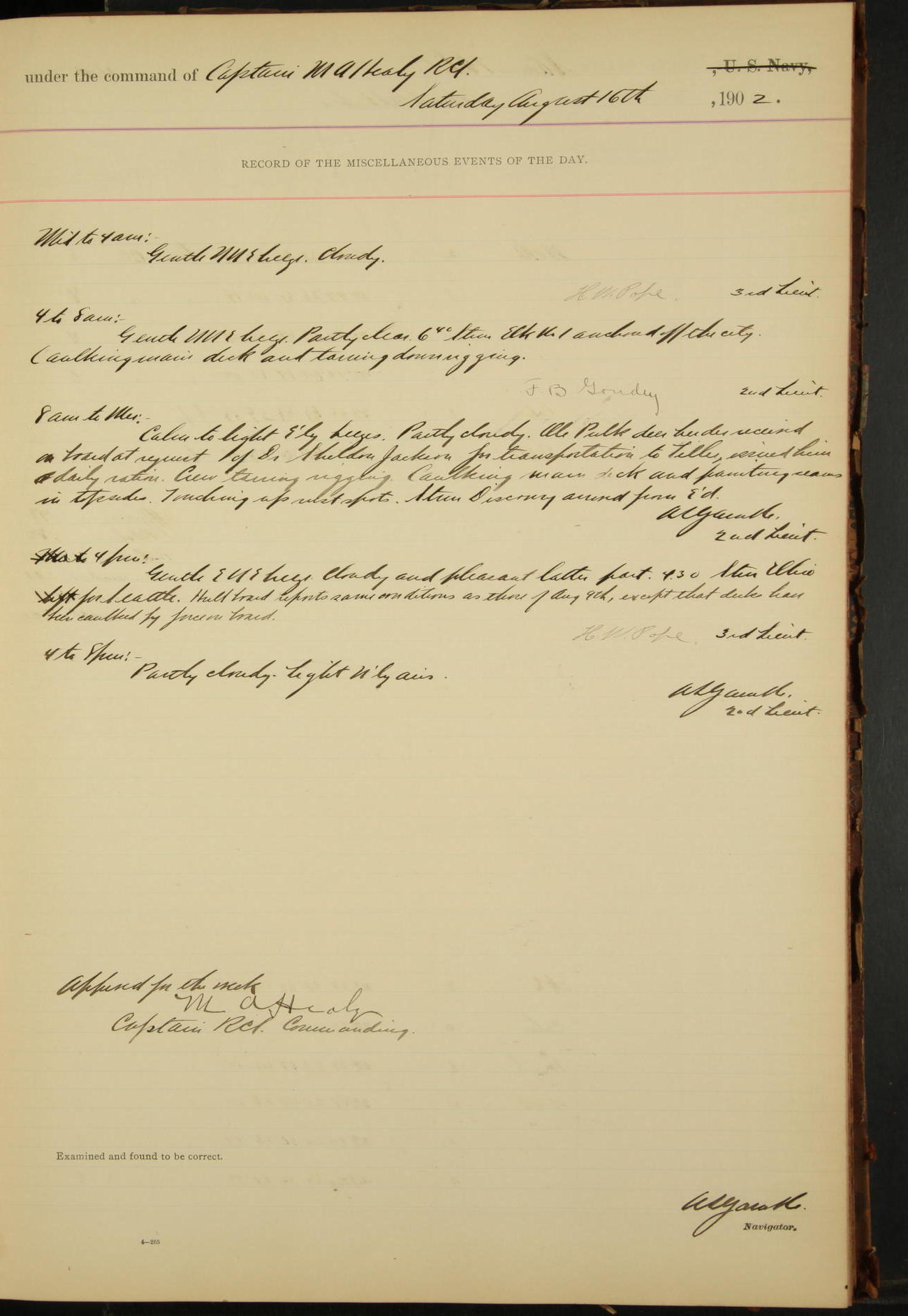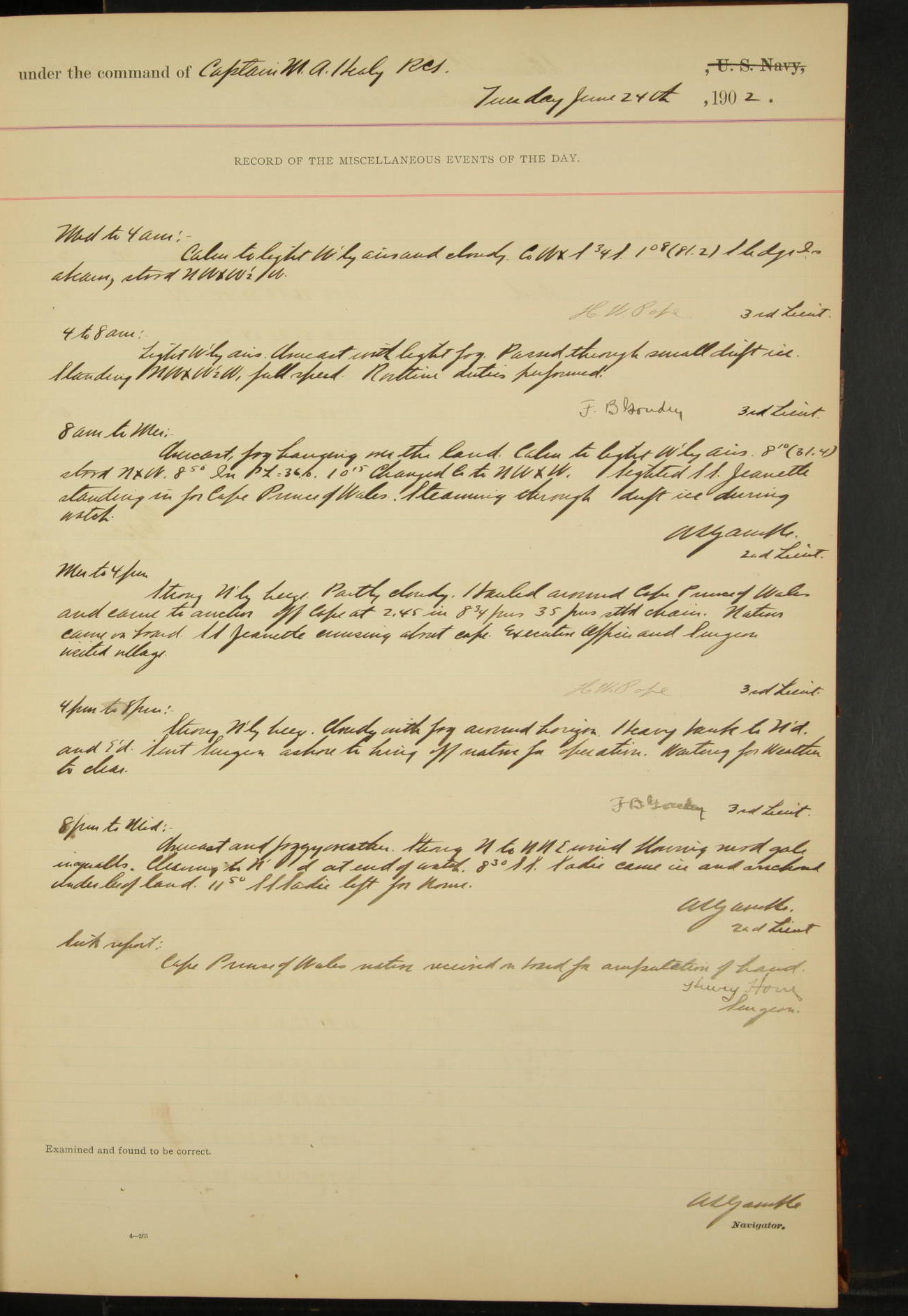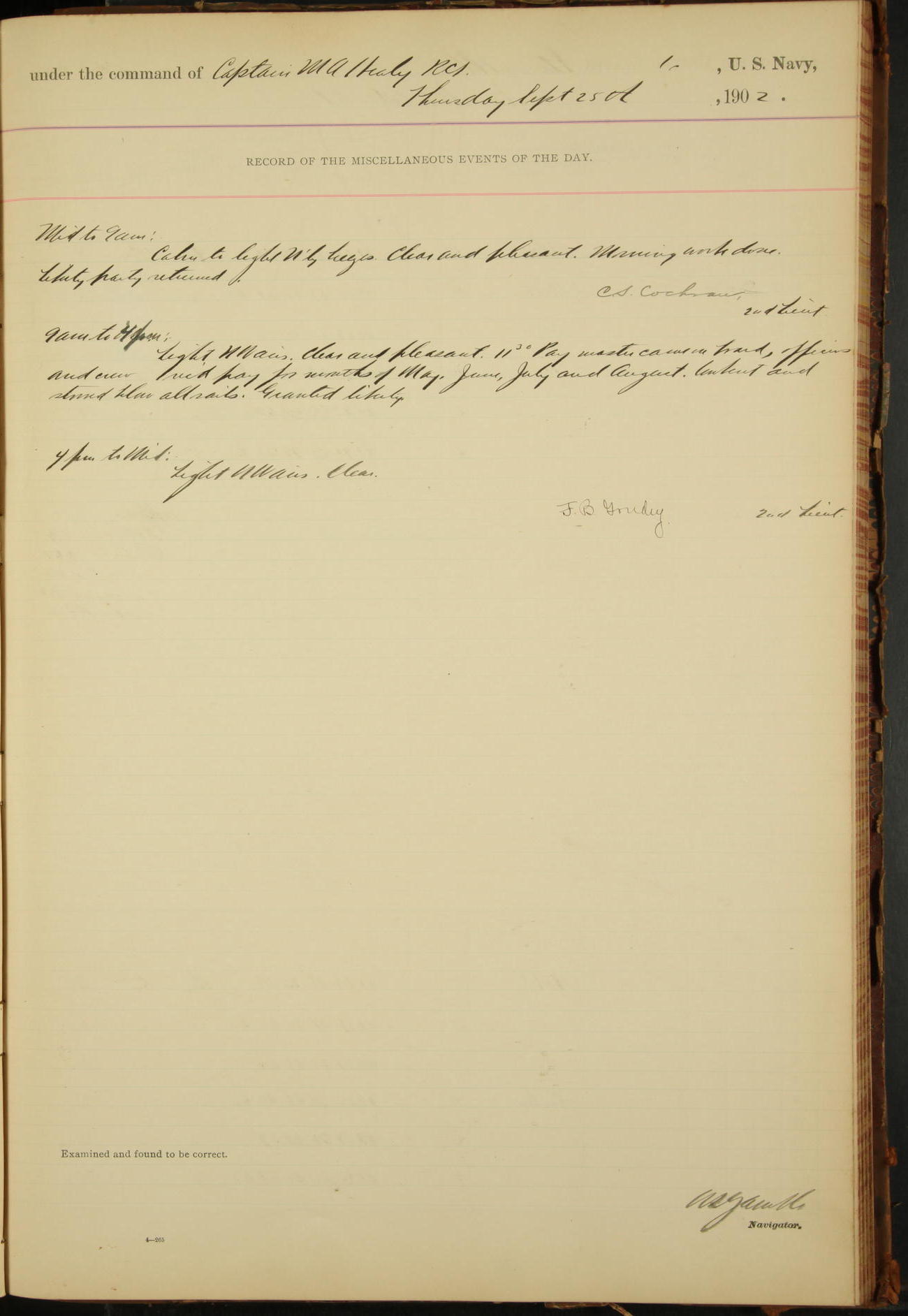 2nd Lieutenant C.S. Cochran, Revenue Cutter Service, left ship, ordered to USRC “McCulloch”, Department order of 18th instant.