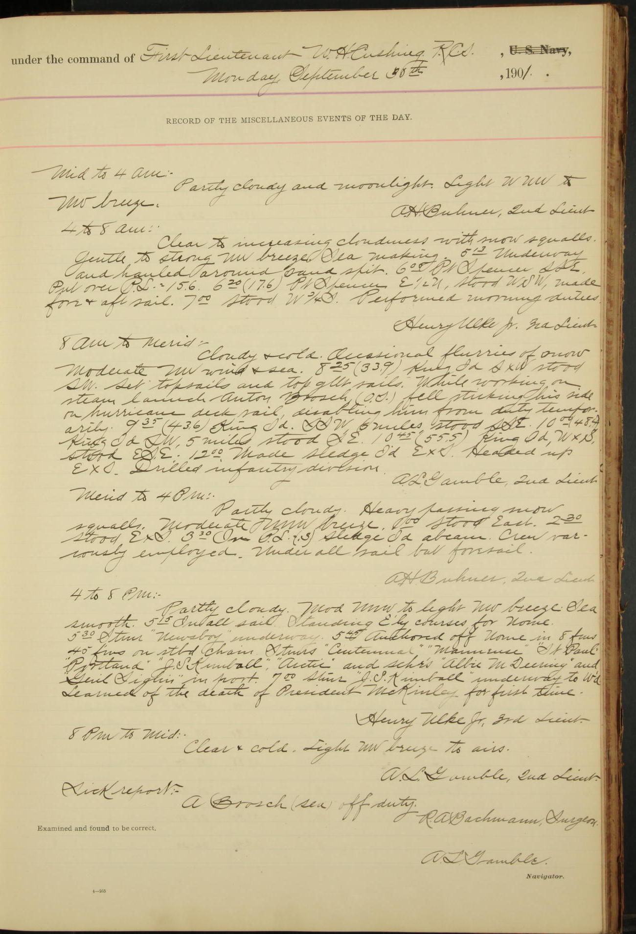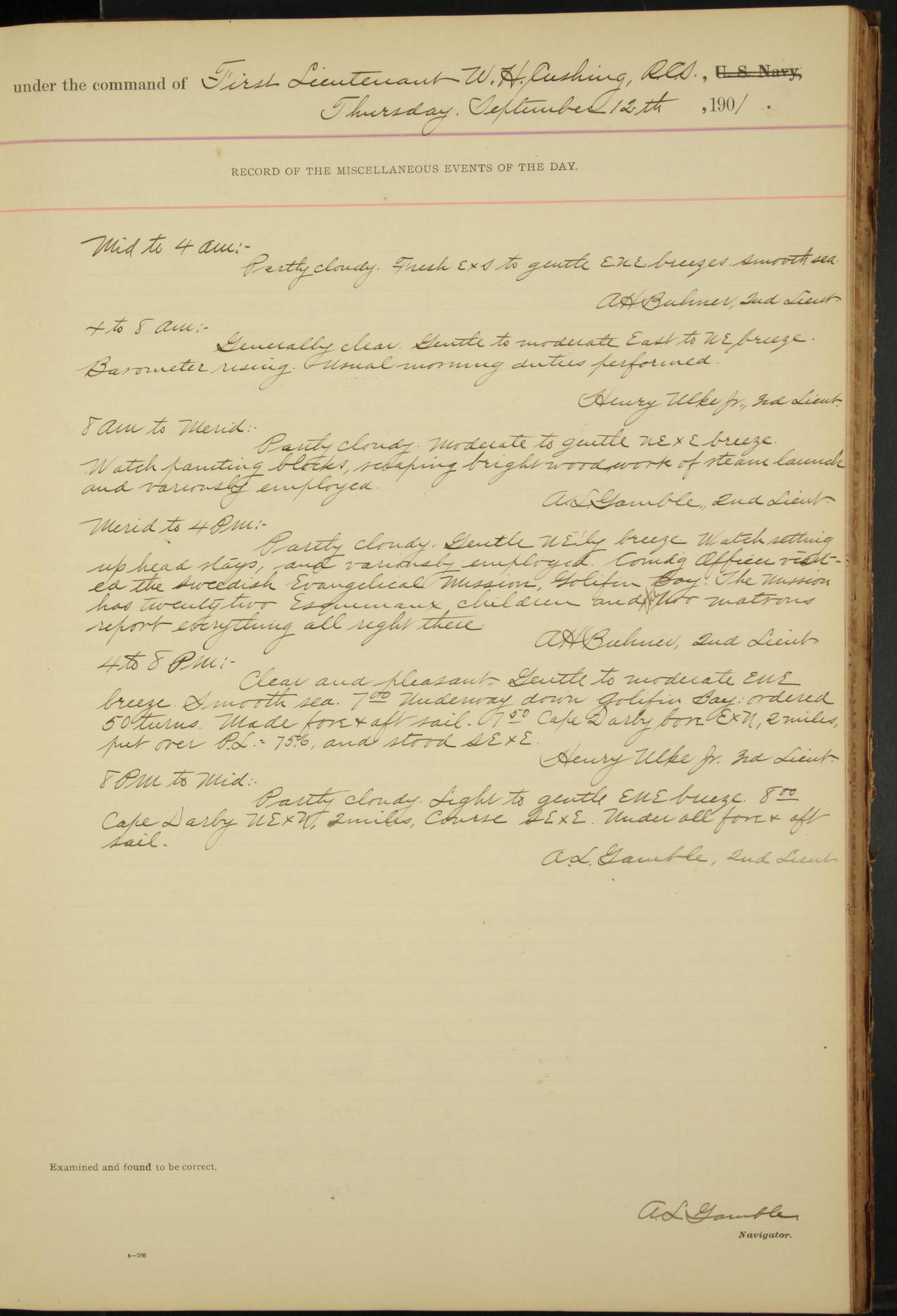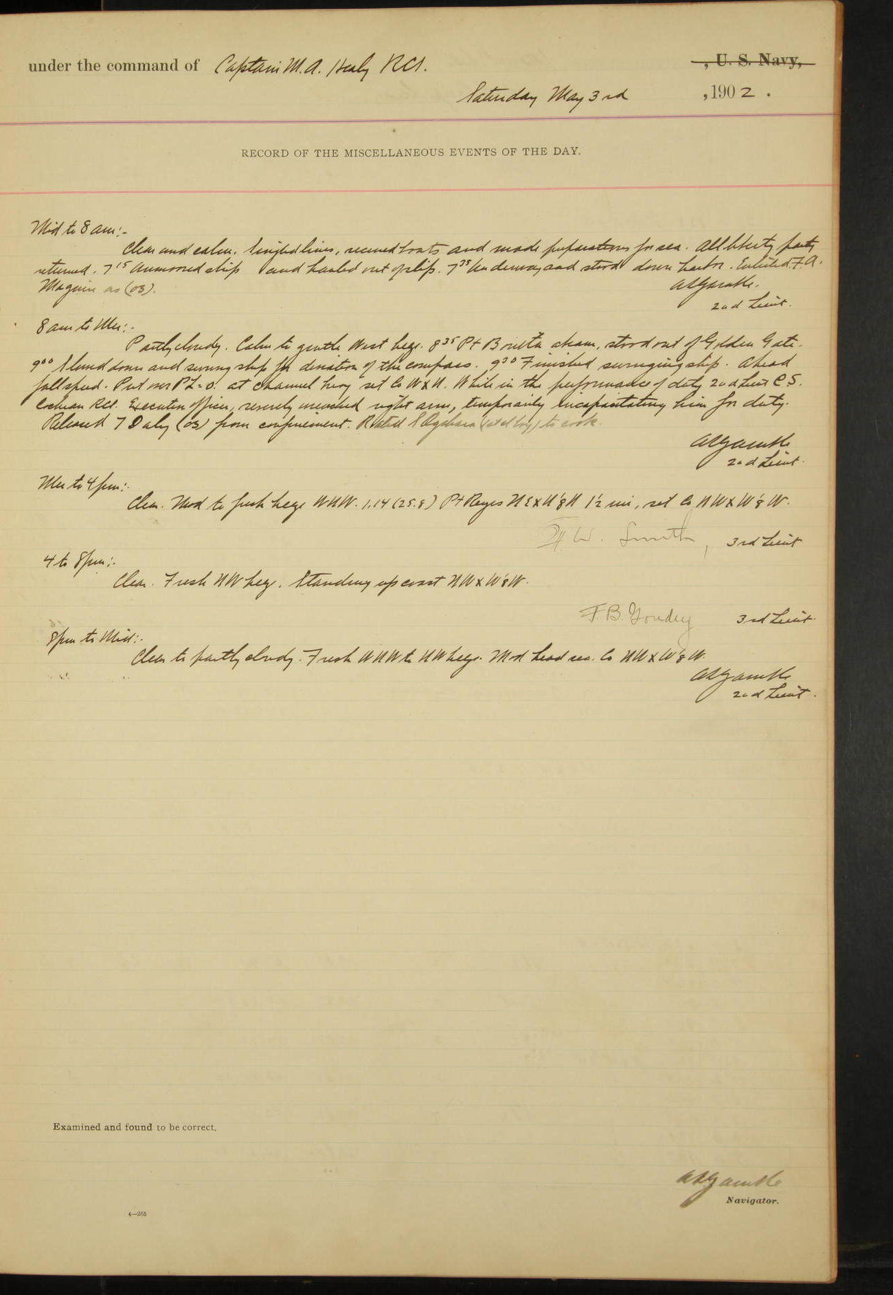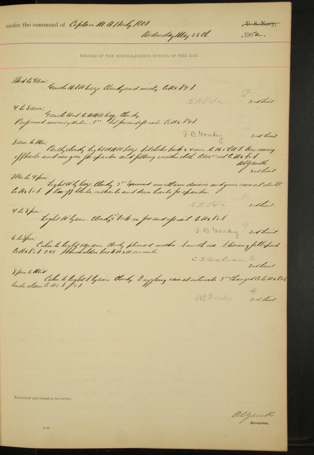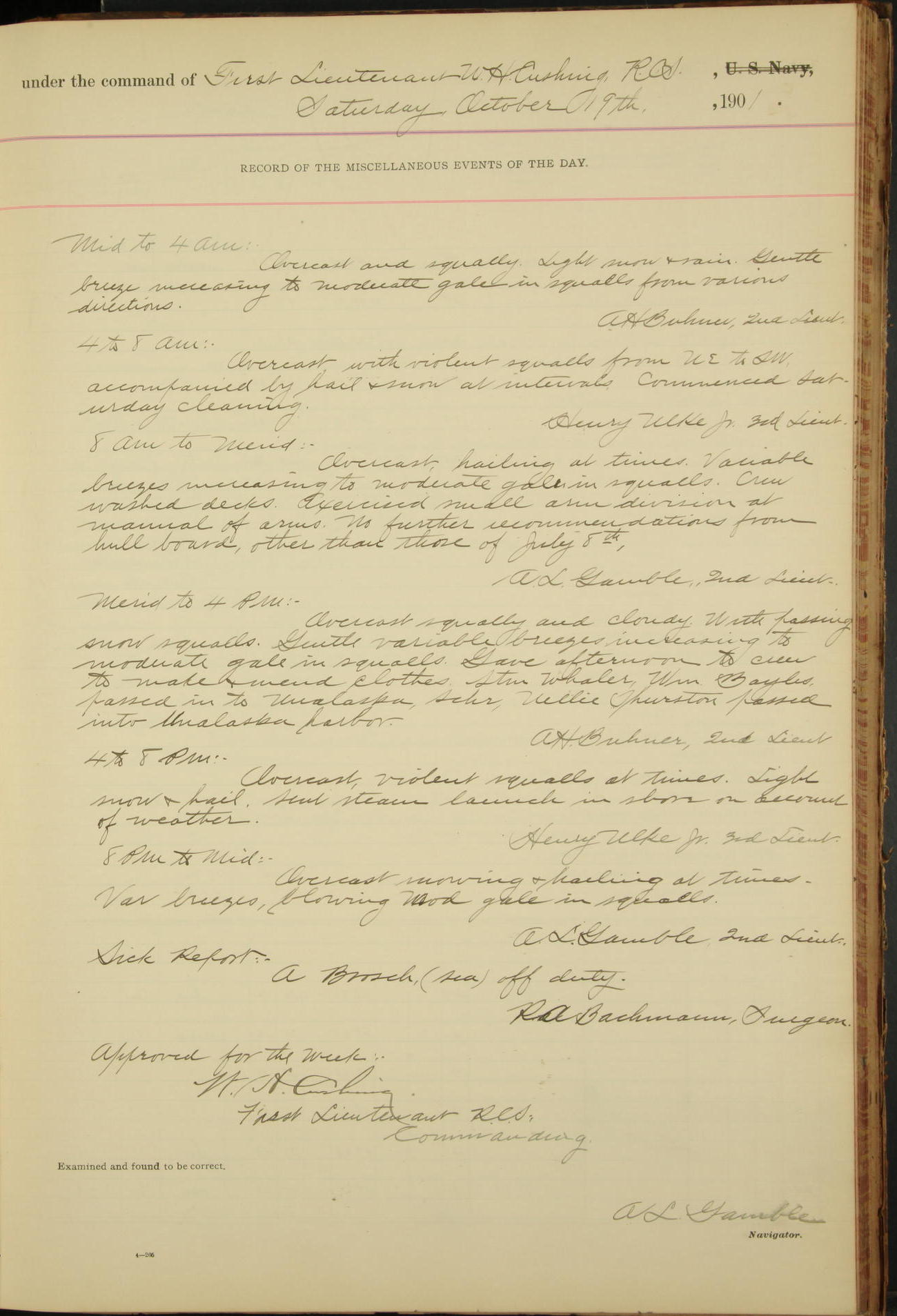 2nd Lieutenant C.S. Cochran, Revenue Cutter Service, left ship, ordered to USRC “McCulloch”, Department order of 18th instant.