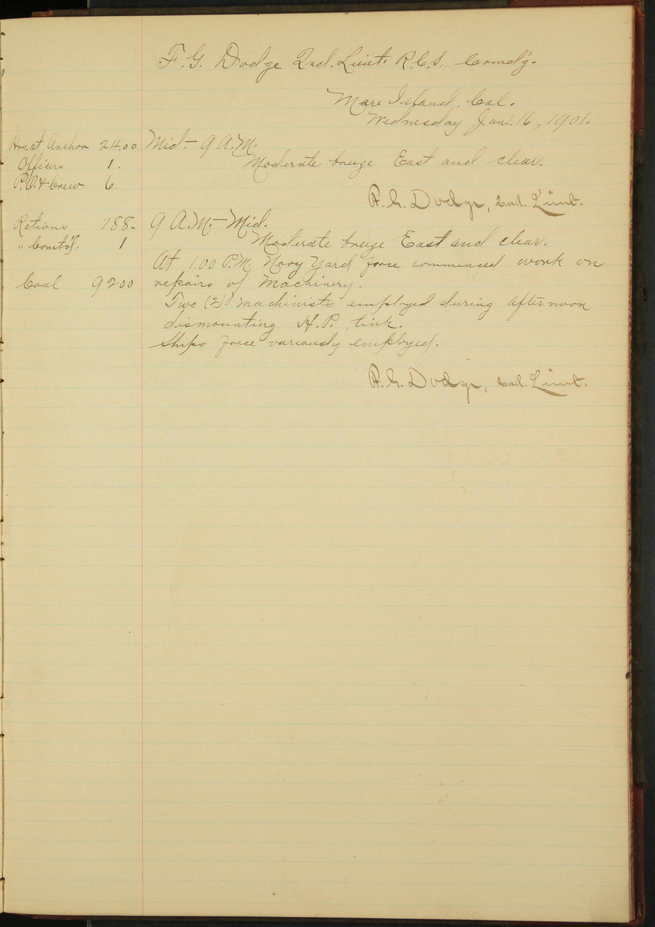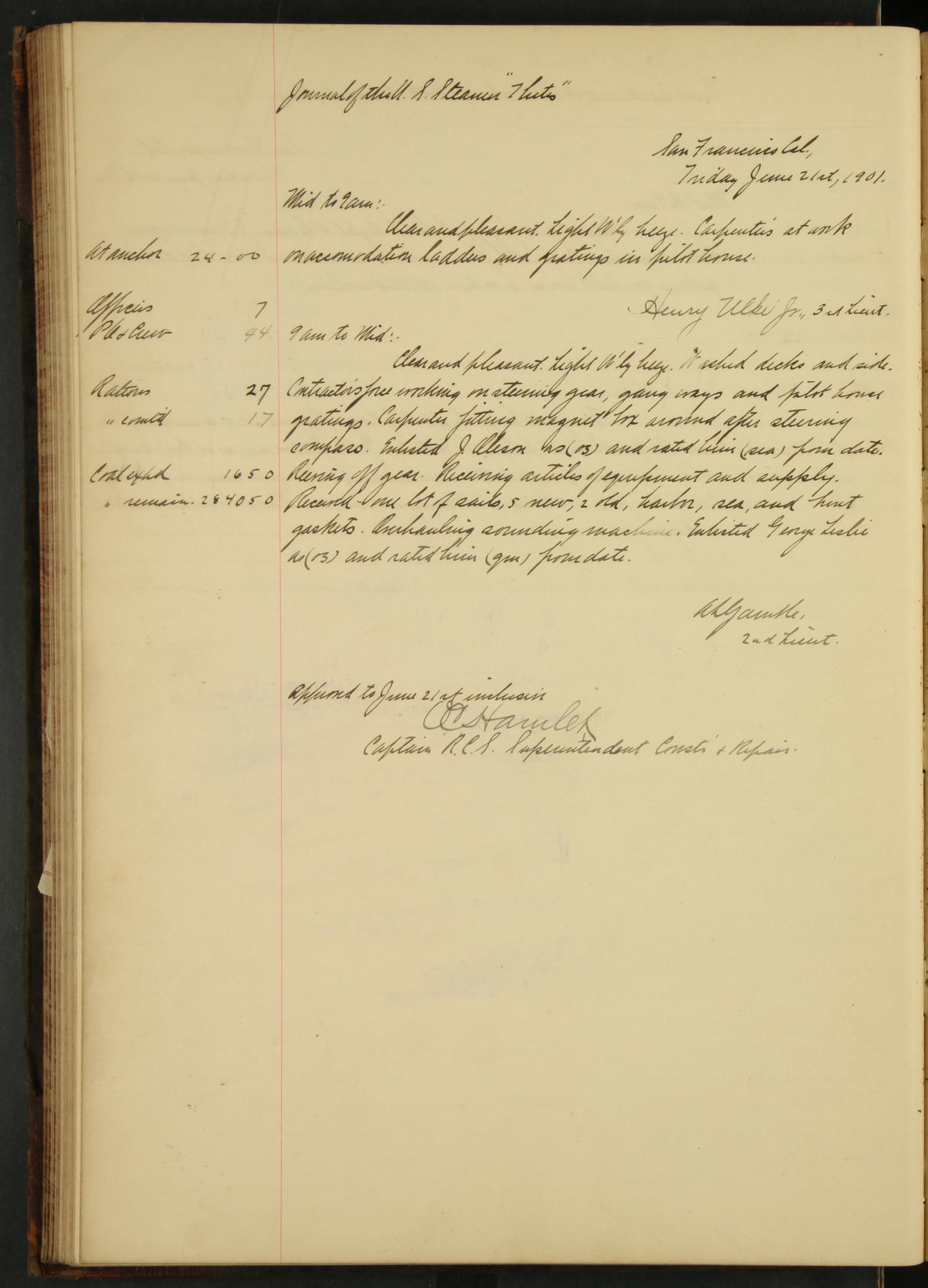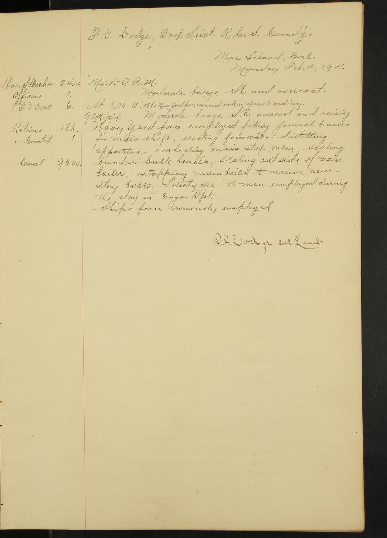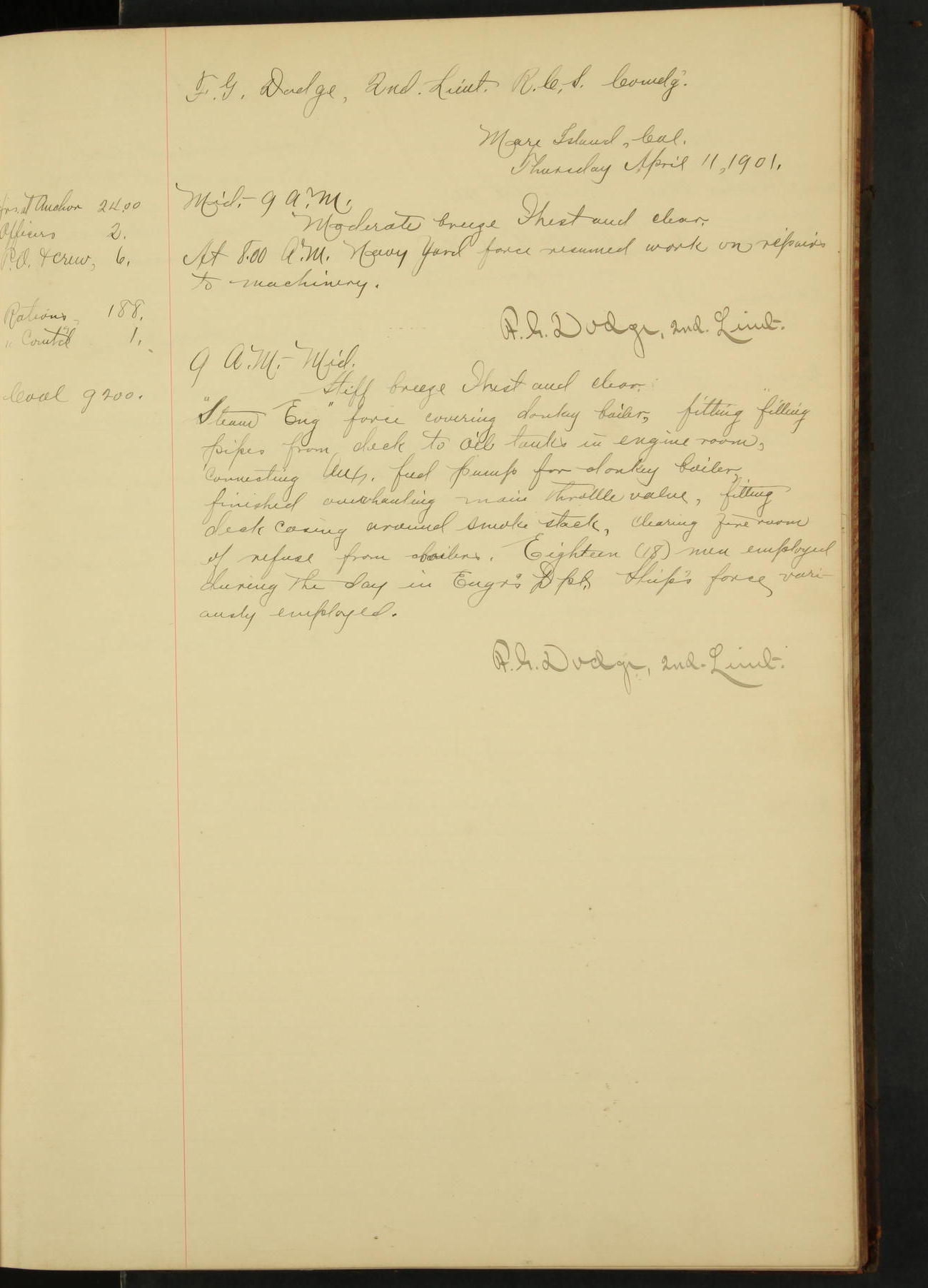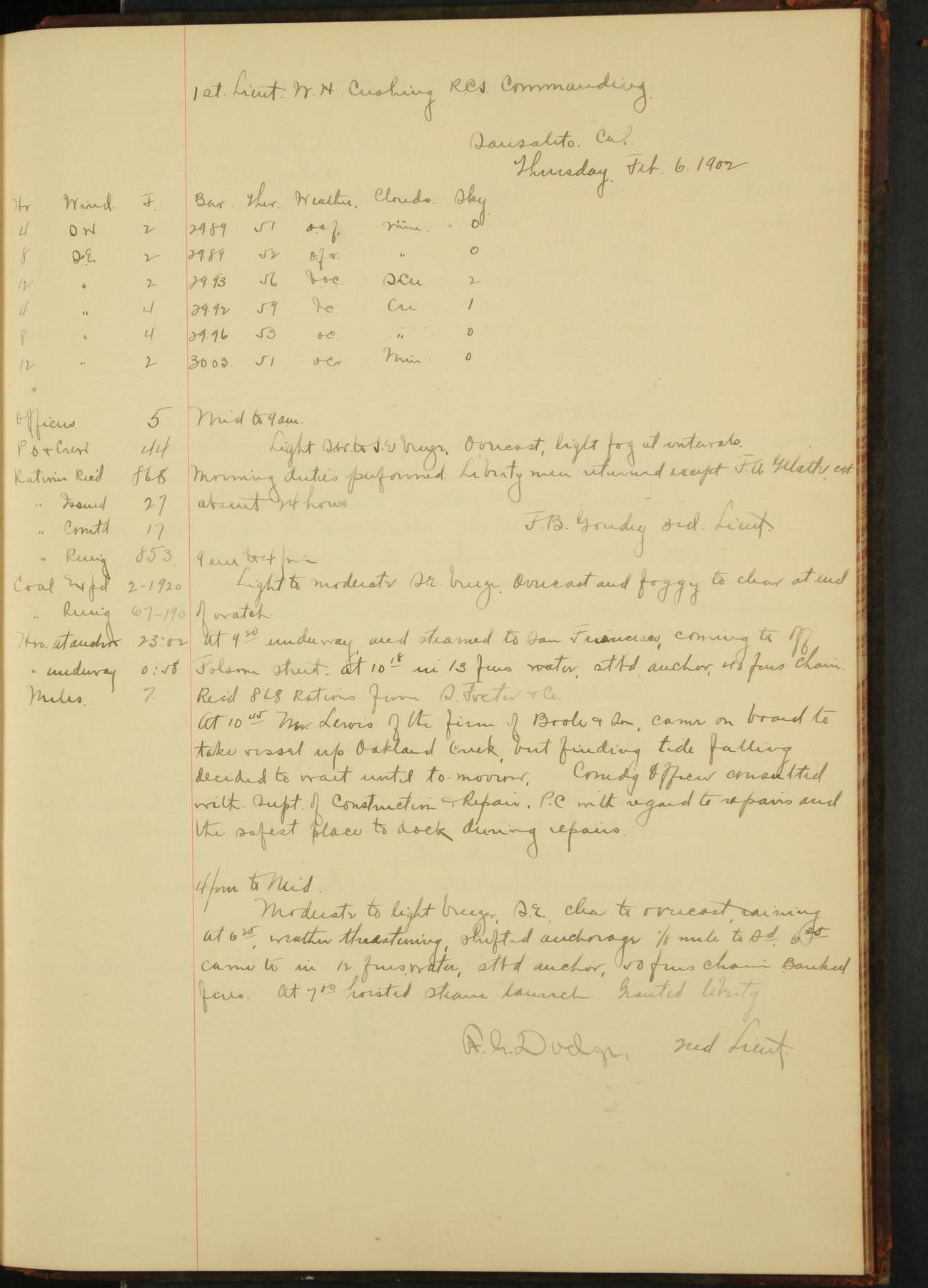 At 4.30 arrived and made fast alongside sea wall, “Steam Engineering Department”, Mare Island Navy Yard; USRC “Golden Gate” cast off and steamed back to San Francisco.