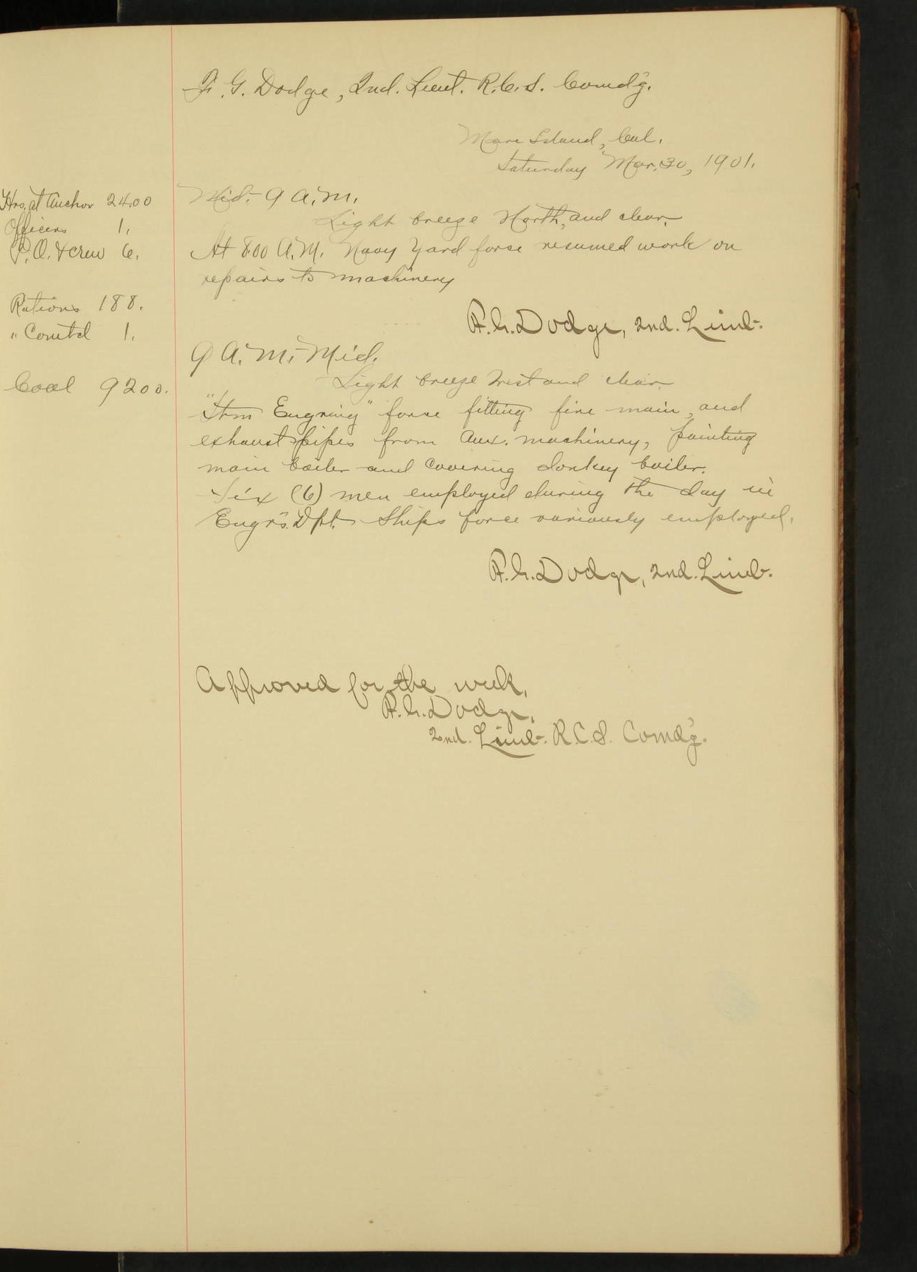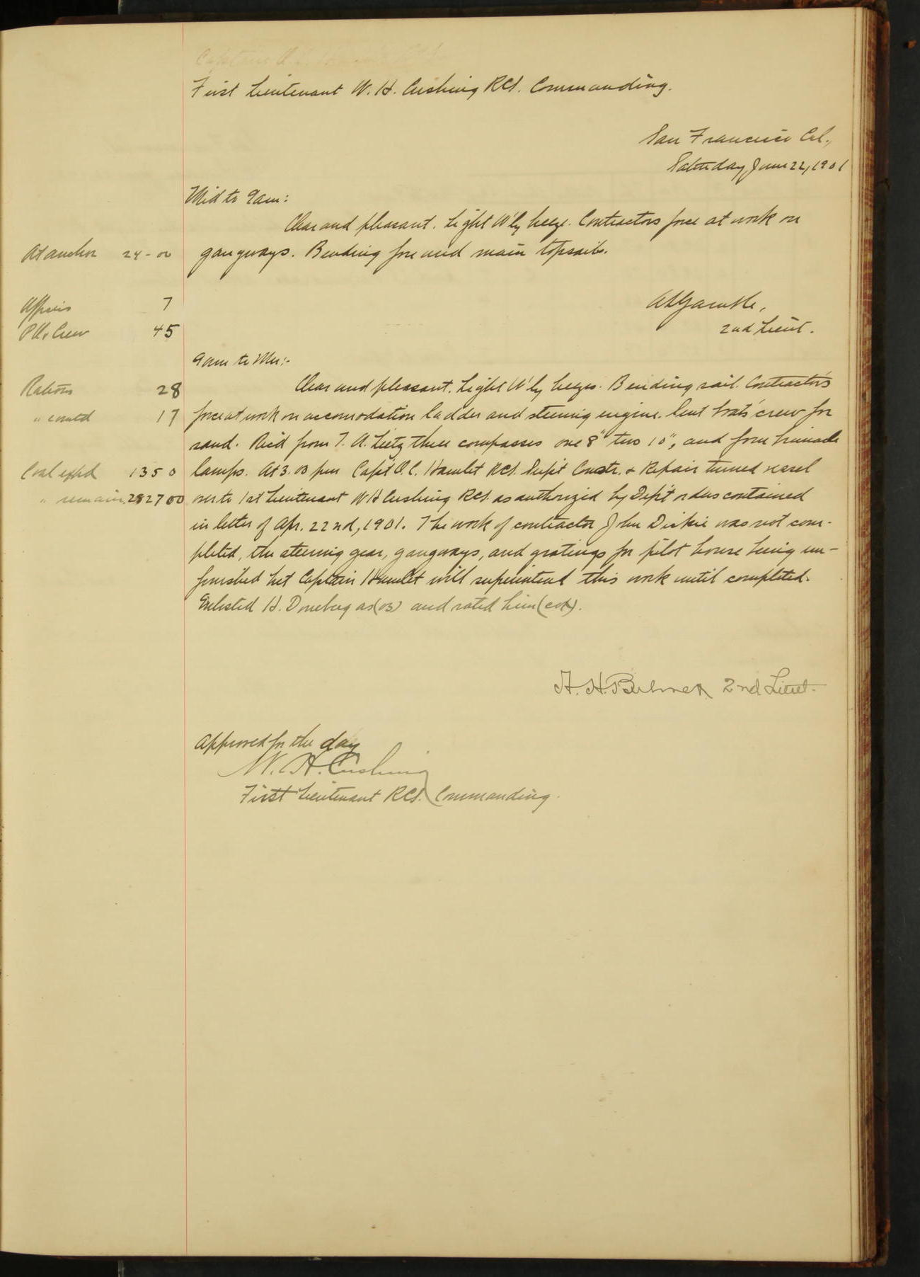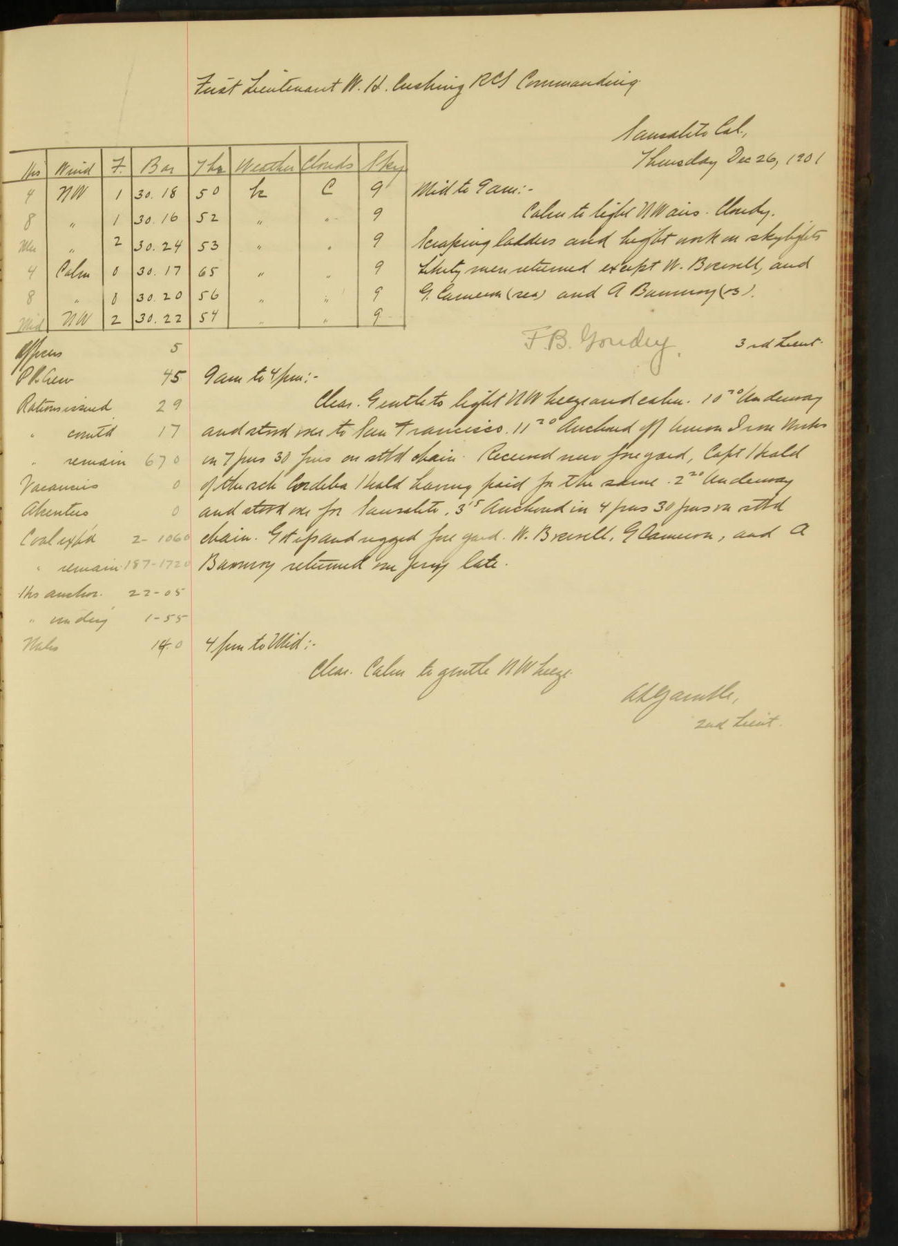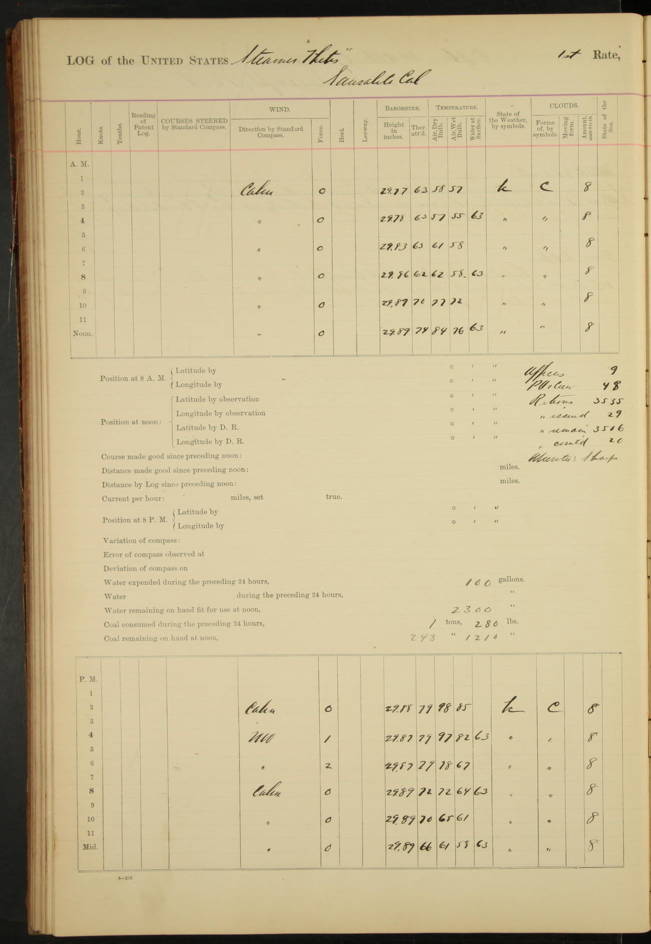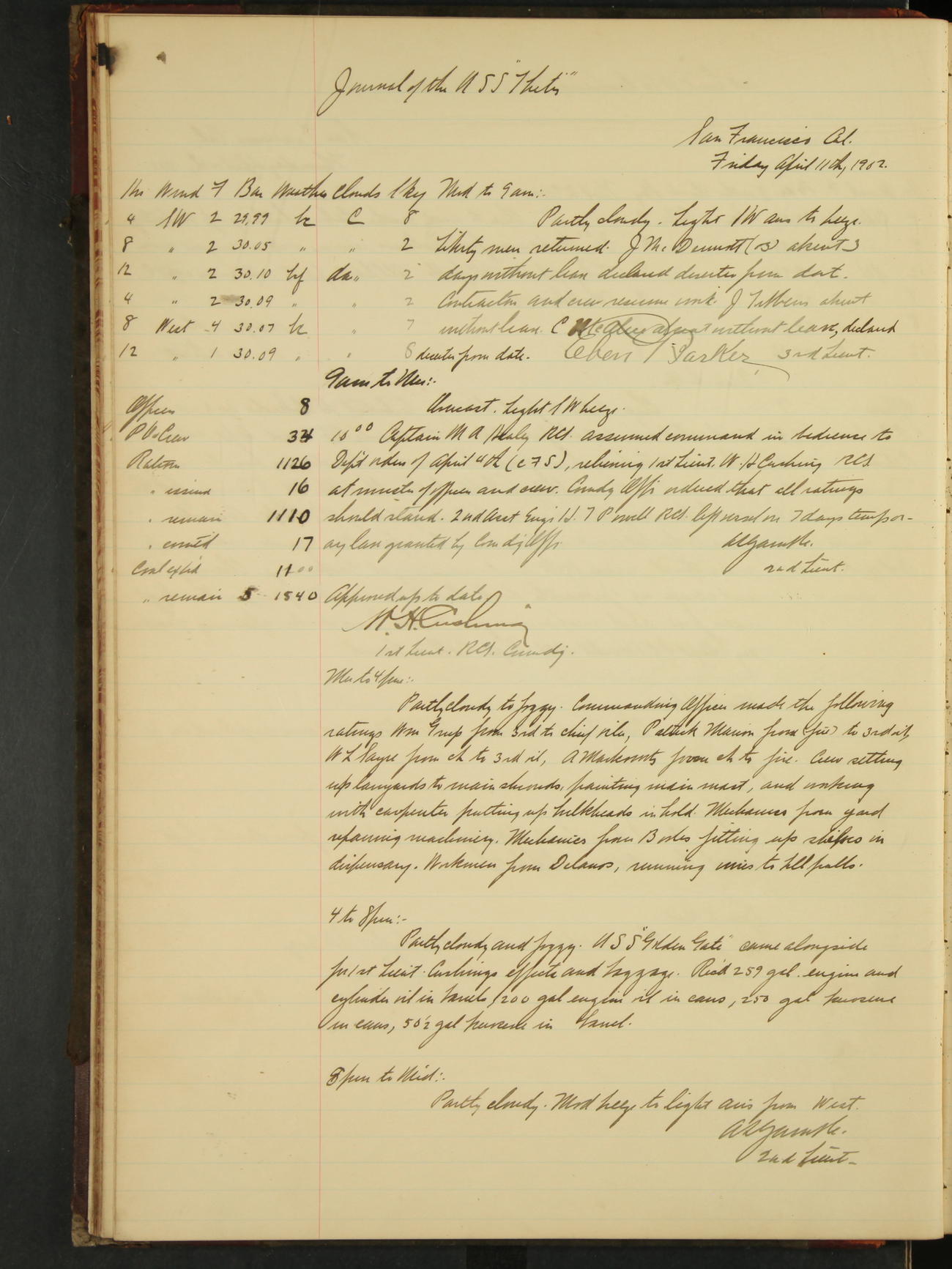 At 4.30 arrived and made fast alongside sea wall, “Steam Engineering Department”, Mare Island Navy Yard; USRC “Golden Gate” cast off and steamed back to San Francisco.