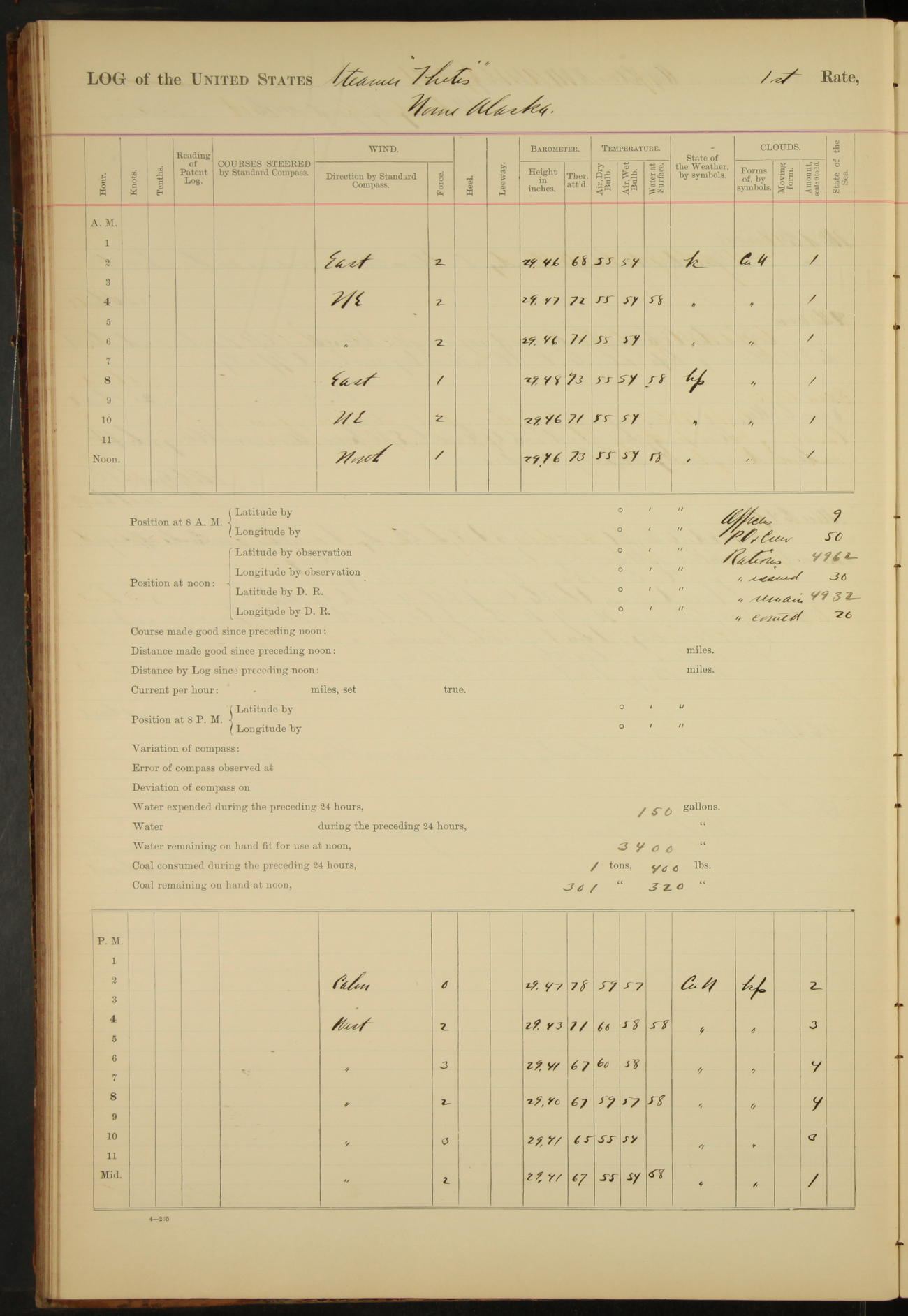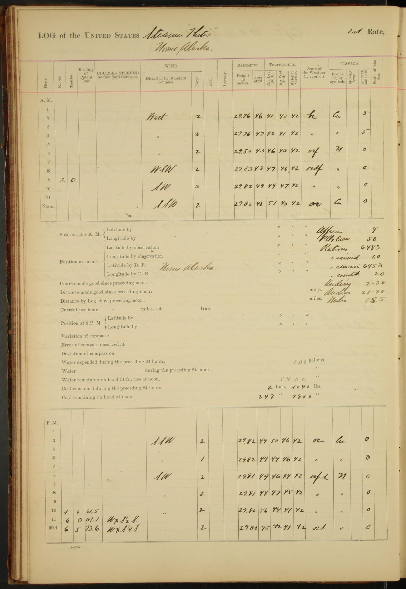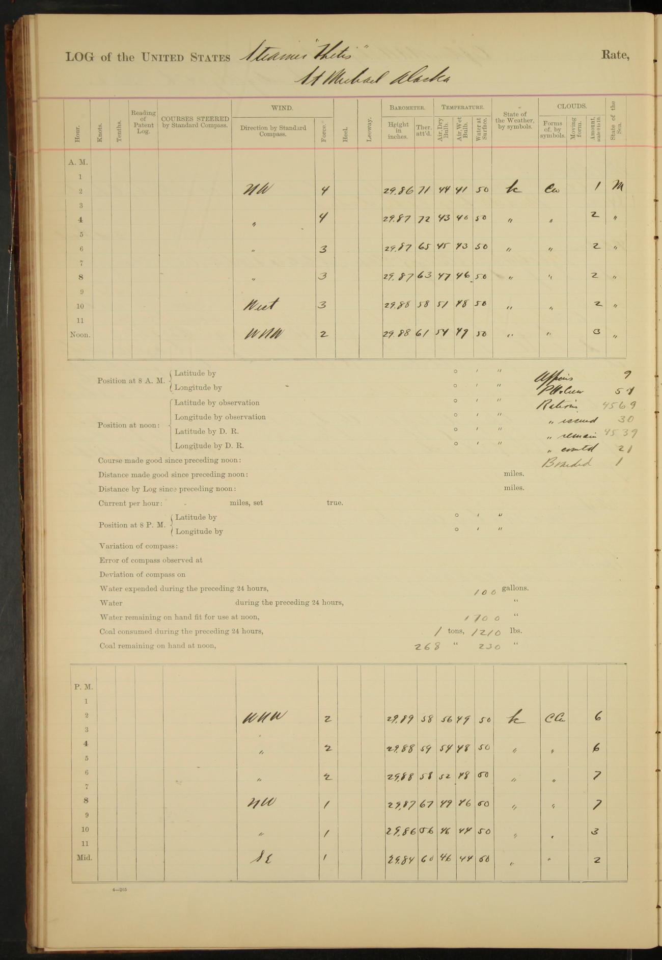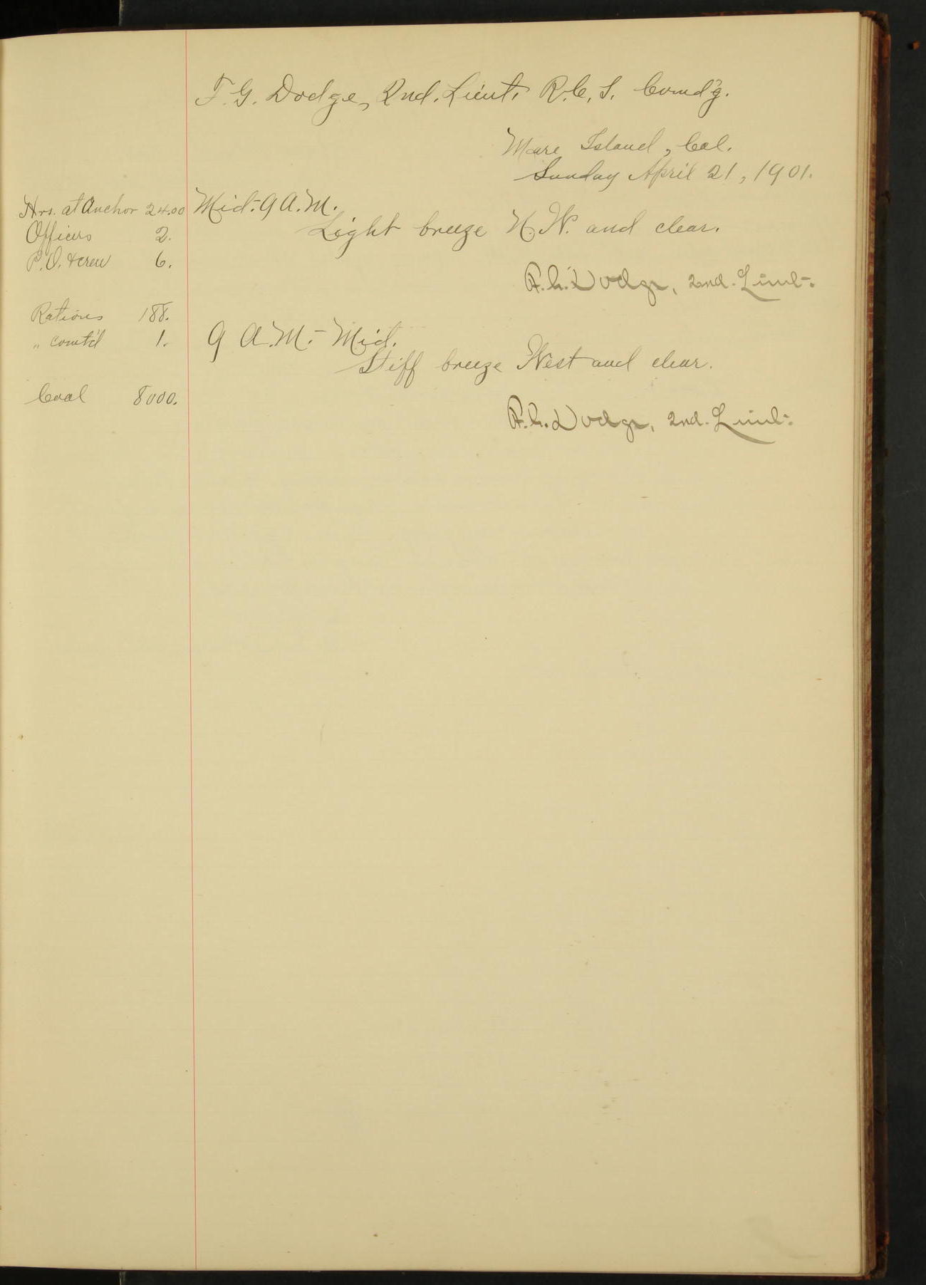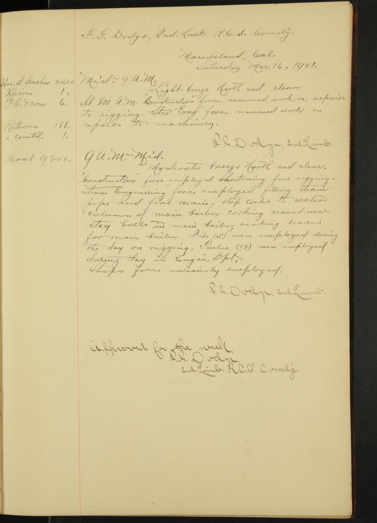 At 4.30 arrived and made fast alongside sea wall, “Steam Engineering Department”, Mare Island Navy Yard; USRC “Golden Gate” cast off and steamed back to San Francisco.