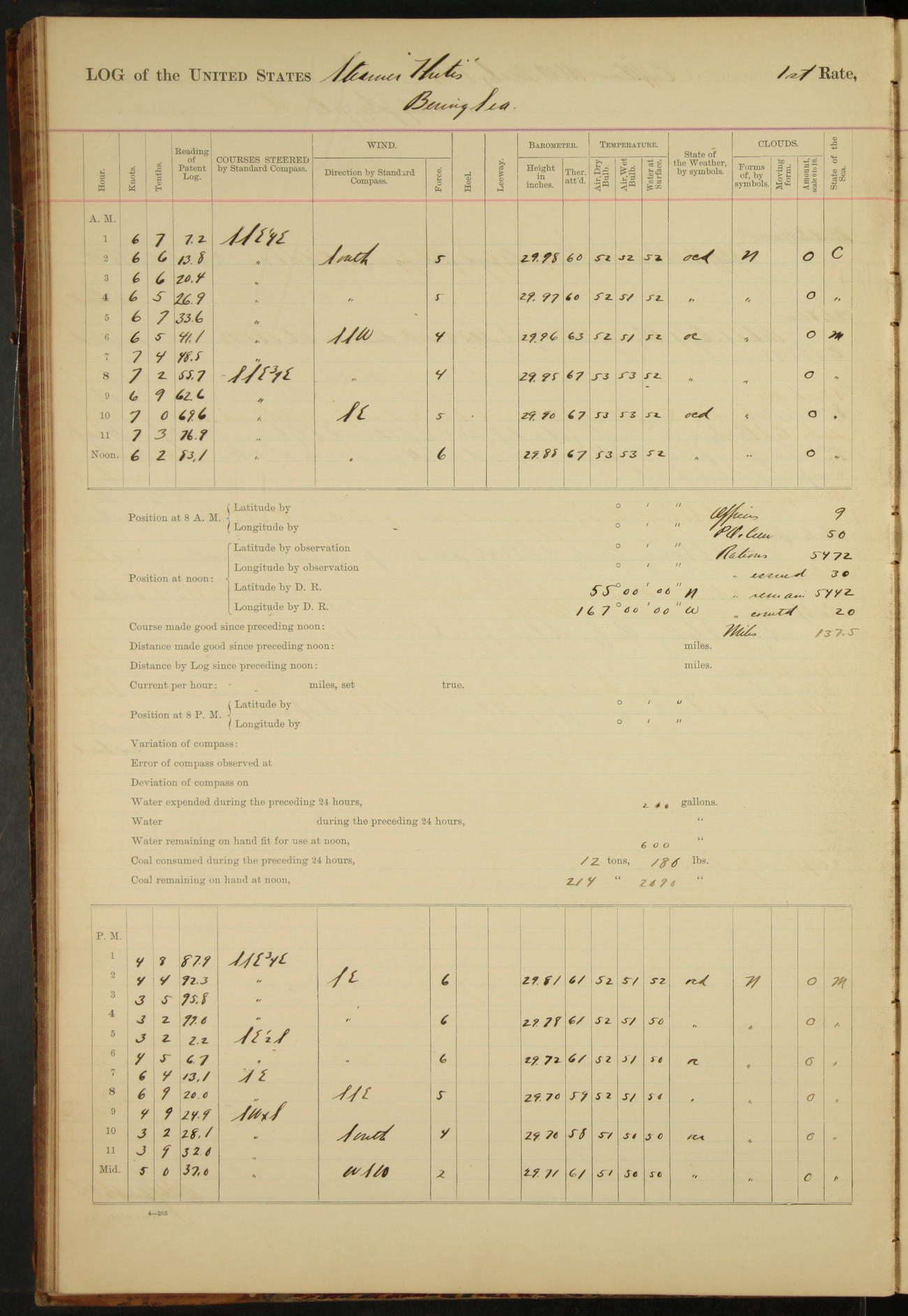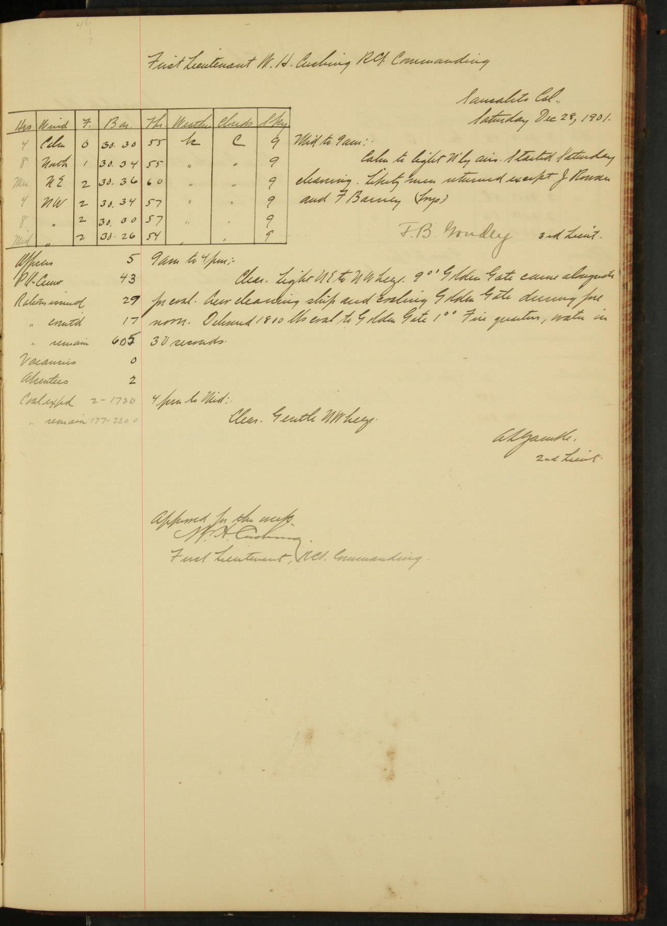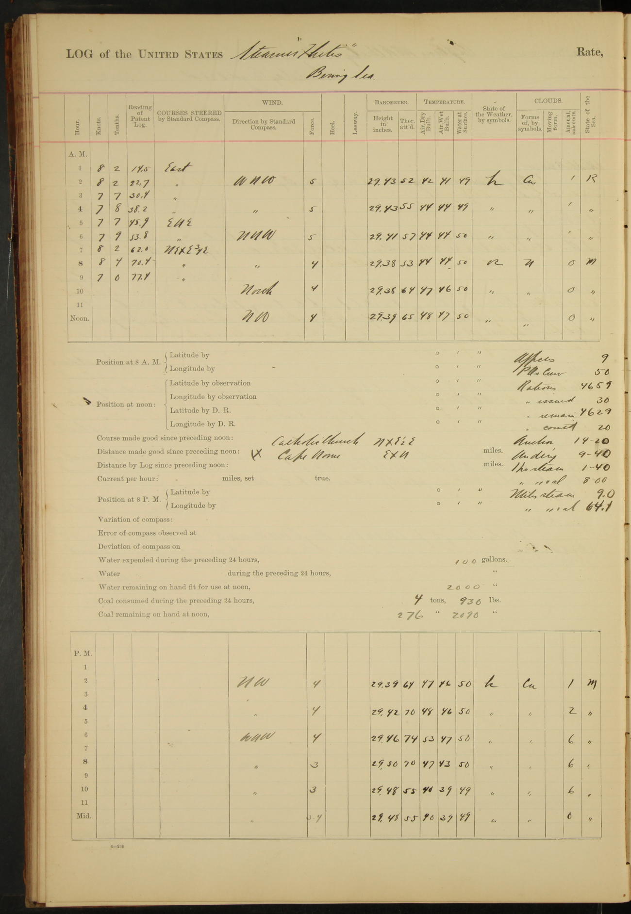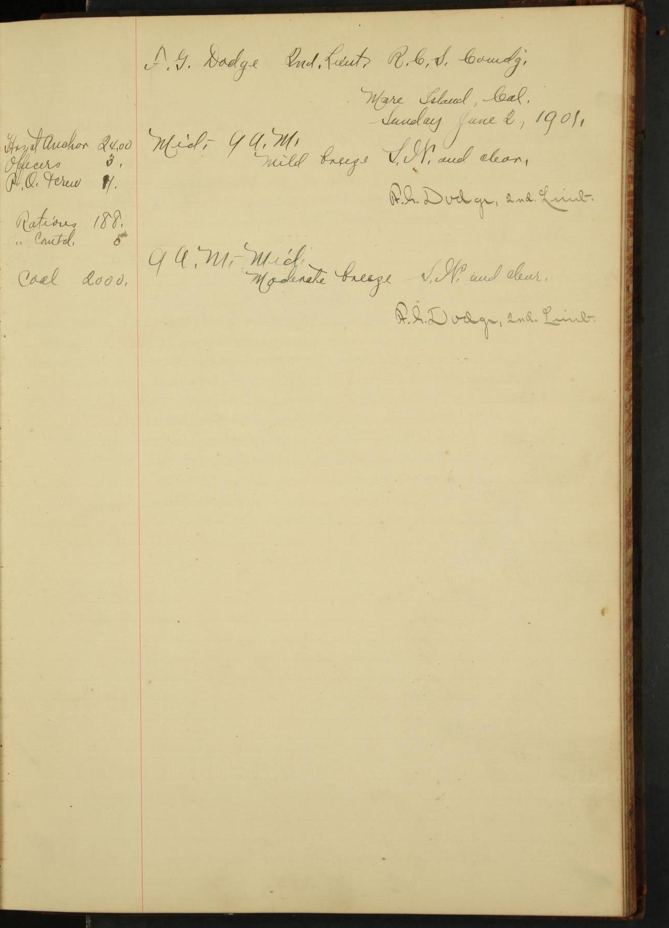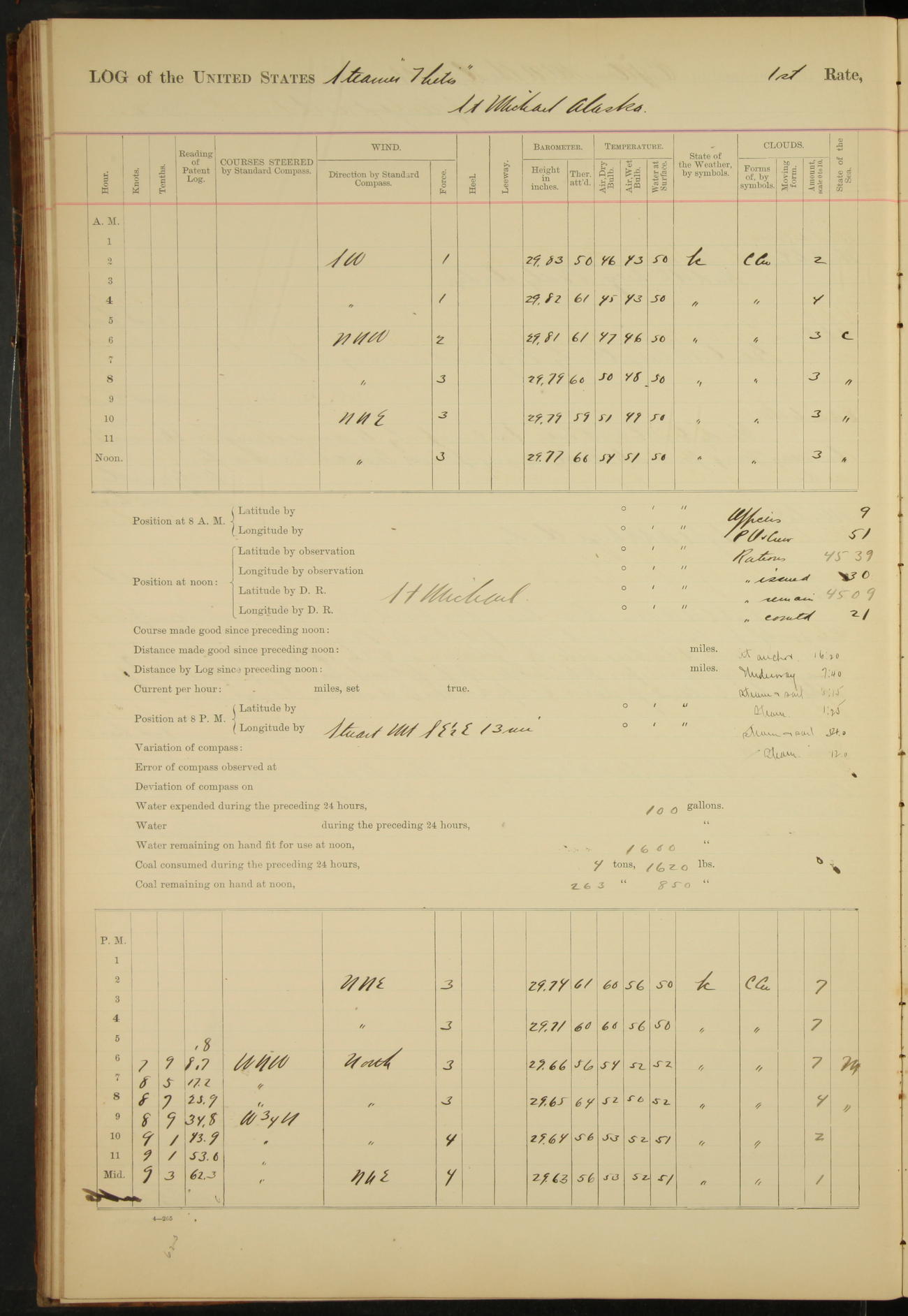 At 4.30 arrived and made fast alongside sea wall, “Steam Engineering Department”, Mare Island Navy Yard; USRC “Golden Gate” cast off and steamed back to San Francisco.