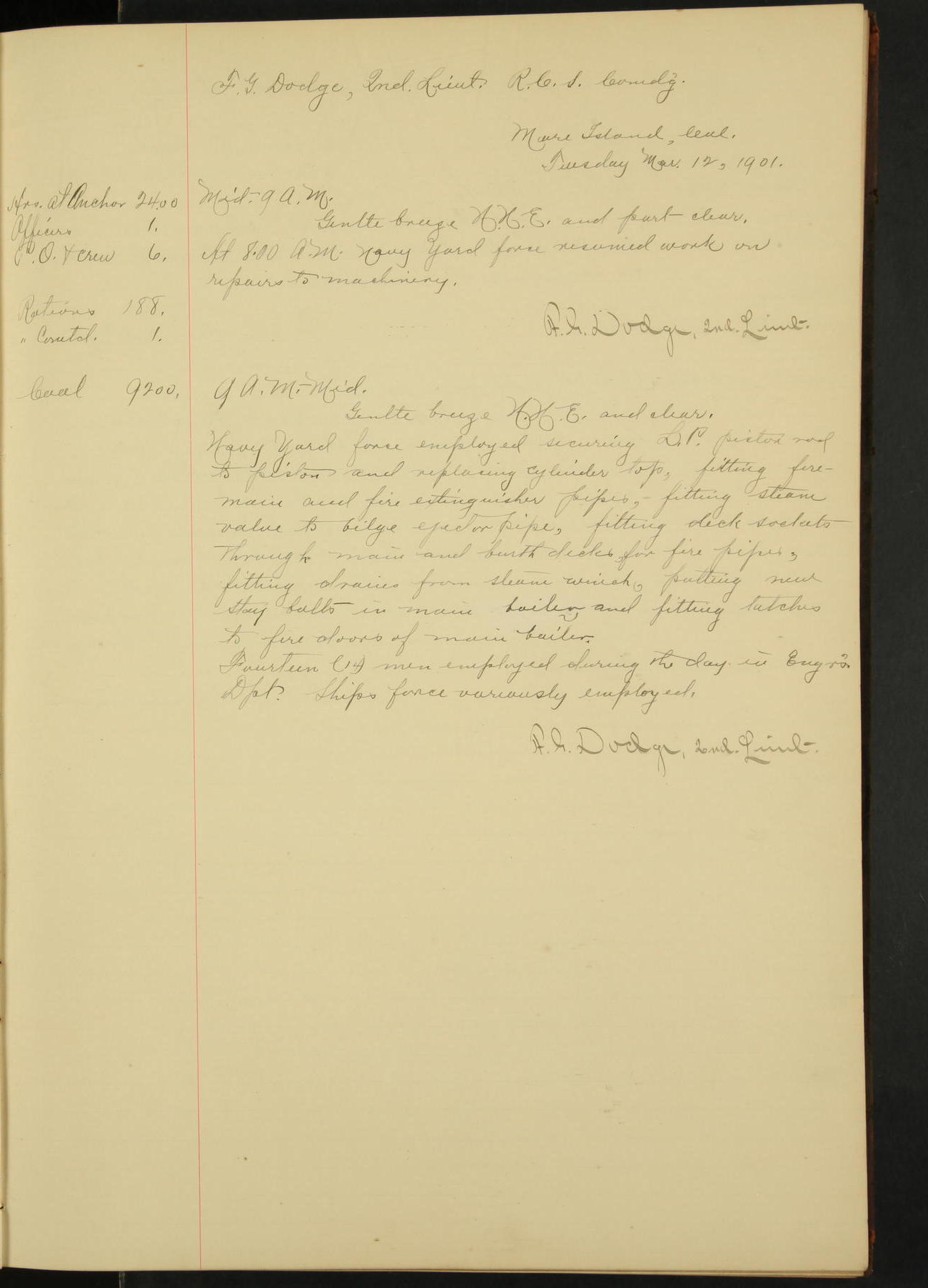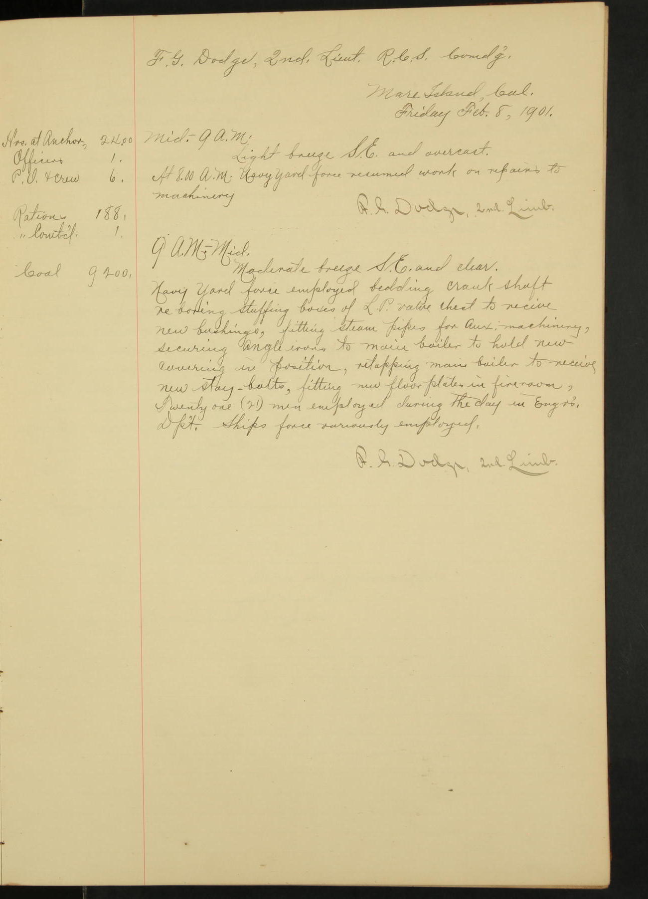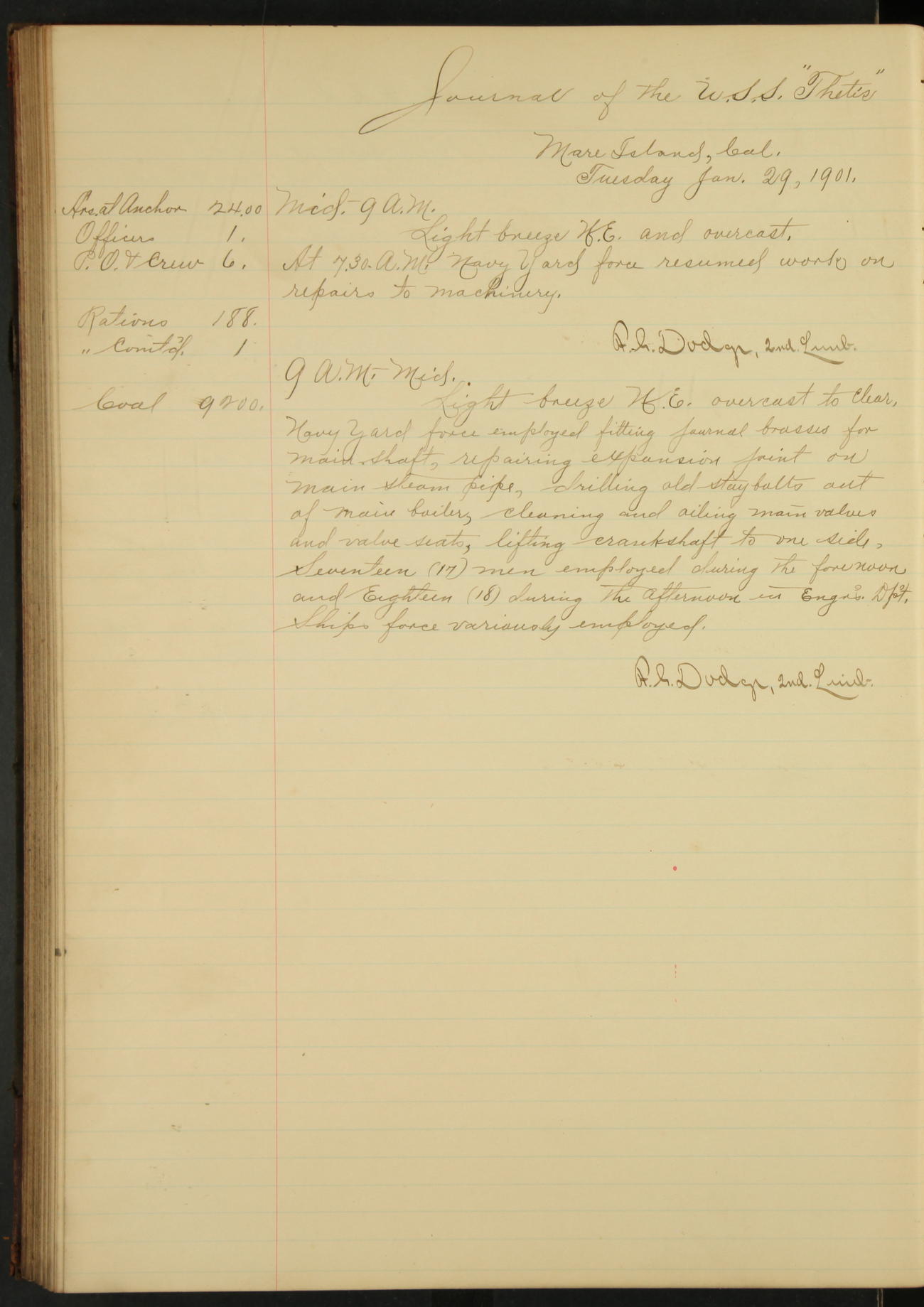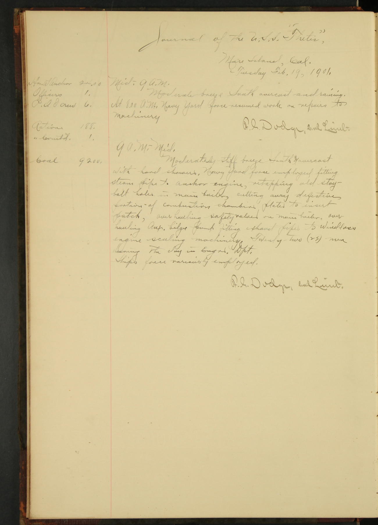 At 1.00 Navy Yard force commenced work on repairs of machinery.