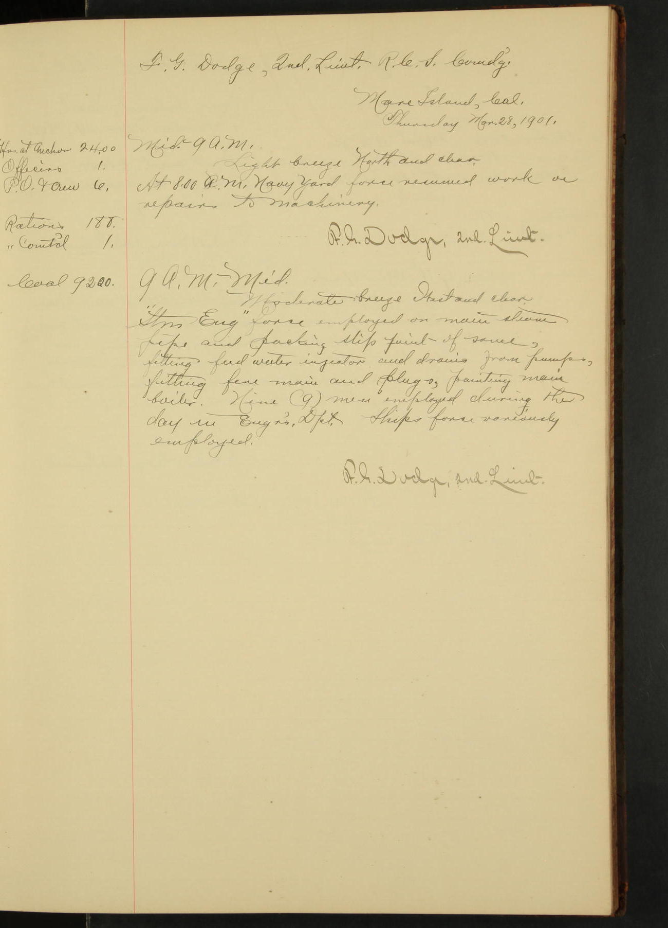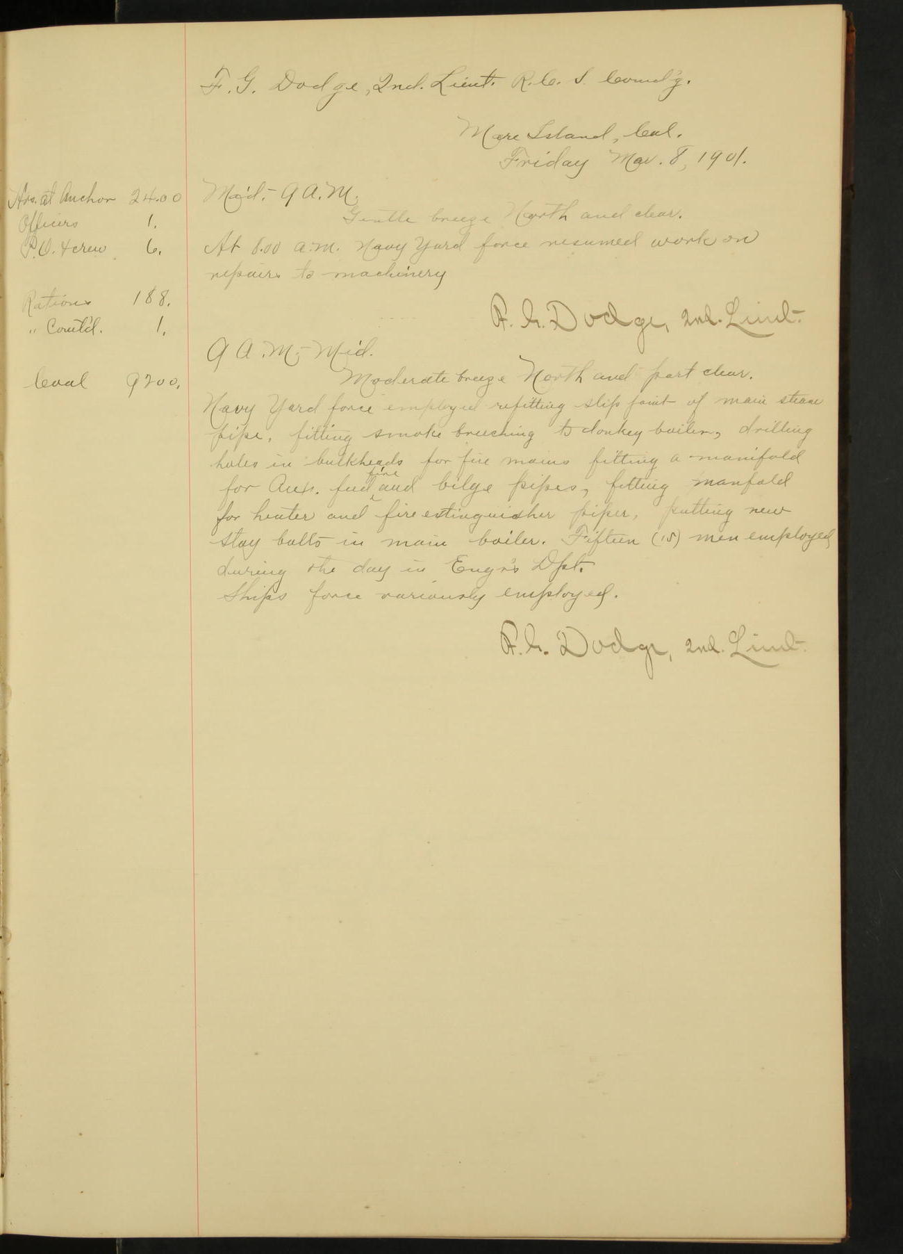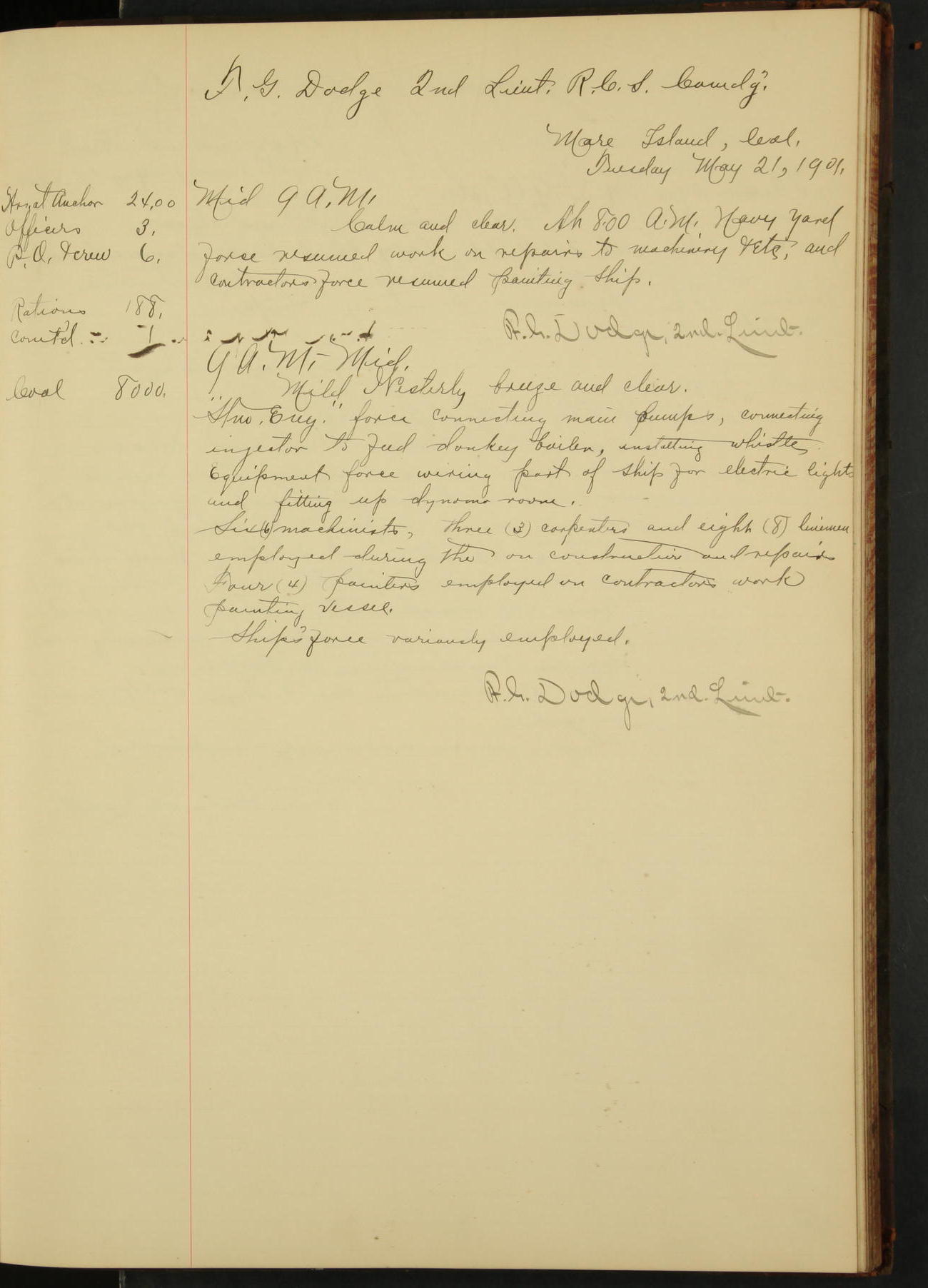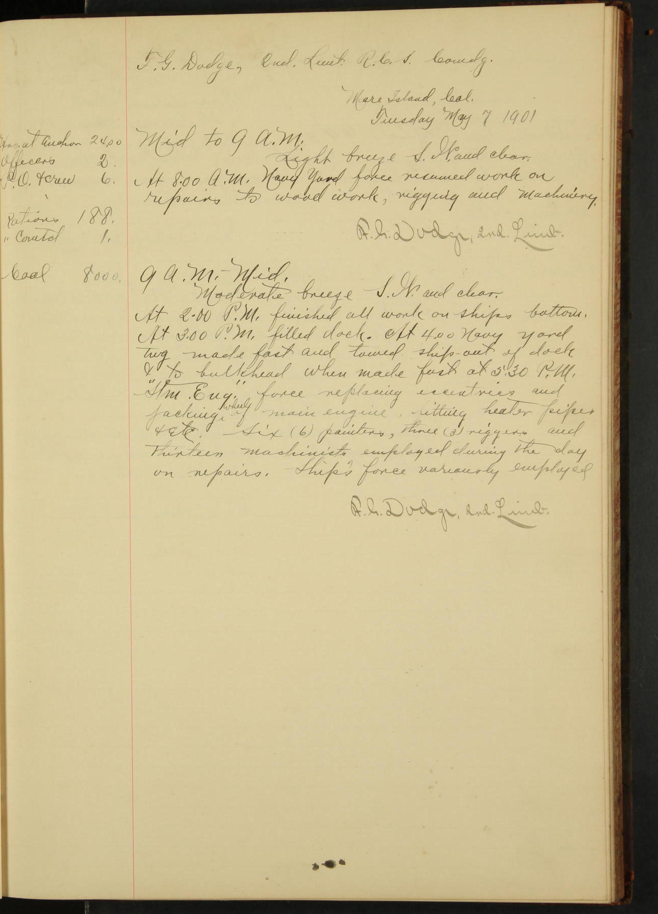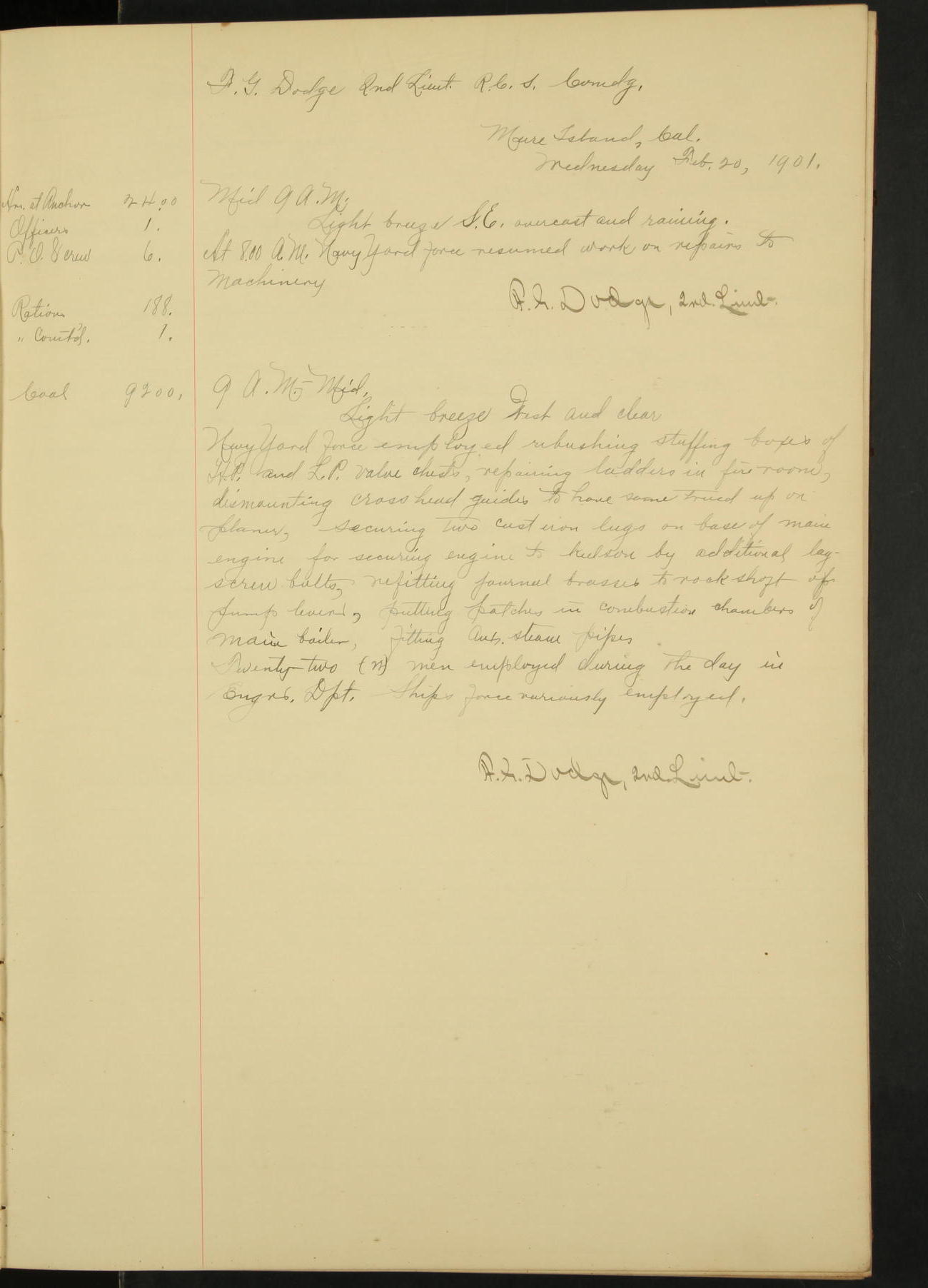 At 1.00 Navy Yard force commenced work on repairs of machinery.