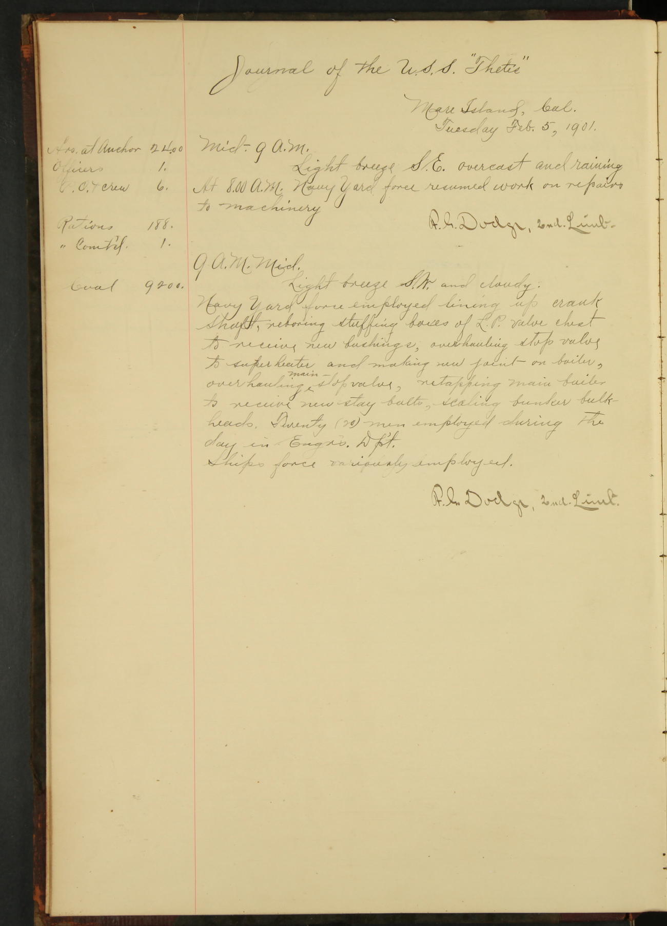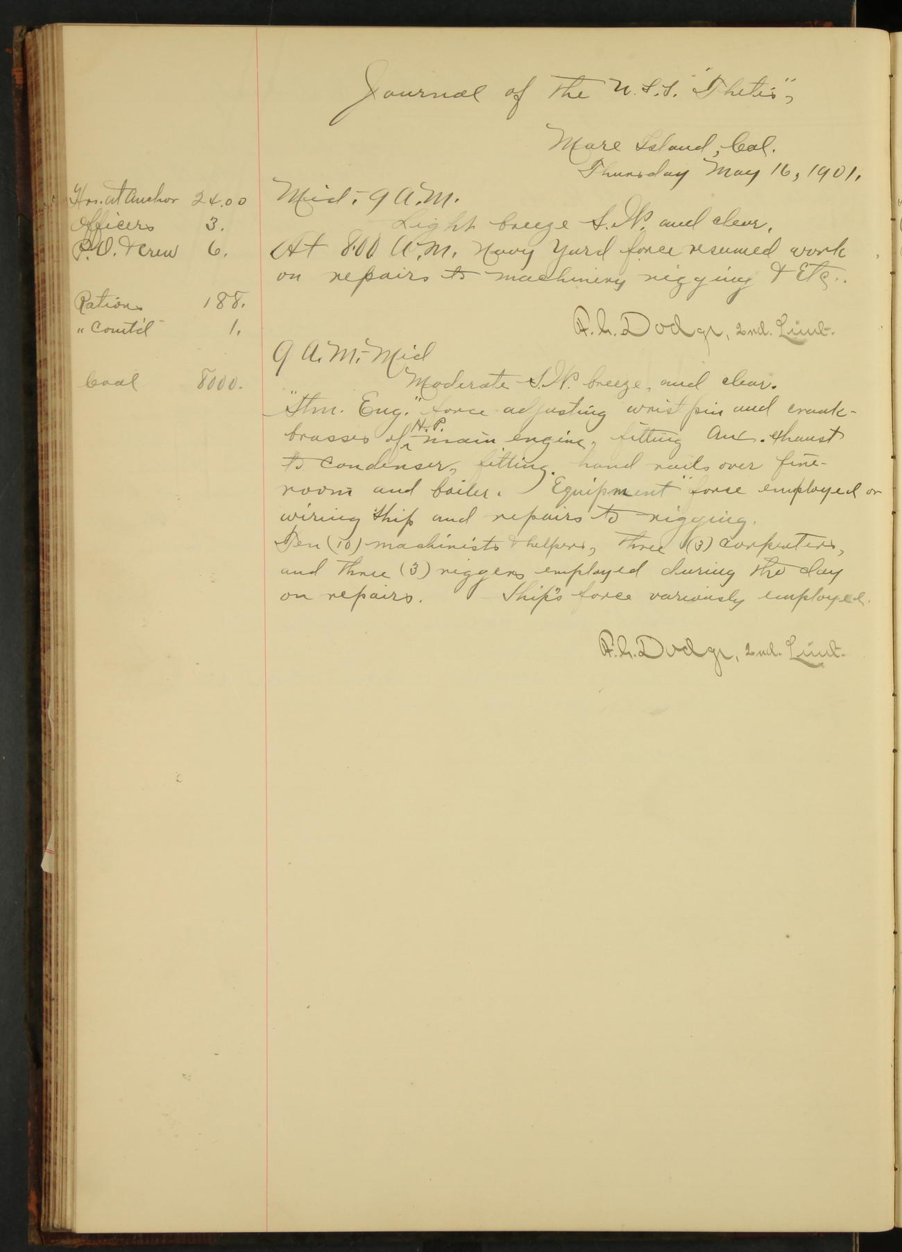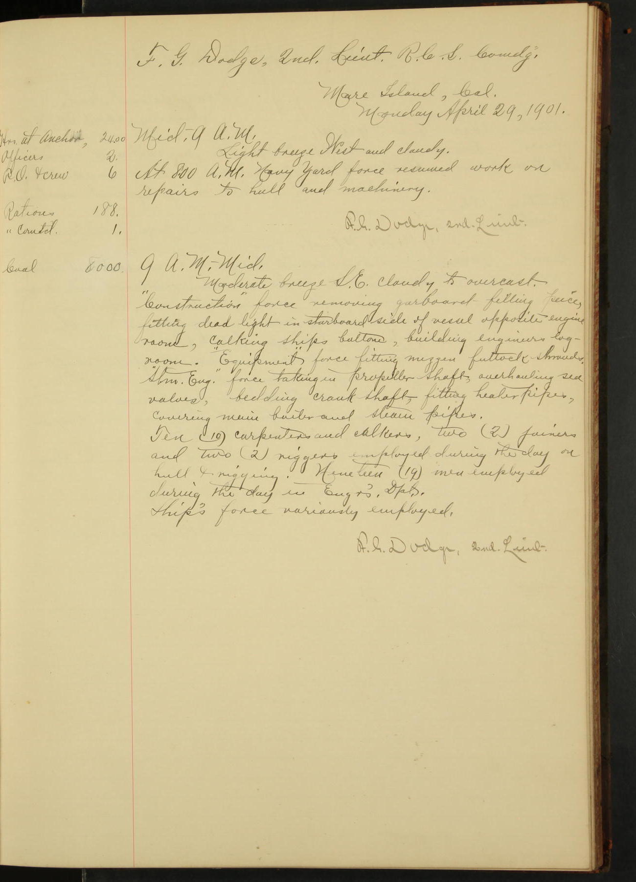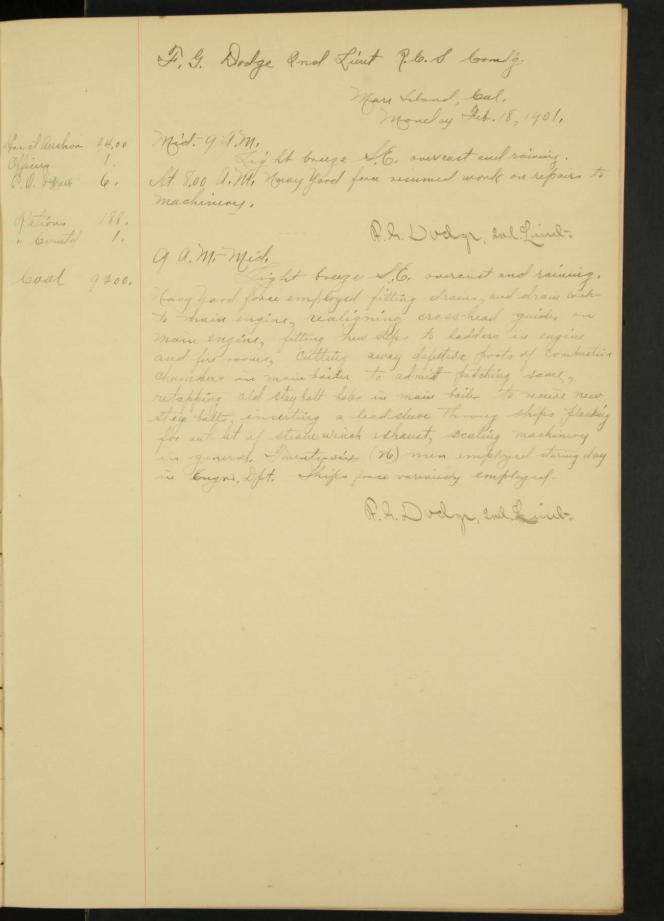 At 1.00 Navy Yard force commenced work on repairs of machinery.