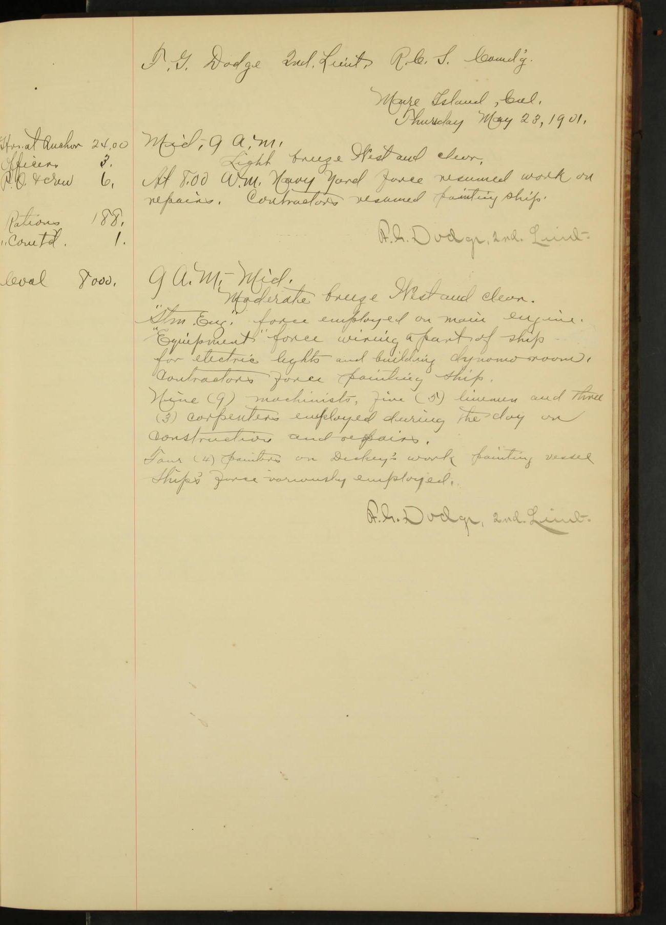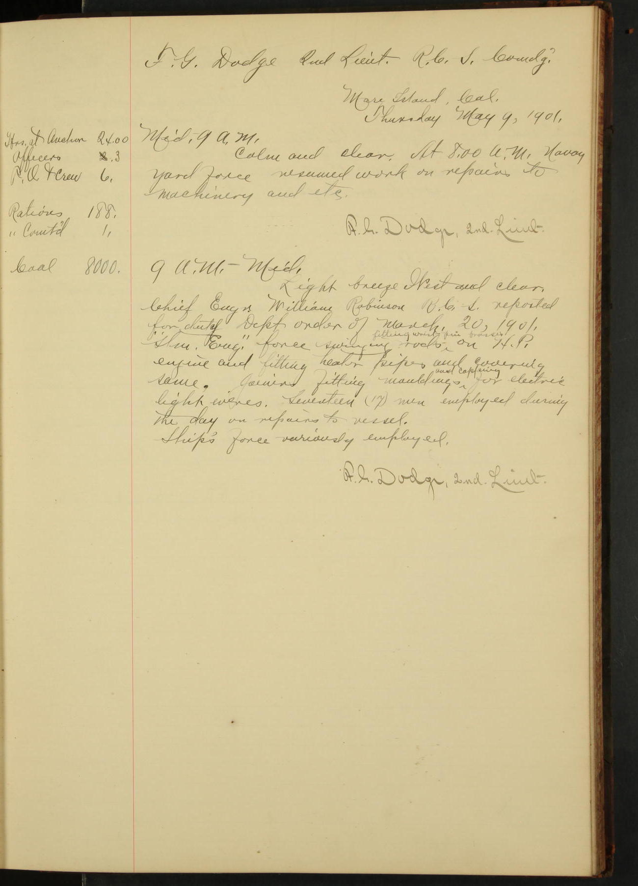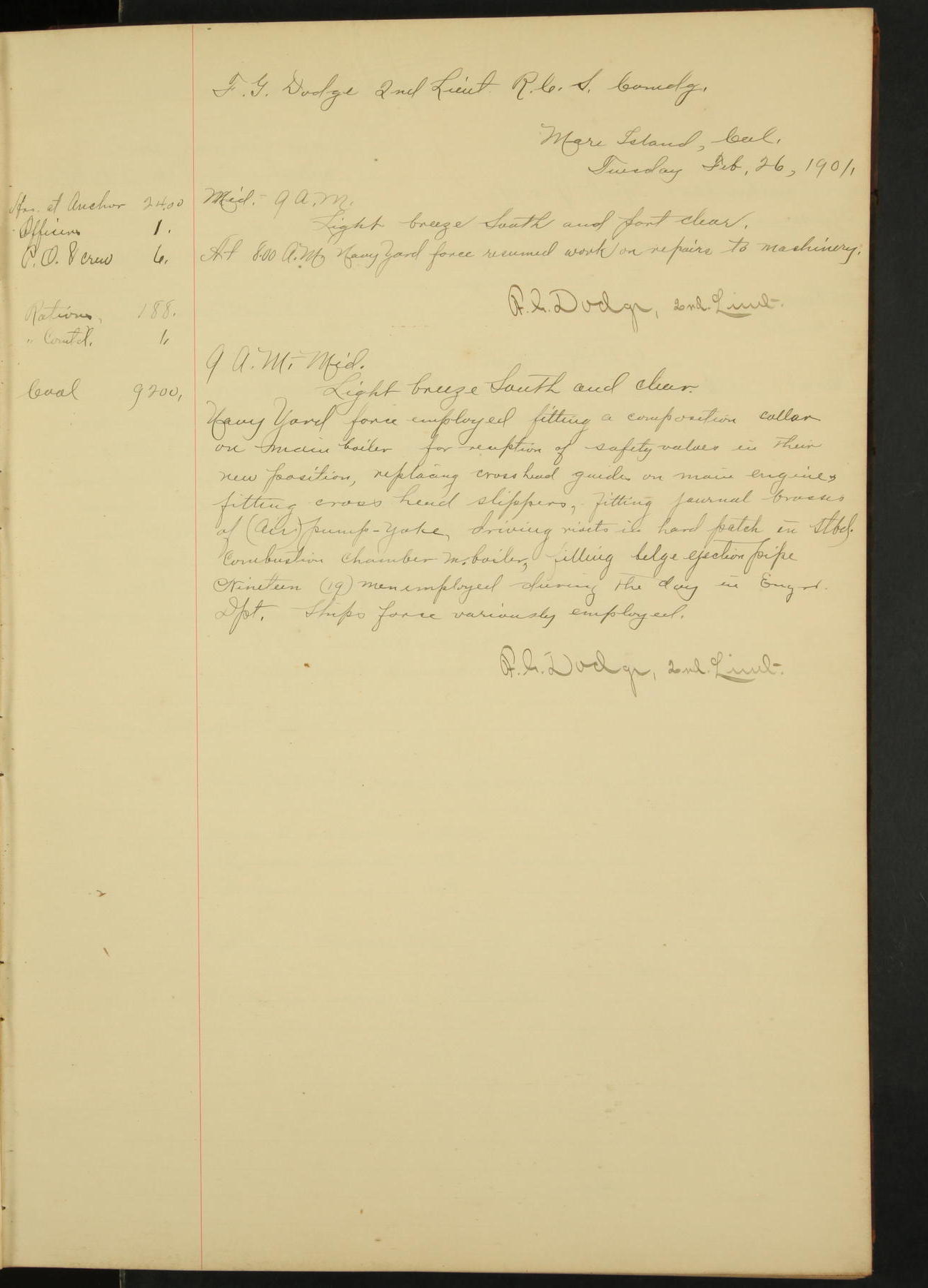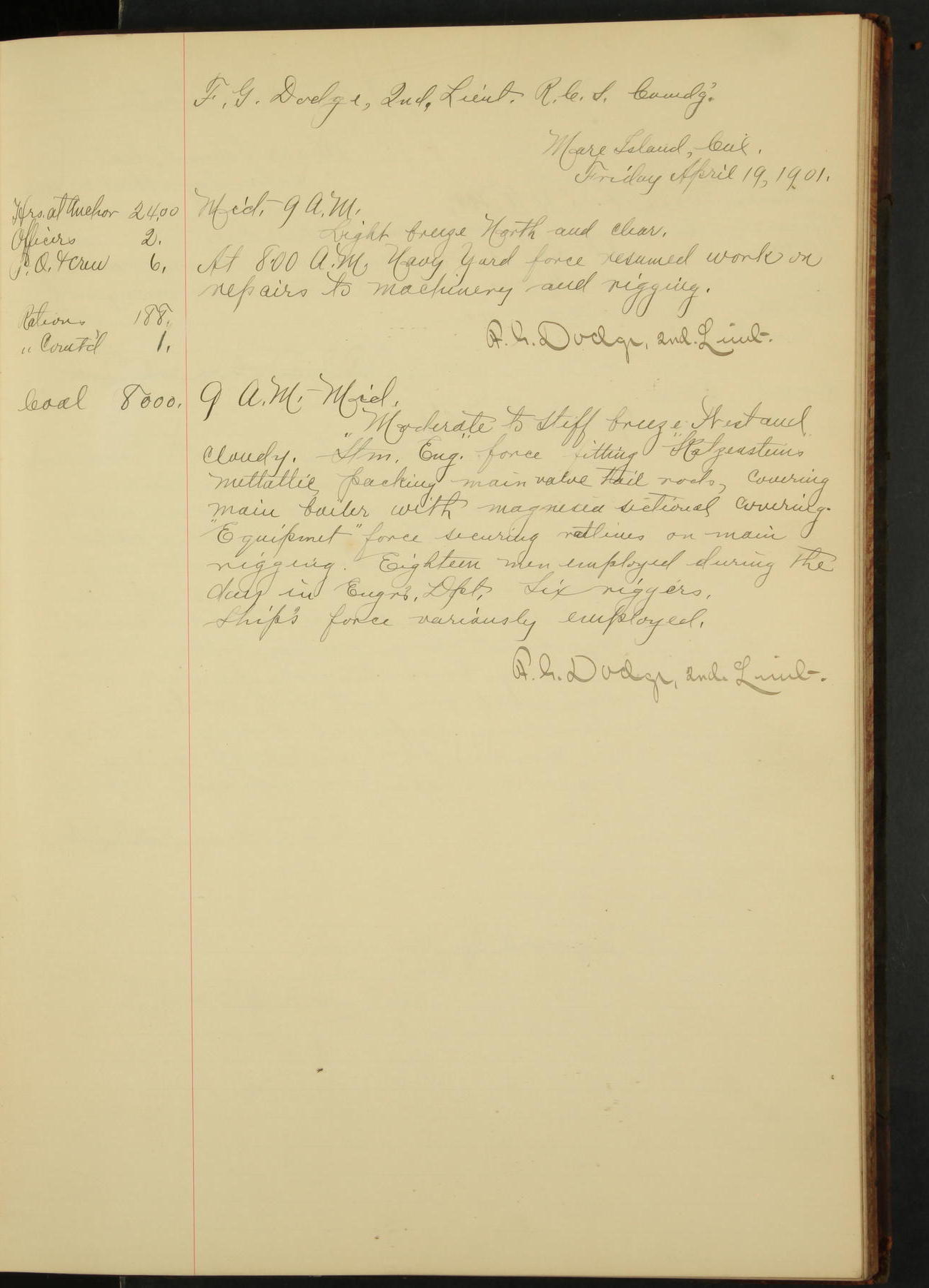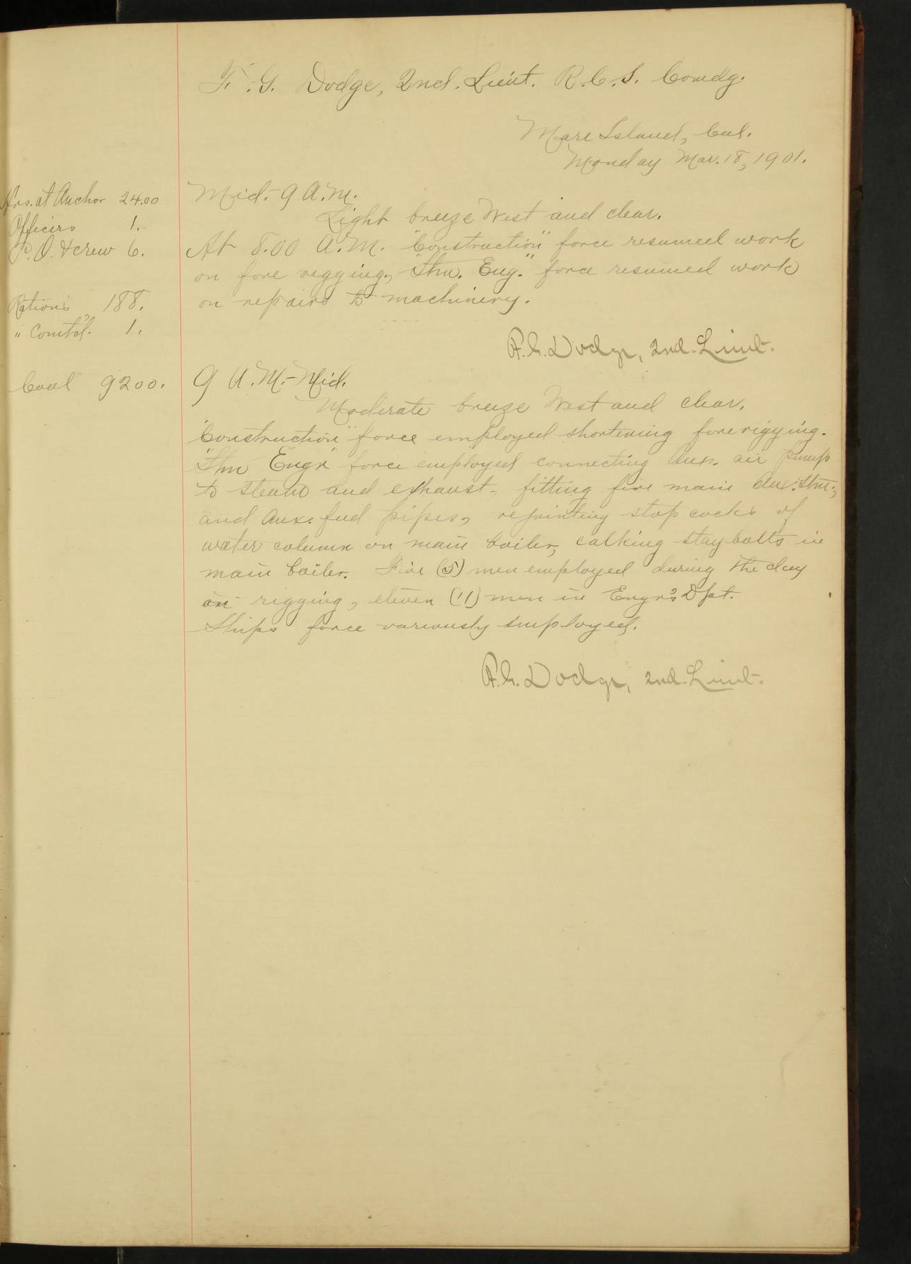 At 1.00 Navy Yard force commenced work on repairs of machinery.