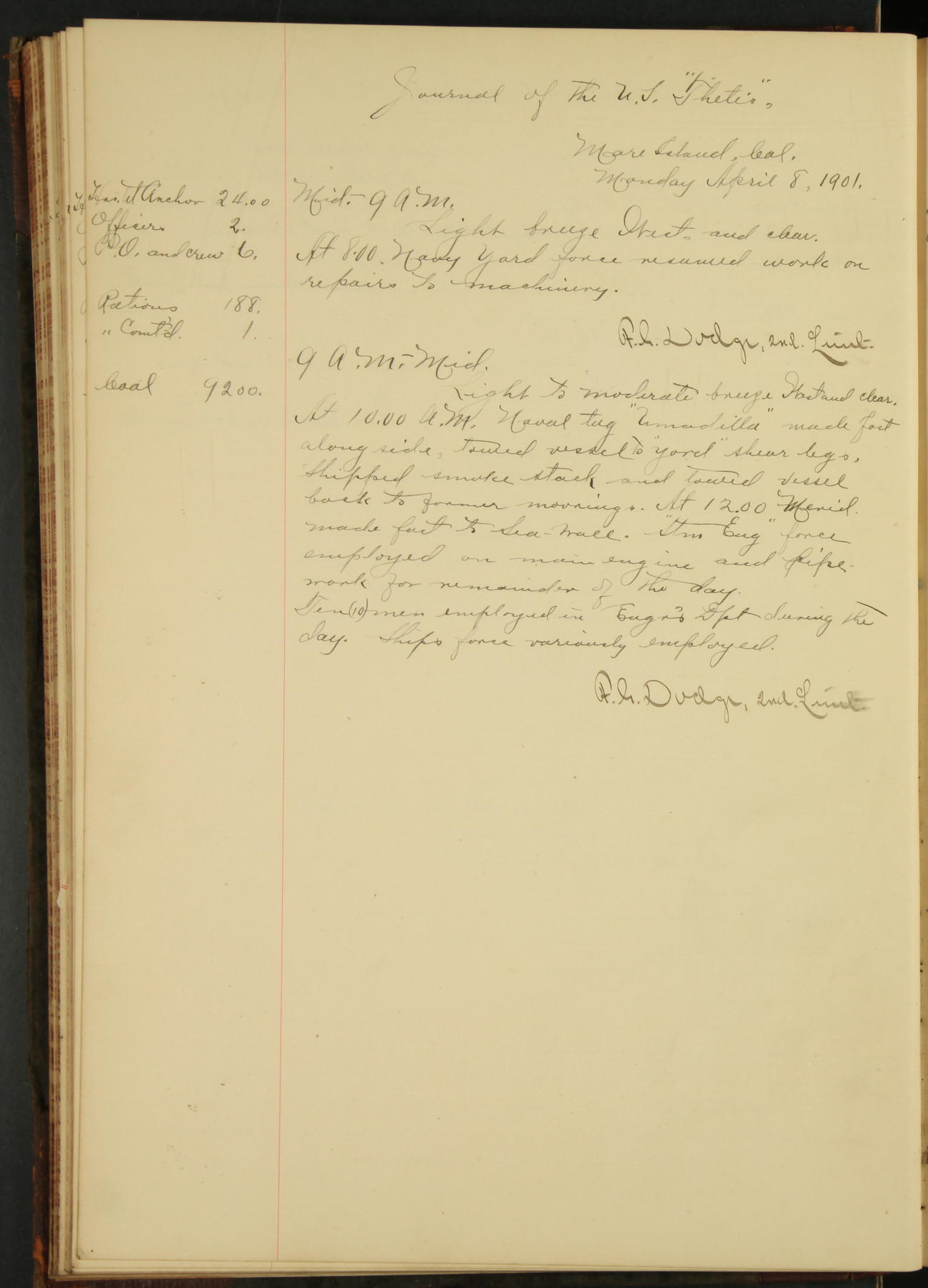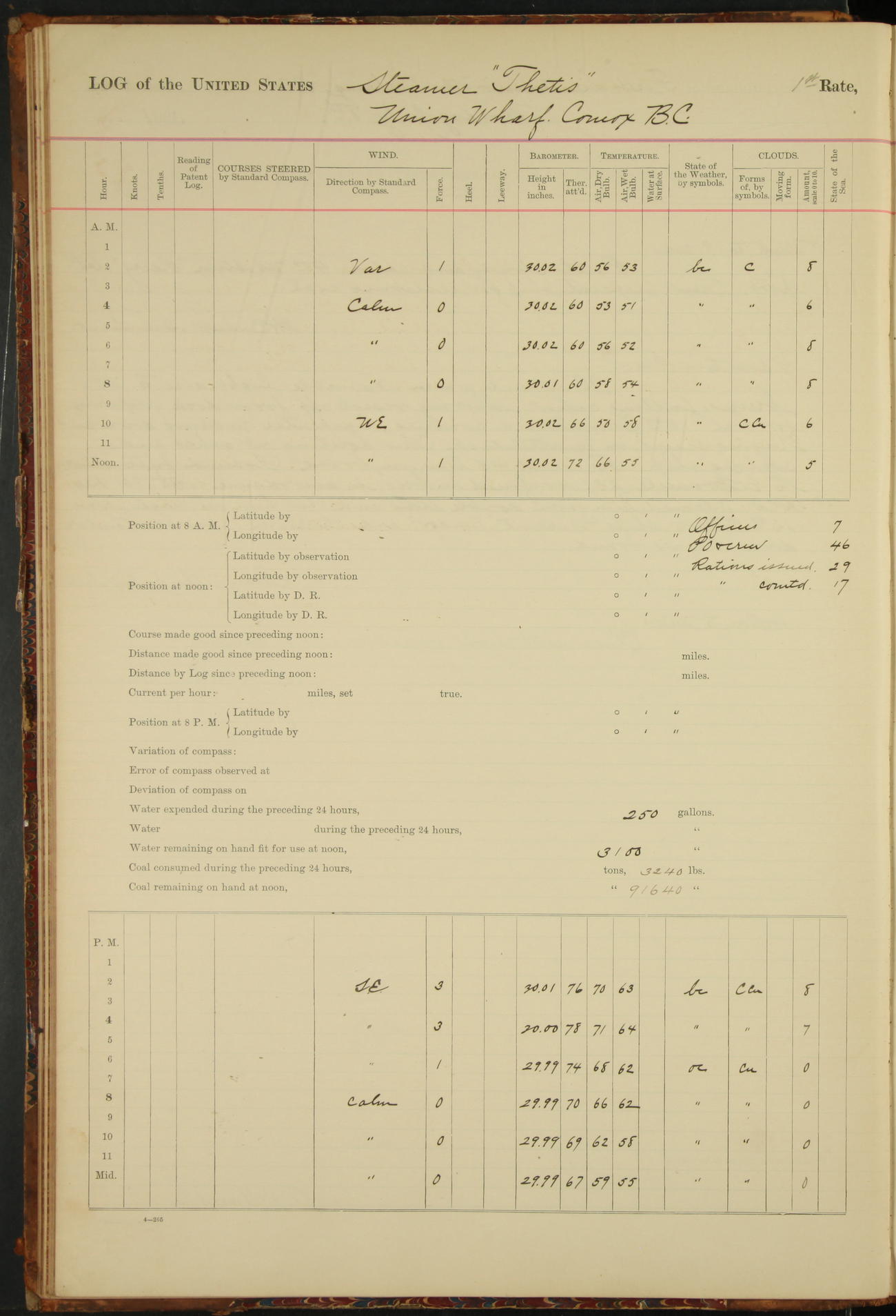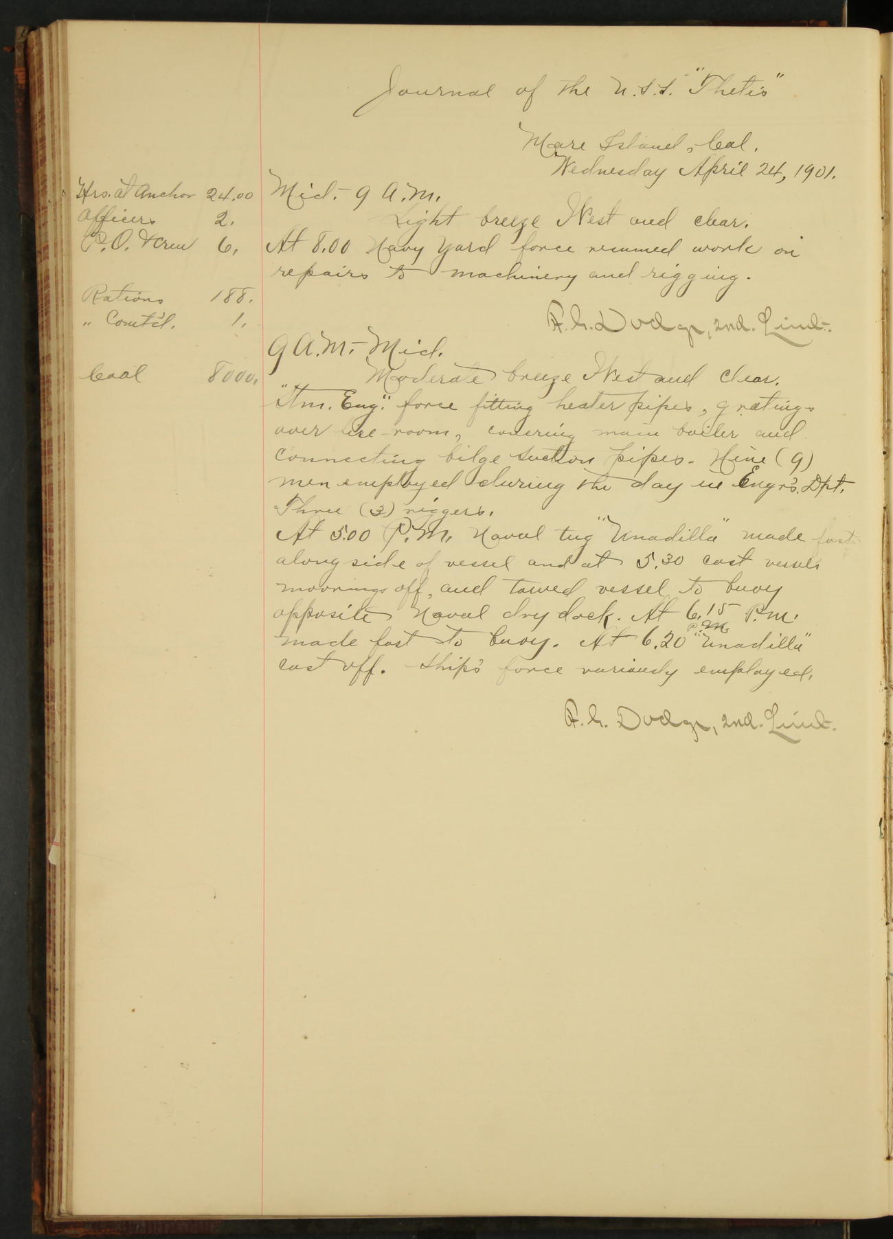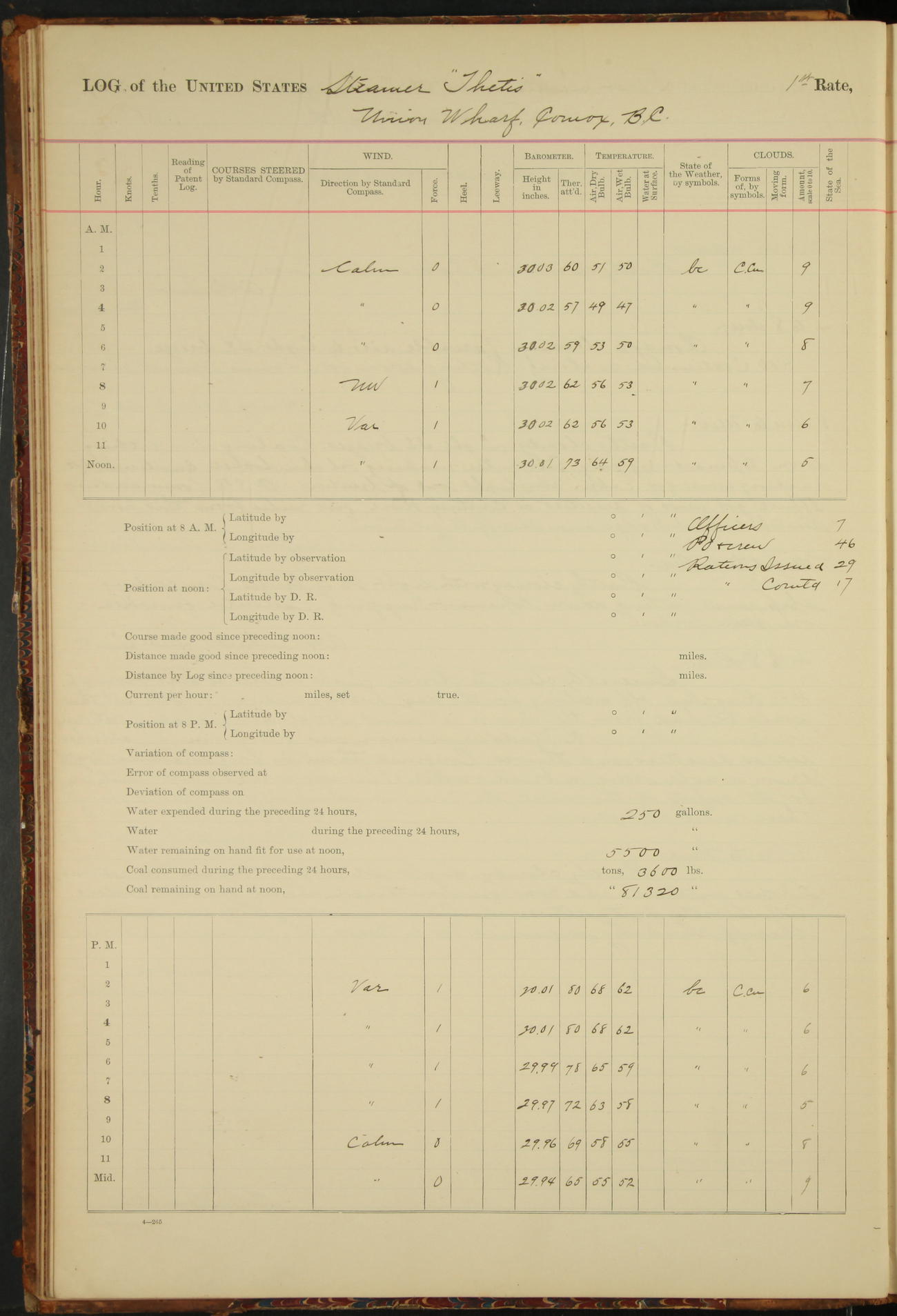 At 8.15 US Revenue Steamer “Golden Gate” made fast alongside and at 8.30 [Thetis] cast off from wharf and proceeded under tow en route to Mare Island Navy Yard.