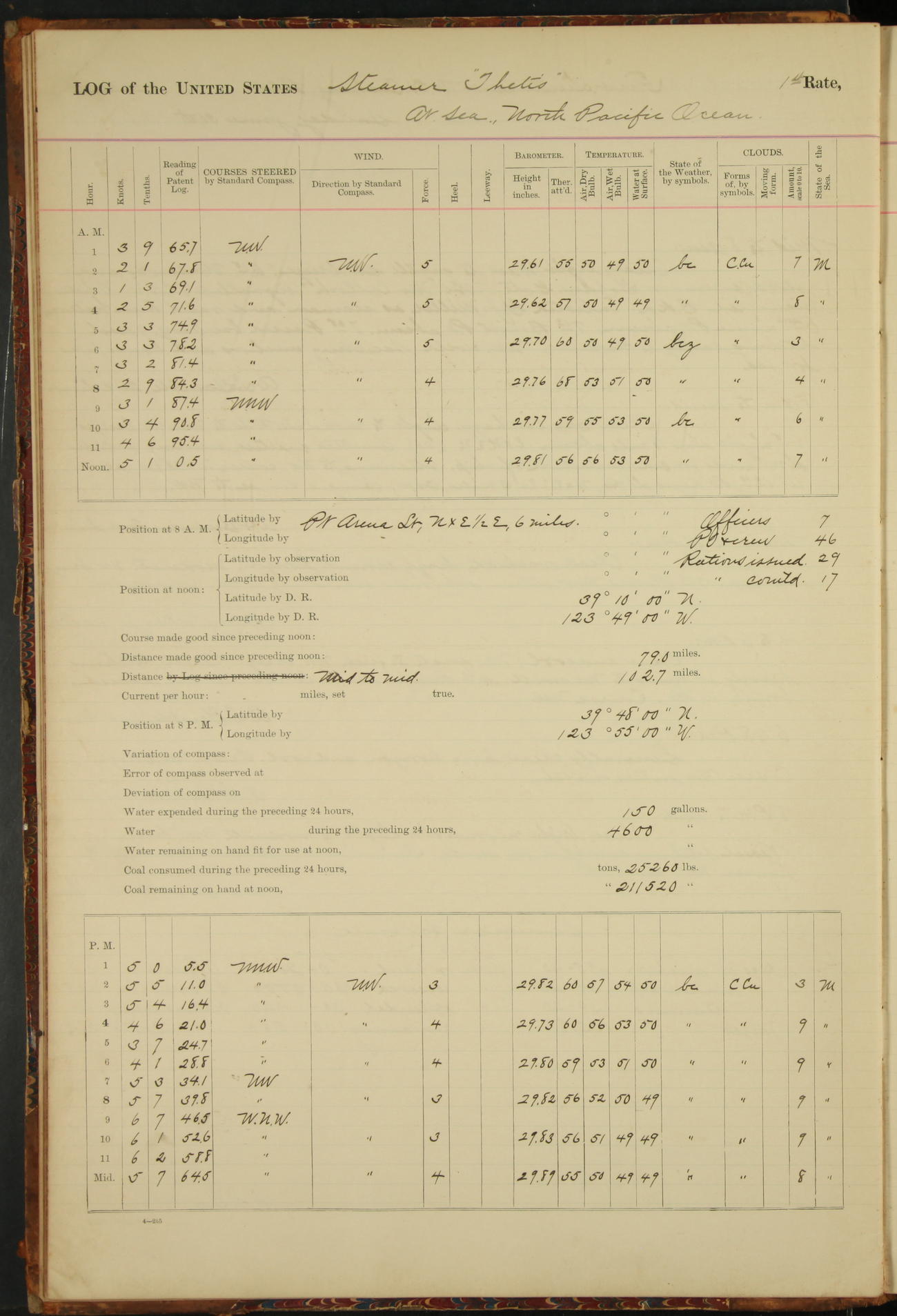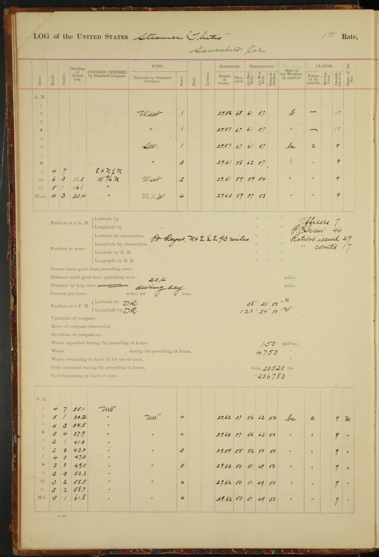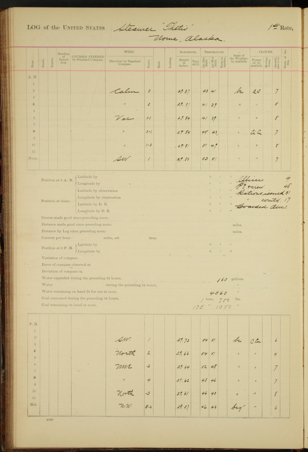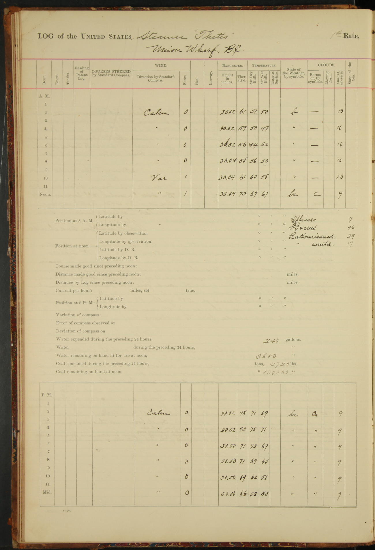 At 8.15 US Revenue Steamer “Golden Gate” made fast alongside and at 8.30 [Thetis] cast off from wharf and proceeded under tow en route to Mare Island Navy Yard.
