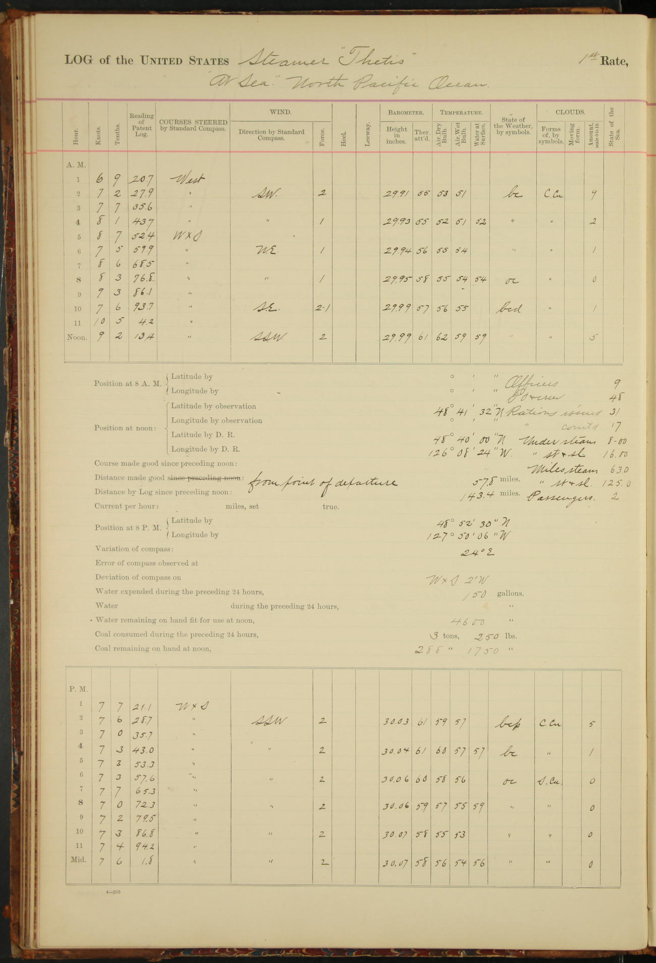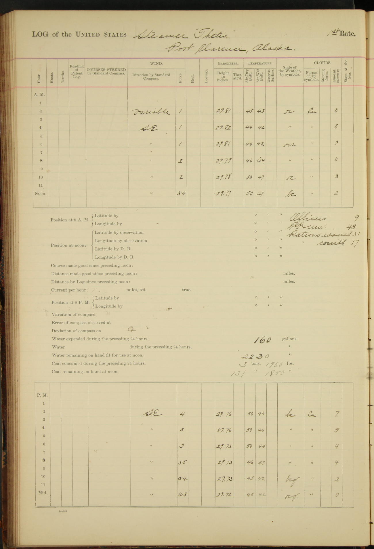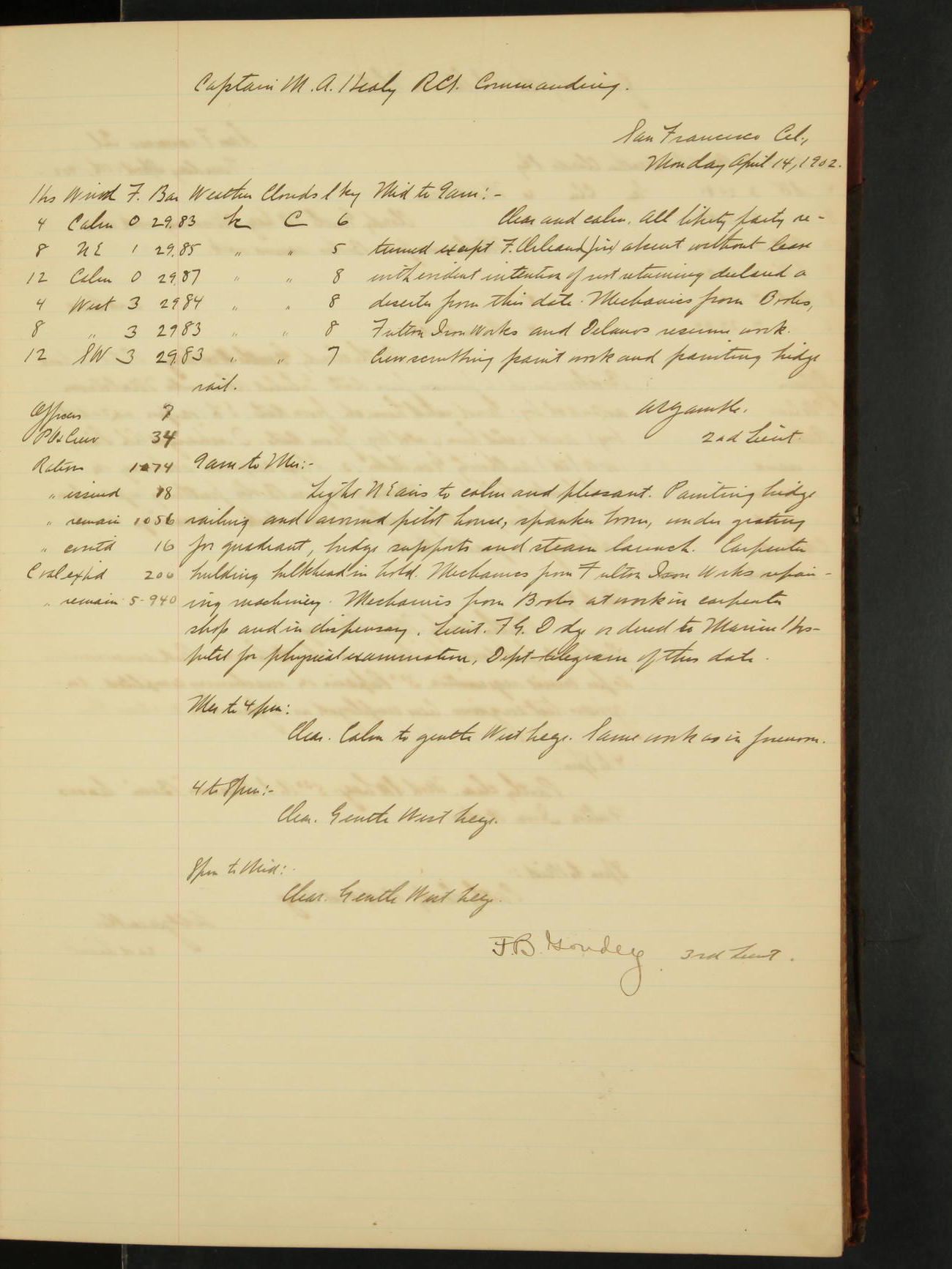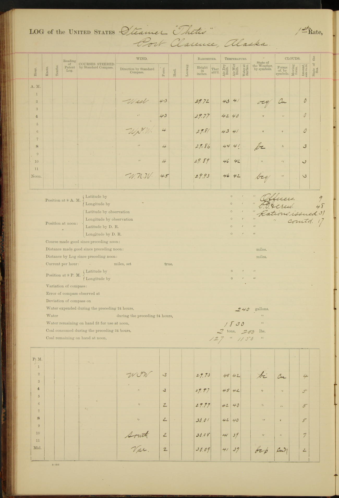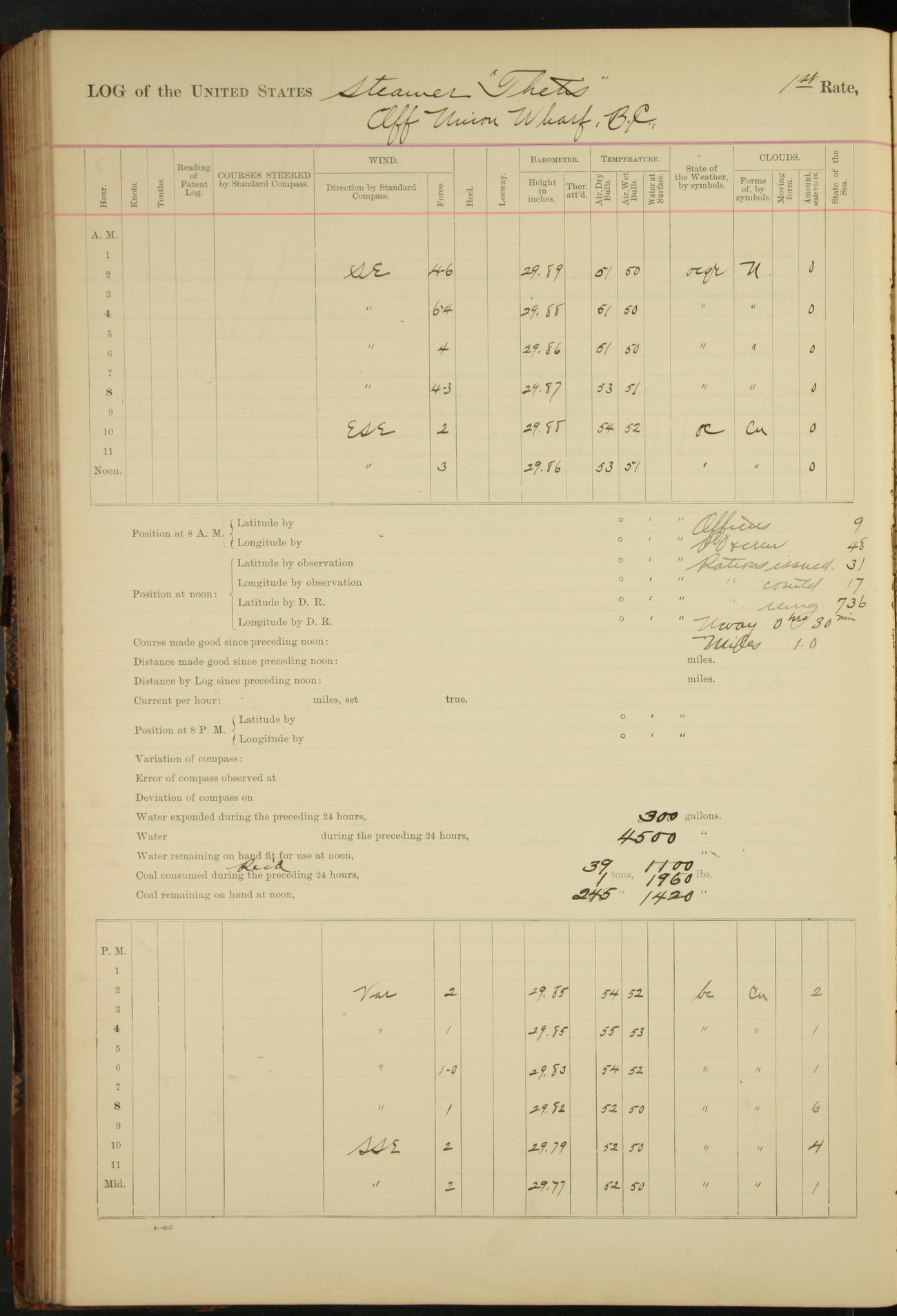 At 8.15 US Revenue Steamer “Golden Gate” made fast alongside and at 8.30 [Thetis] cast off from wharf and proceeded under tow en route to Mare Island Navy Yard.