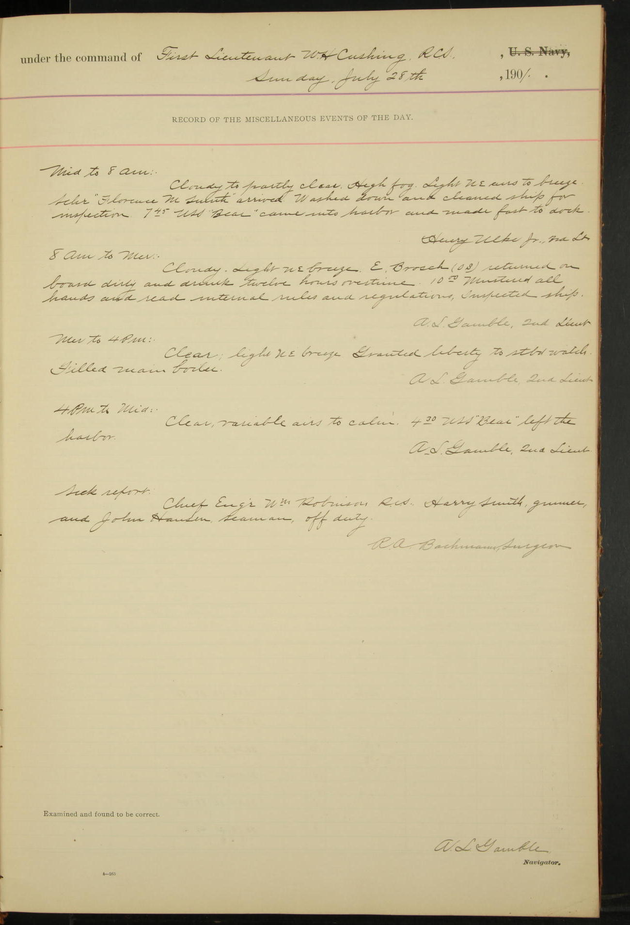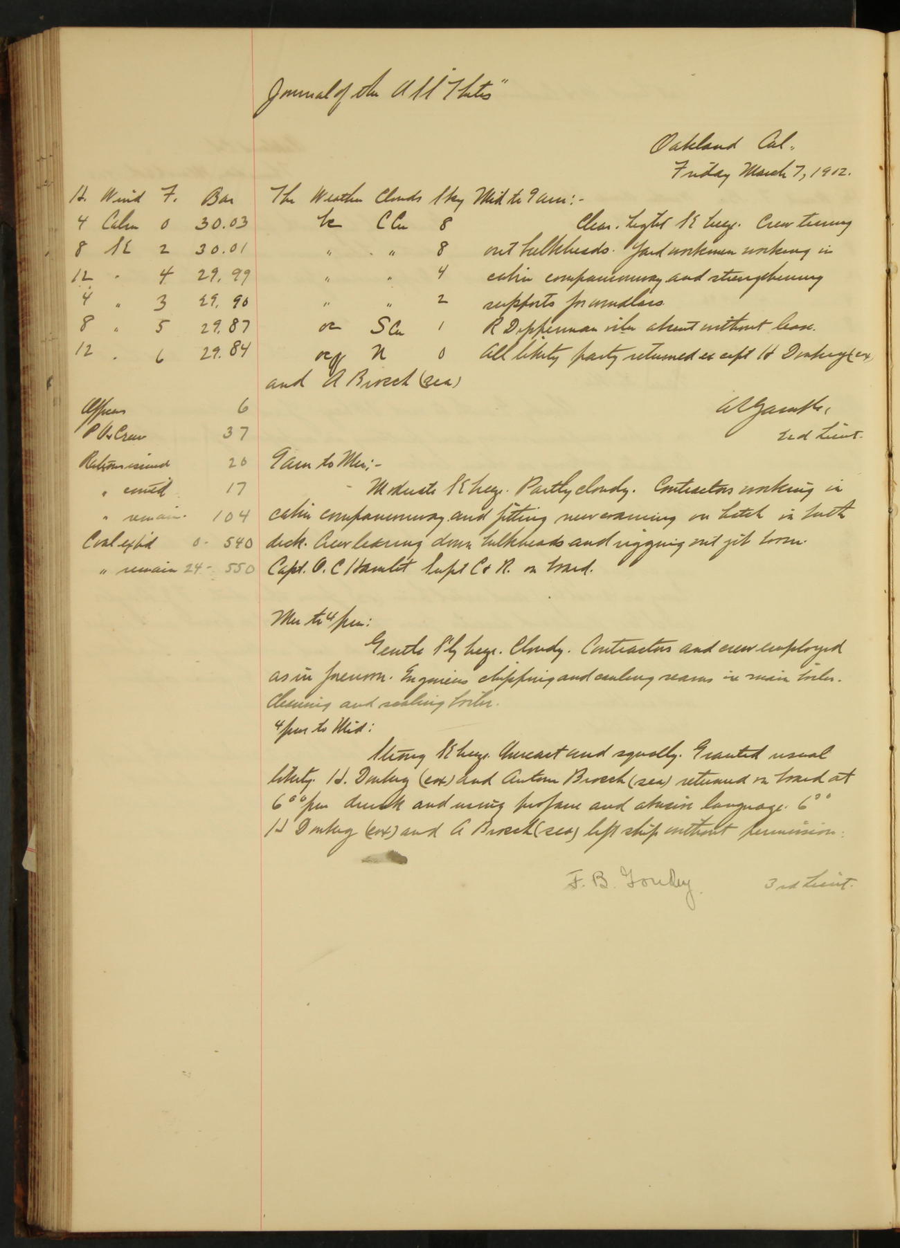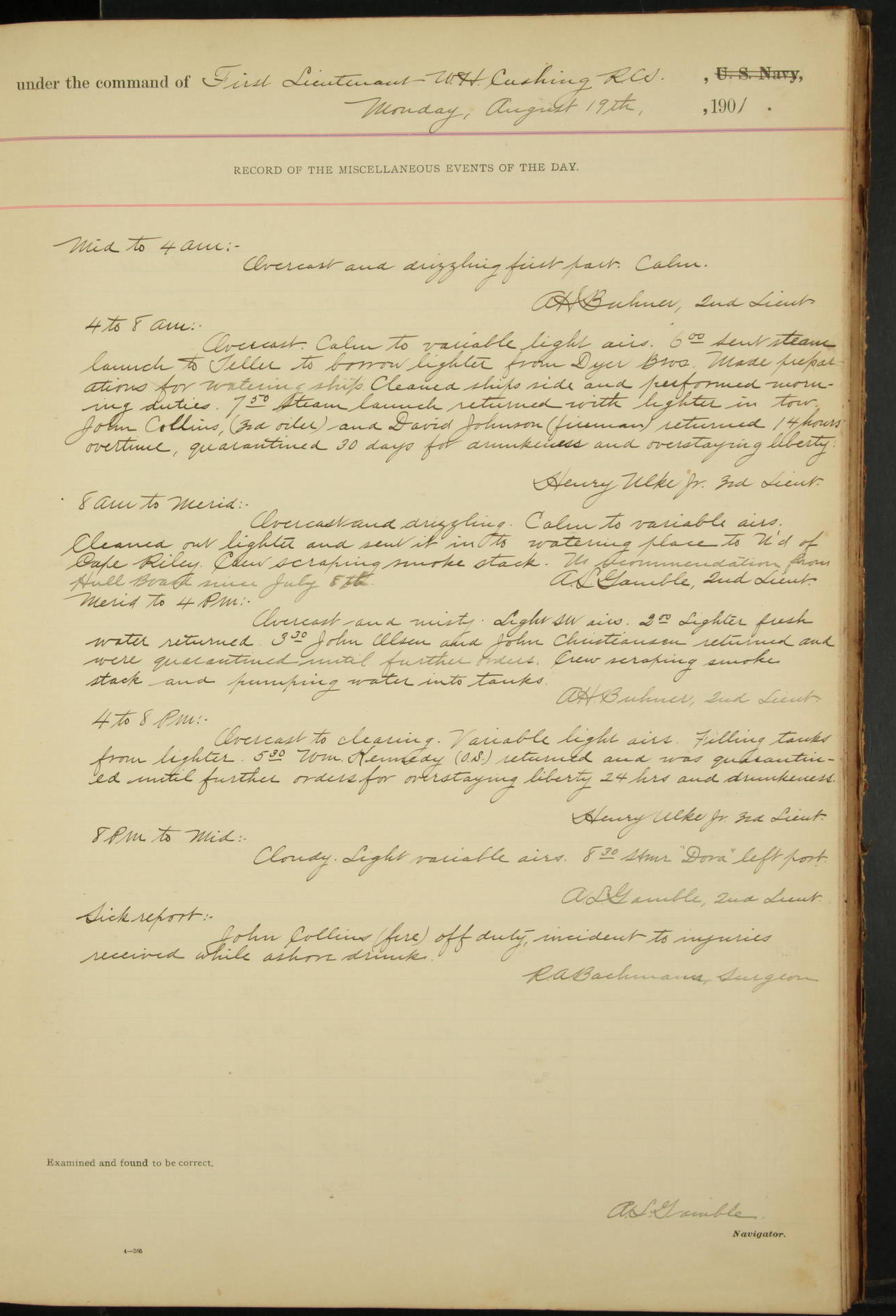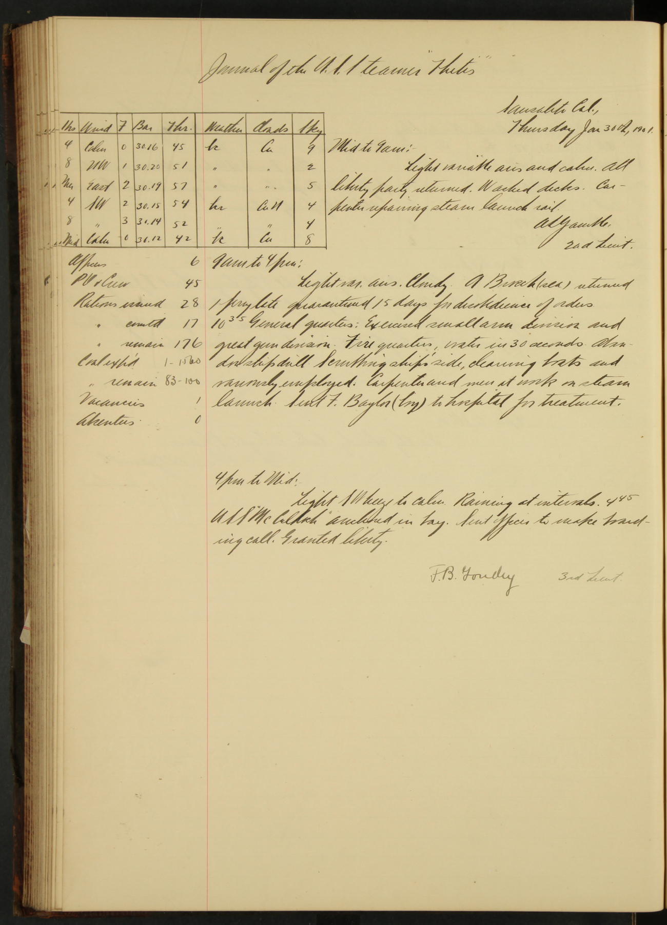 7.30: liberty party returned except Oscar Larsen (Seaman), Fred Jorgensen (Seaman), and C. Bock (Fireman), who were one boat late.