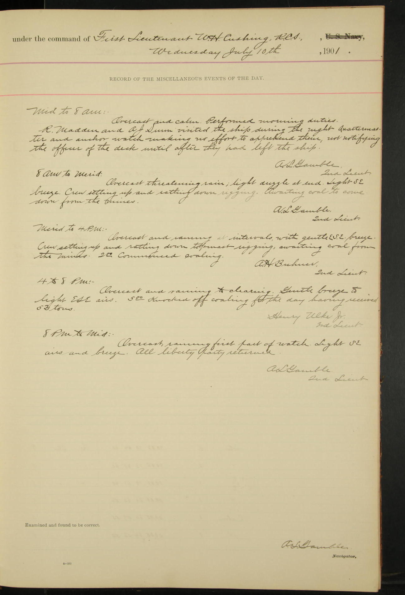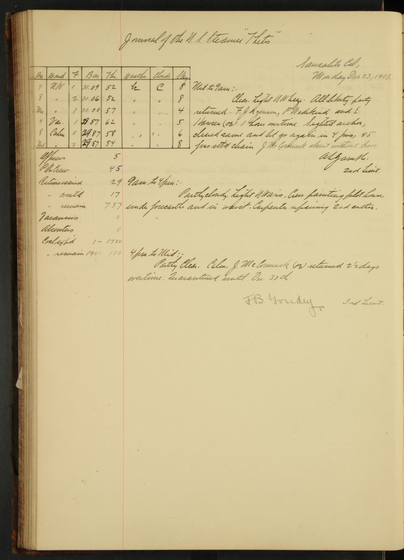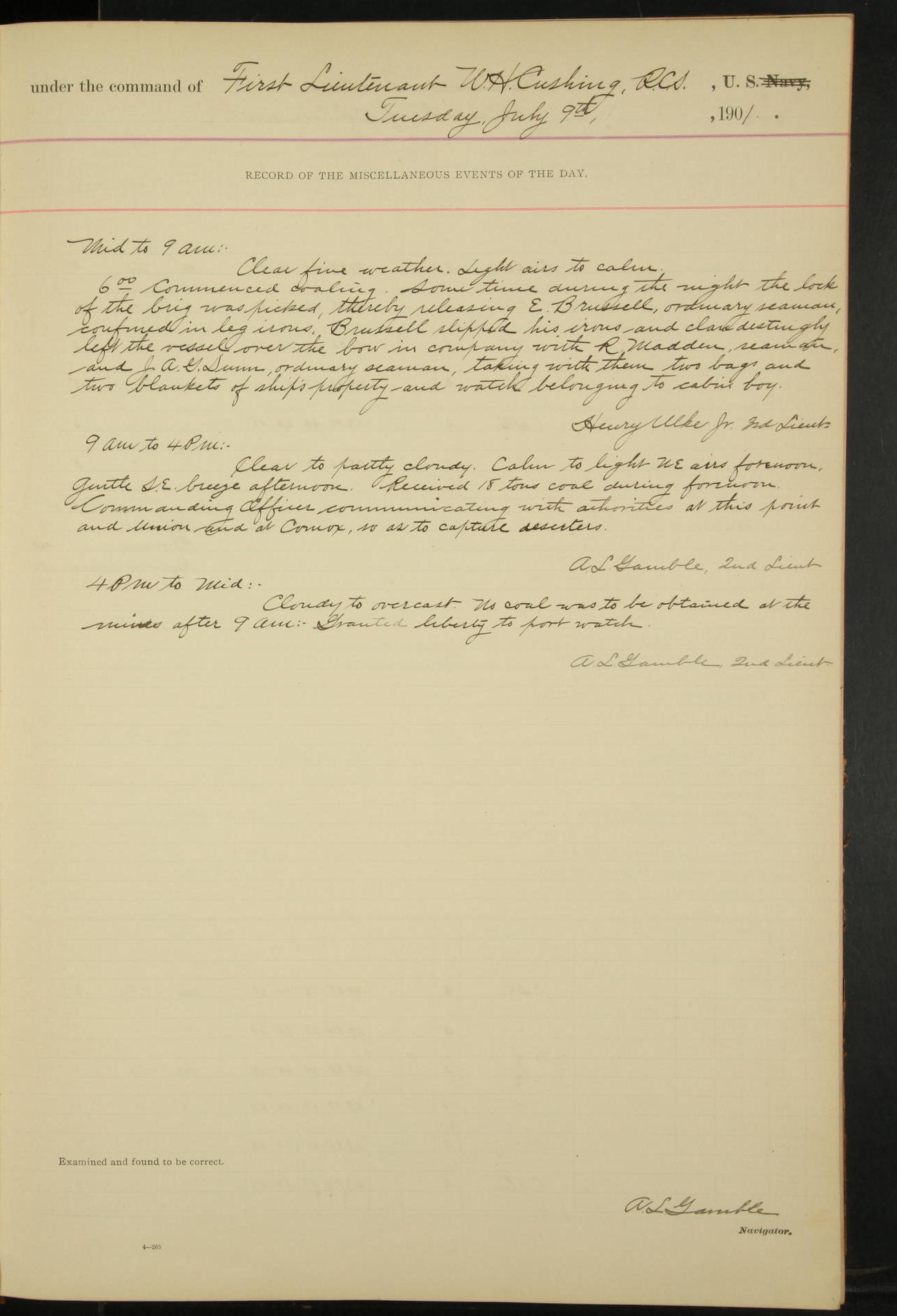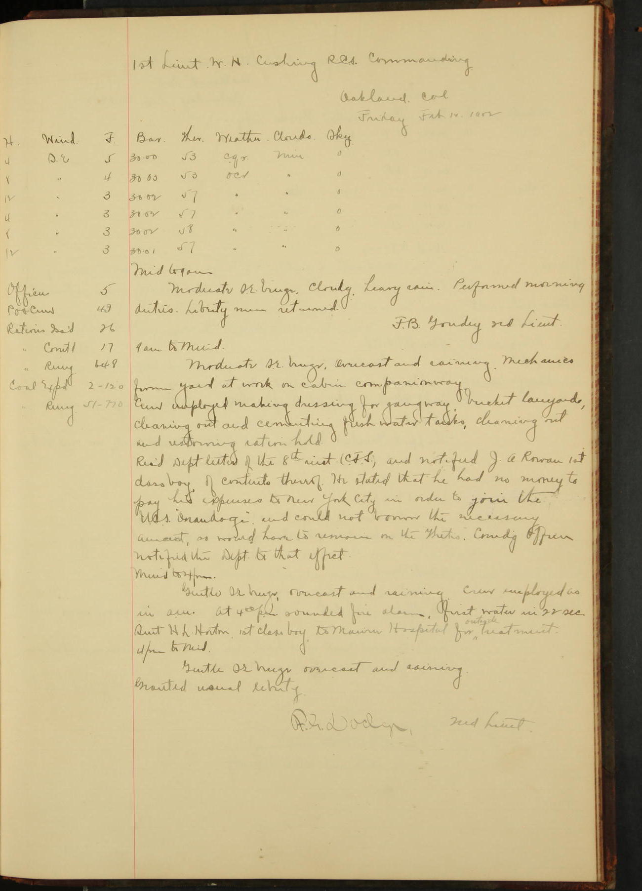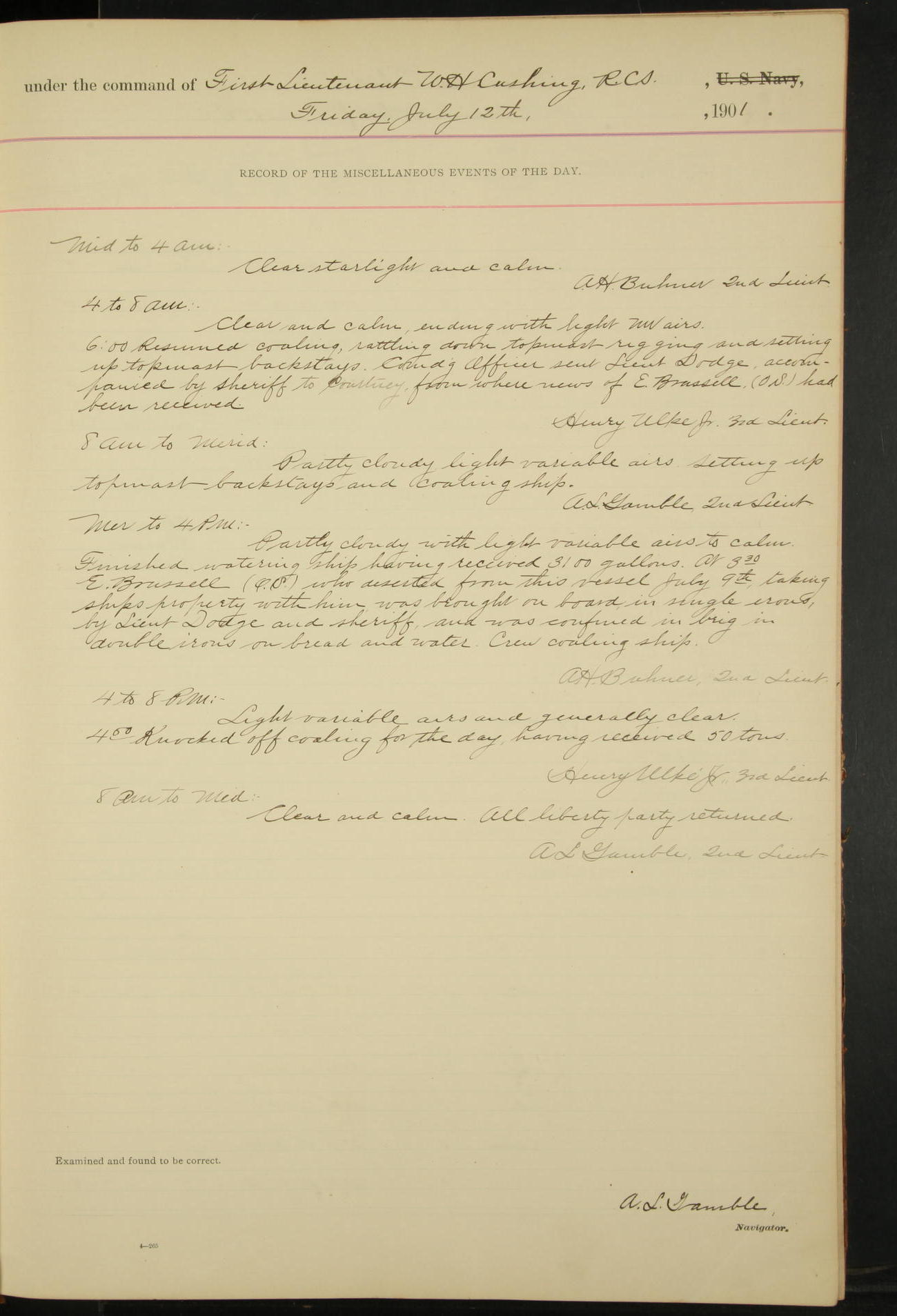 7.30: liberty party returned except Oscar Larsen (Seaman), Fred Jorgensen (Seaman), and C. Bock (Fireman), who were one boat late.