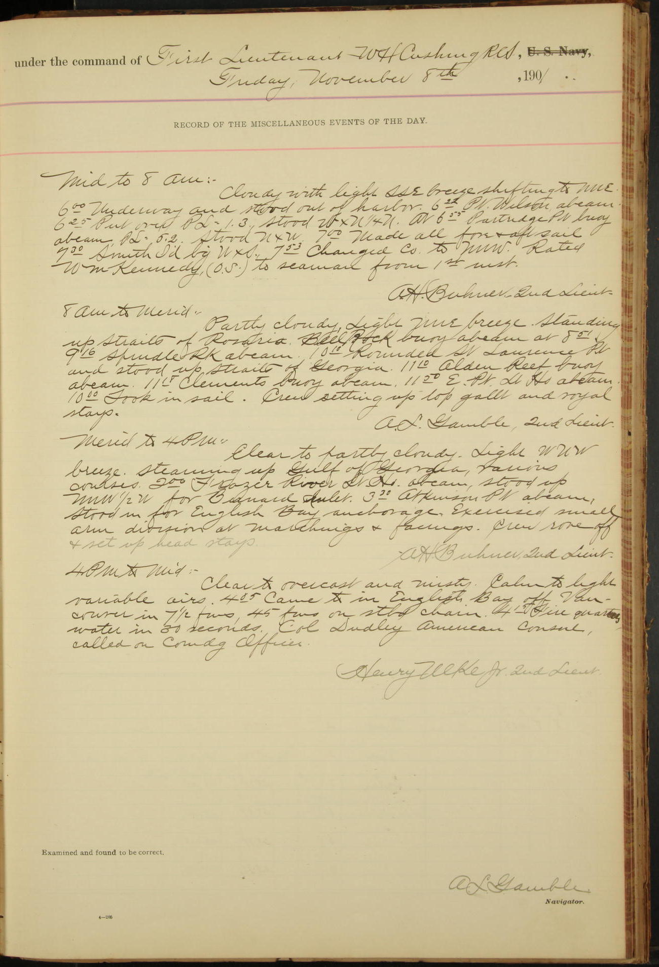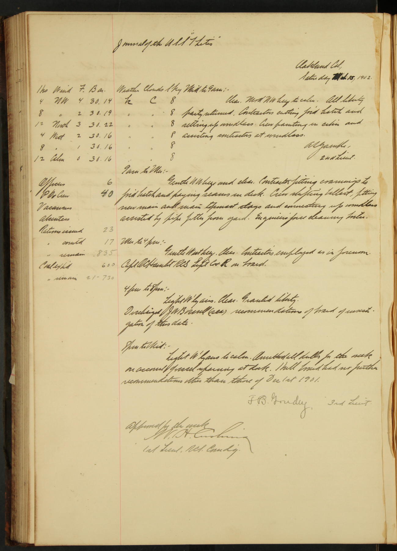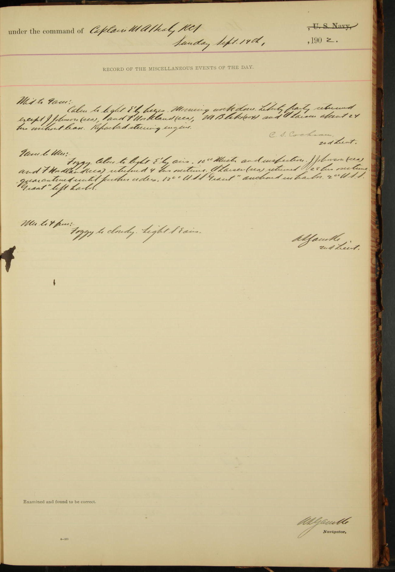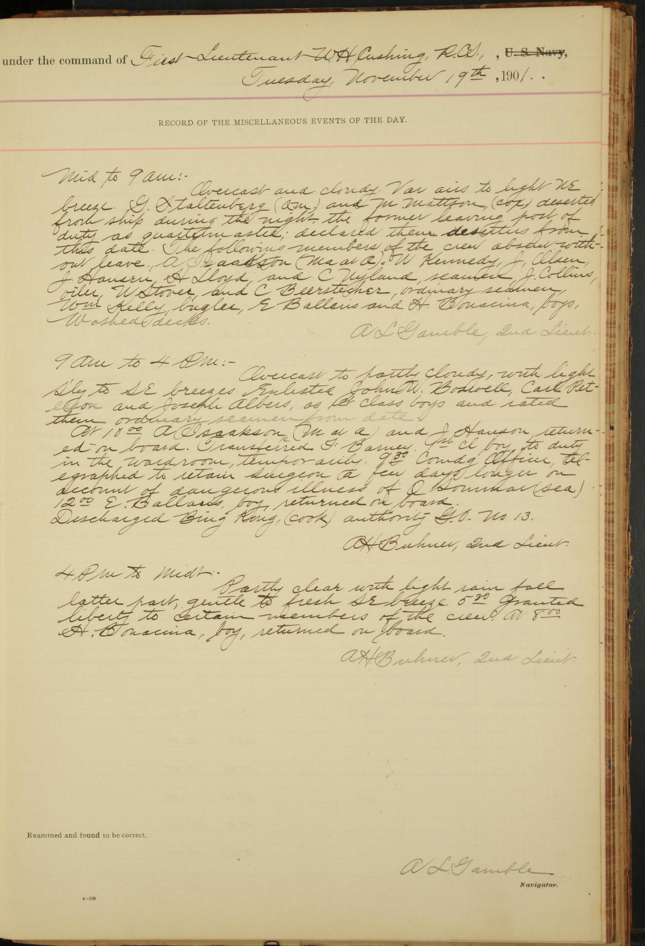 7.30: liberty party returned except Oscar Larsen (Seaman), Fred Jorgensen (Seaman), and C. Bock (Fireman), who were one boat late.