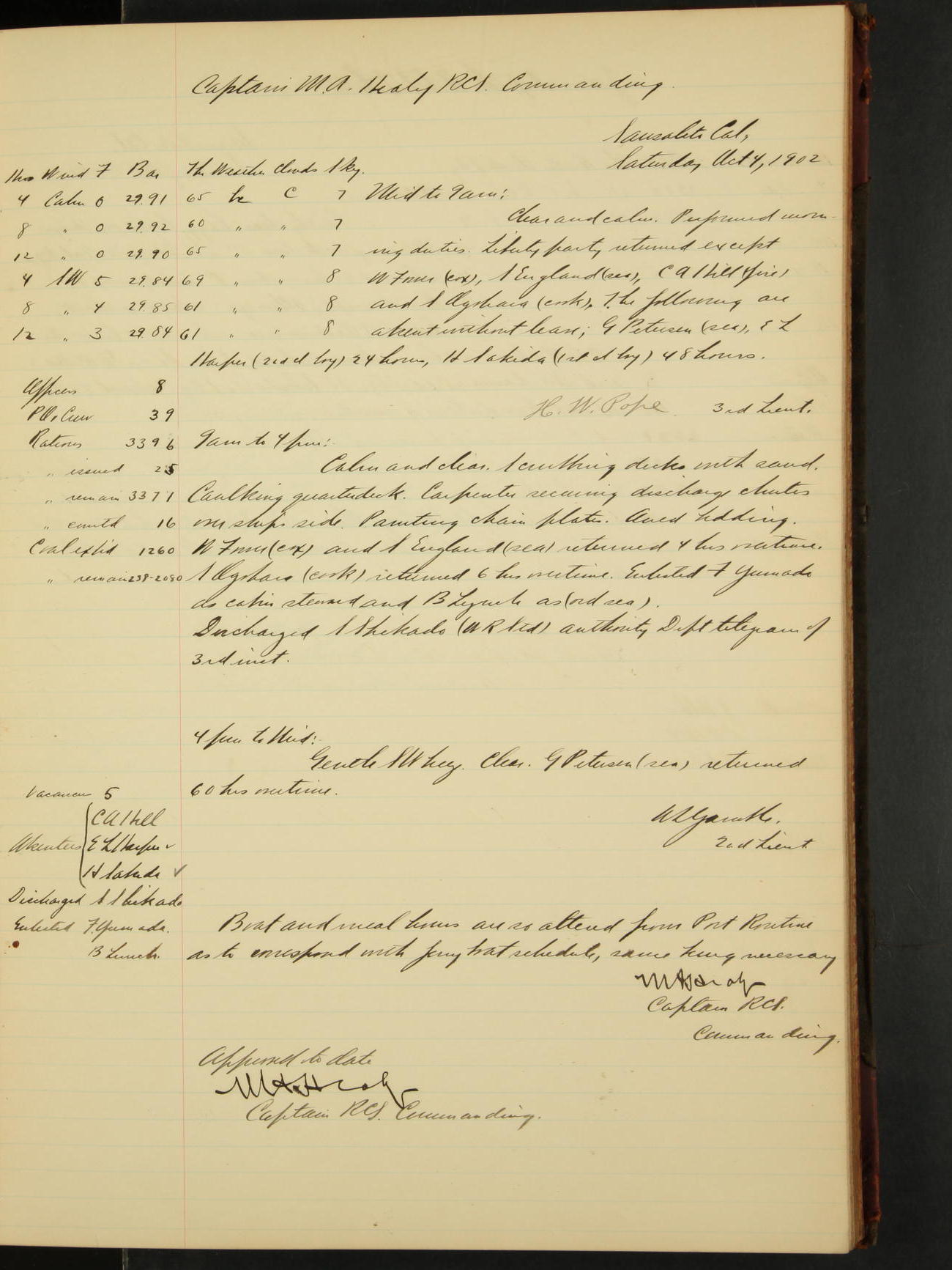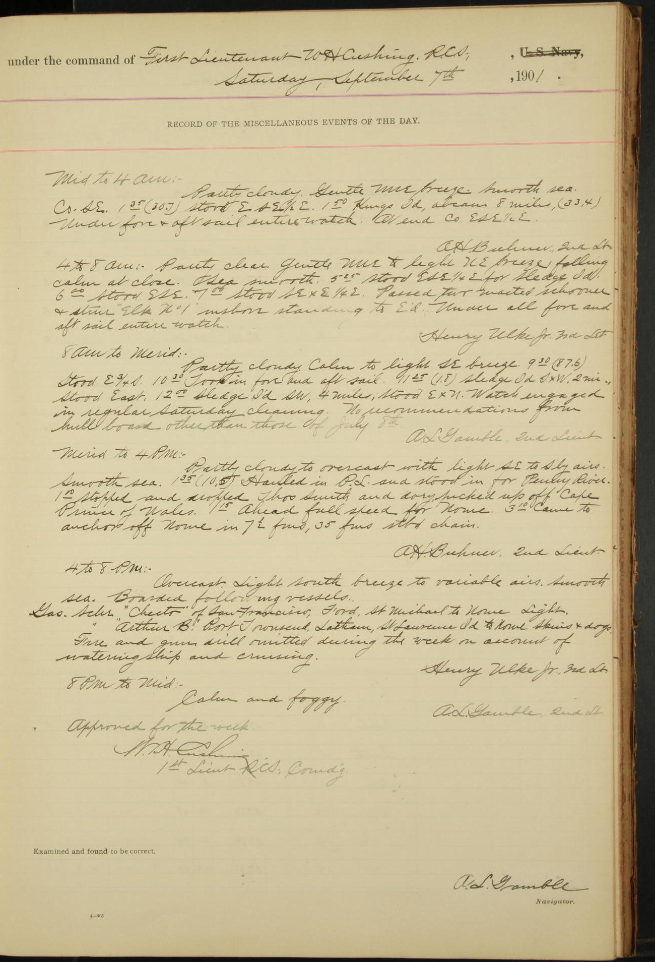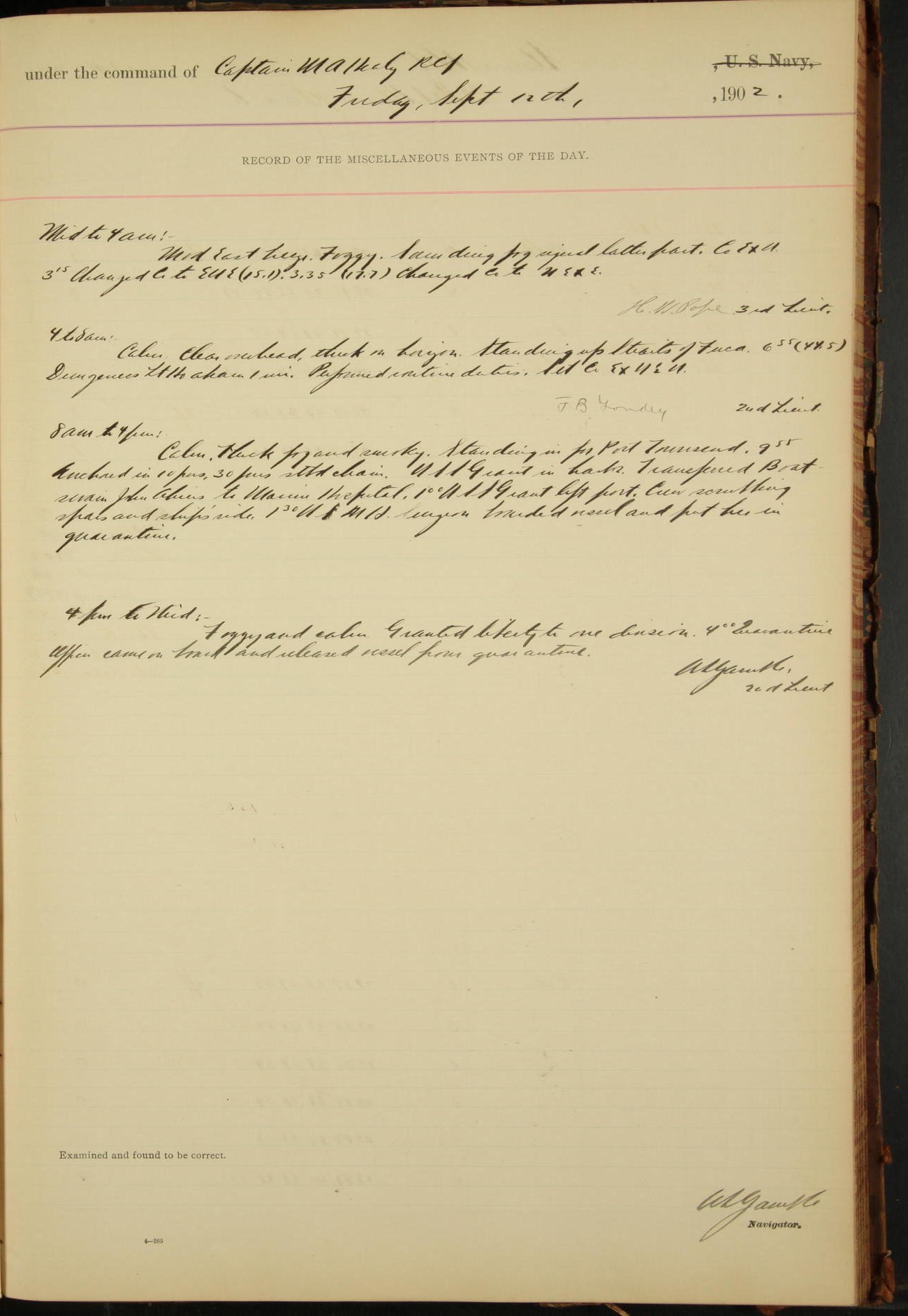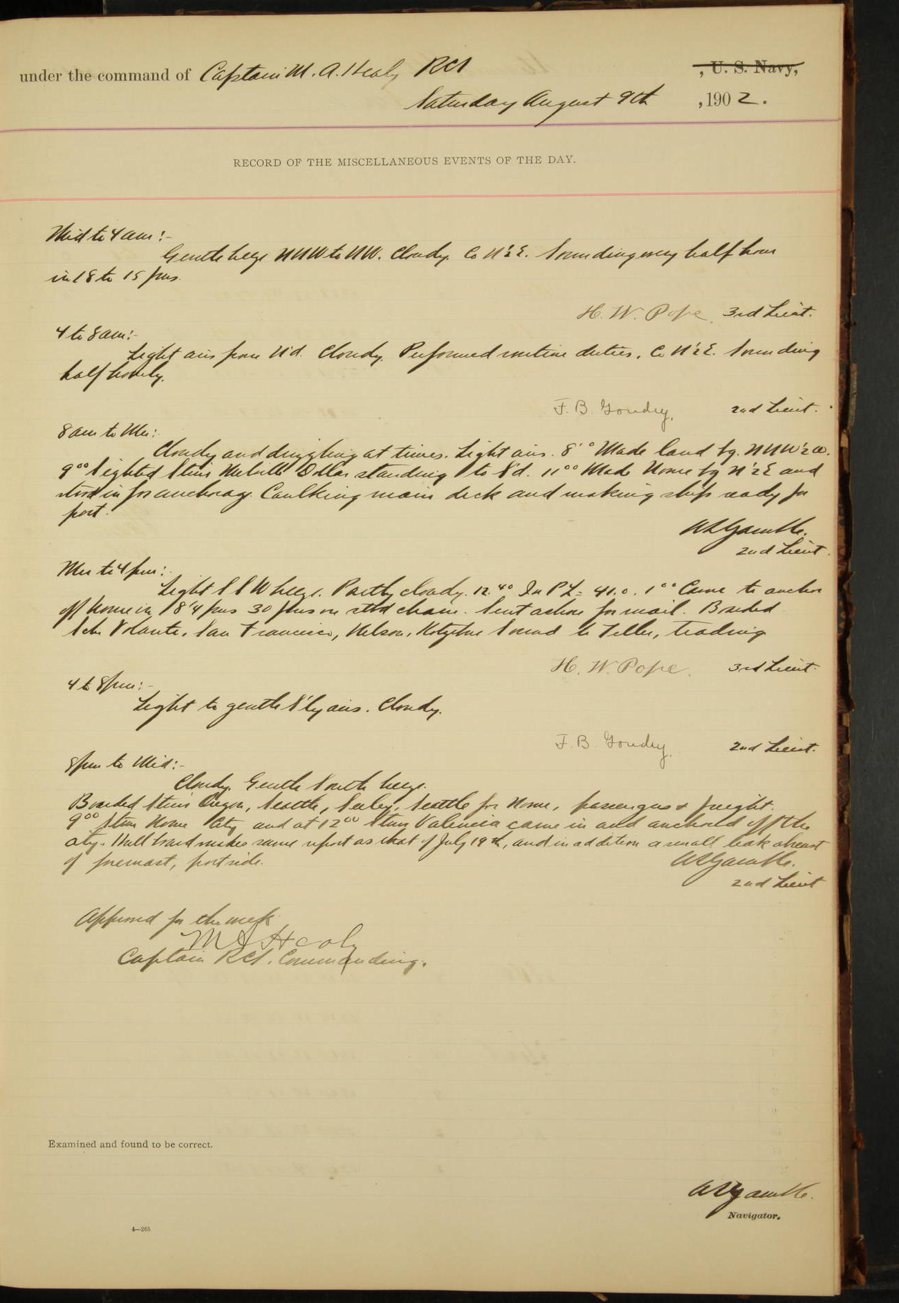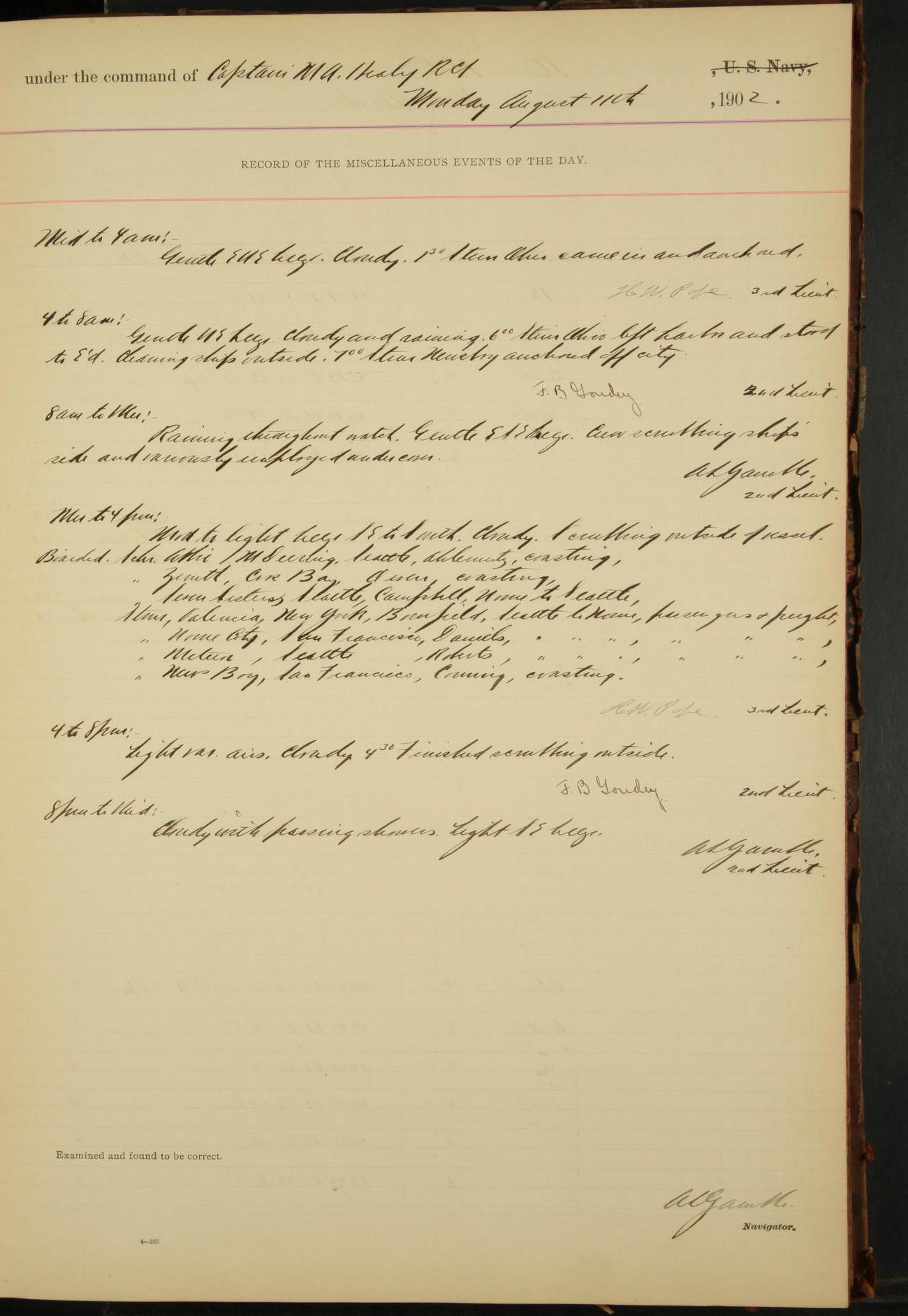 7.30: liberty party returned except Oscar Larsen (Seaman), Fred Jorgensen (Seaman), and C. Bock (Fireman), who were one boat late.