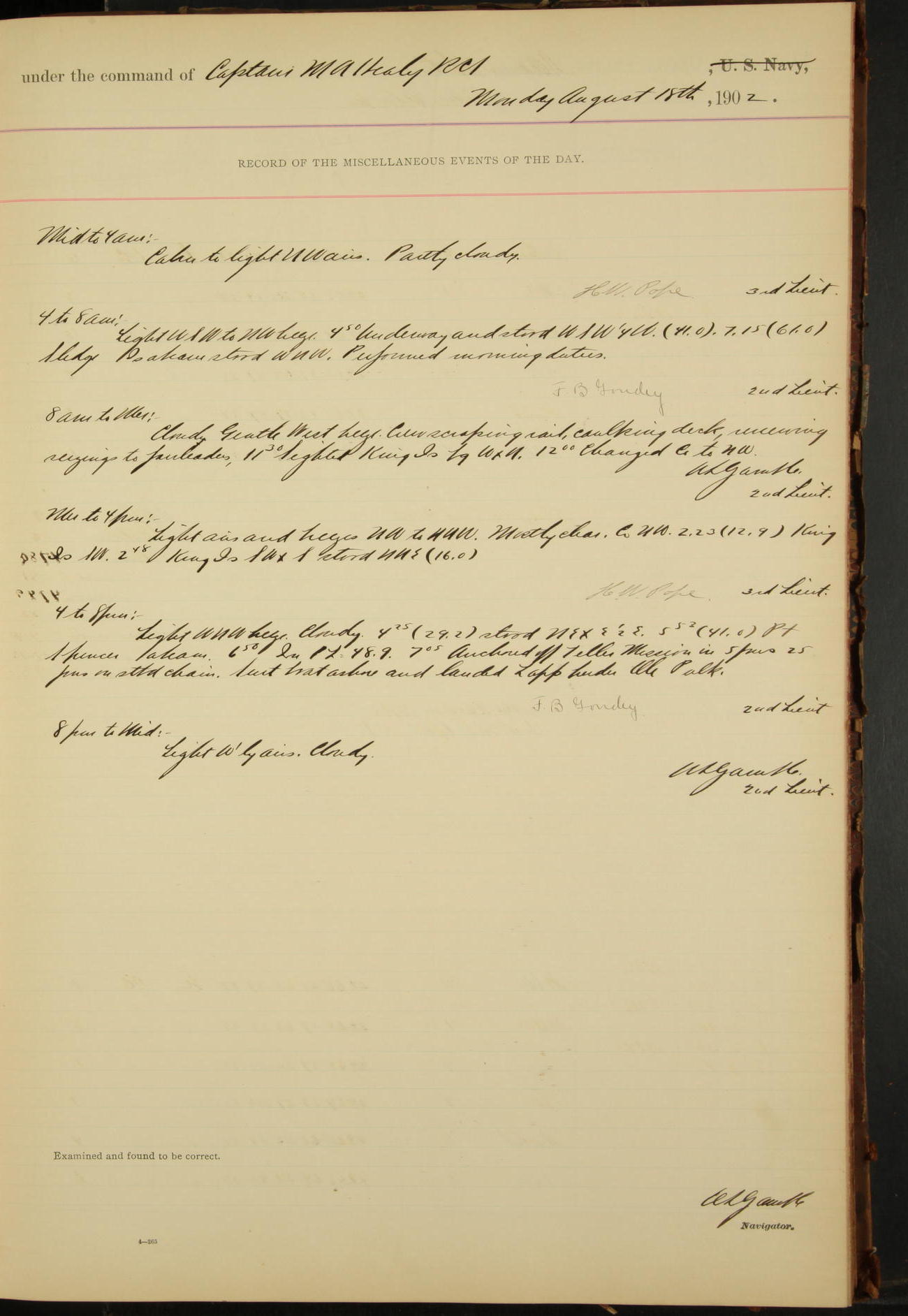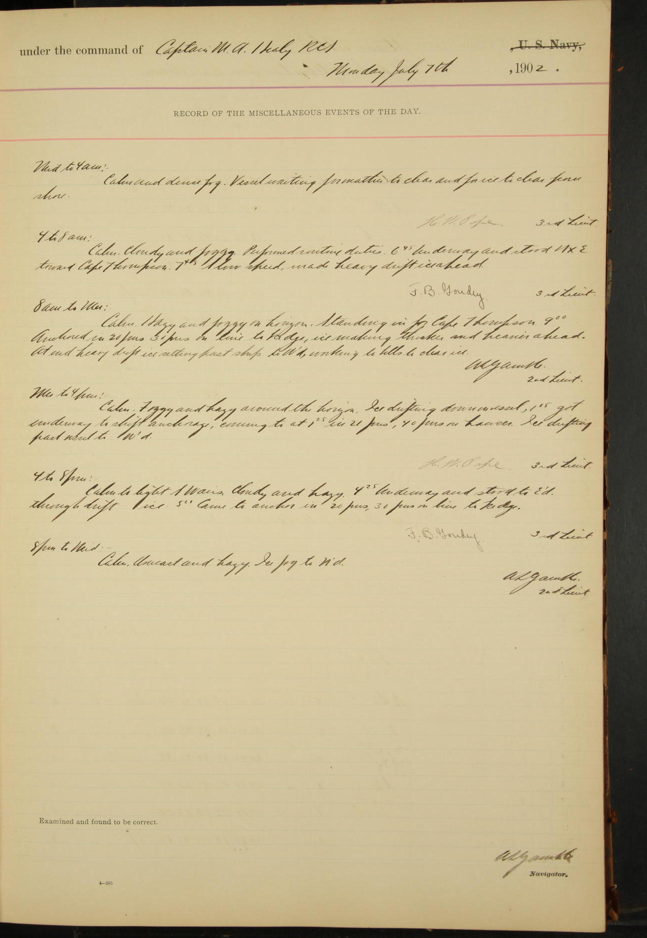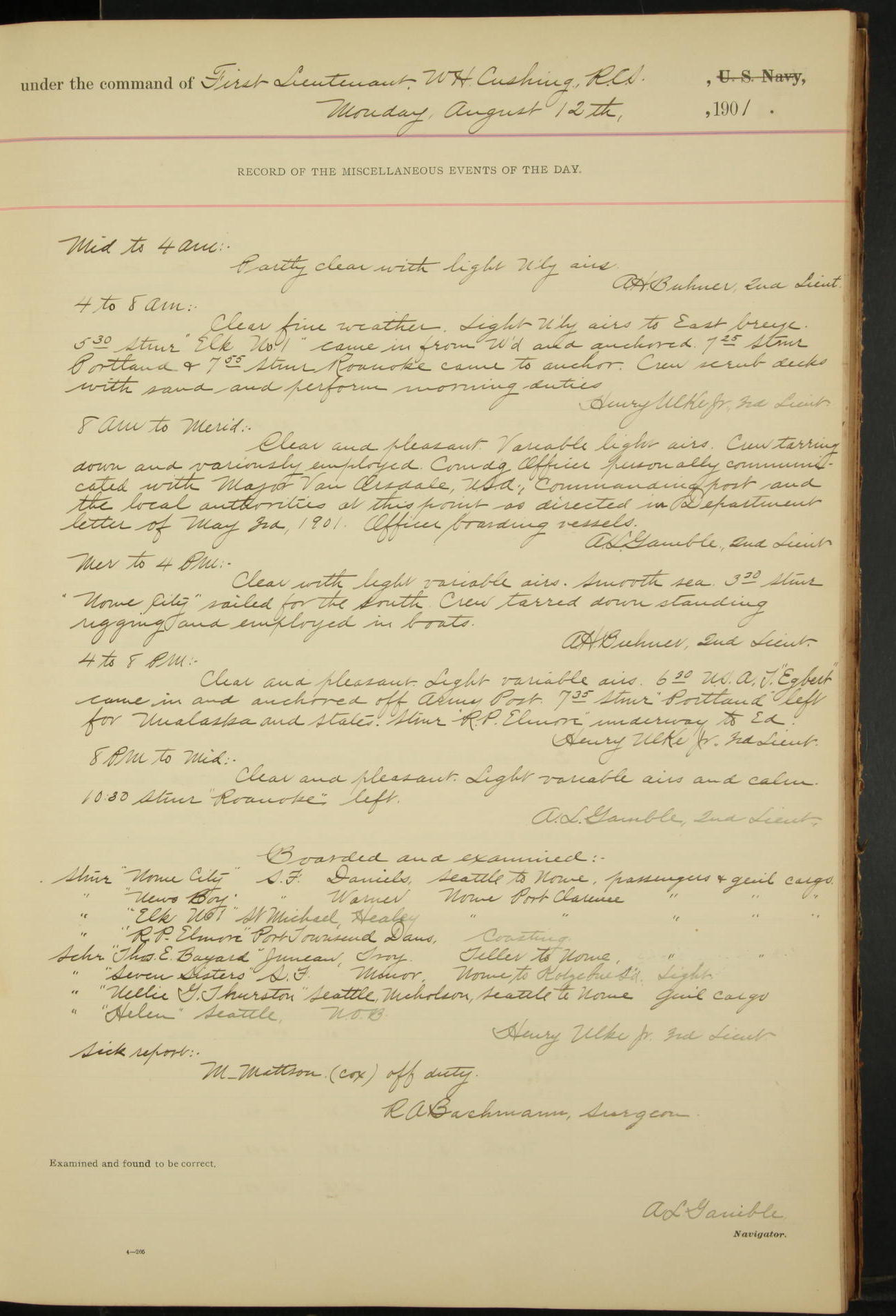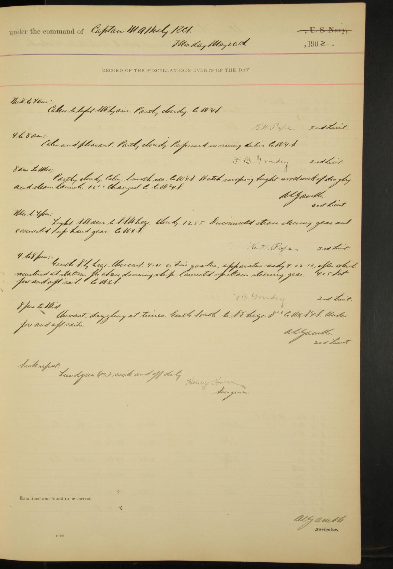 7.30: liberty party returned except Oscar Larsen (Seaman), Fred Jorgensen (Seaman), and C. Bock (Fireman), who were one boat late.