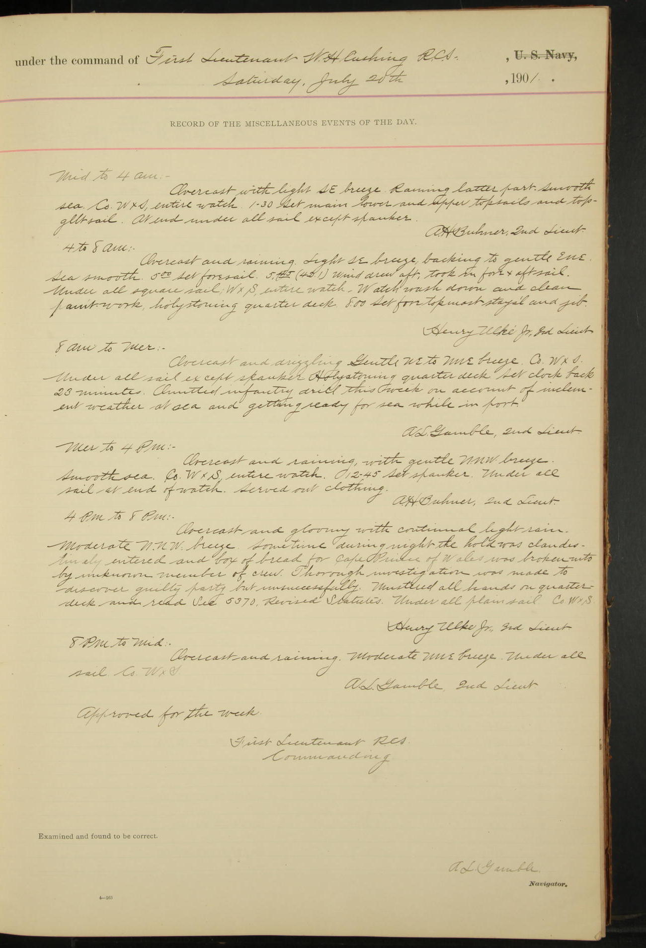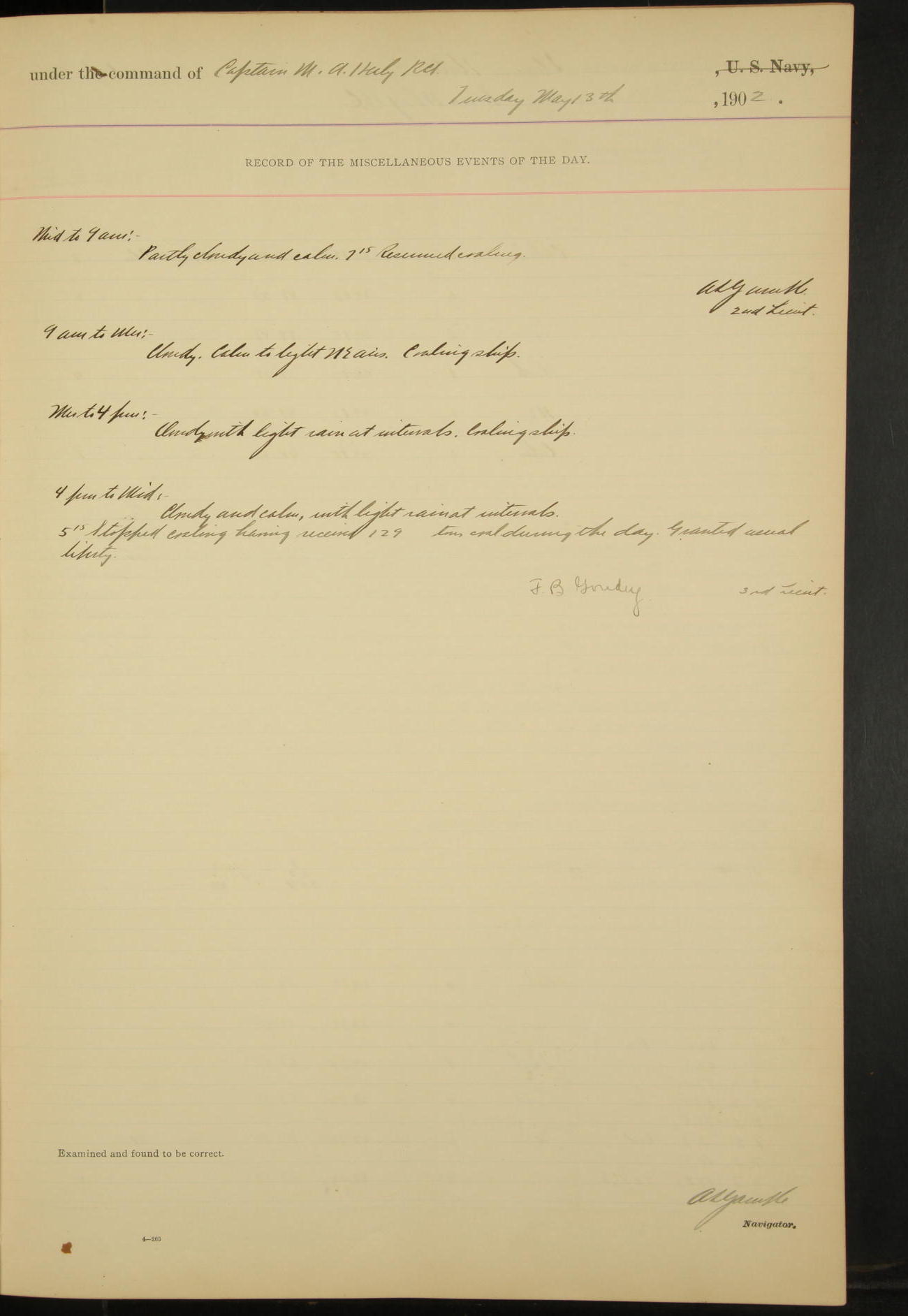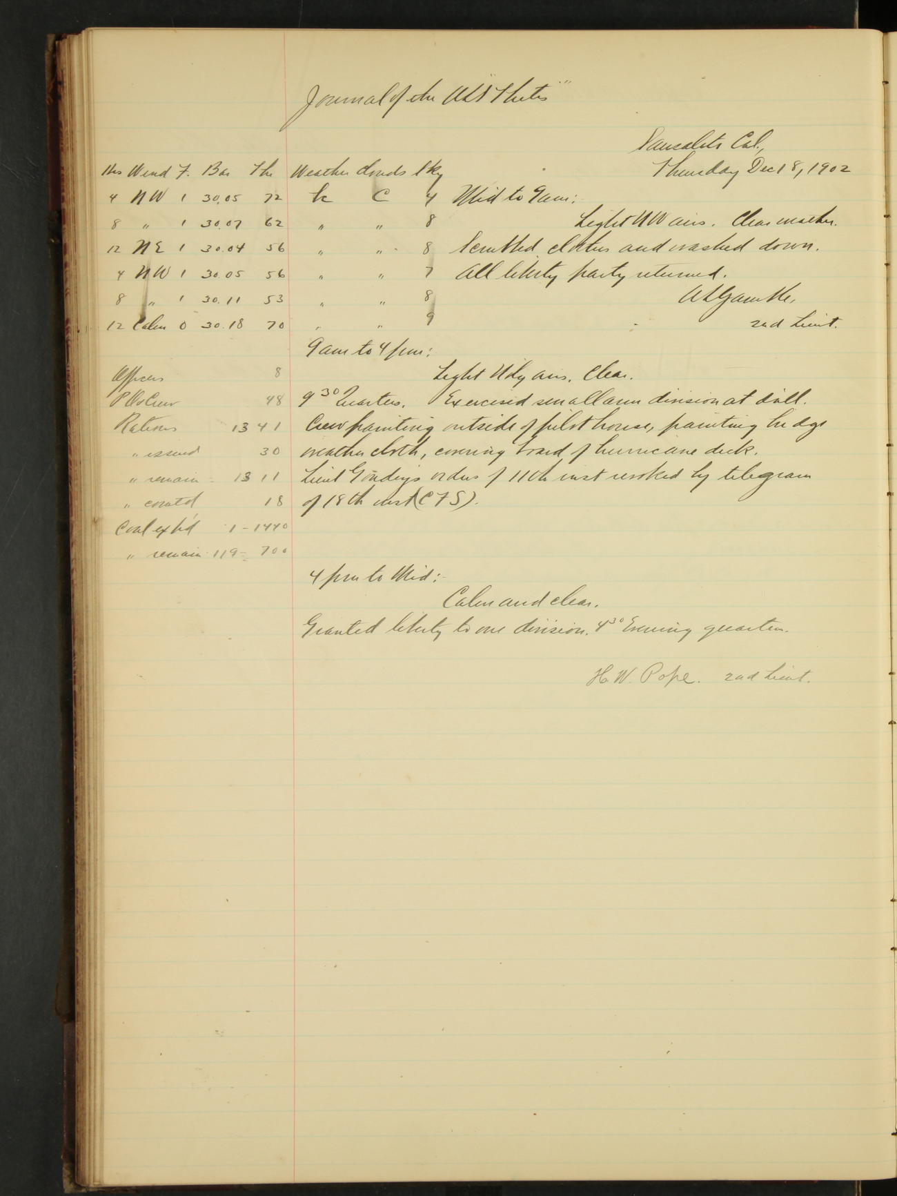 4.30: evening quarters. Granted liberty.