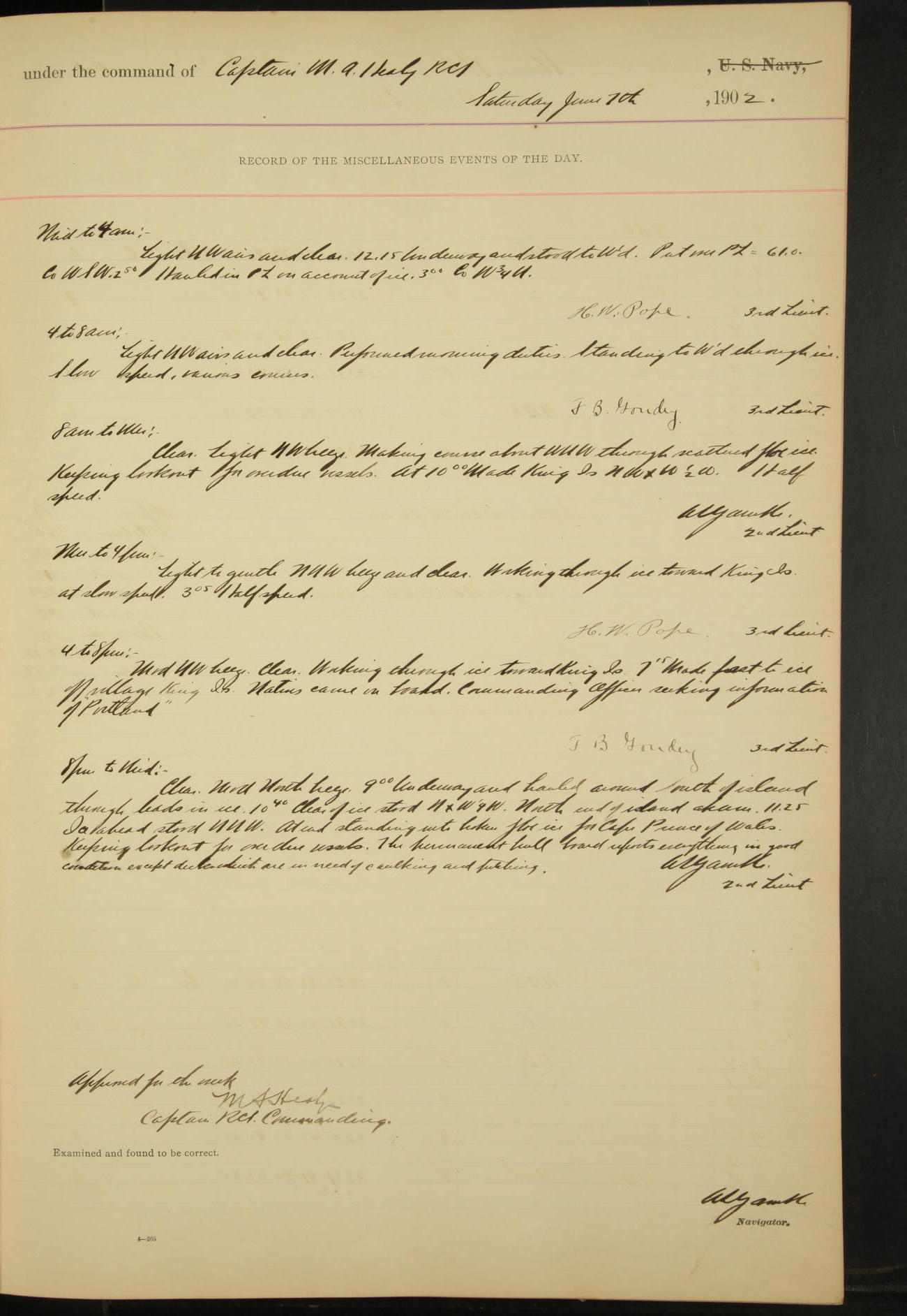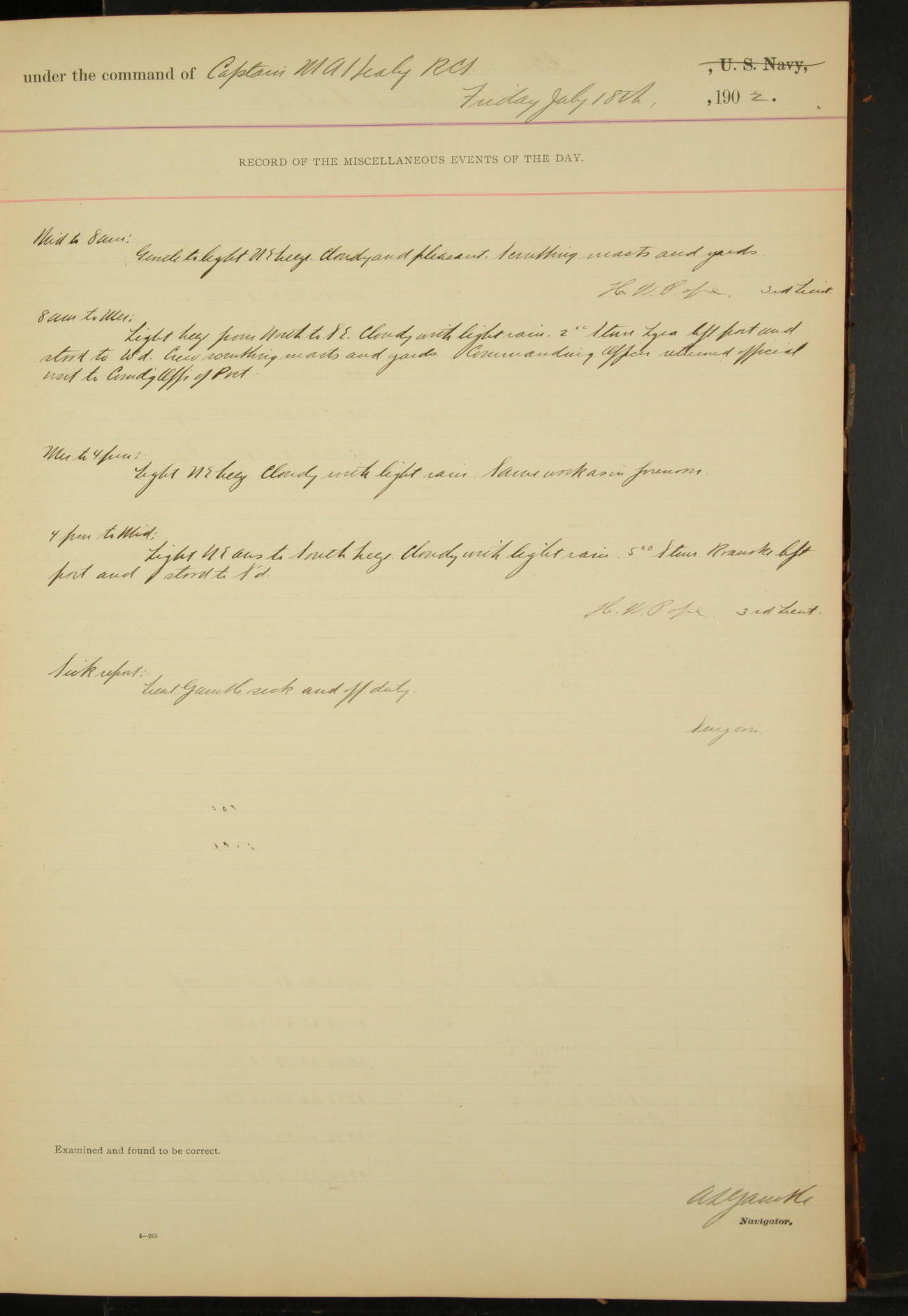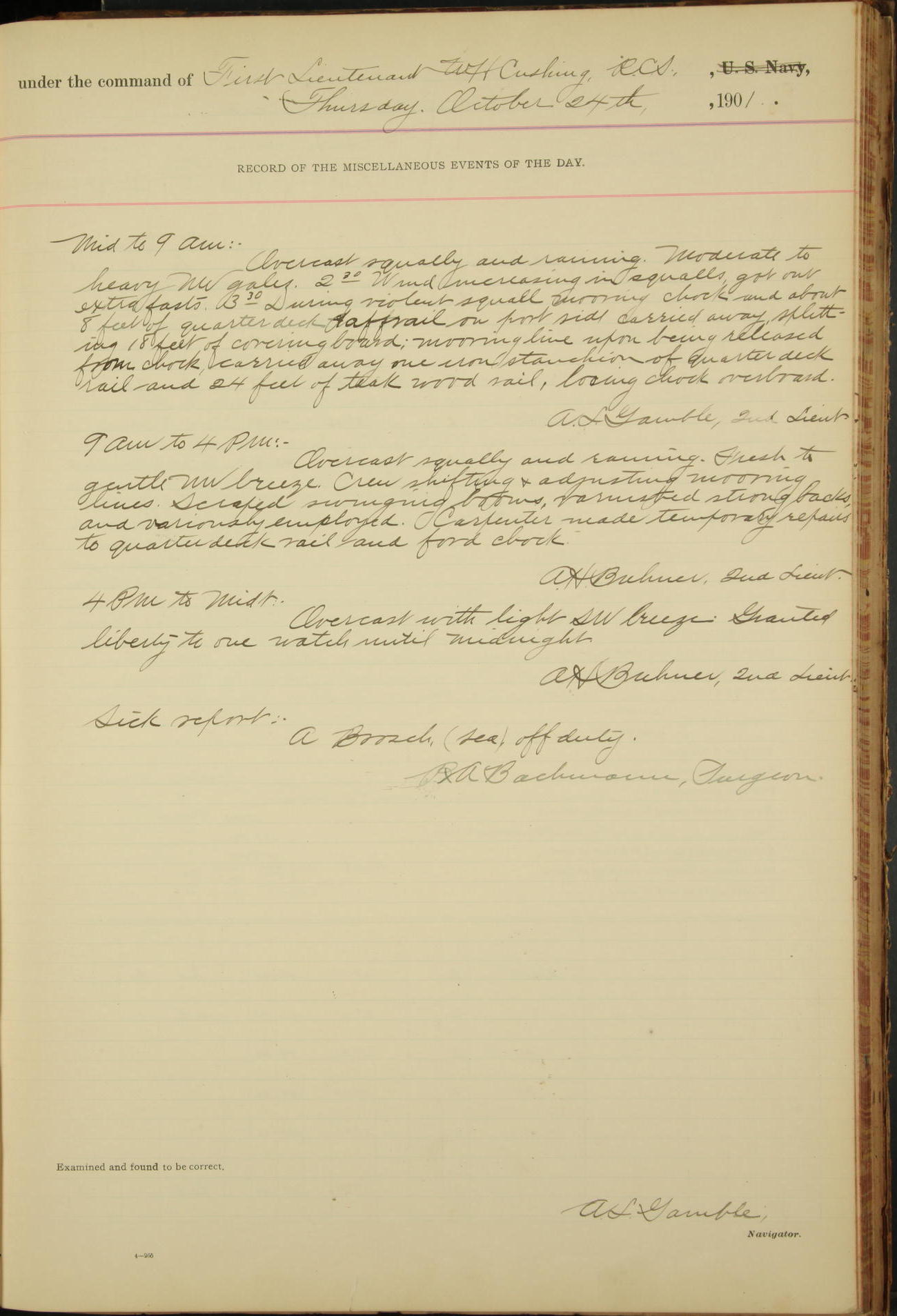10.00: muster at quarters. Commanding Officer inspected ship.