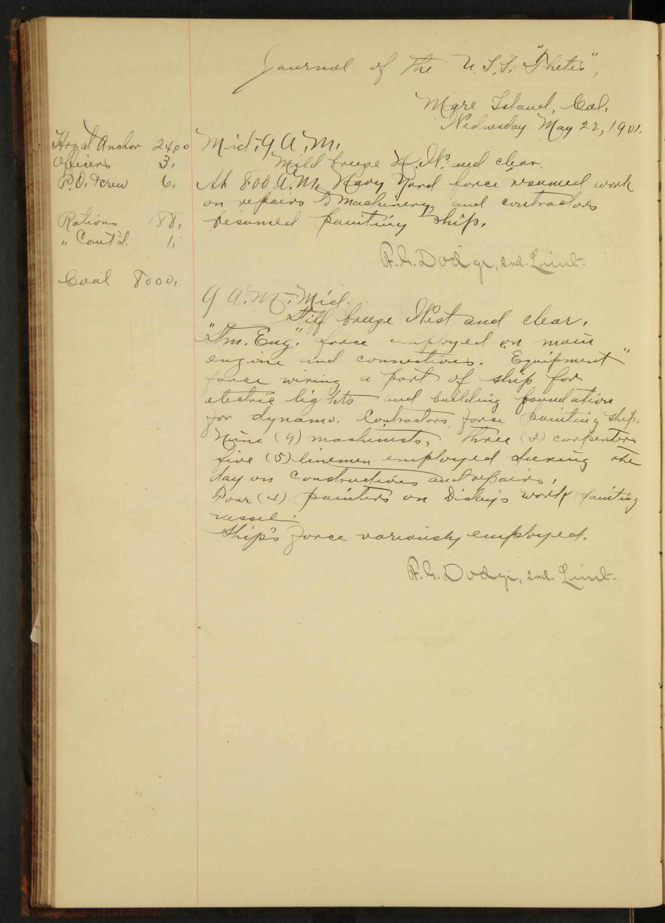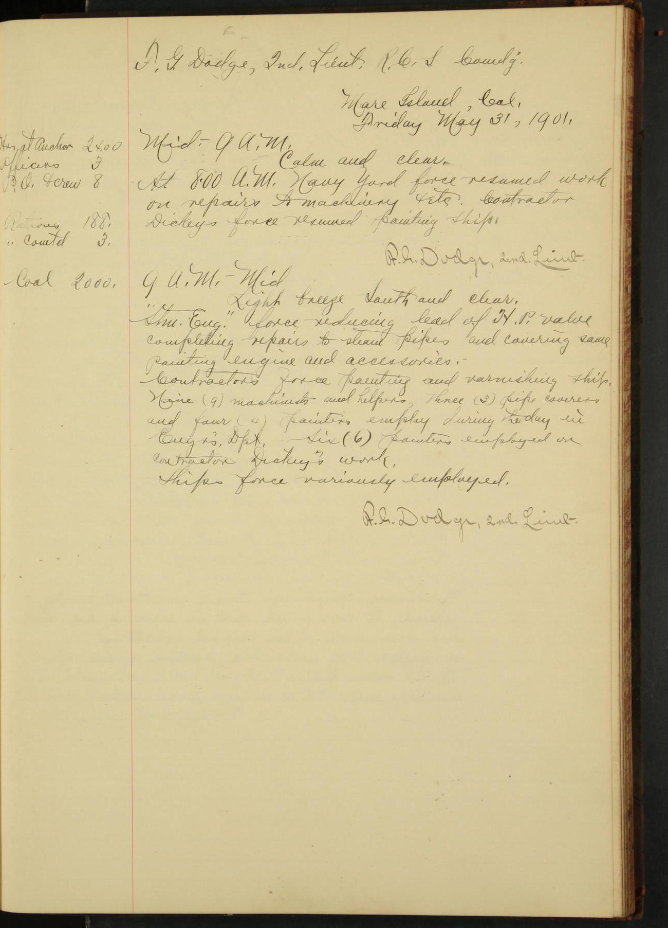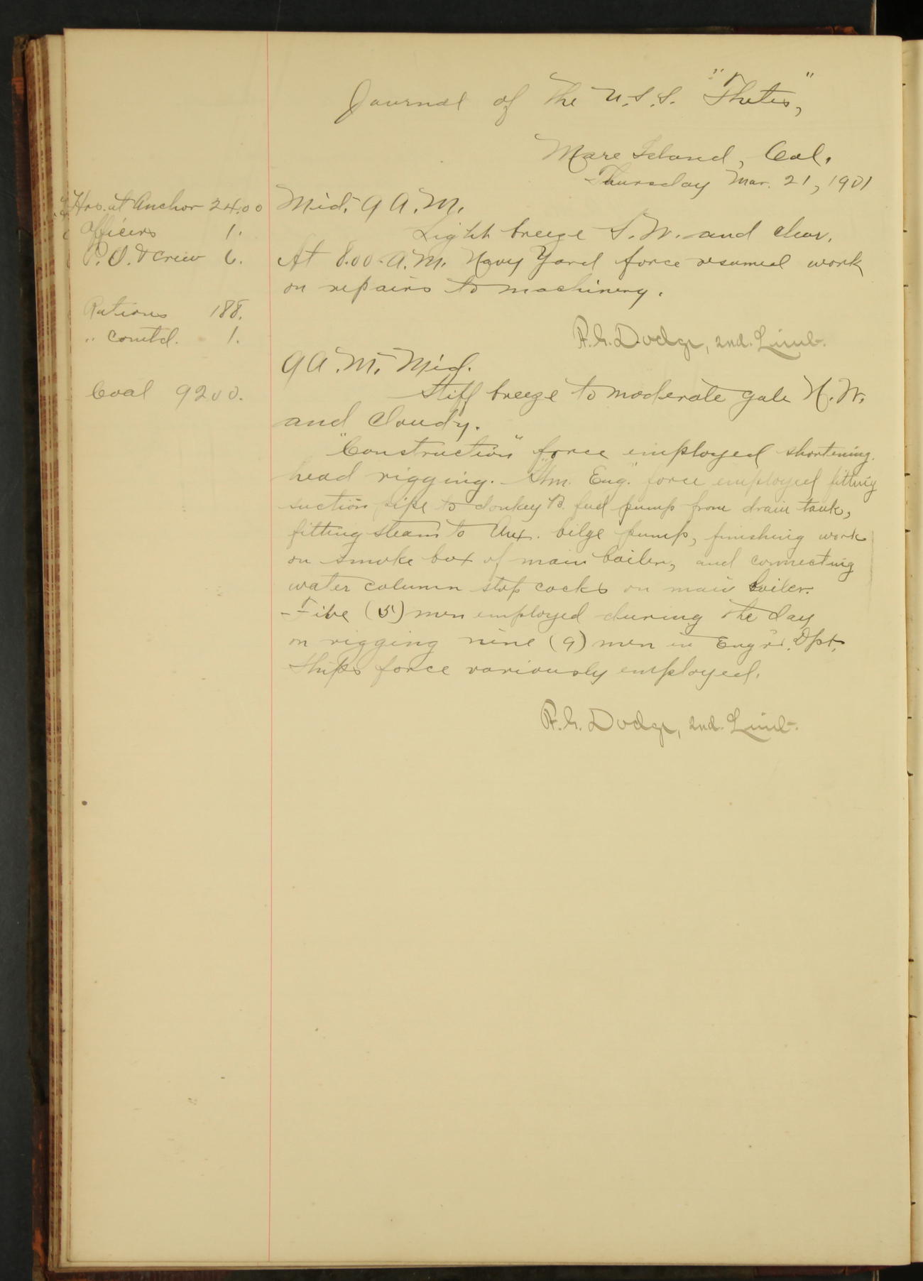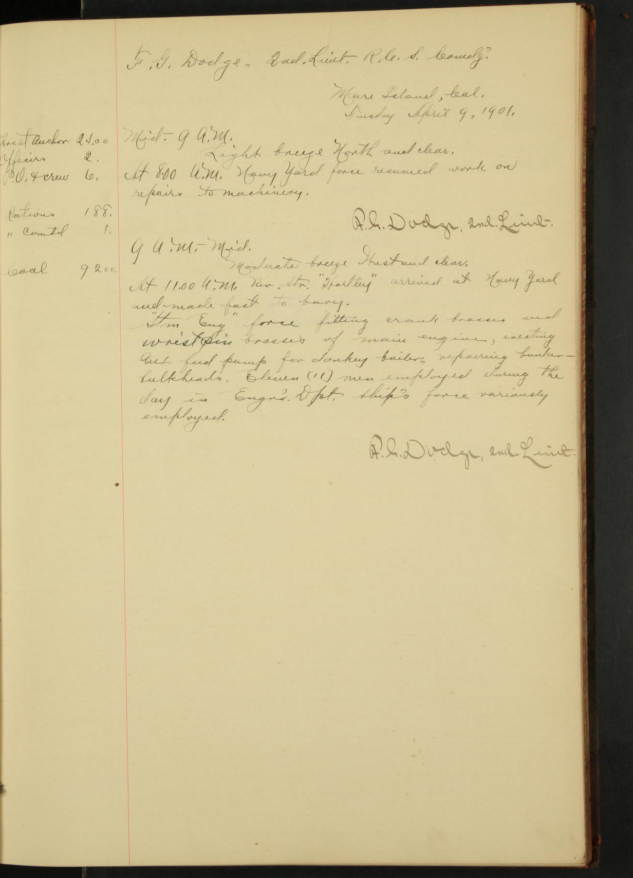 At 12.00 noon Contractor’s force stopped work on vessel and left the ship, leaving the balance of repairs until after the vessel returns from the Navy Yard.