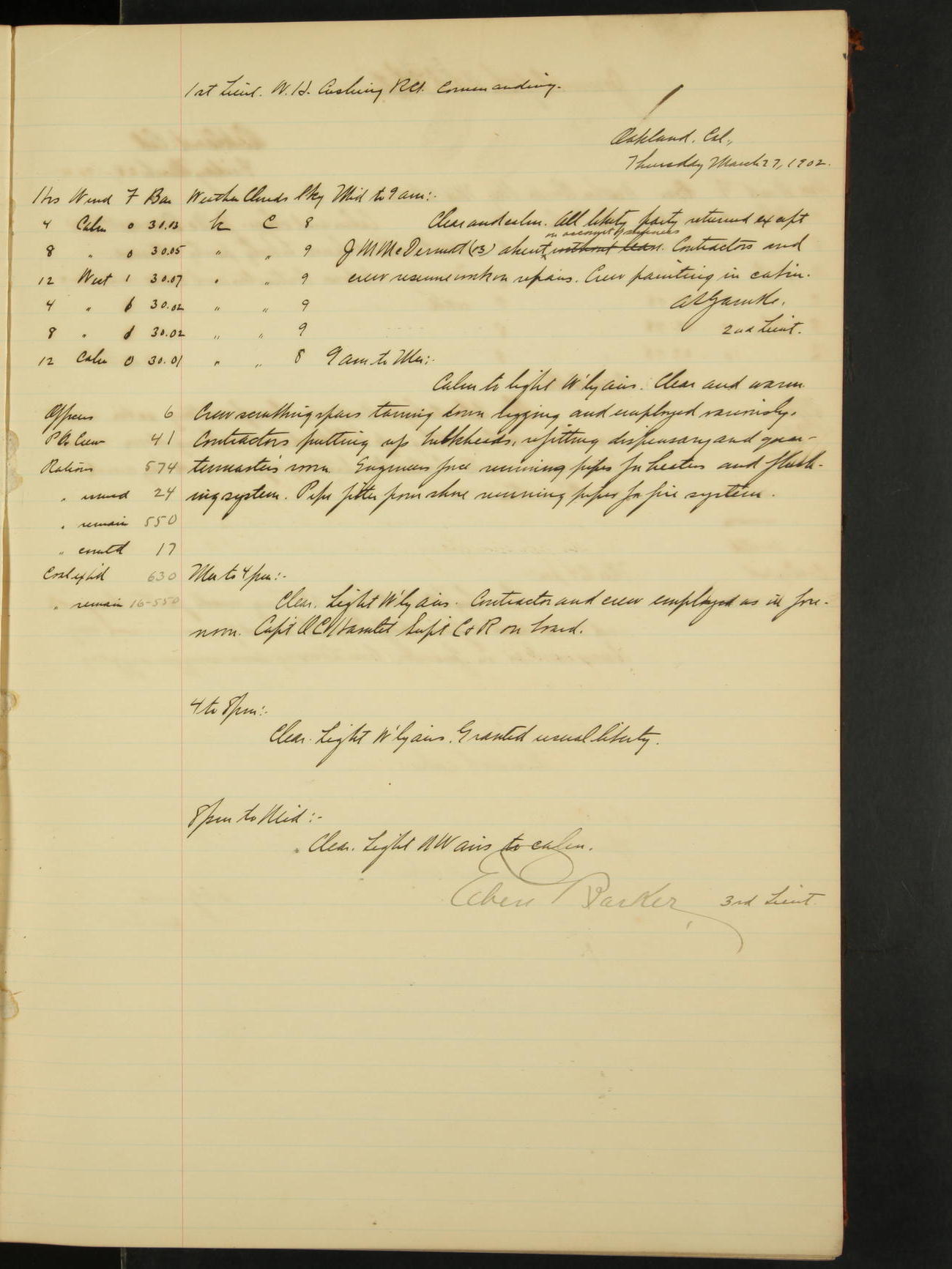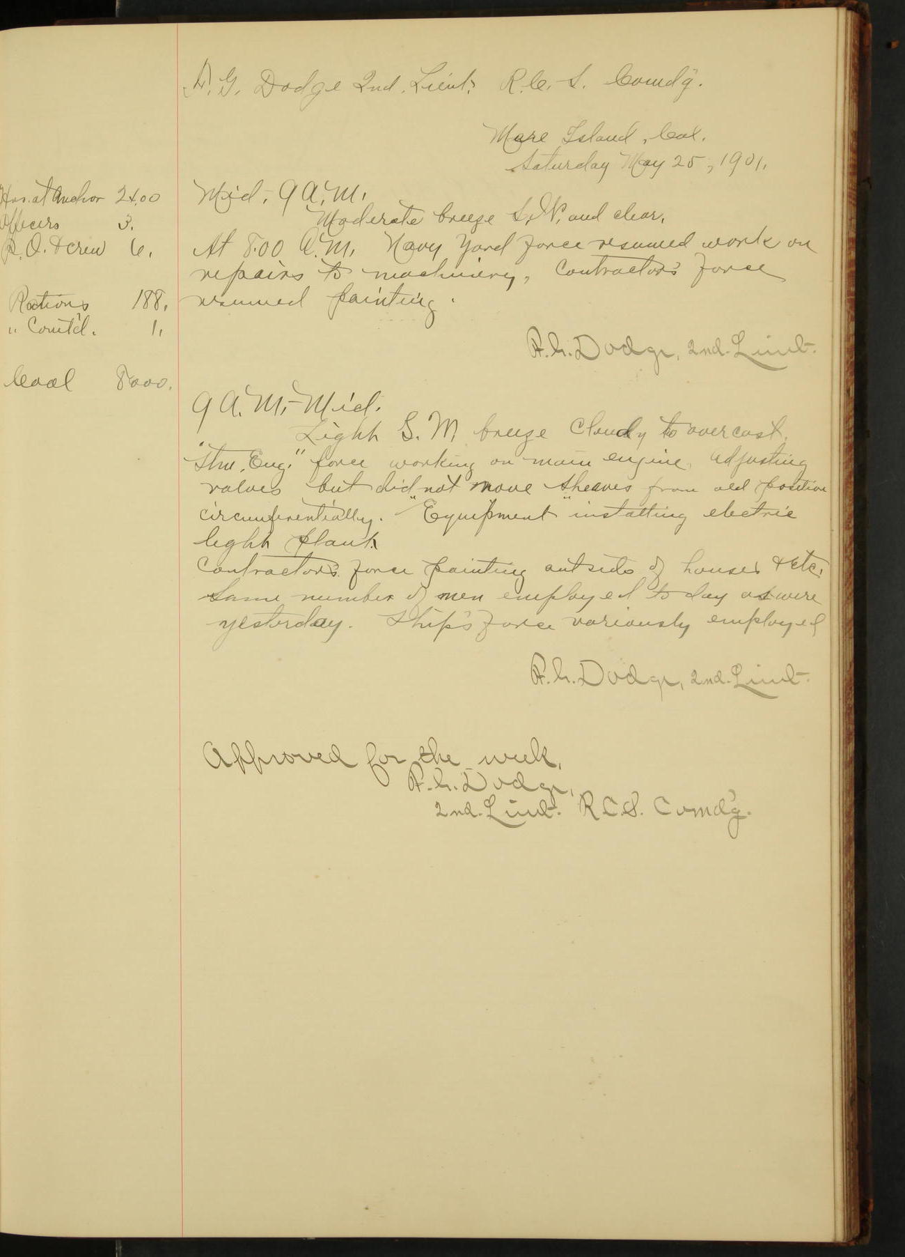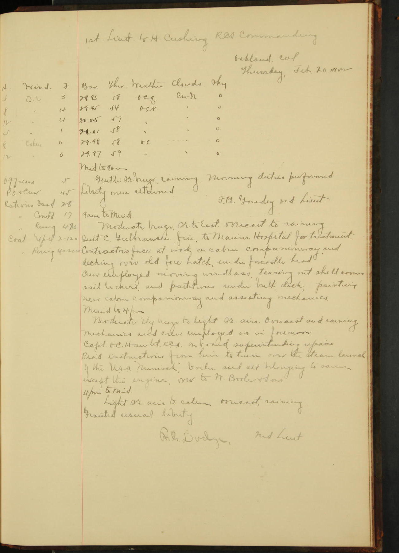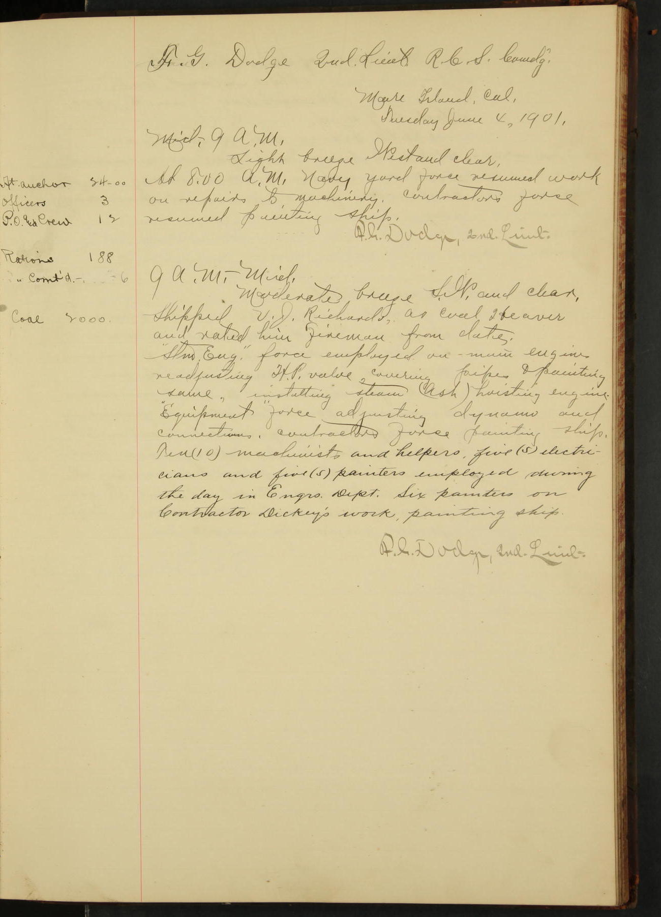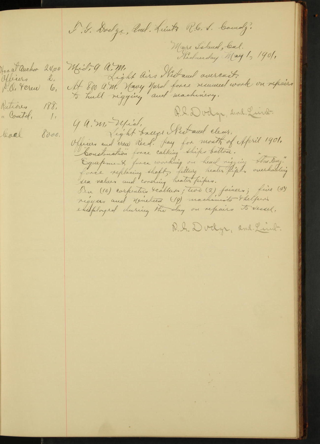 At 12.00 noon Contractor’s force stopped work on vessel and left the ship, leaving the balance of repairs until after the vessel returns from the Navy Yard.